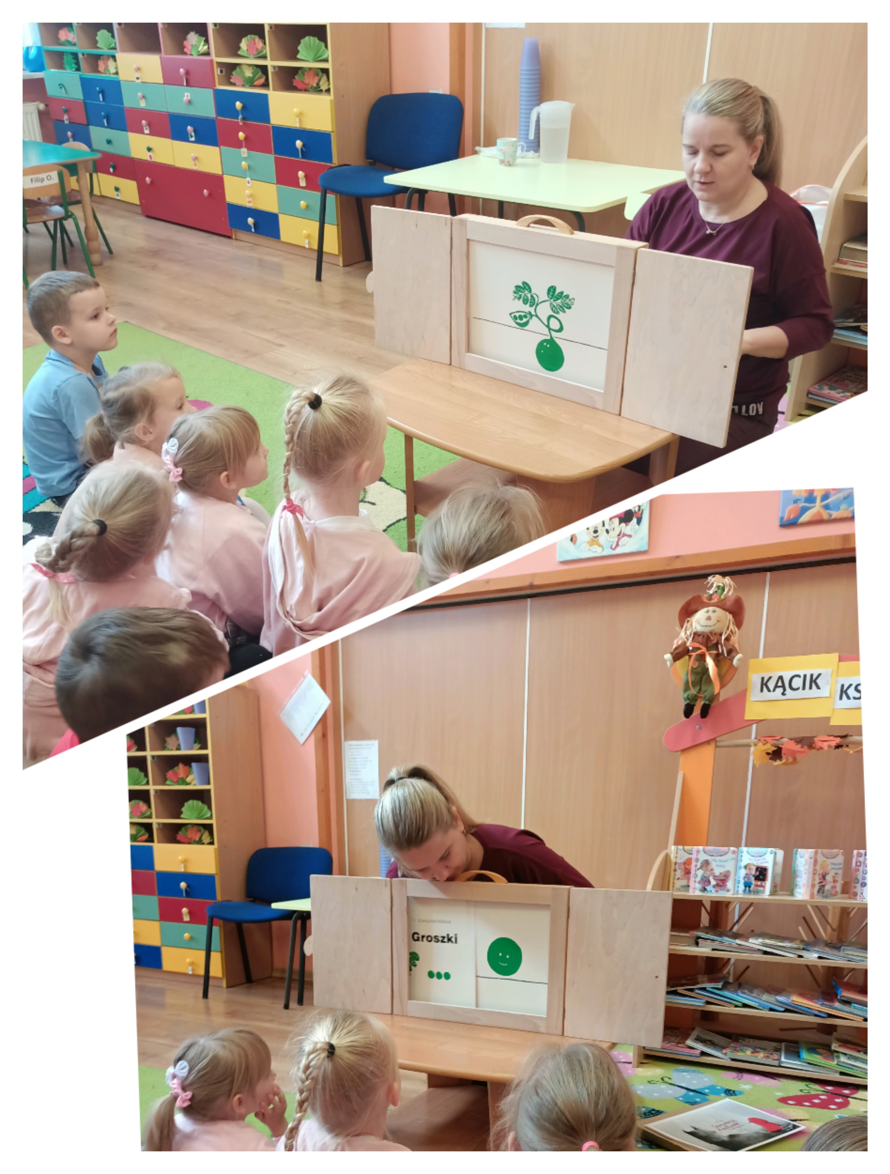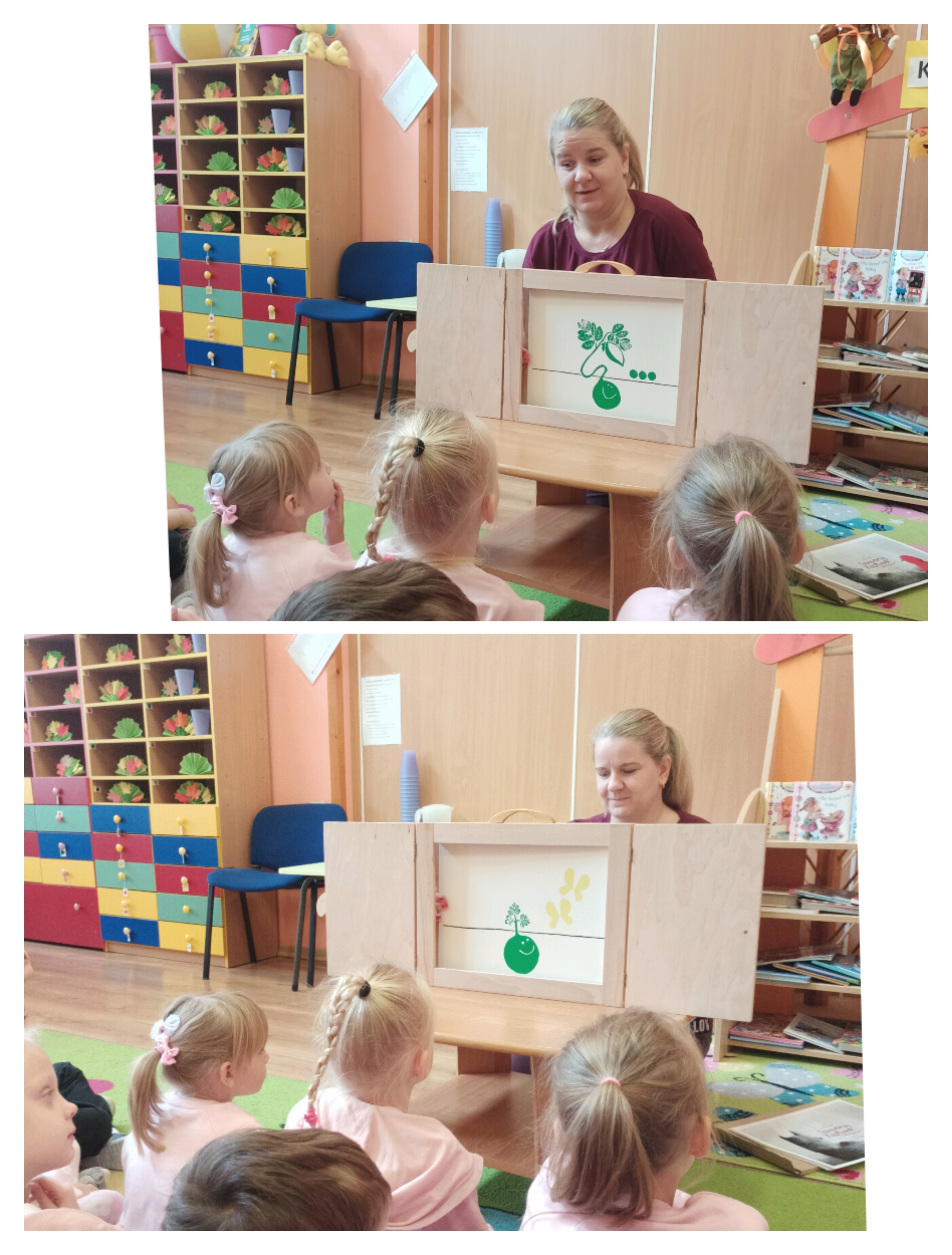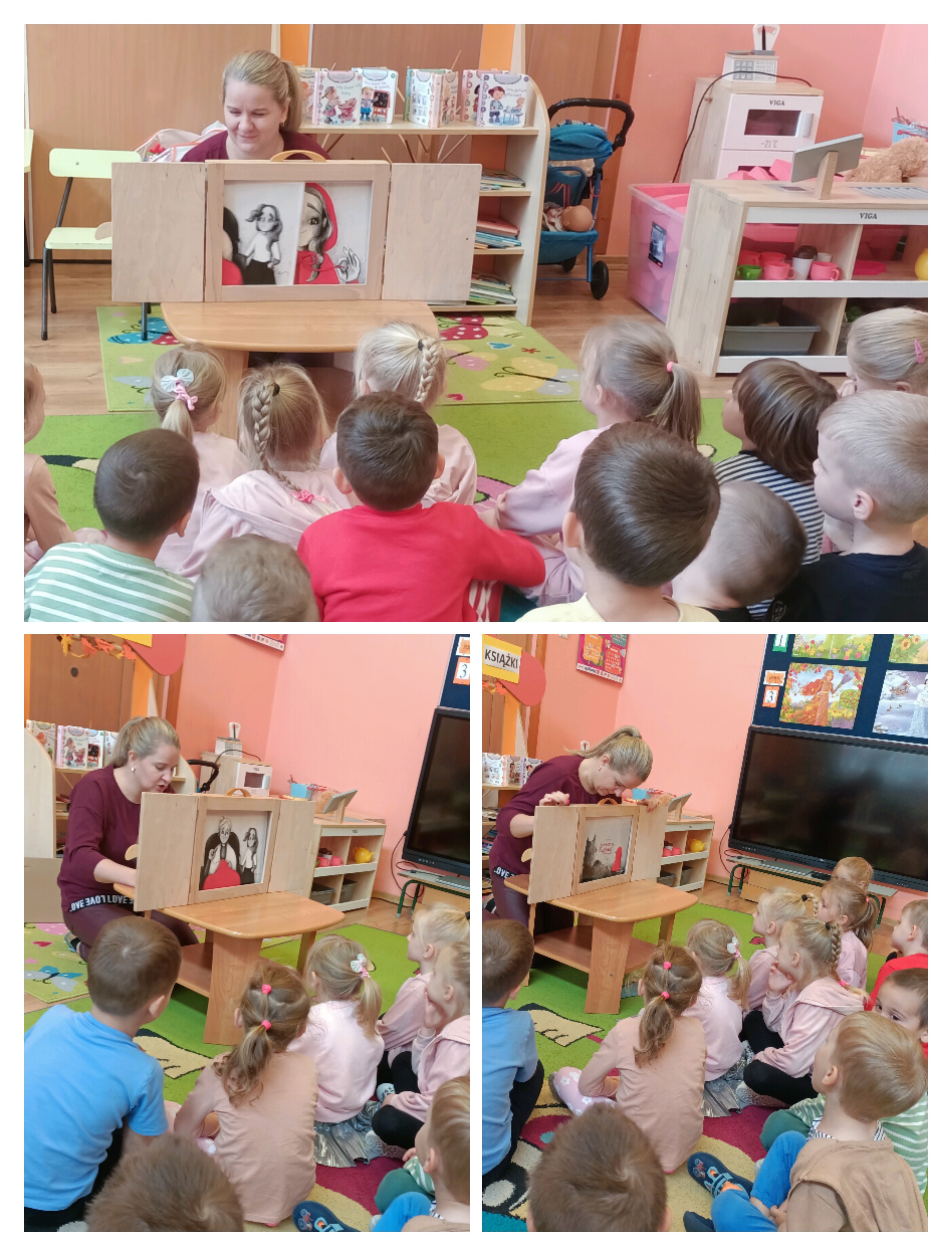 Z okazji Dnia Głośnego Czytania zaprosiliśmy do naszej sali panią Anetkę – logopedę i pedagoga specjalnego, znaną dzieciom również jako panią z biblioteki. Pani Anetka przygotowała dla nas wyjątkowe spotkanie, podczas którego zaprezentowała dwie historie metodą Kamishibai – japońskiego teatrzyku obrazkowego.