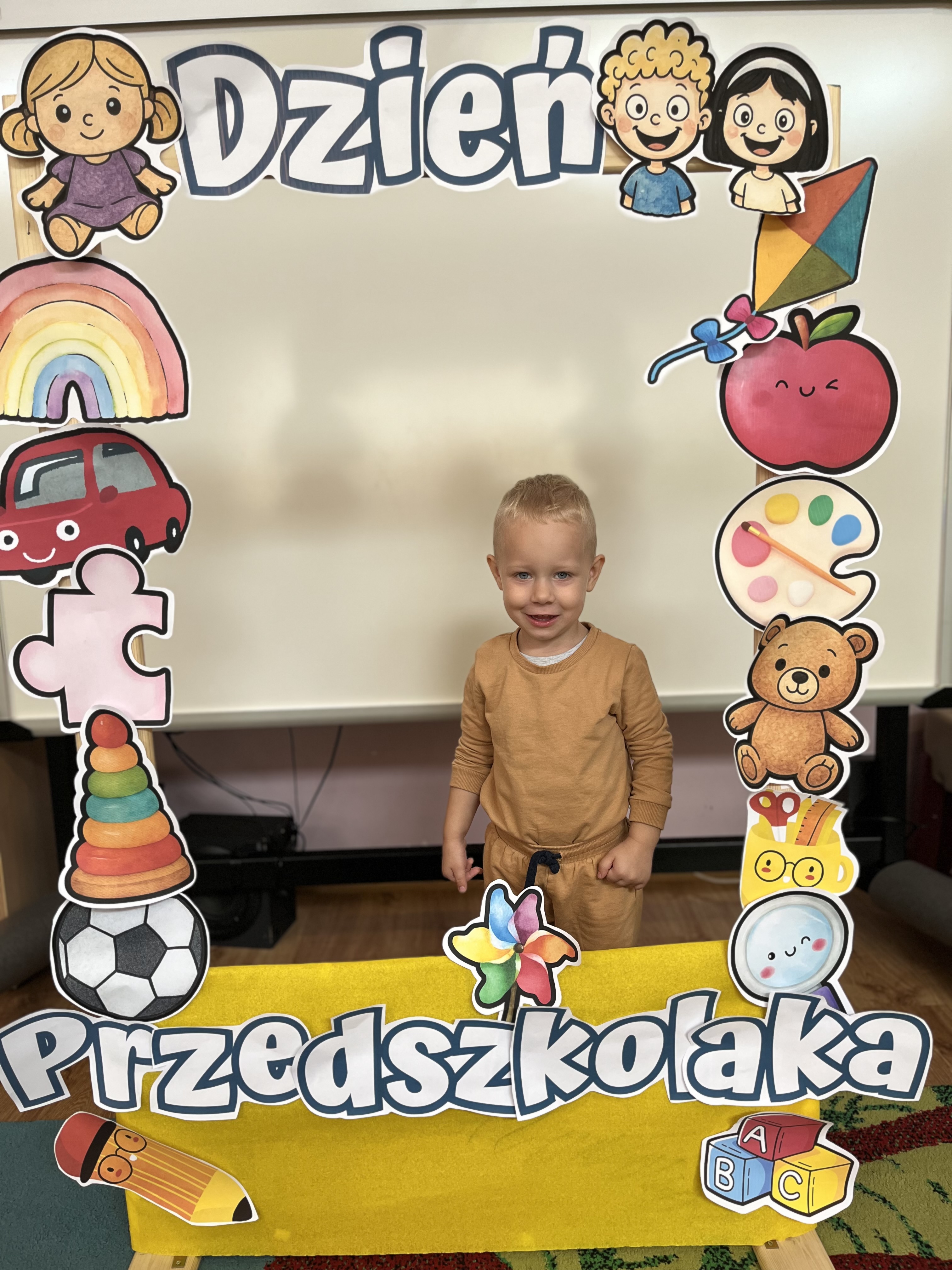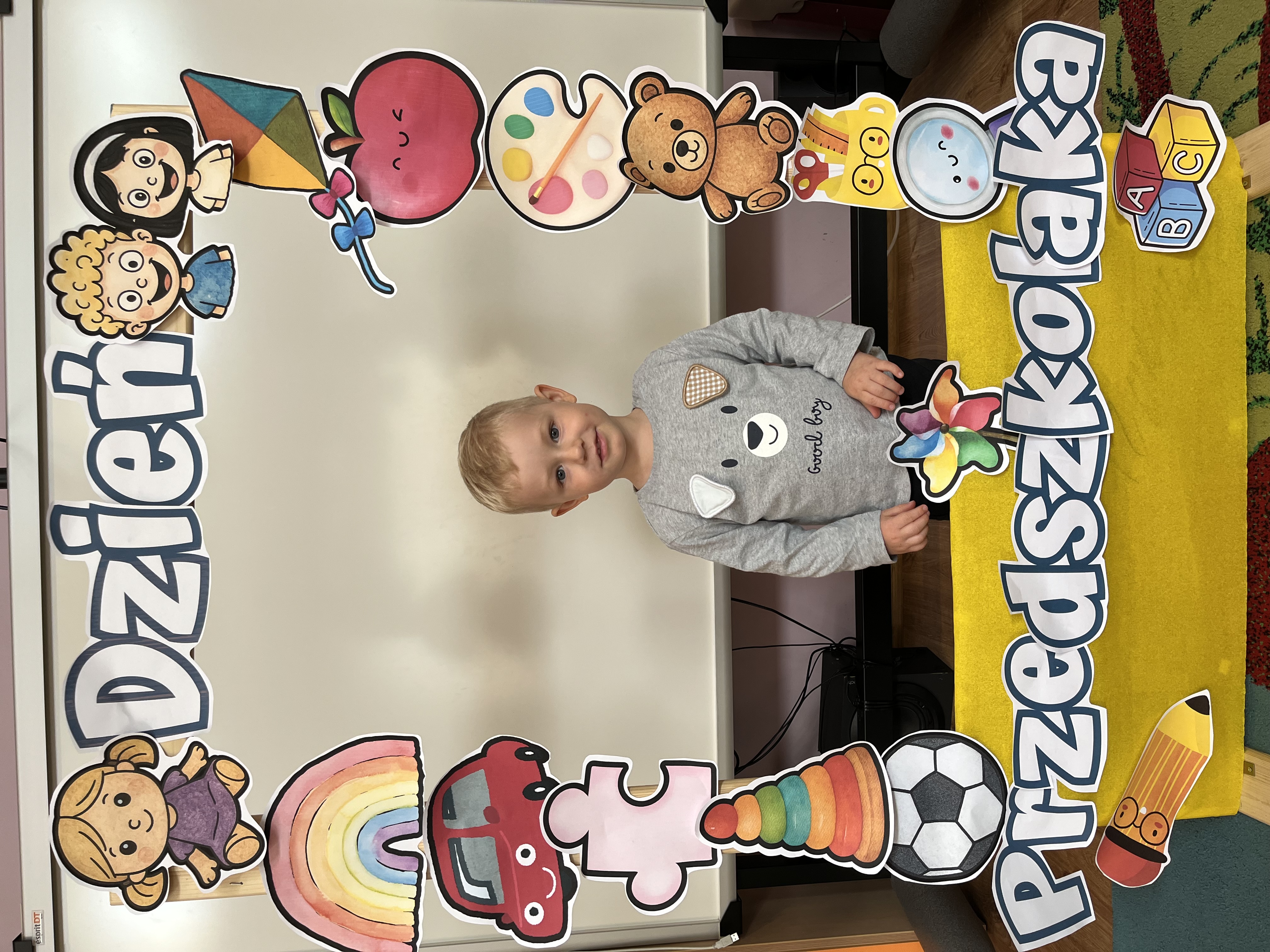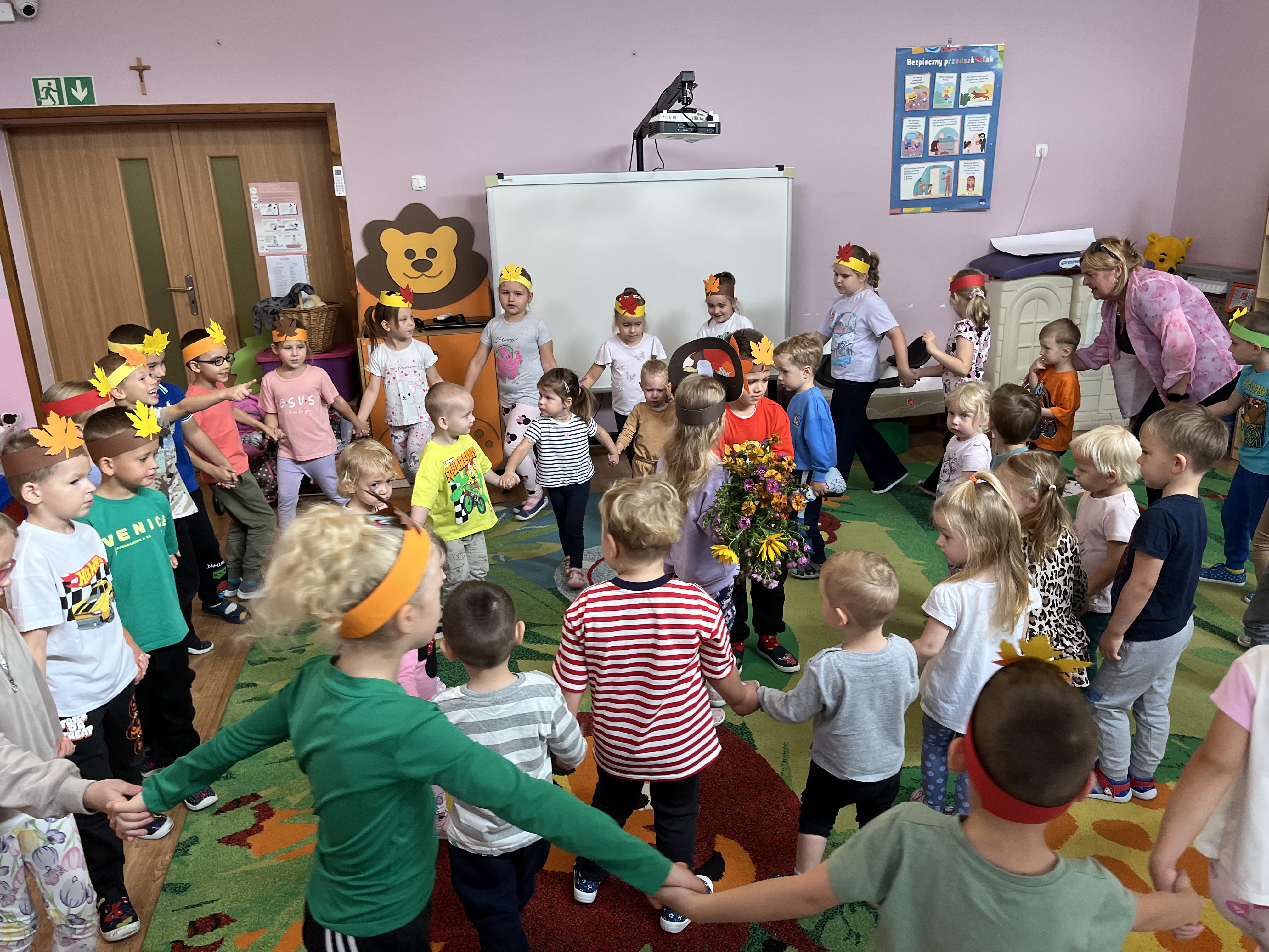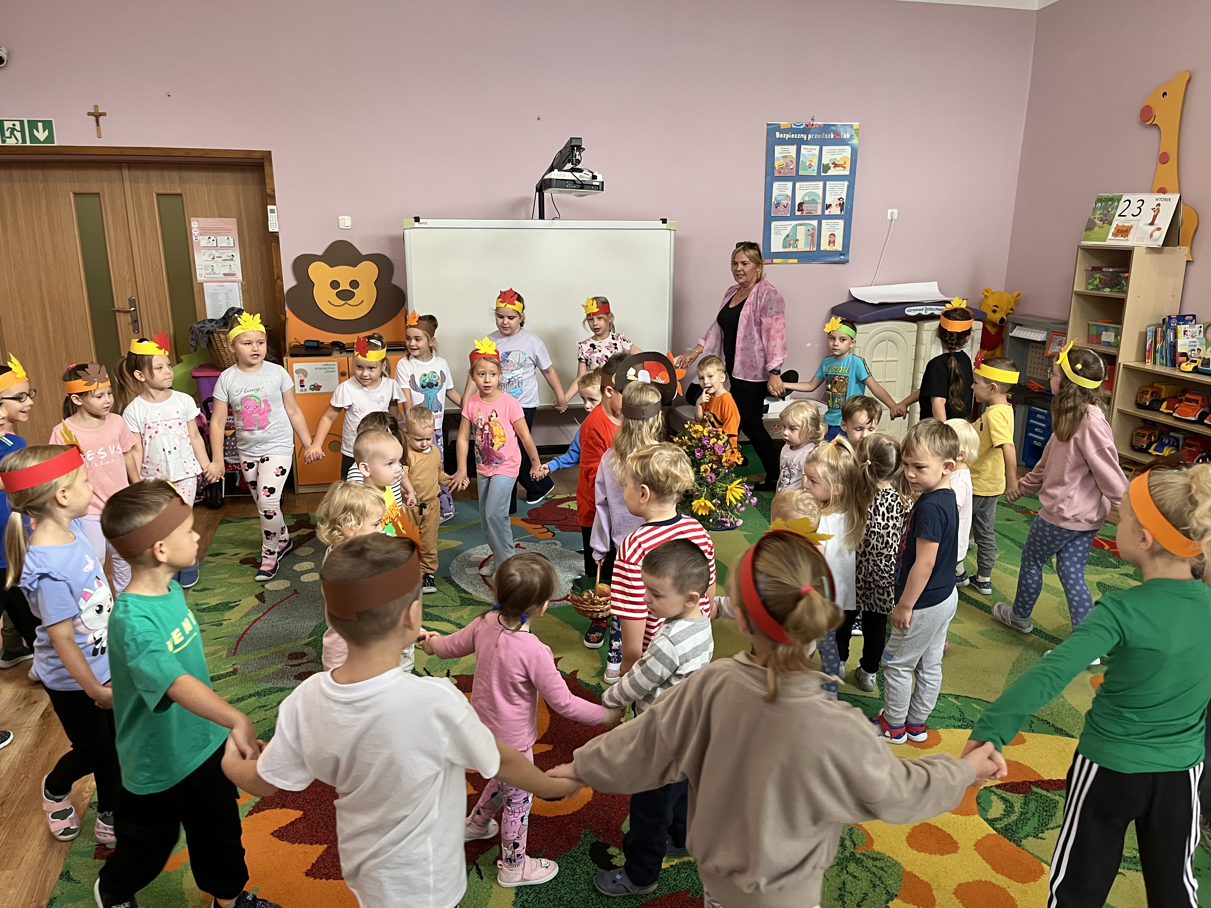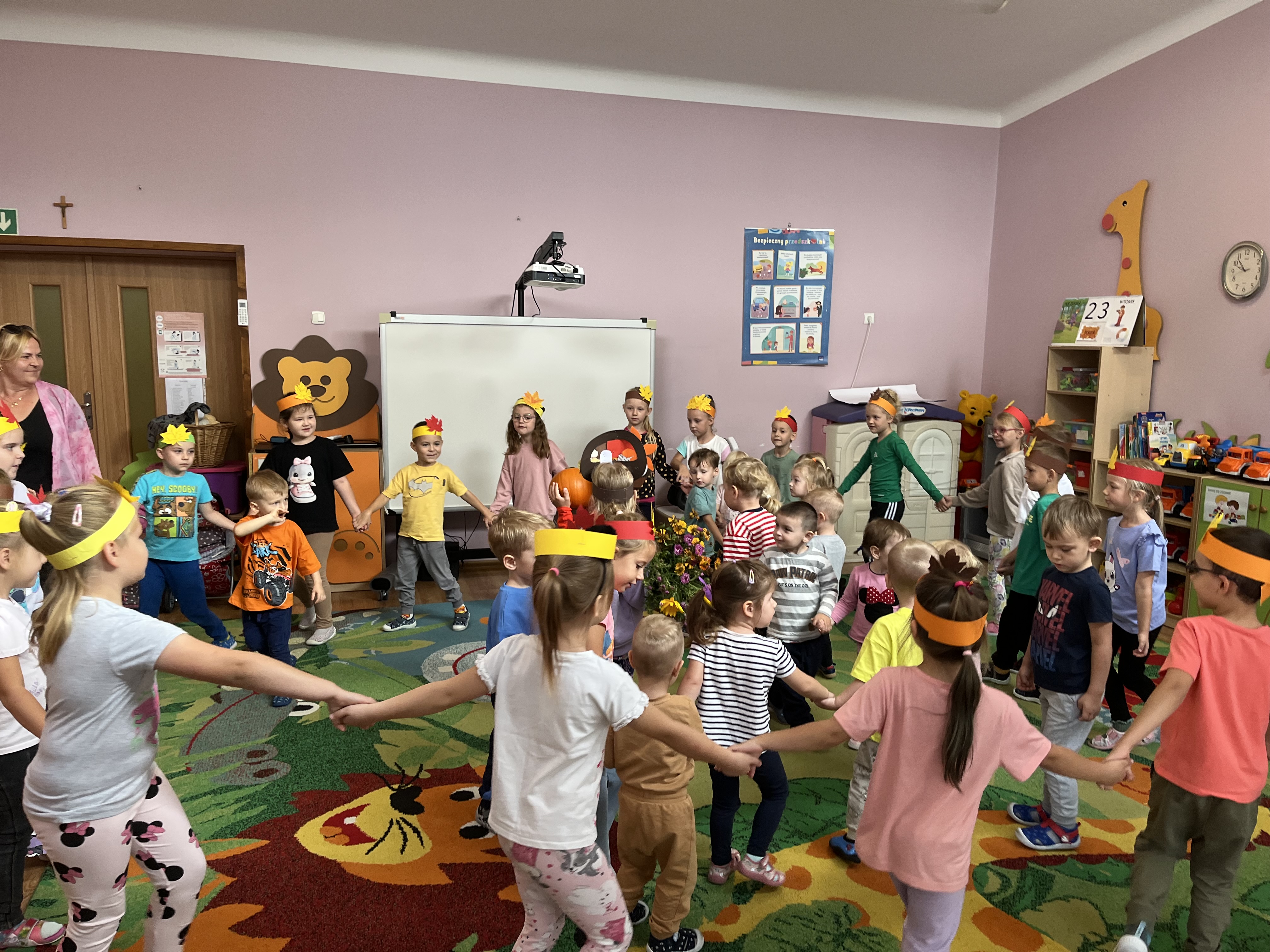 23 września w grupie Pszczółek obchodziliśmy Dzień Przedskolaka. Zaraz po śniadaniu zrobiliśmy sesję zdjeciową w naszej kolorowej "foto budce" a później jak na uroczyste święto przystało był "tort", na którym każdy mógł przykleić swoją świeczuszkę. Dzieci były zachwycone tymi zadaniami. Cały dzień przebiegał nam bardzo radośnie. Dodatkowo, z okazji pierwszego dnia jesieni odwiedziła nas najstarsza grupa, czyli Zajączki, które zaprezentowały nam piosenkę "Przebojowa jesień". Pszczółki z radością włączyły się w improwizację ruchową piosenki obserwując starsze kolażanki i kolegów.