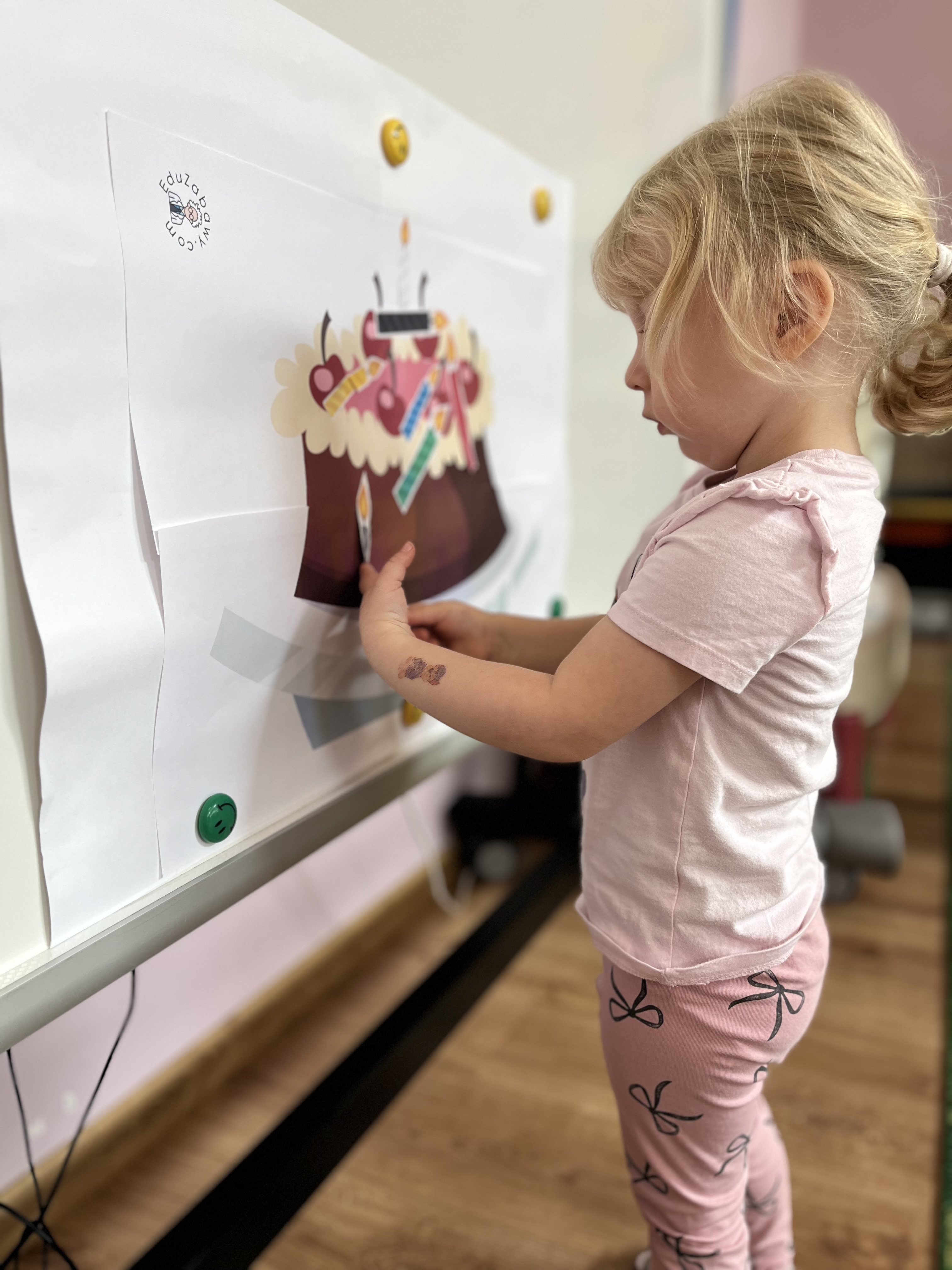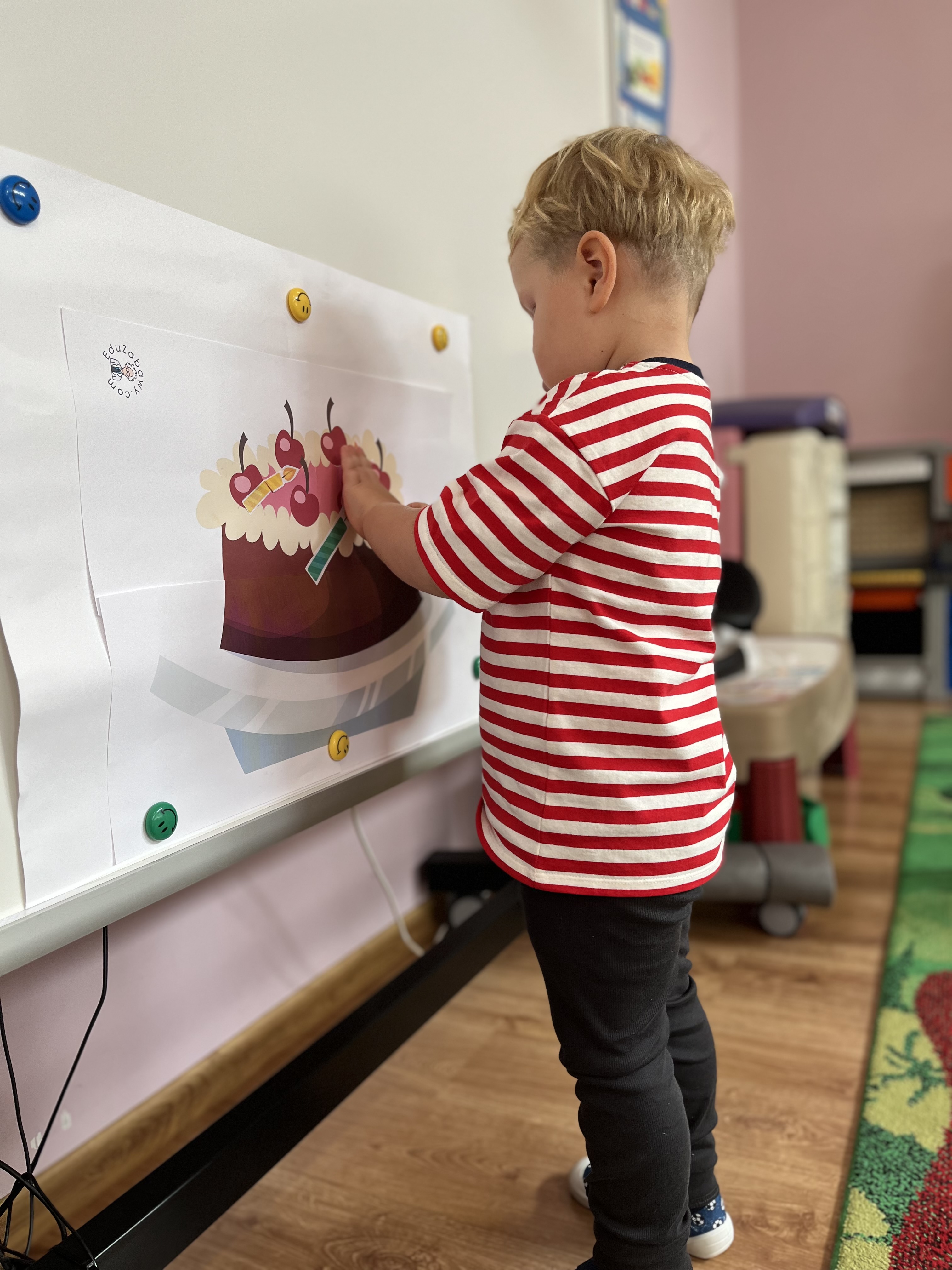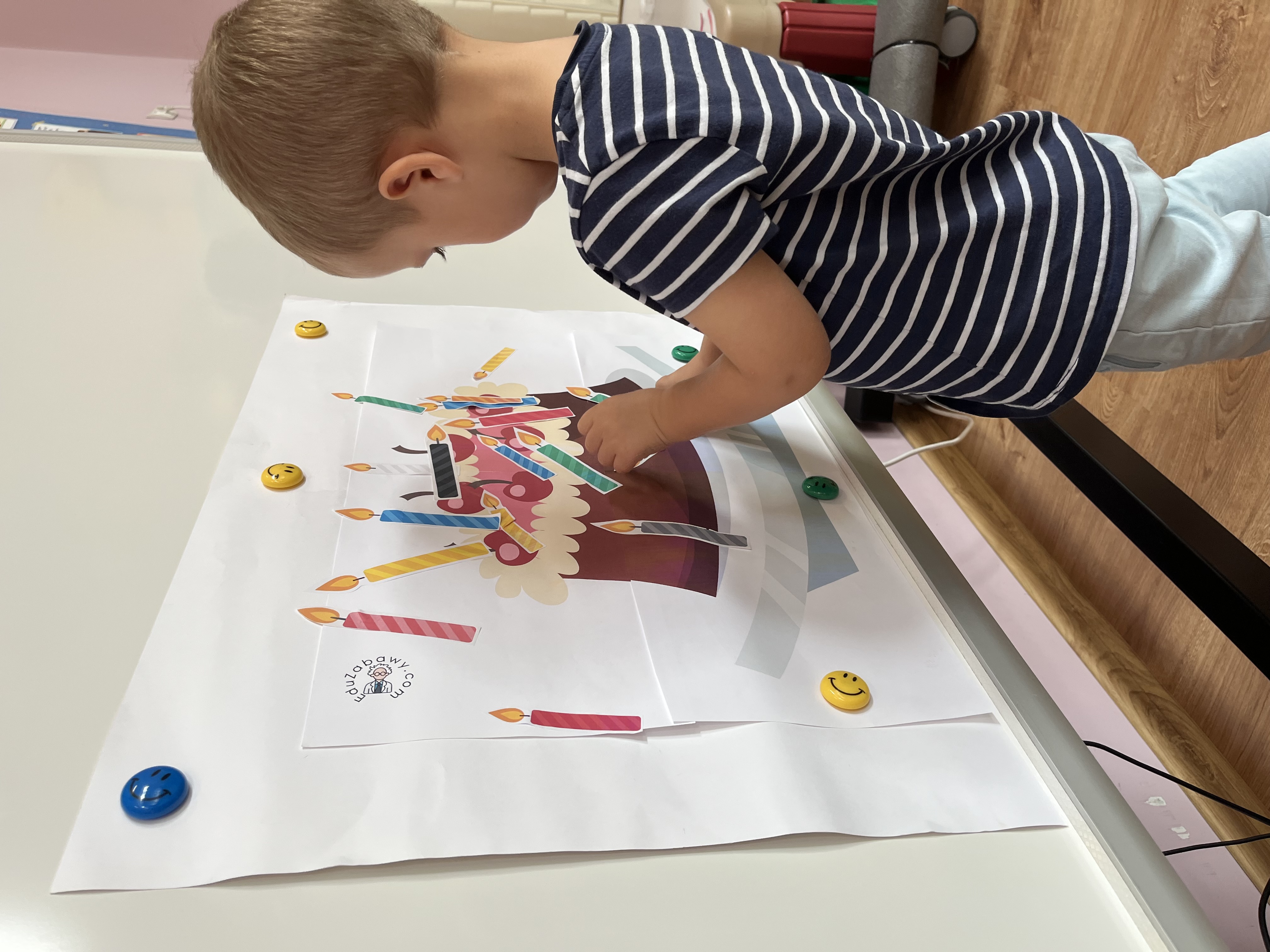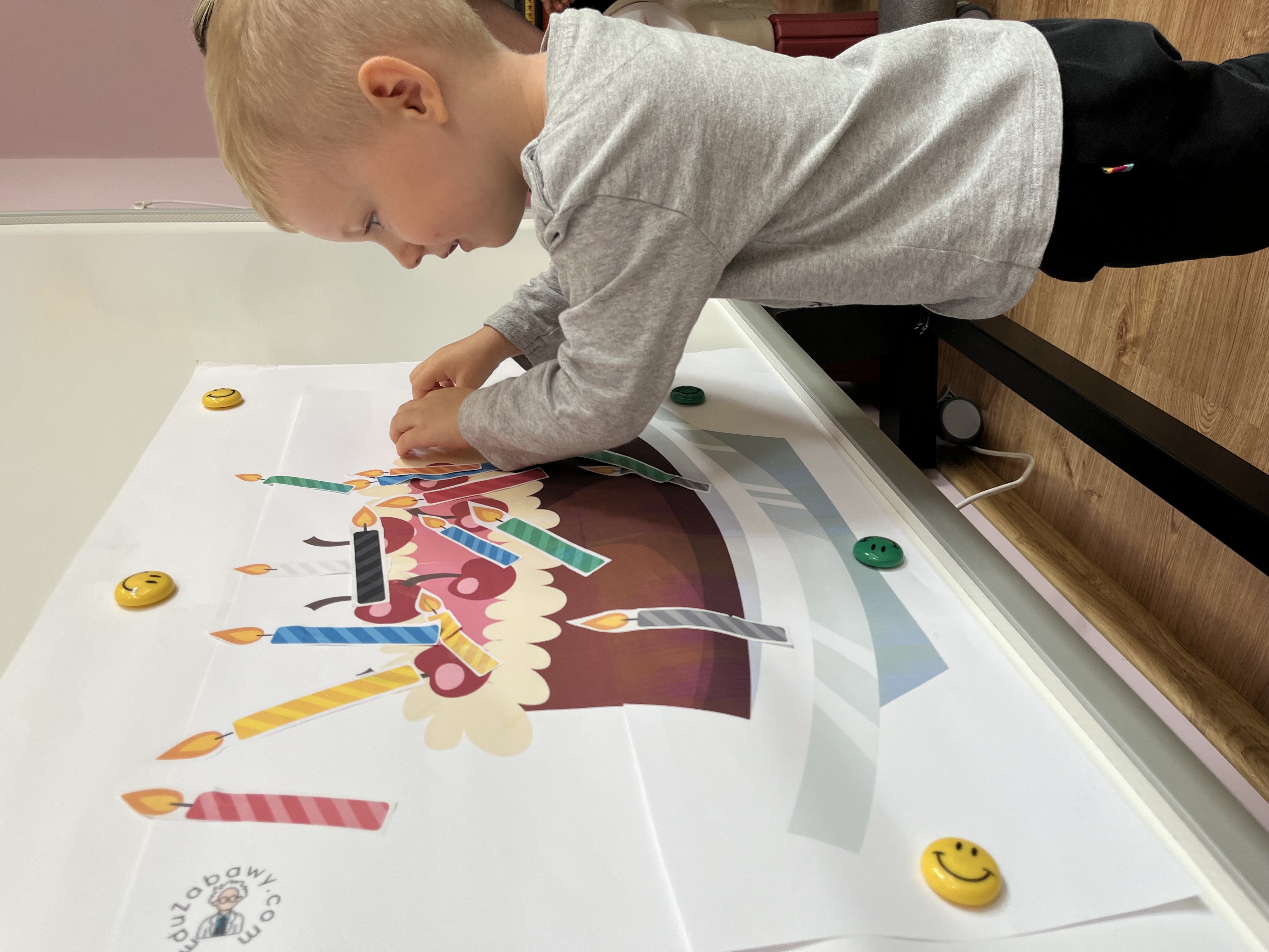 23 września w grupie Pszczółek obchodziliśmy Dzień Przedskolaka. Zaraz po śniadaniu zrobiliśmy sesję zdjeciową w naszej kolorowej "foto budce" a później jak na uroczyste święto przystało był "tort", na którym każdy mógł przykleić swoją świeczuszkę. Dzieci były zachwycone tymi zadaniami. Cały dzień przebiegał nam bardzo radośnie. Dodatkowo, z okazji pierwszego dnia jesieni odwiedziła nas najstarsza grupa, czyli Zajączki, które zaprezentowały nam piosenkę "Przebojowa jesień". Pszczółki z radością włączyły się w improwizację ruchową piosenki obserwując starsze kolażanki i kolegów.