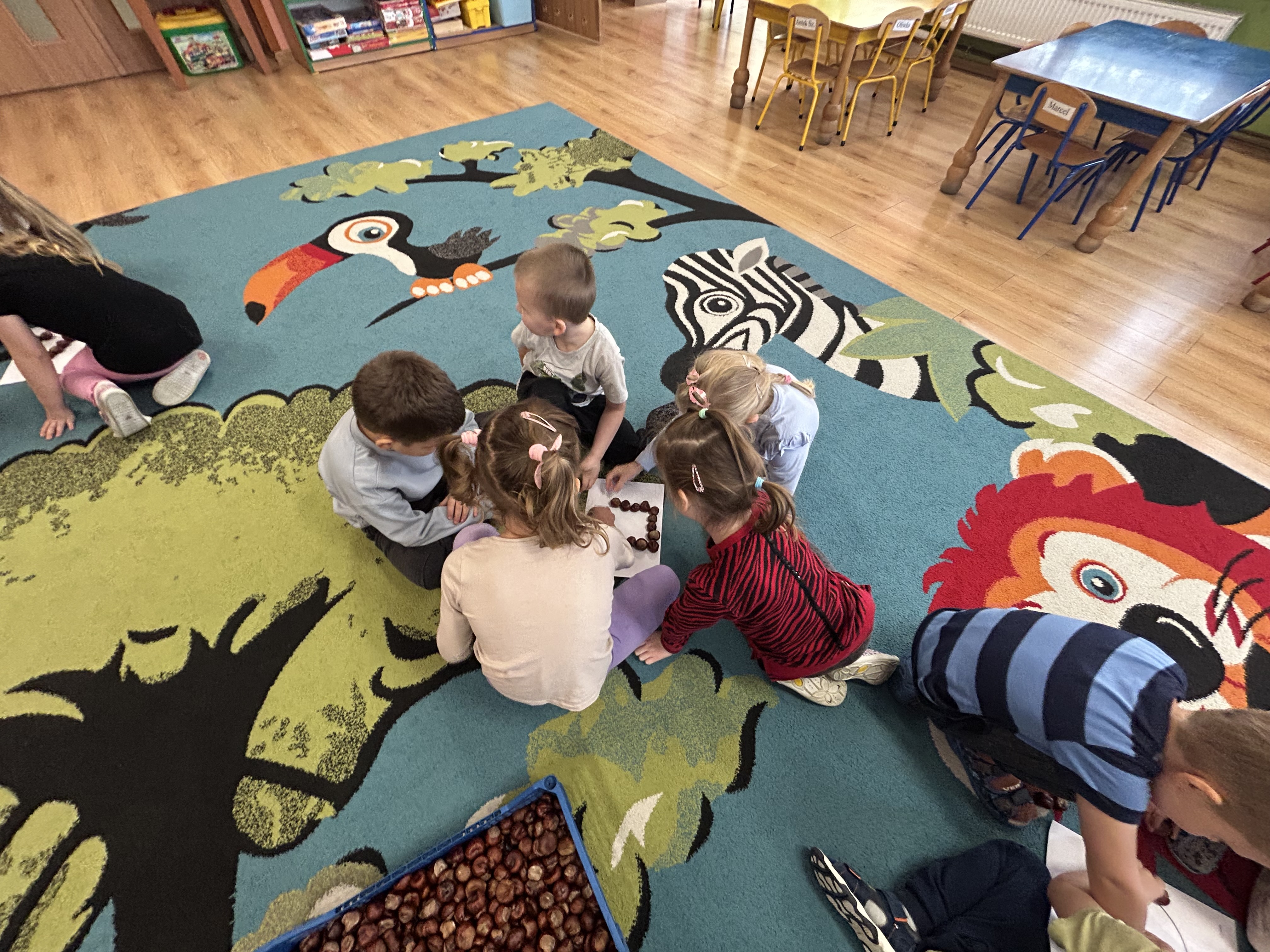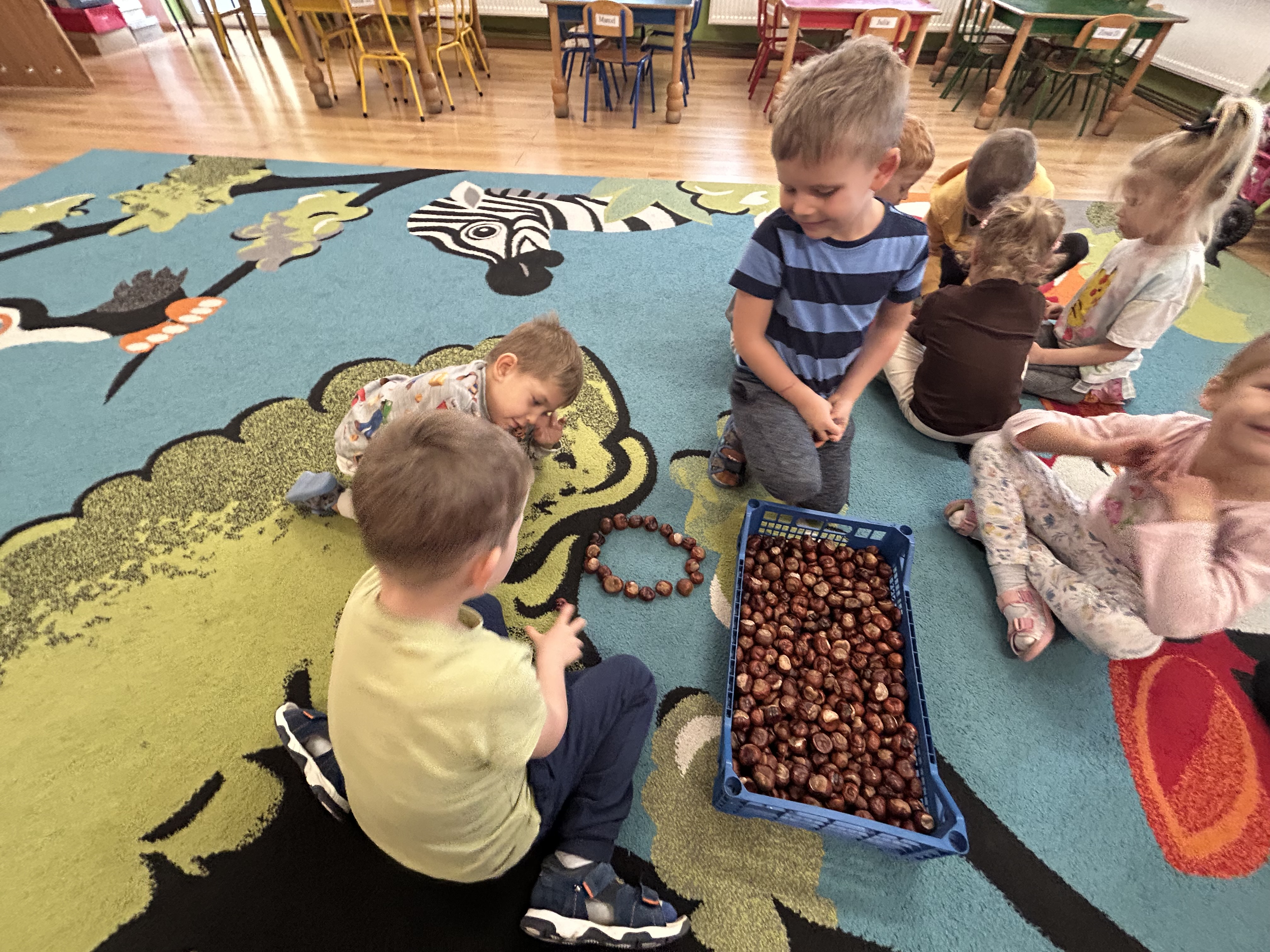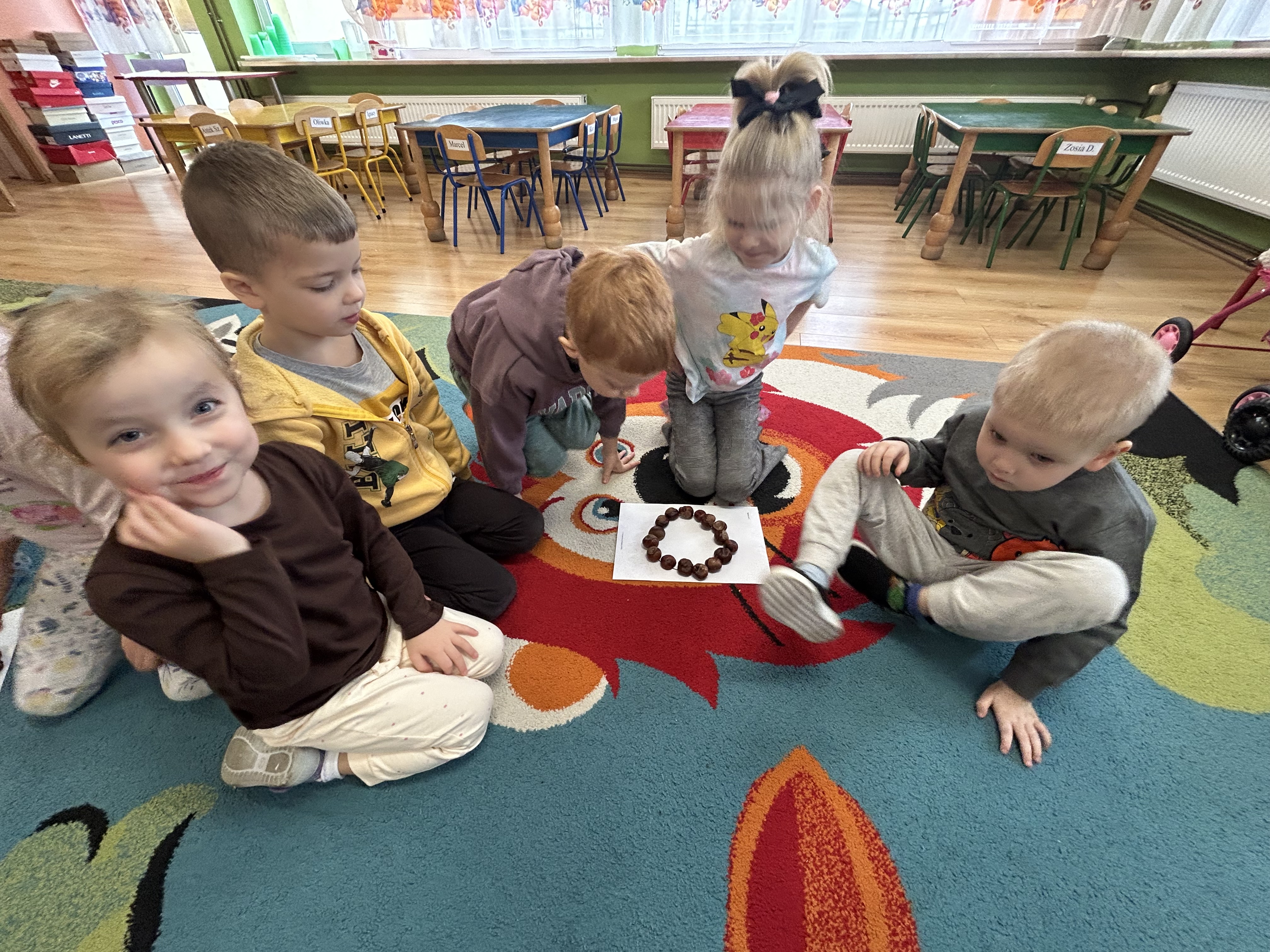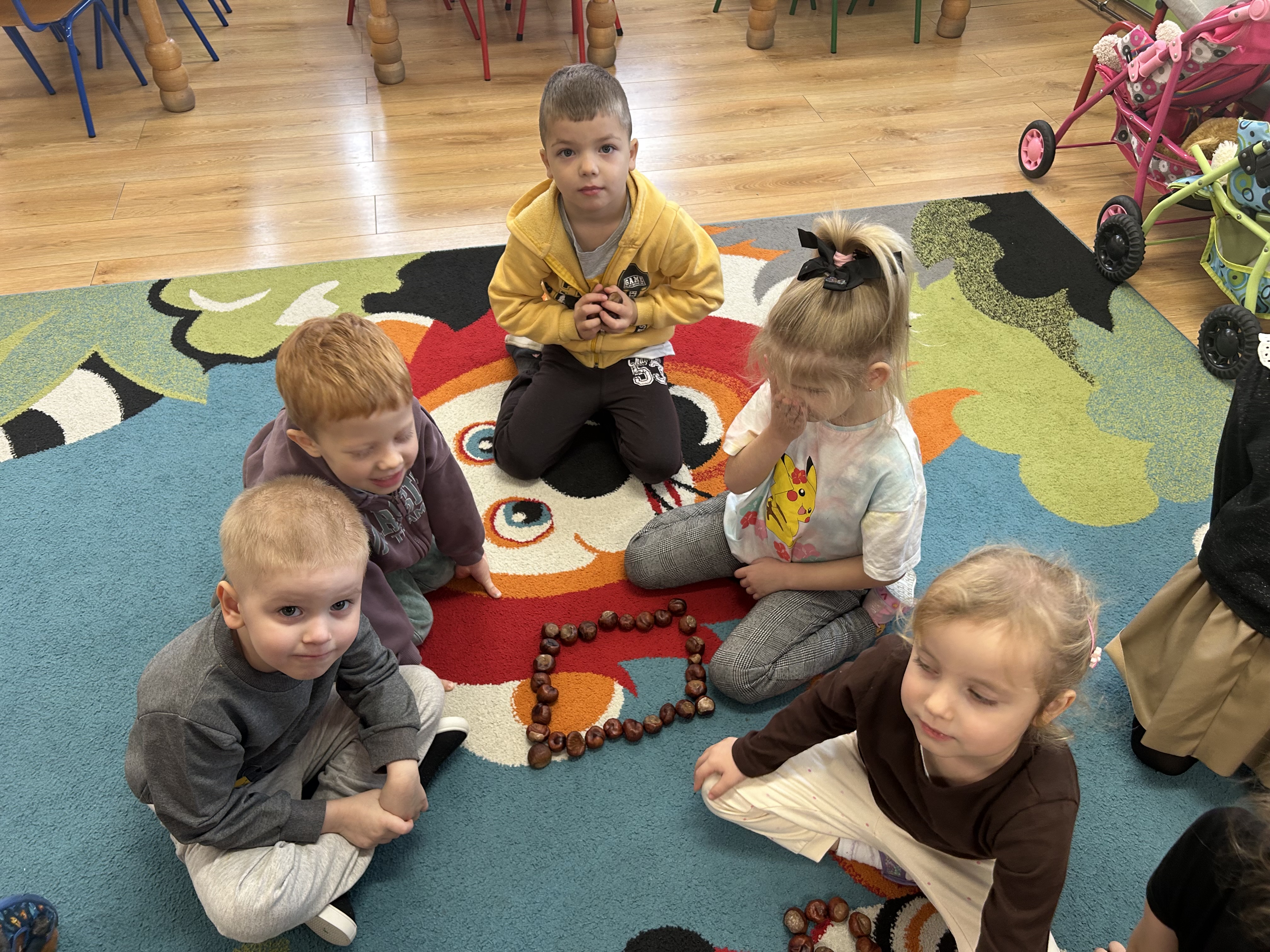 We wtorek 25 października Smerfy za pomocą kasztanów układały figury geometryczne tym samy utrwalając ich nazwy i ich charakterystyczne cechy (ilość boków). Początkowo układały figury z pomocą szablonów a następnie samodzielnie. W środę (26 października) układały liście według wielkości oraz szukały symetrycznych liści.