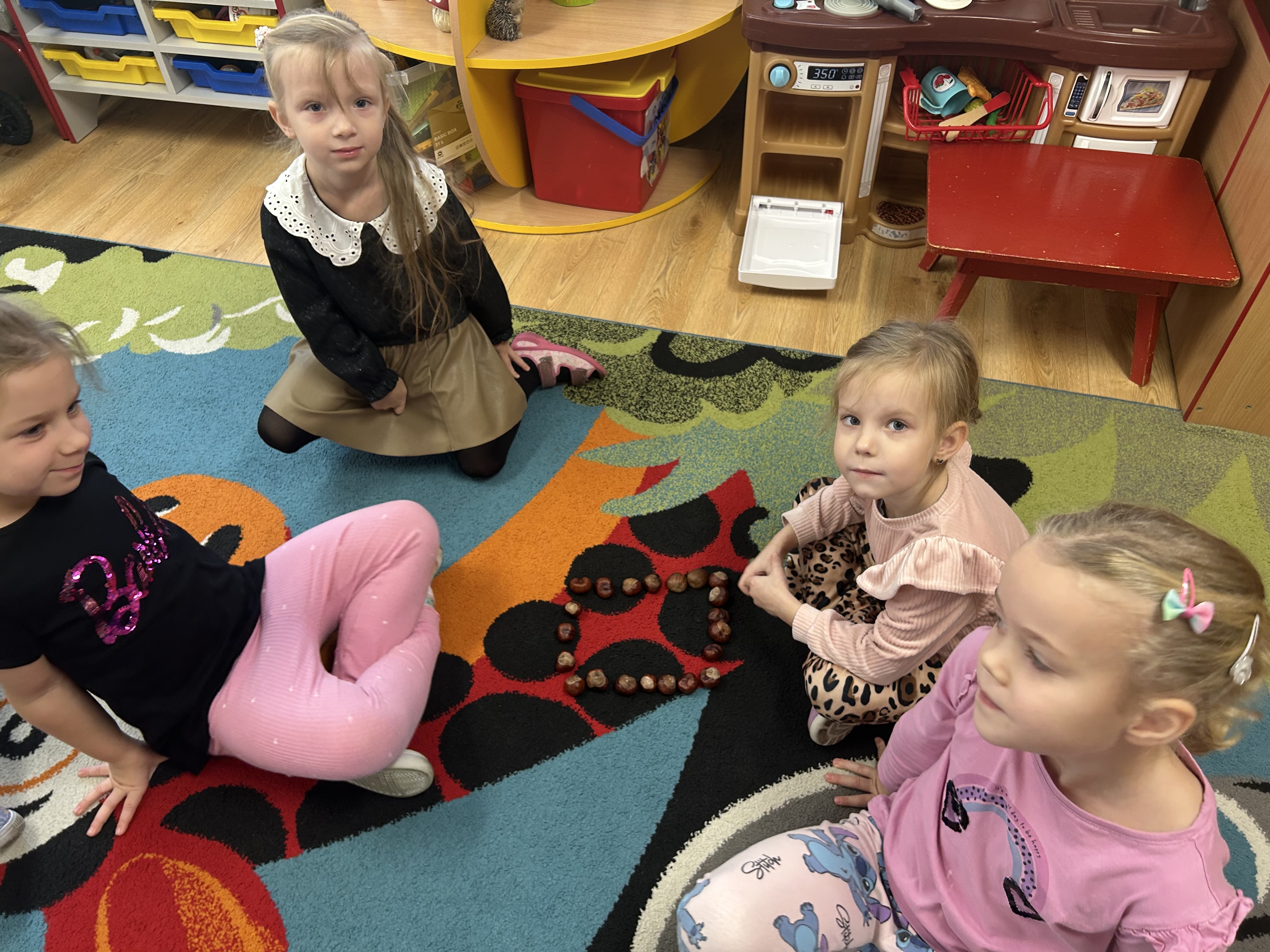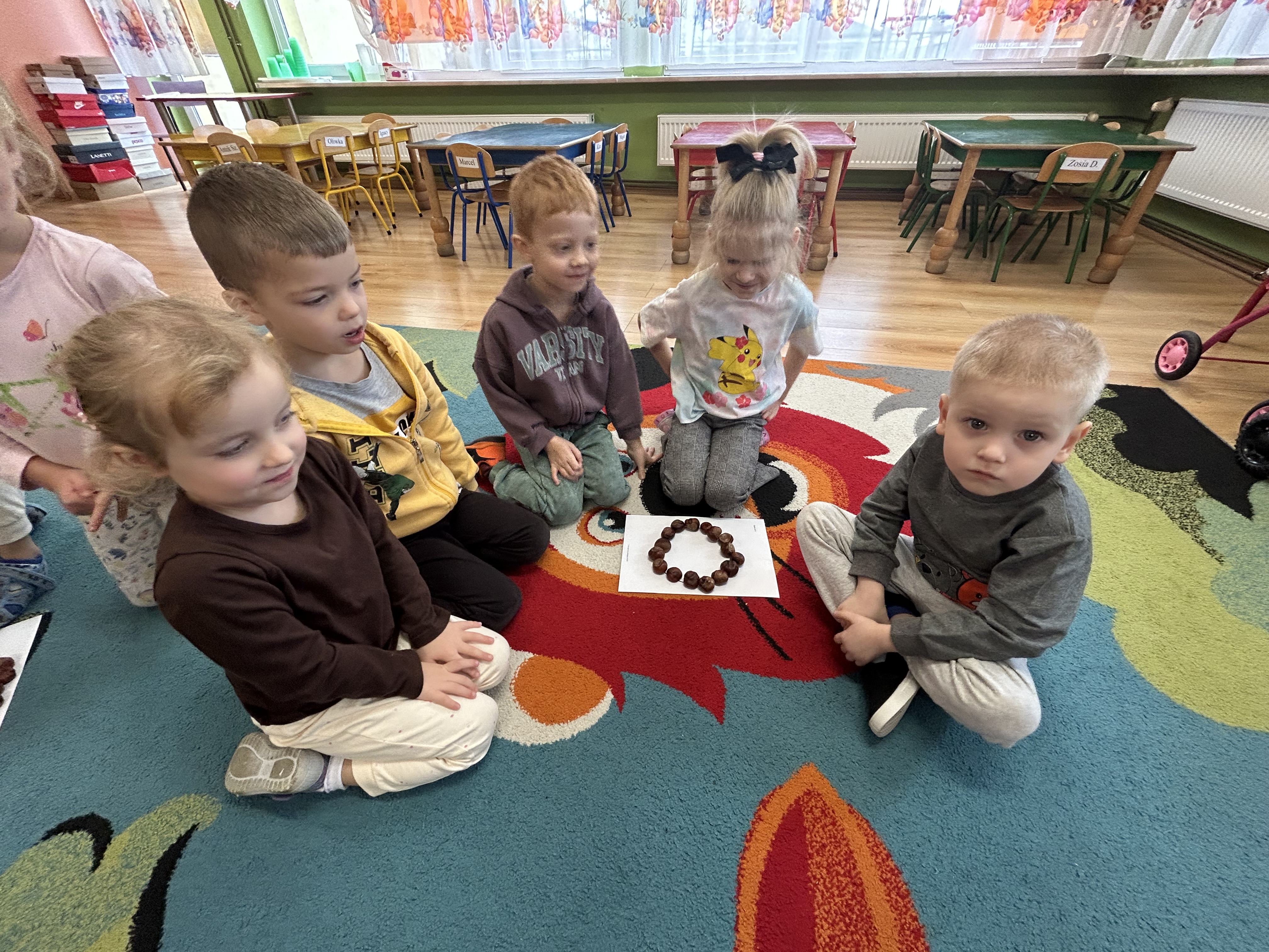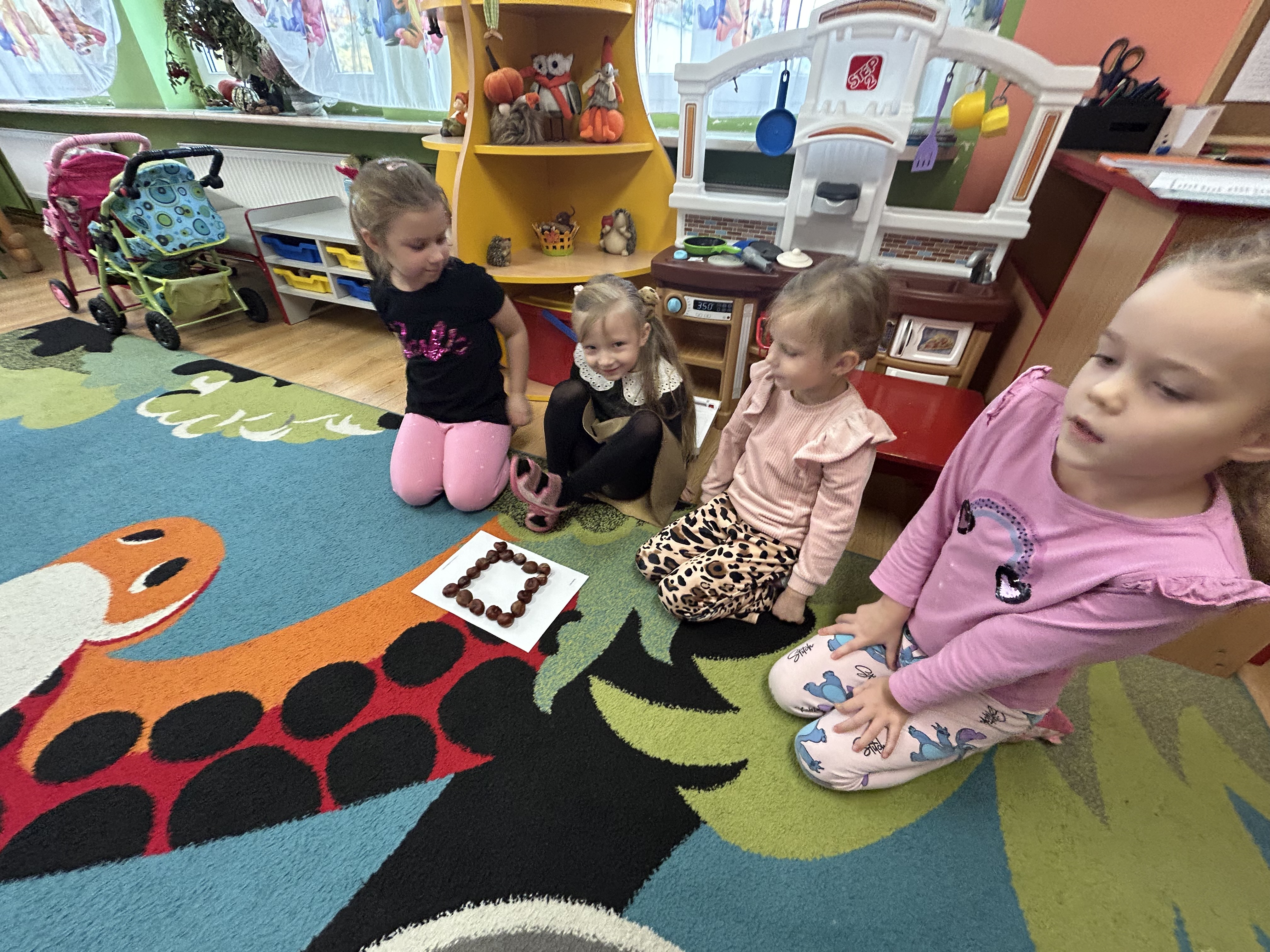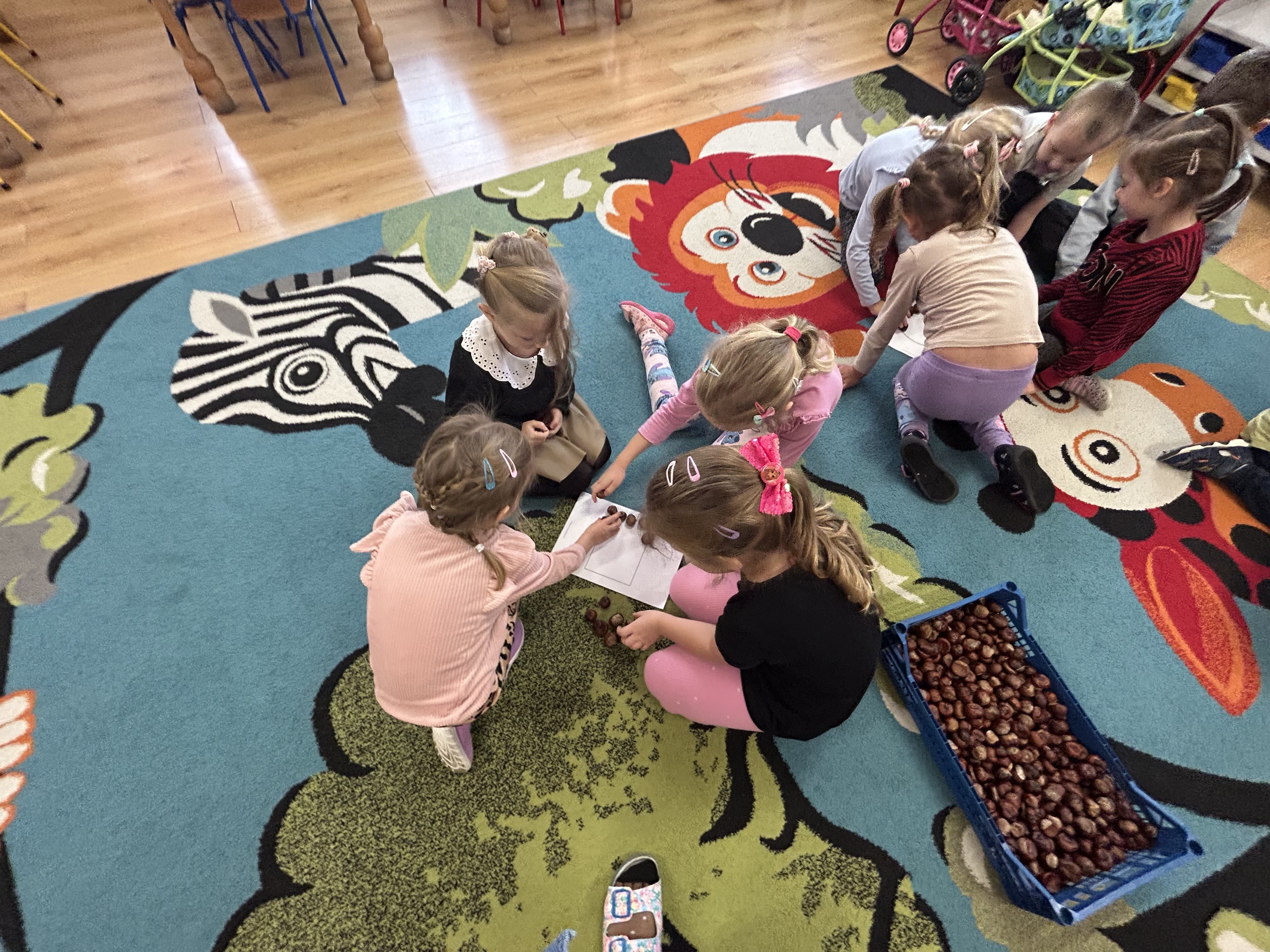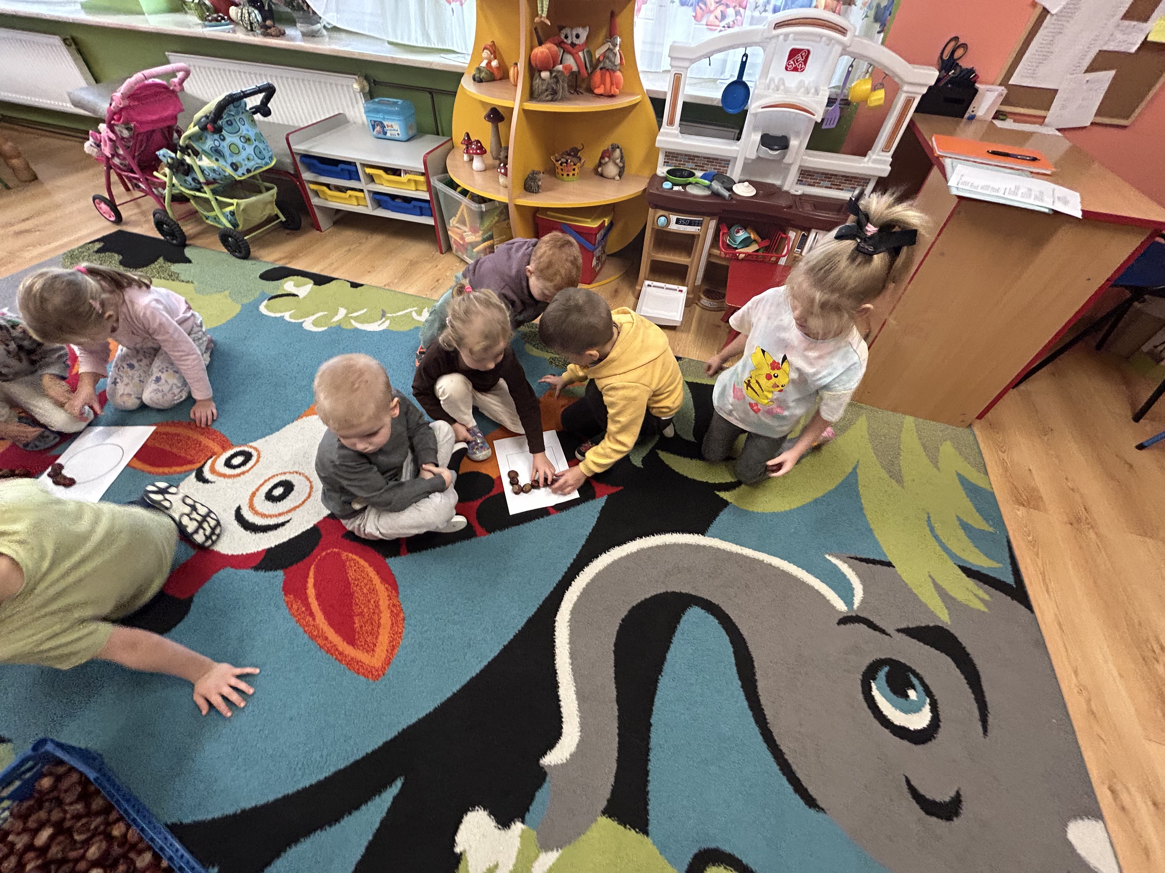 We wtorek 25 października Smerfy za pomocą kasztanów układały figury geometryczne tym samy utrwalając ich nazwy i ich charakterystyczne cechy (ilość boków). Początkowo układały figury z pomocą szablonów a następnie samodzielnie. W środę (26 października) układały liście według wielkości oraz szukały symetrycznych liści.
