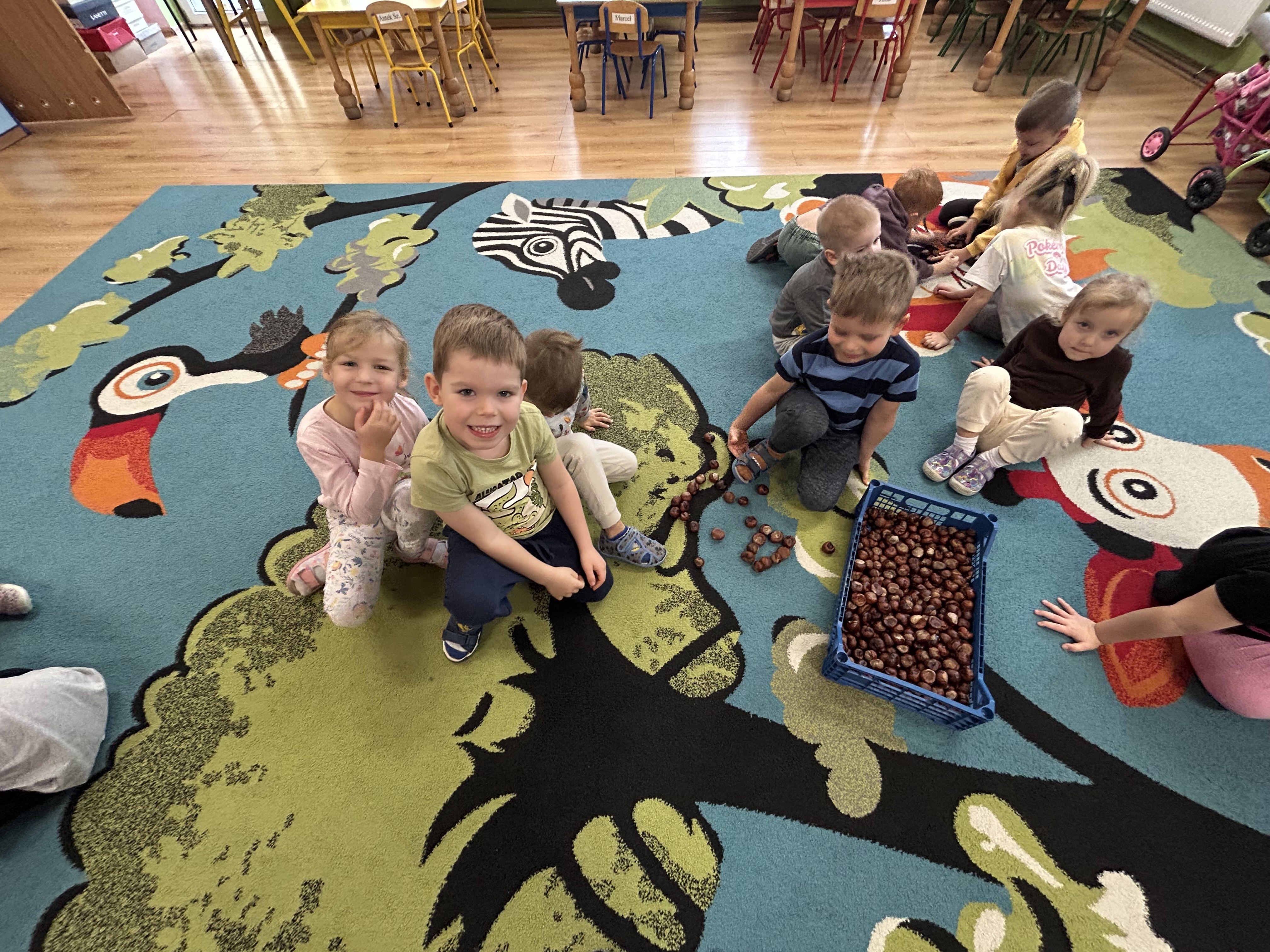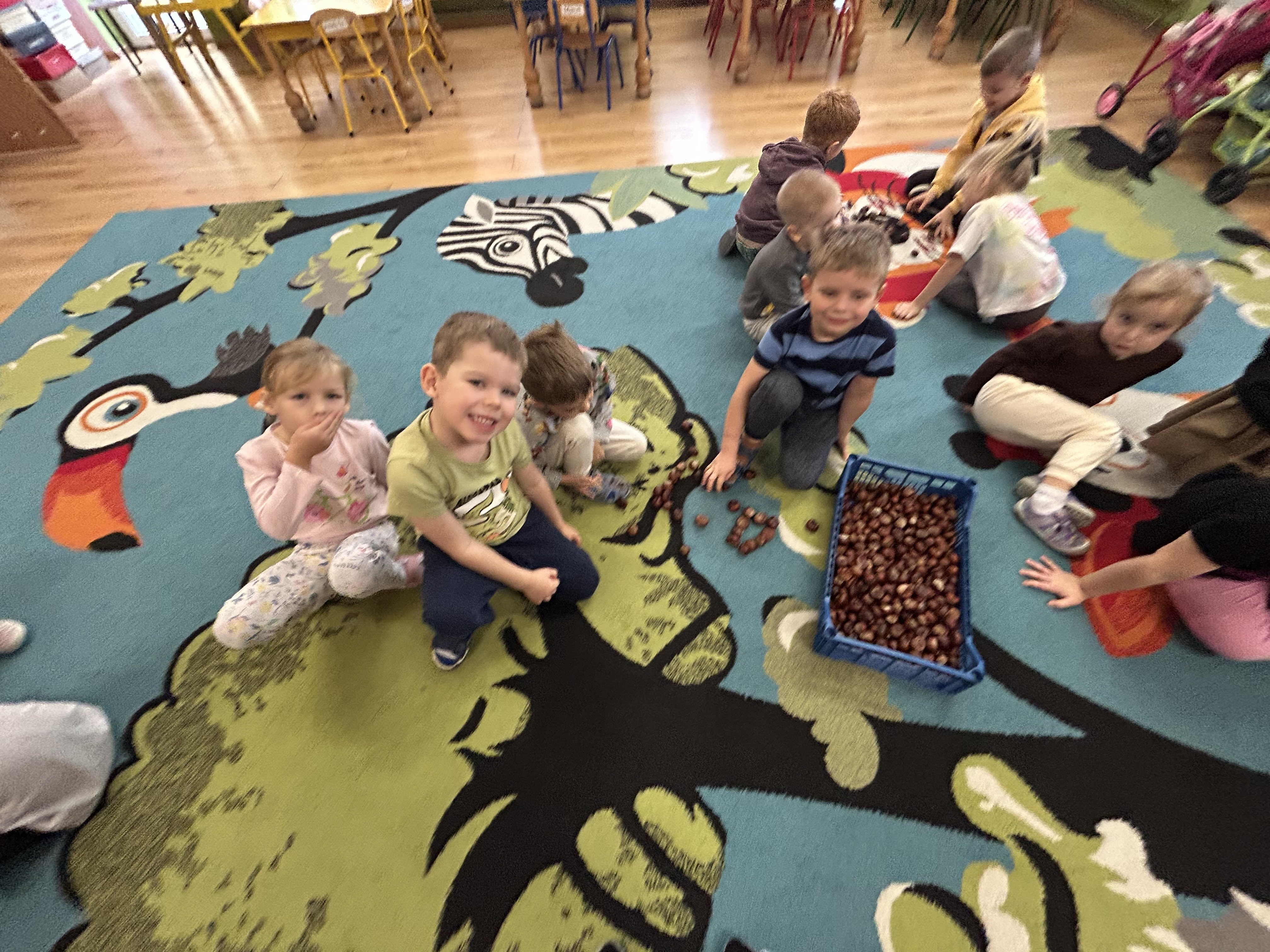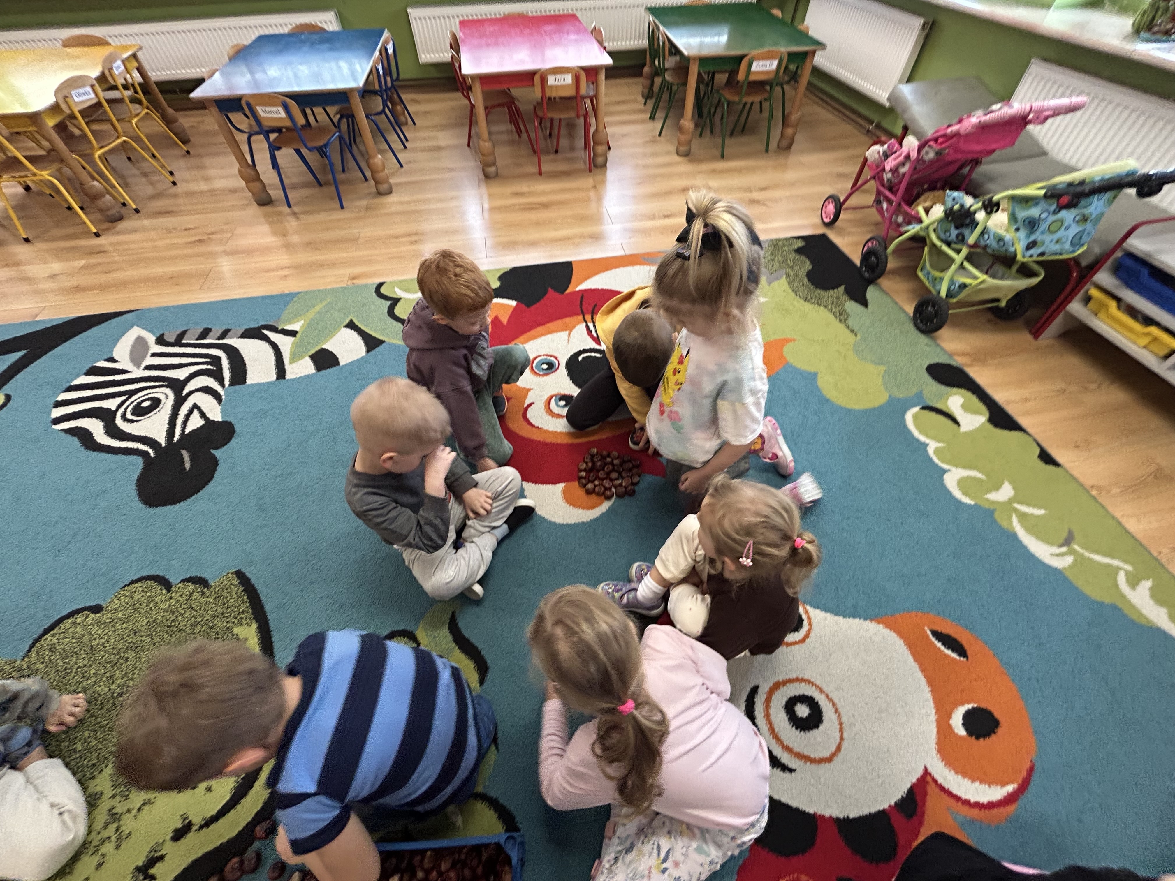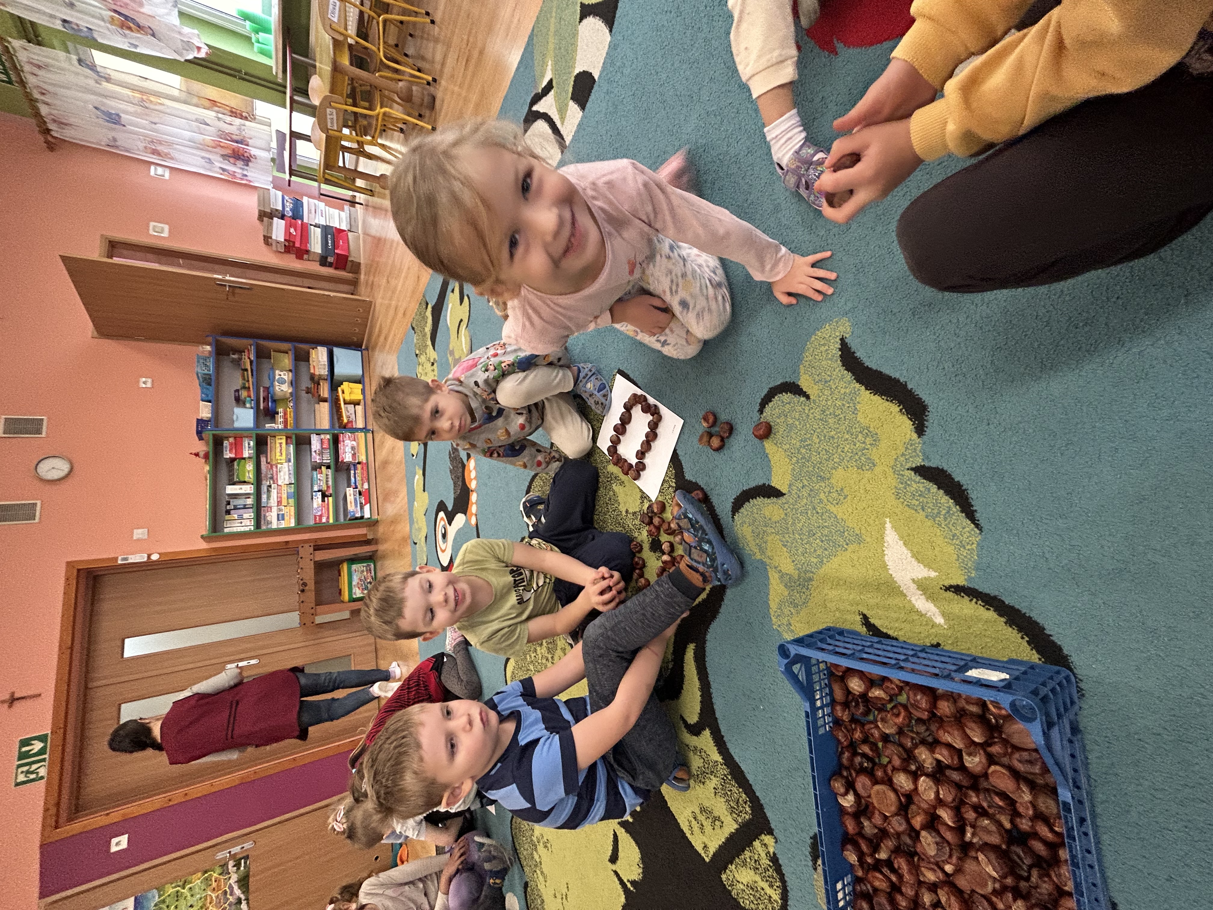 We wtorek 25 października Smerfy za pomocą kasztanów układały figury geometryczne tym samy utrwalając ich nazwy i ich charakterystyczne cechy (ilość boków). Początkowo układały figury z pomocą szablonów a następnie samodzielnie. W środę (26 października) układały liście według wielkości oraz szukały symetrycznych liści.