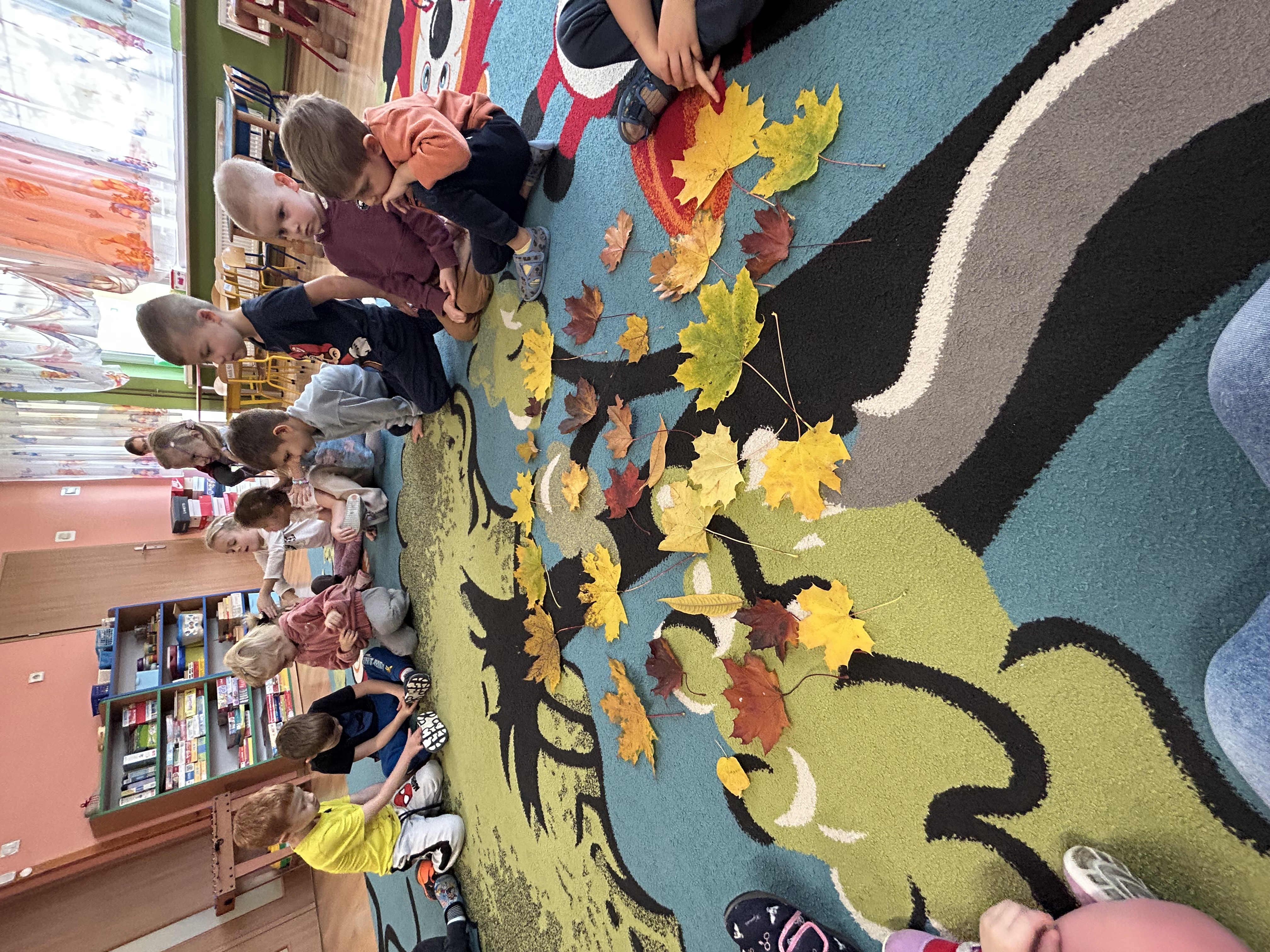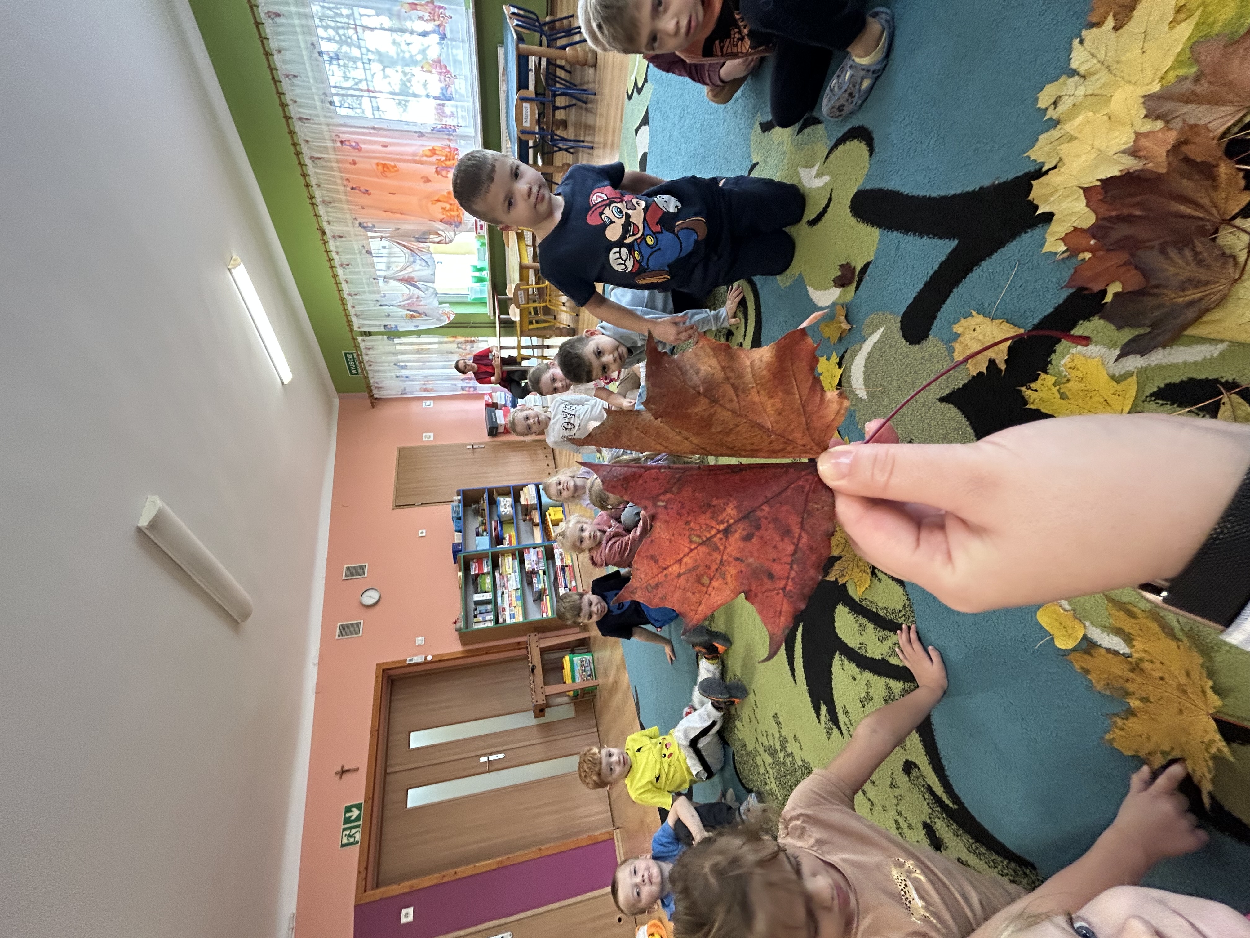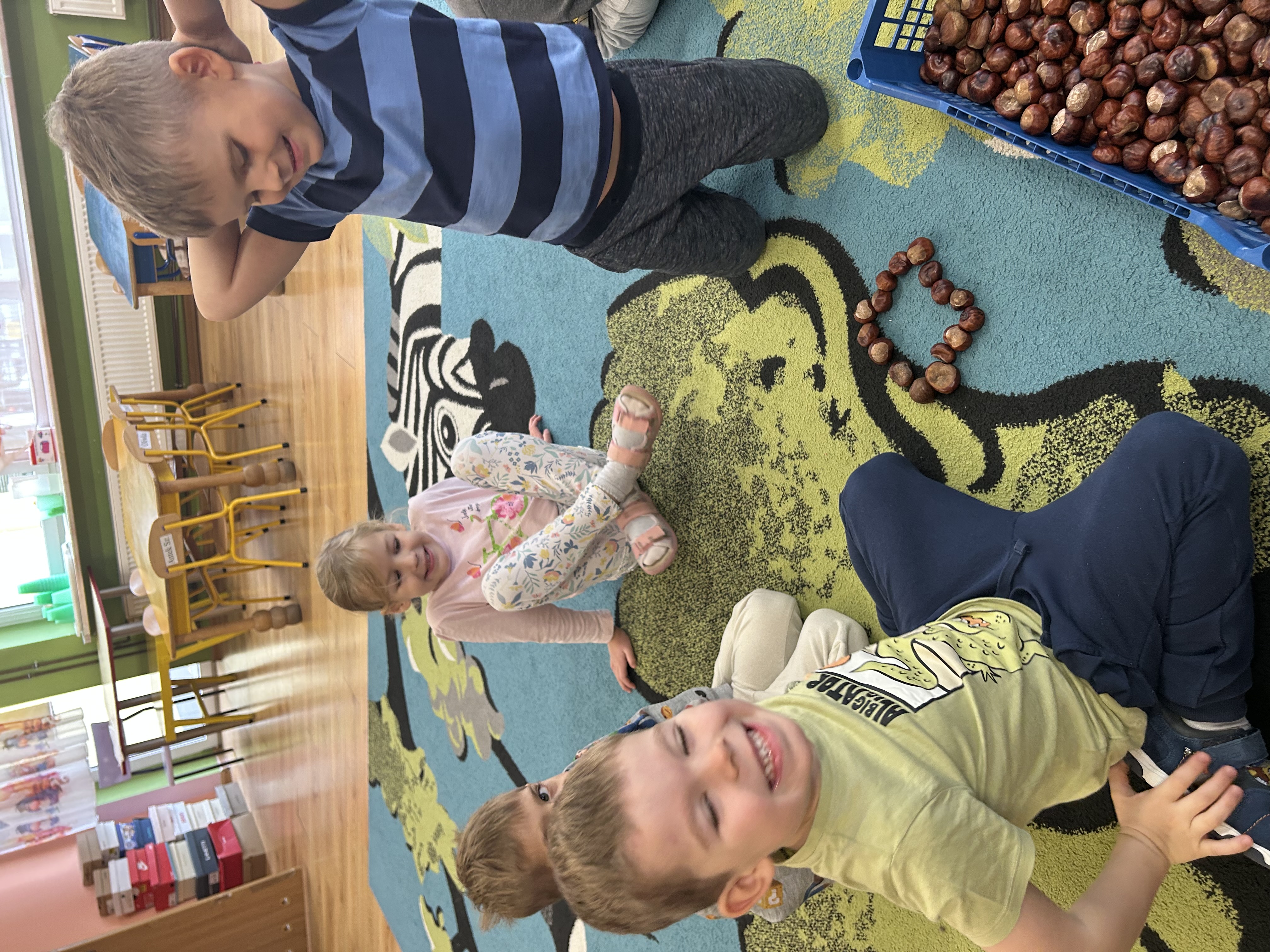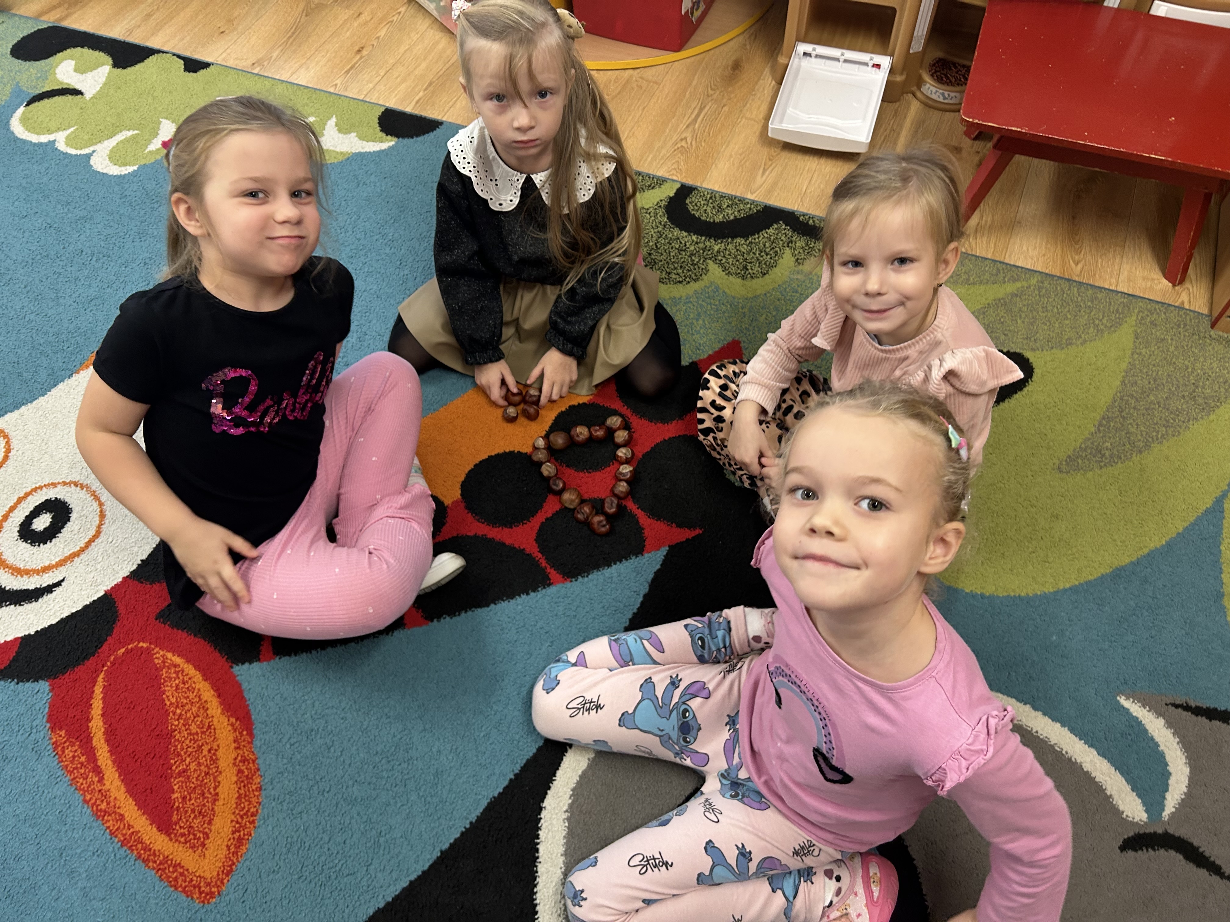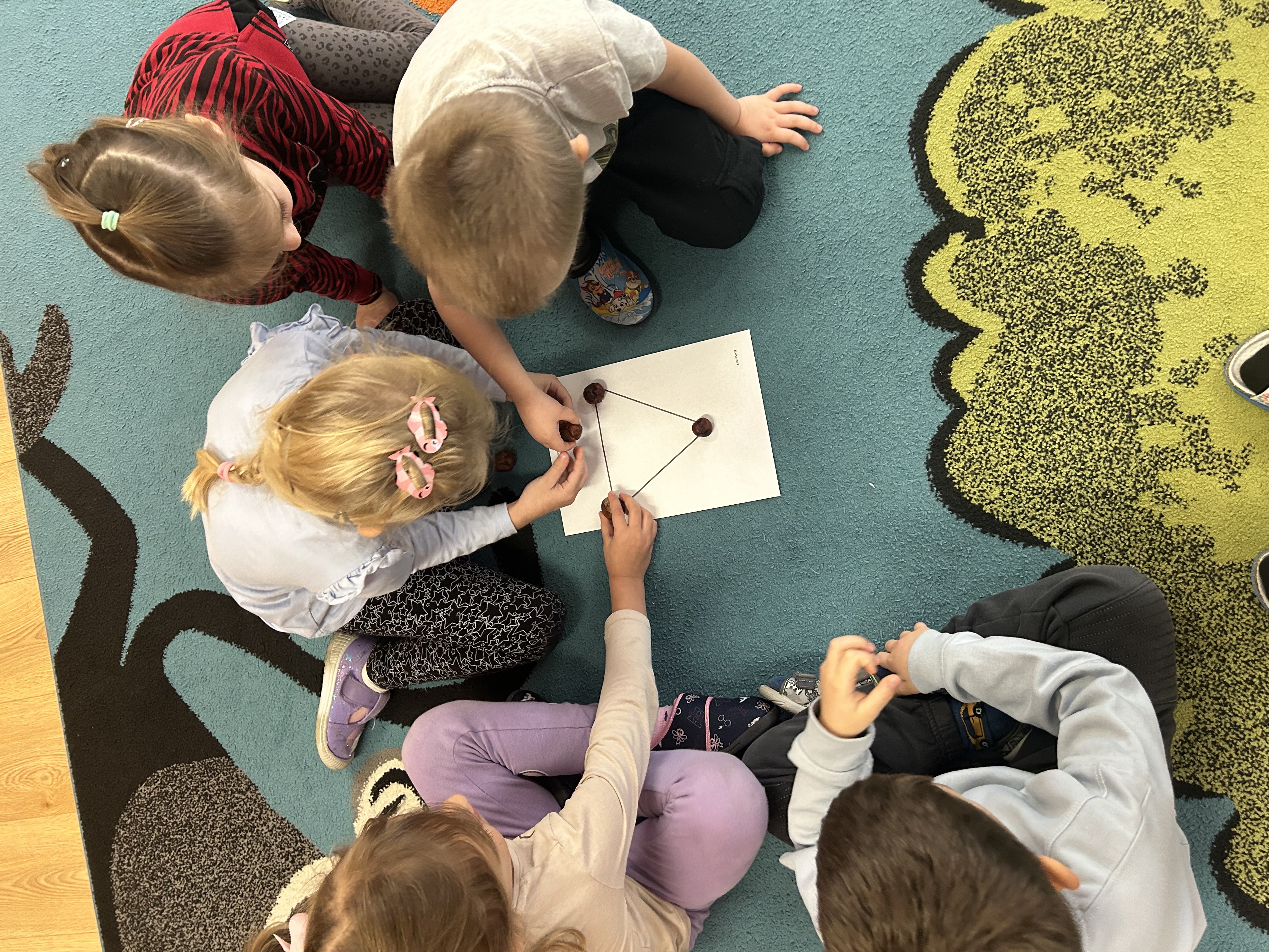 We wtorek 25 października Smerfy za pomocą kasztanów układały figury geometryczne tym samy utrwalając ich nazwy i ich charakterystyczne cechy (ilość boków). Początkowo układały figury z pomocą szablonów a następnie samodzielnie. W środę (26 października) układały liście według wielkości oraz szukały symetrycznych liści.