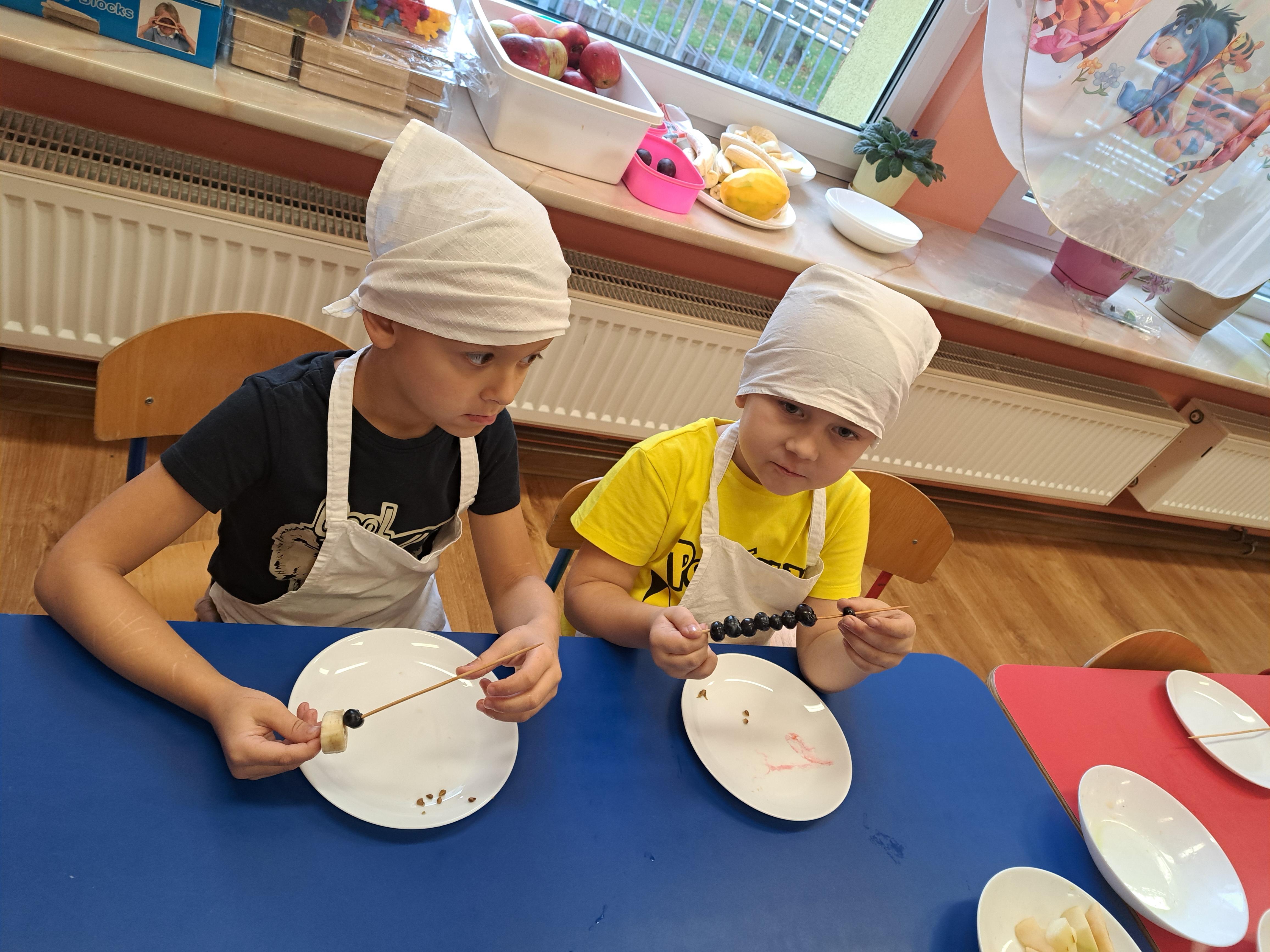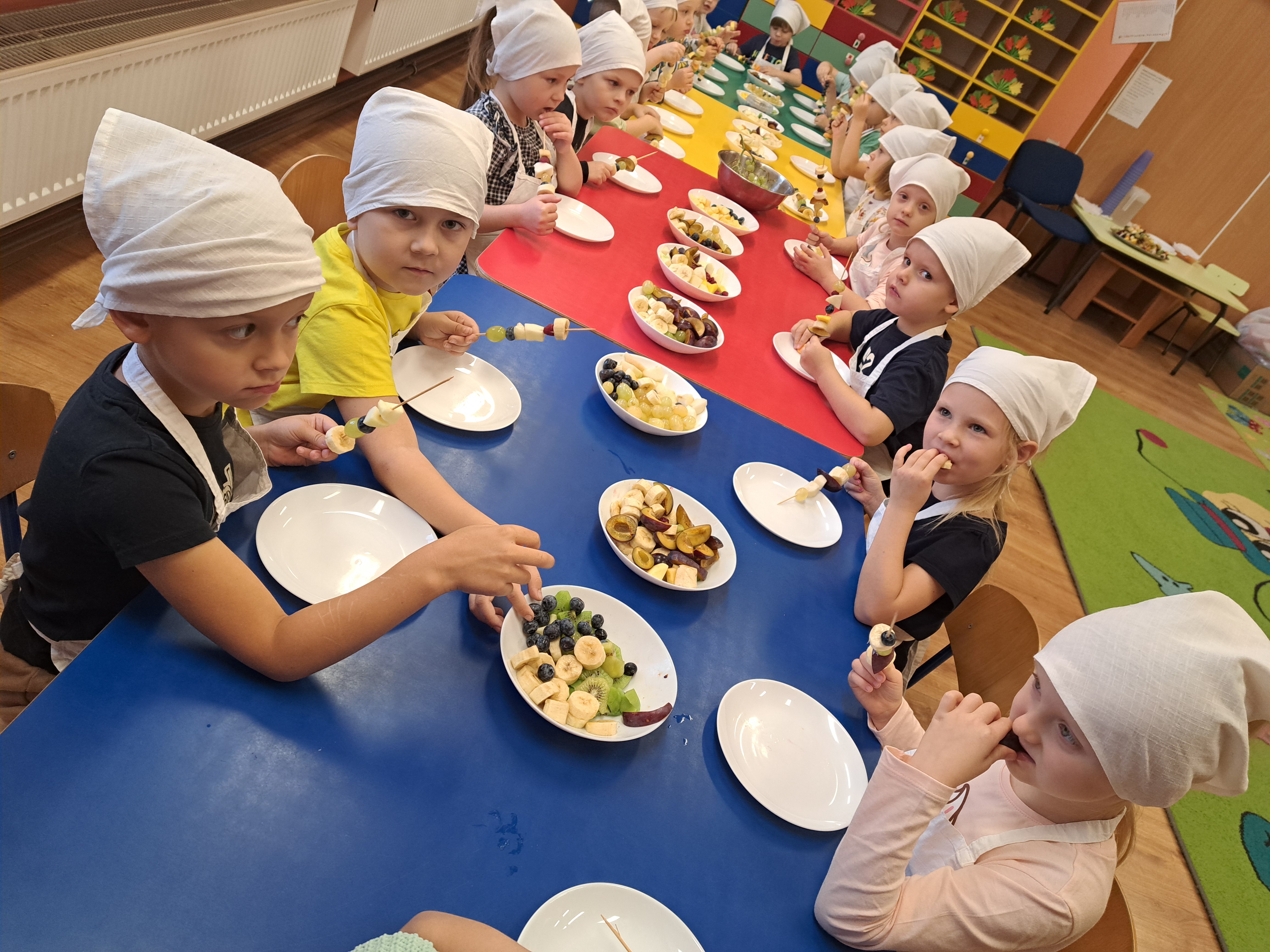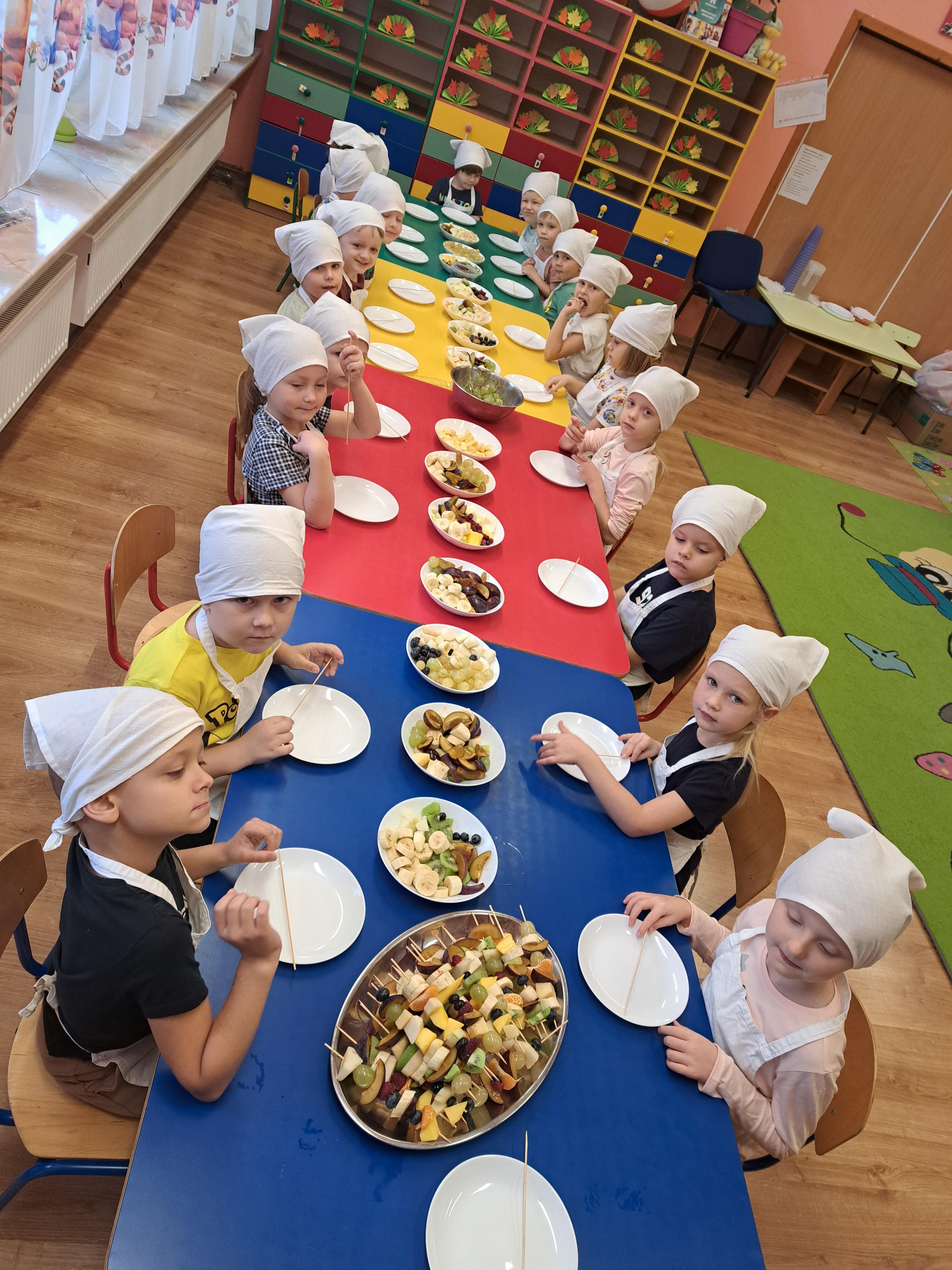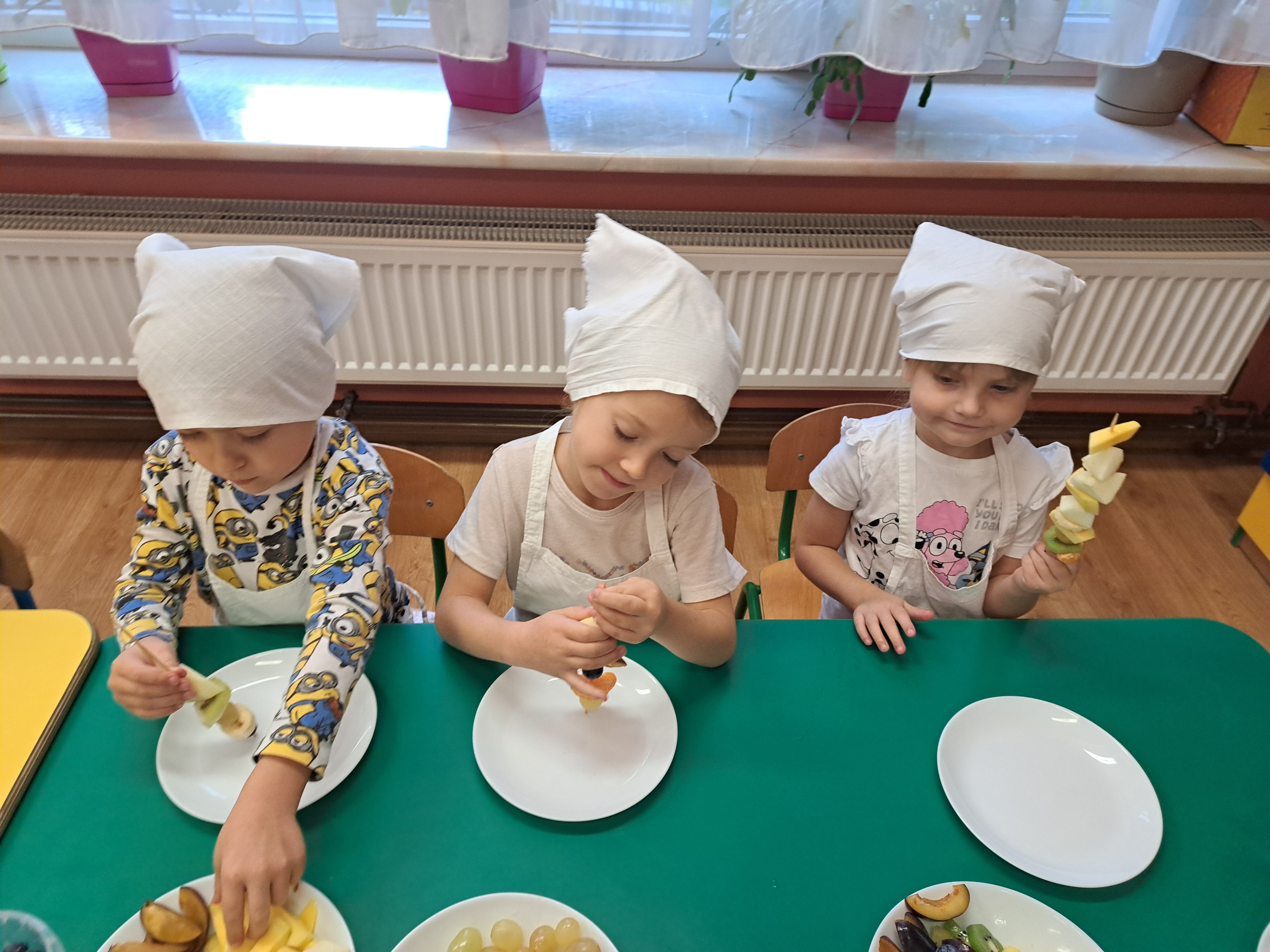 W dniu dzisiejszym /09.10.2025/ czwartkowe przedpołudnie minęło nam na przygotowywaniu pysznych, owocowych szaszłyków. Była to doskonała okazja do powtórzenia nazw owoców, poznania ich zapachów i smaku. MISIE z niecierpliwością przygotowywały się do tego kulinarnego wyzwania, chętnie komponowały i nadziewały na patyczki swoje ulubione owoce, tworząc pyszne i zdrowe-szaszłyki owocowe. Przygotowanie deseru dało przedszkolakom wiele satysfakcji, uświadamiając im jednocześnie jak ważną rolę odgrywają witaminy dla właściwego funkcjonowania naszego organizmu.