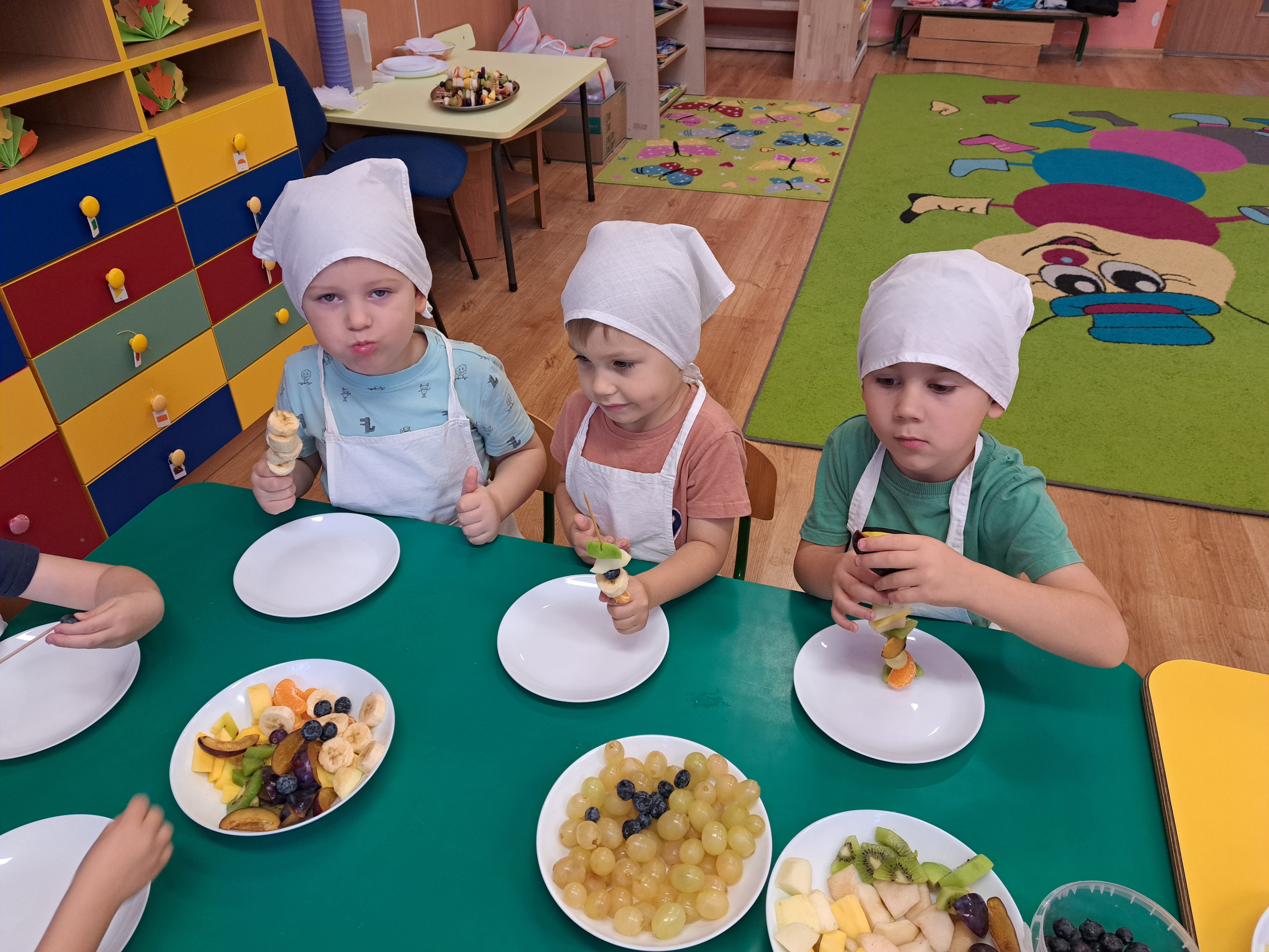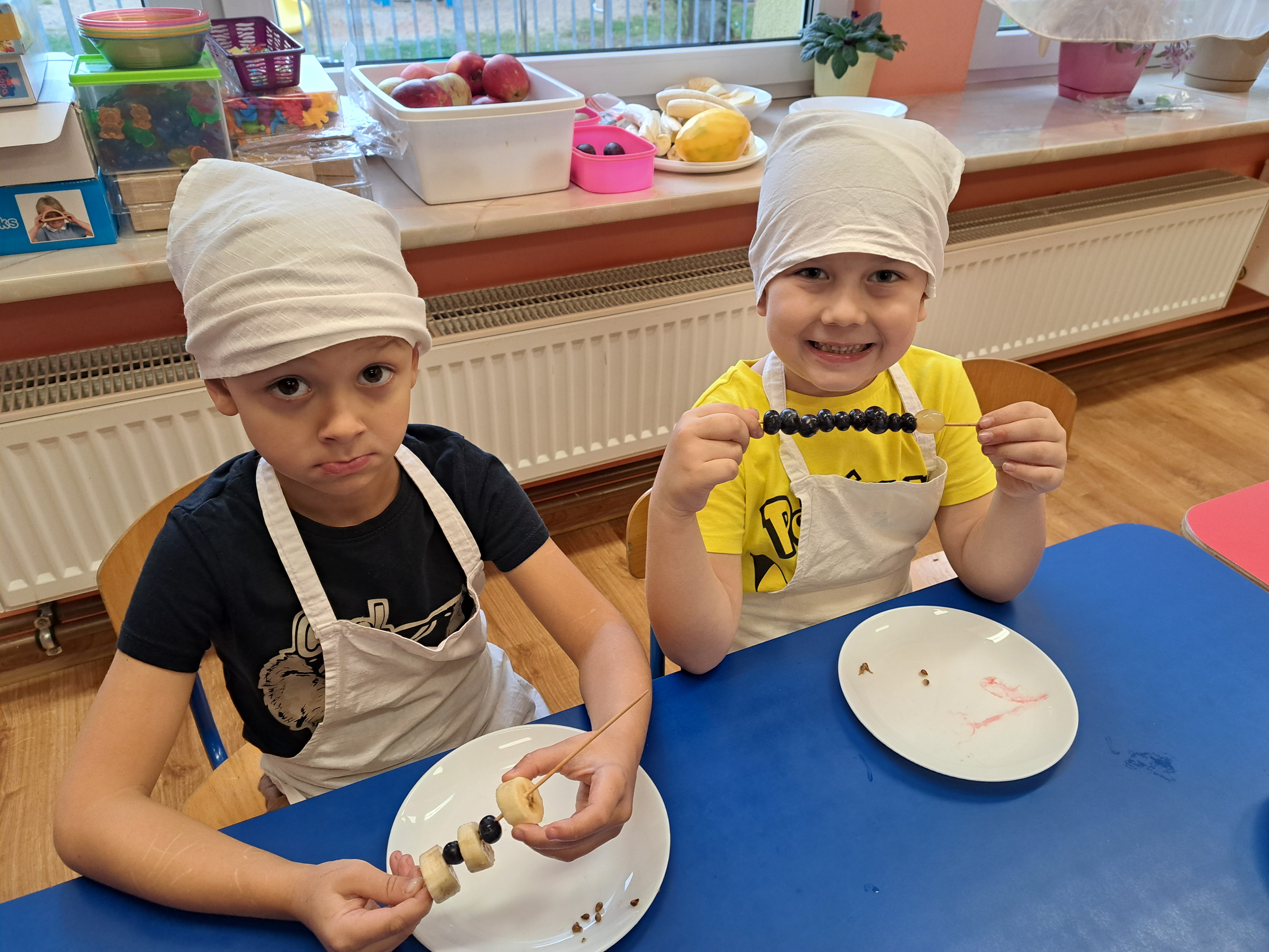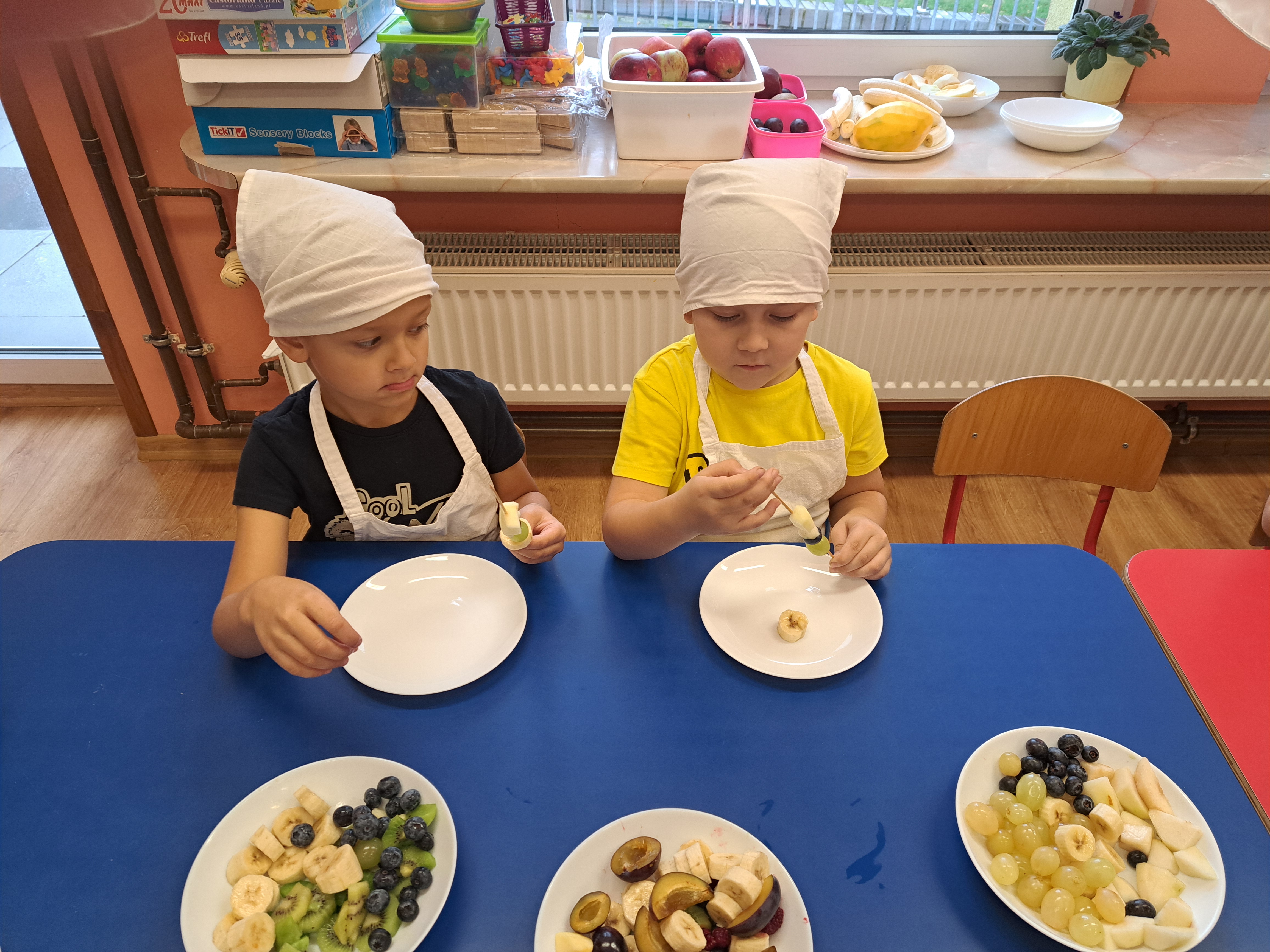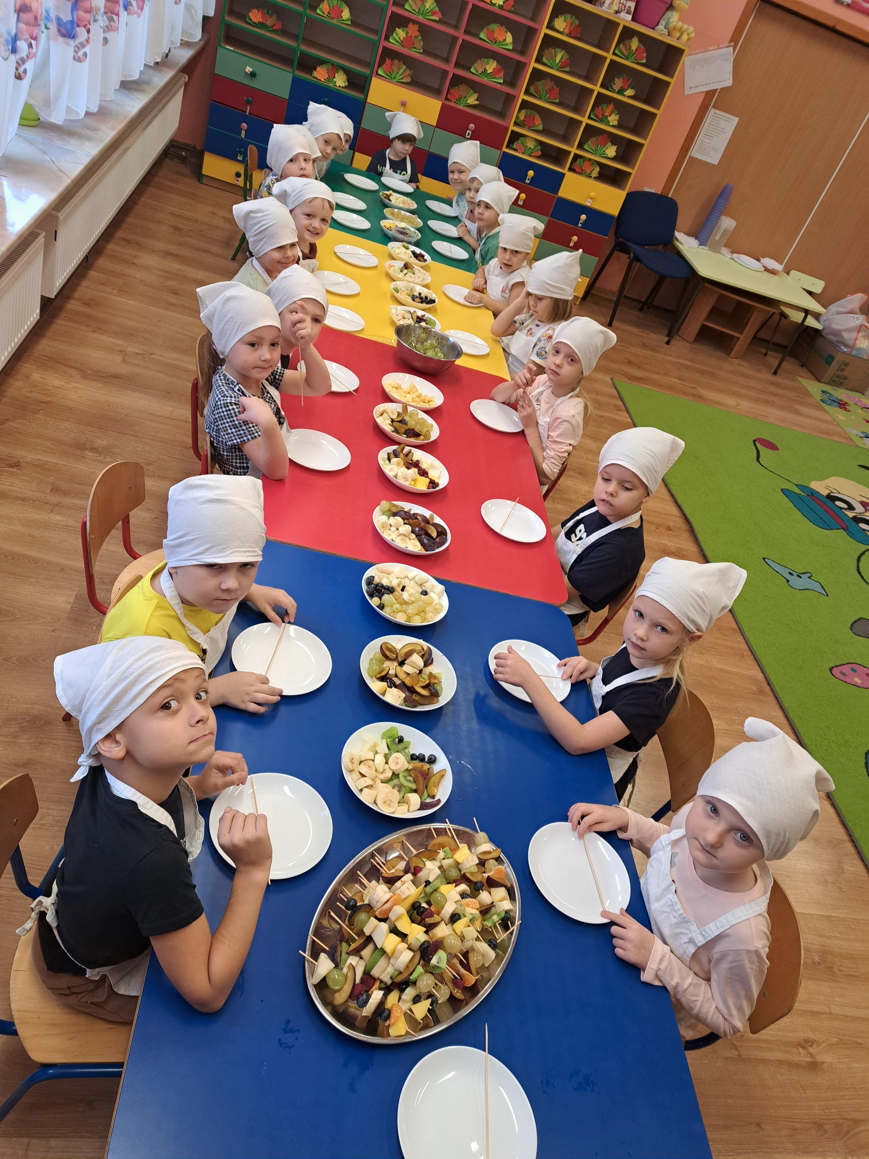 W dniu dzisiejszym /09.10.2025/ czwartkowe przedpołudnie minęło nam na przygotowywaniu pysznych, owocowych szaszłyków. Była to doskonała okazja do powtórzenia nazw owoców, poznania ich zapachów i smaku. MISIE z niecierpliwością przygotowywały się do tego kulinarnego wyzwania, chętnie komponowały i nadziewały na patyczki swoje ulubione owoce, tworząc pyszne i zdrowe-szaszłyki owocowe. Przygotowanie deseru dało przedszkolakom wiele satysfakcji, uświadamiając im jednocześnie jak ważną rolę odgrywają witaminy dla właściwego funkcjonowania naszego organizmu.