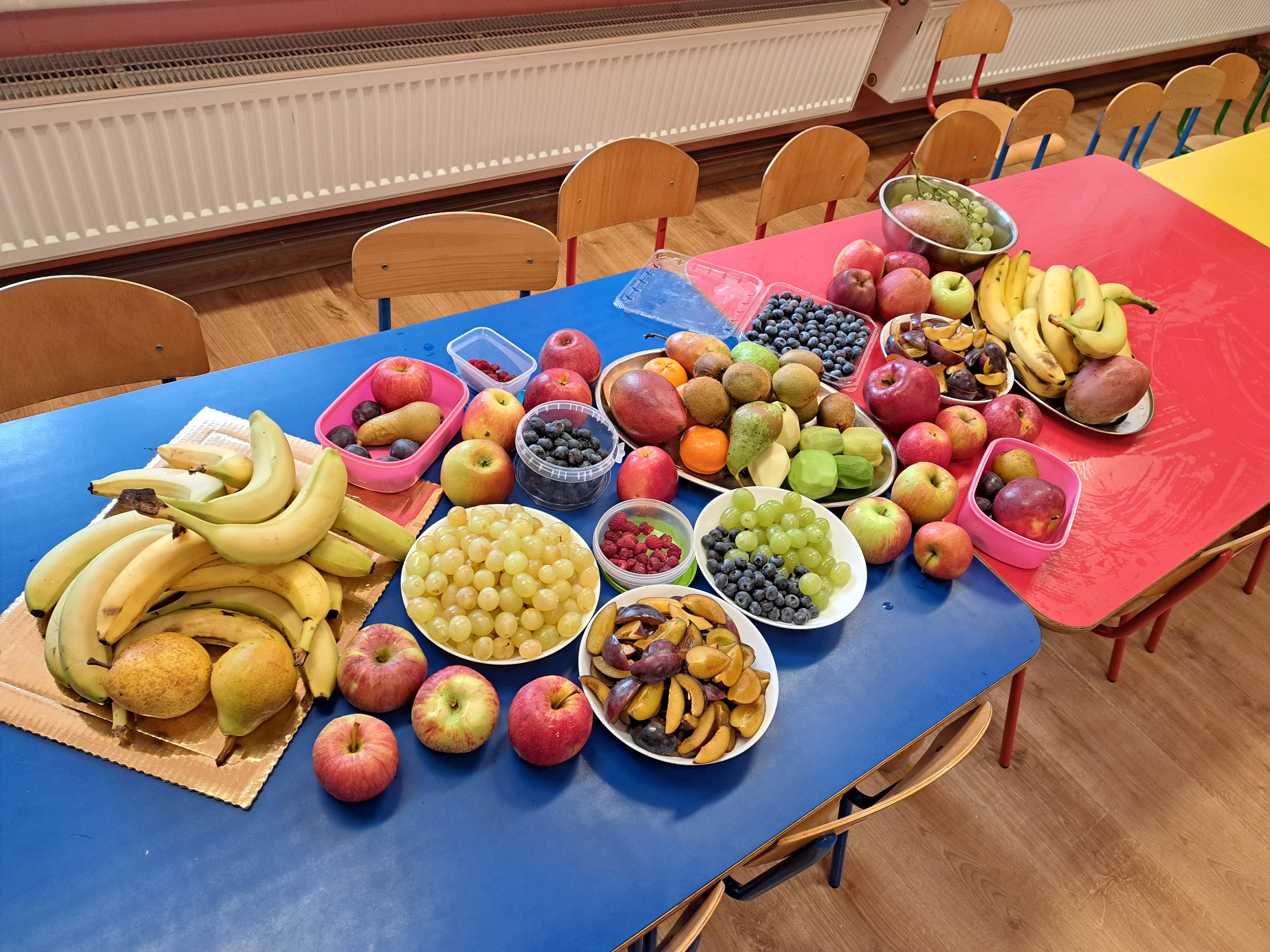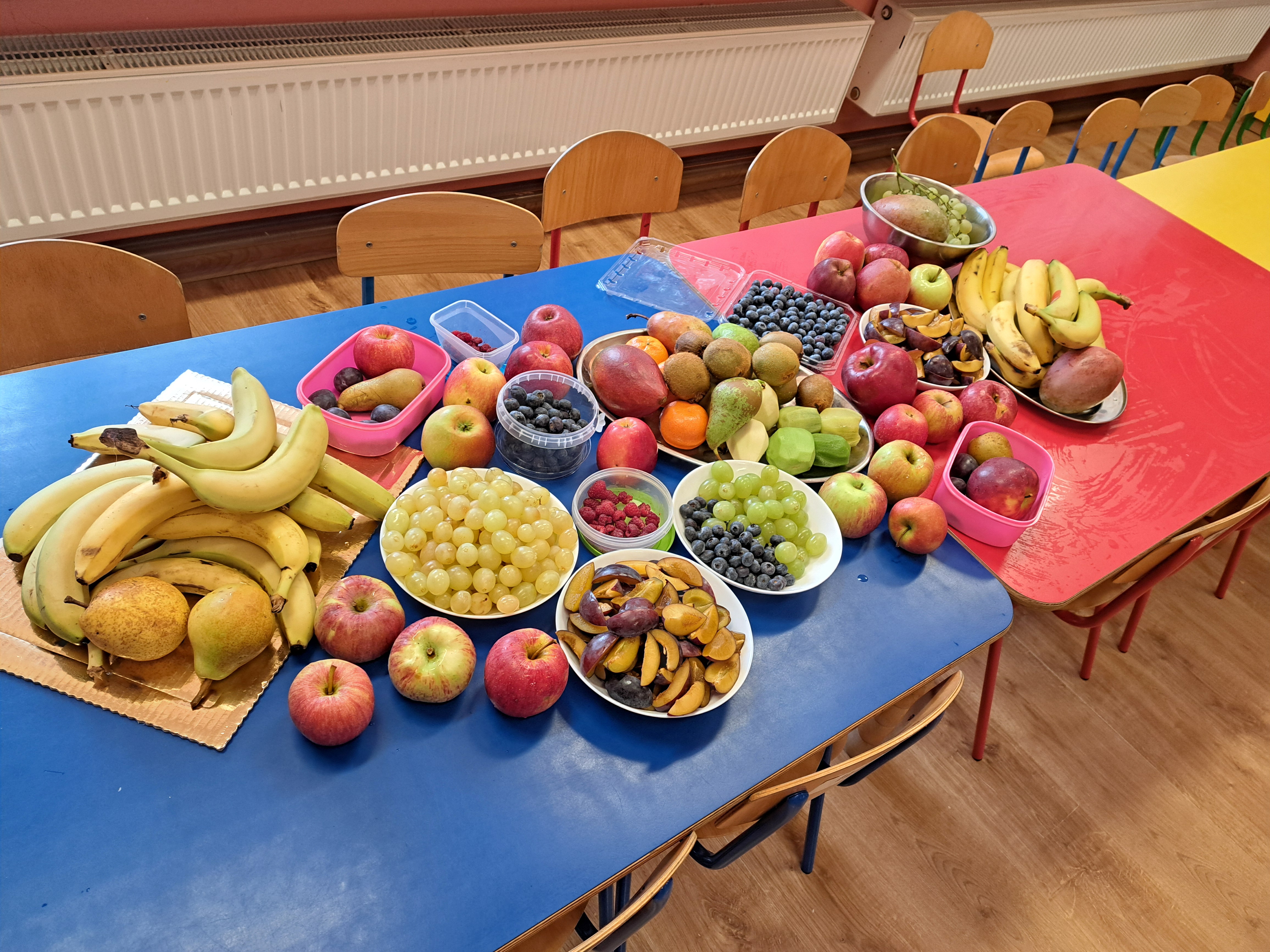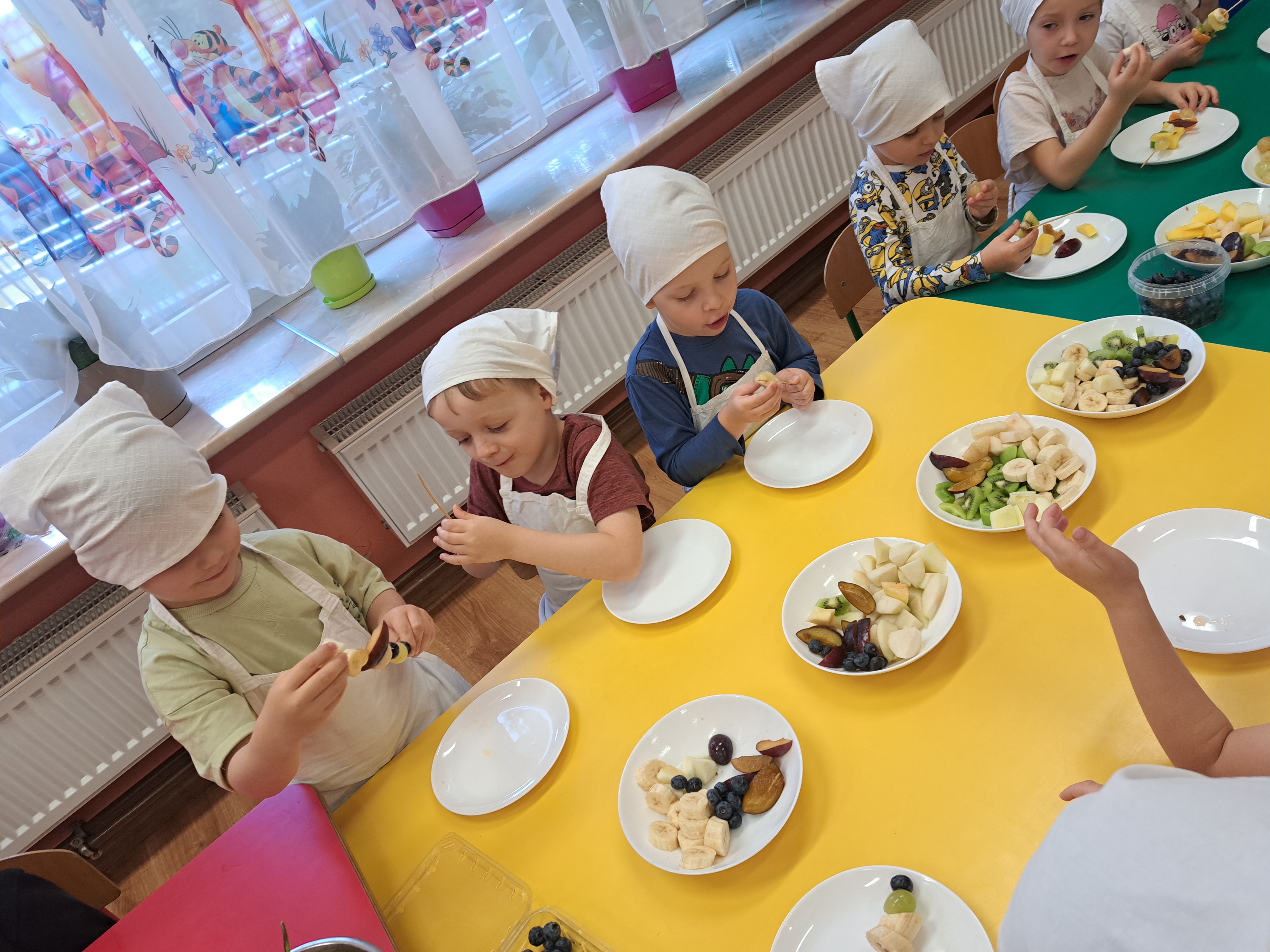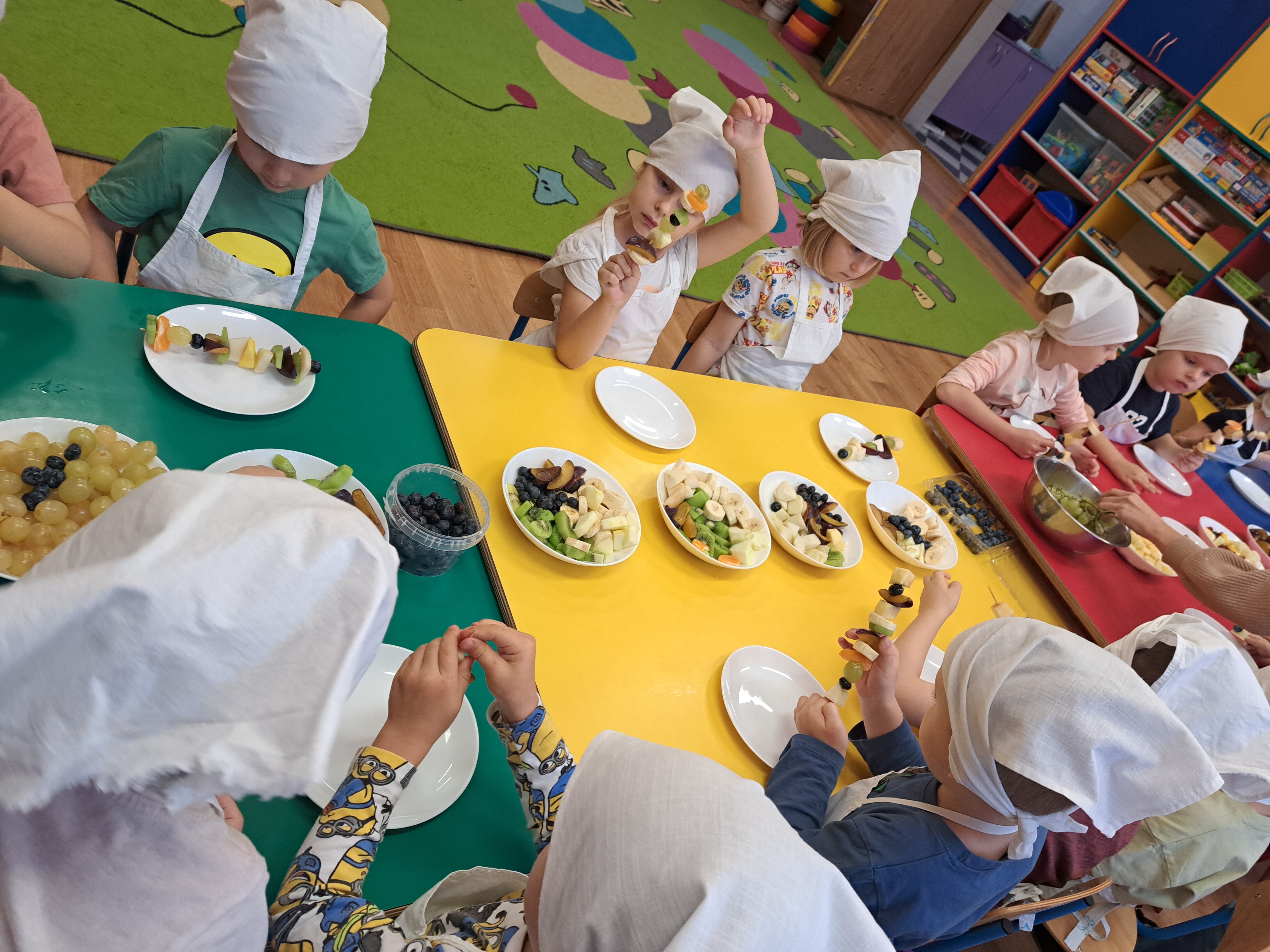 W dniu dzisiejszym /09.10.2025/ czwartkowe przedpołudnie minęło nam na przygotowywaniu pysznych, owocowych szaszłyków. Była to doskonała okazja do powtórzenia nazw owoców, poznania ich zapachów i smaku. MISIE z niecierpliwością przygotowywały się do tego kulinarnego wyzwania, chętnie komponowały i nadziewały na patyczki swoje ulubione owoce, tworząc pyszne i zdrowe-szaszłyki owocowe. Przygotowanie deseru dało przedszkolakom wiele satysfakcji, uświadamiając im jednocześnie jak ważną rolę odgrywają witaminy dla właściwego funkcjonowania naszego organizmu.