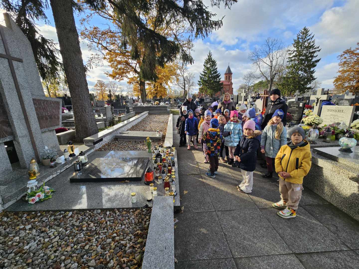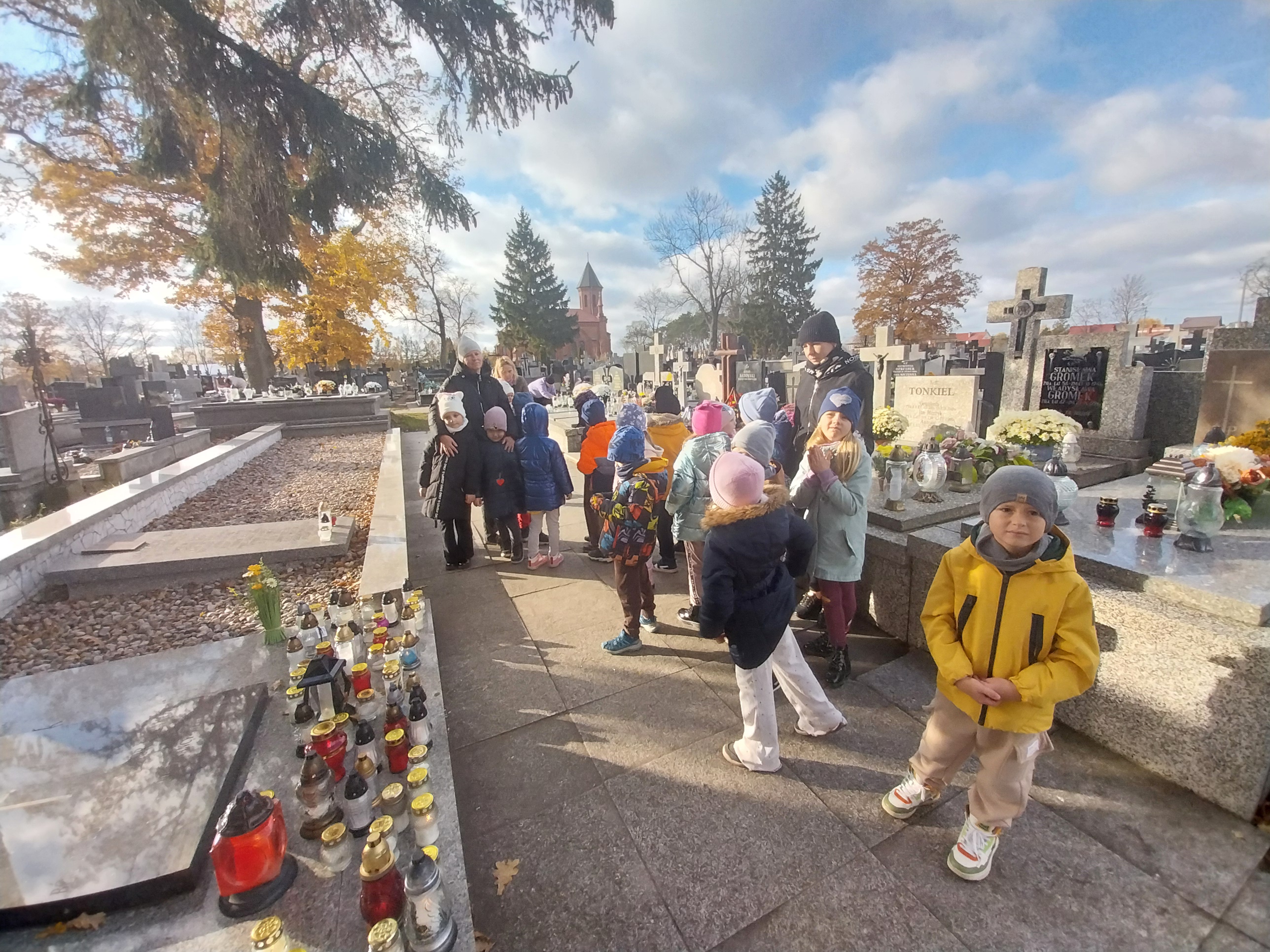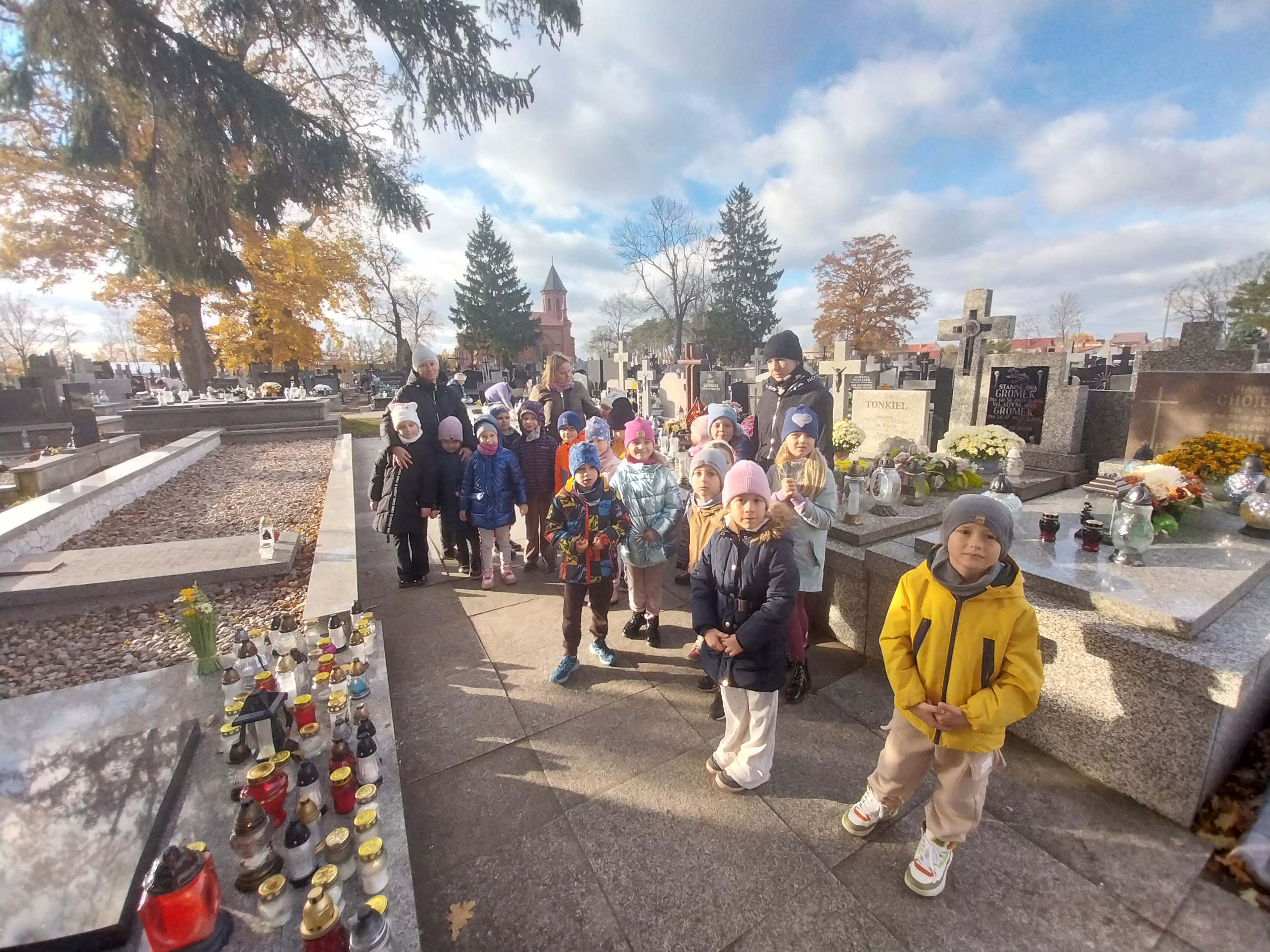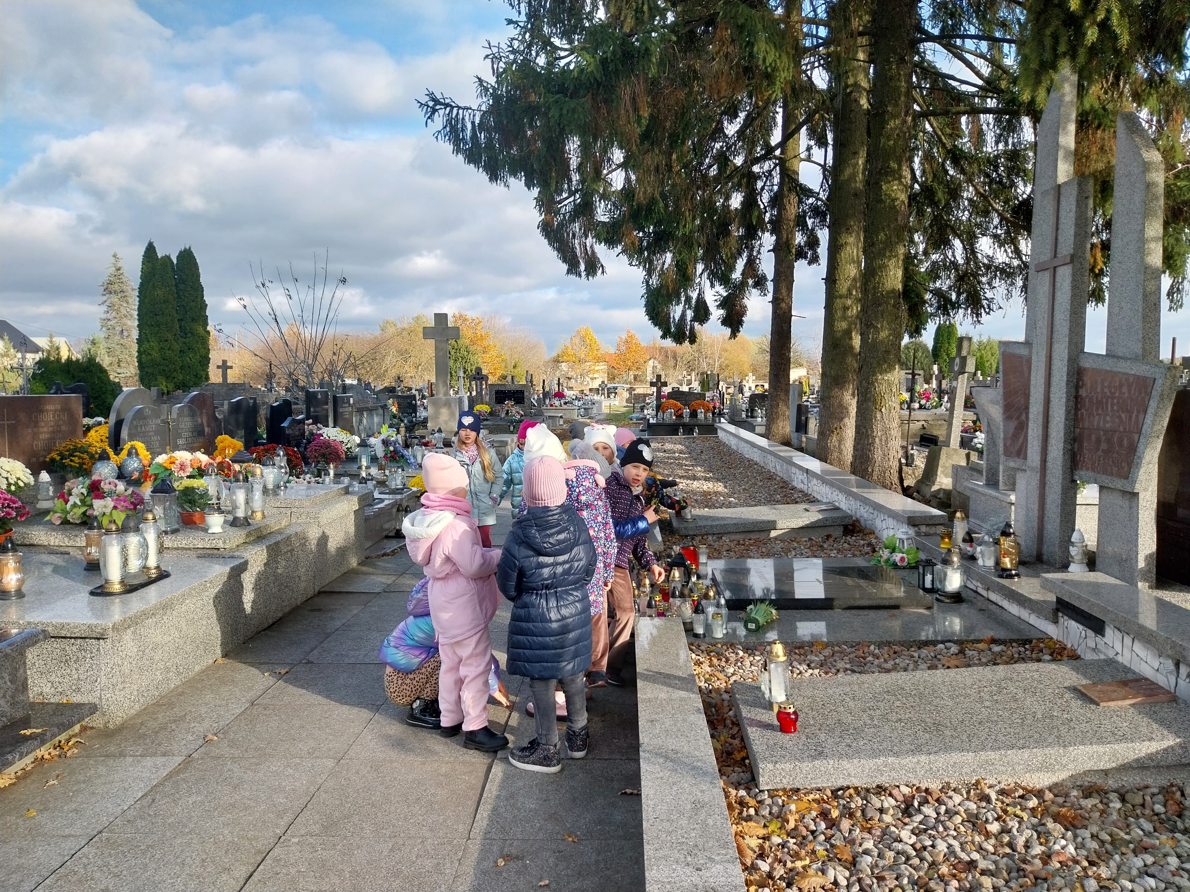 Wycieczka na cmentarz parafialny dnia 31 października to wyraz szacunku dla osób tam spoczywających. Termin wycieczki związany ze zbliżającymi się listopadowymi świętami 1i 2 listopada oraz 11 listopada. Dzieci obserwowały prace porządkowe na grobach. Odwiedziliśmy mogiłę Żołnierzy Polskich- Bohaterów Września 1939 r. i zapaliliśmy przyniesione przez dzieci znicze.