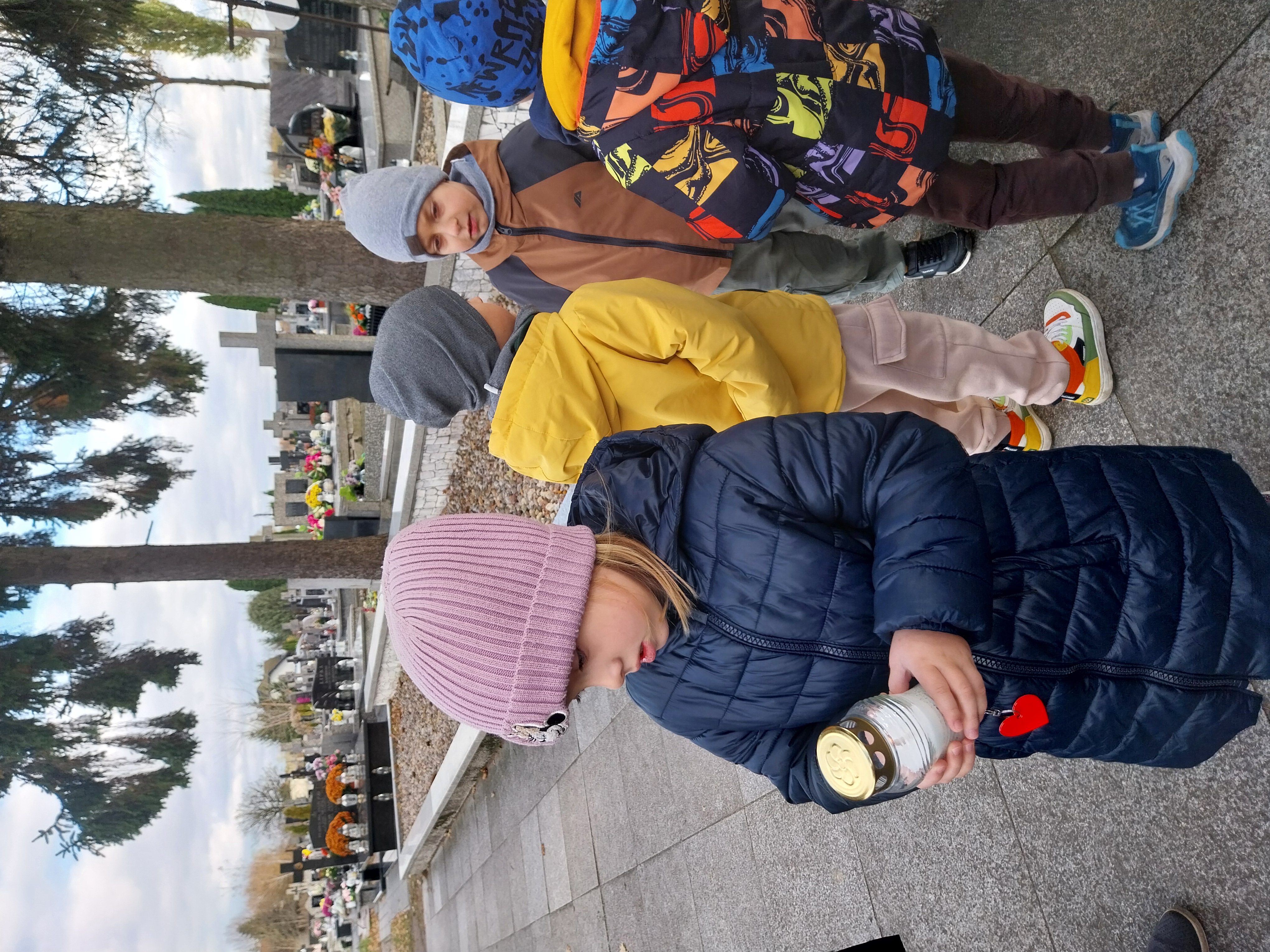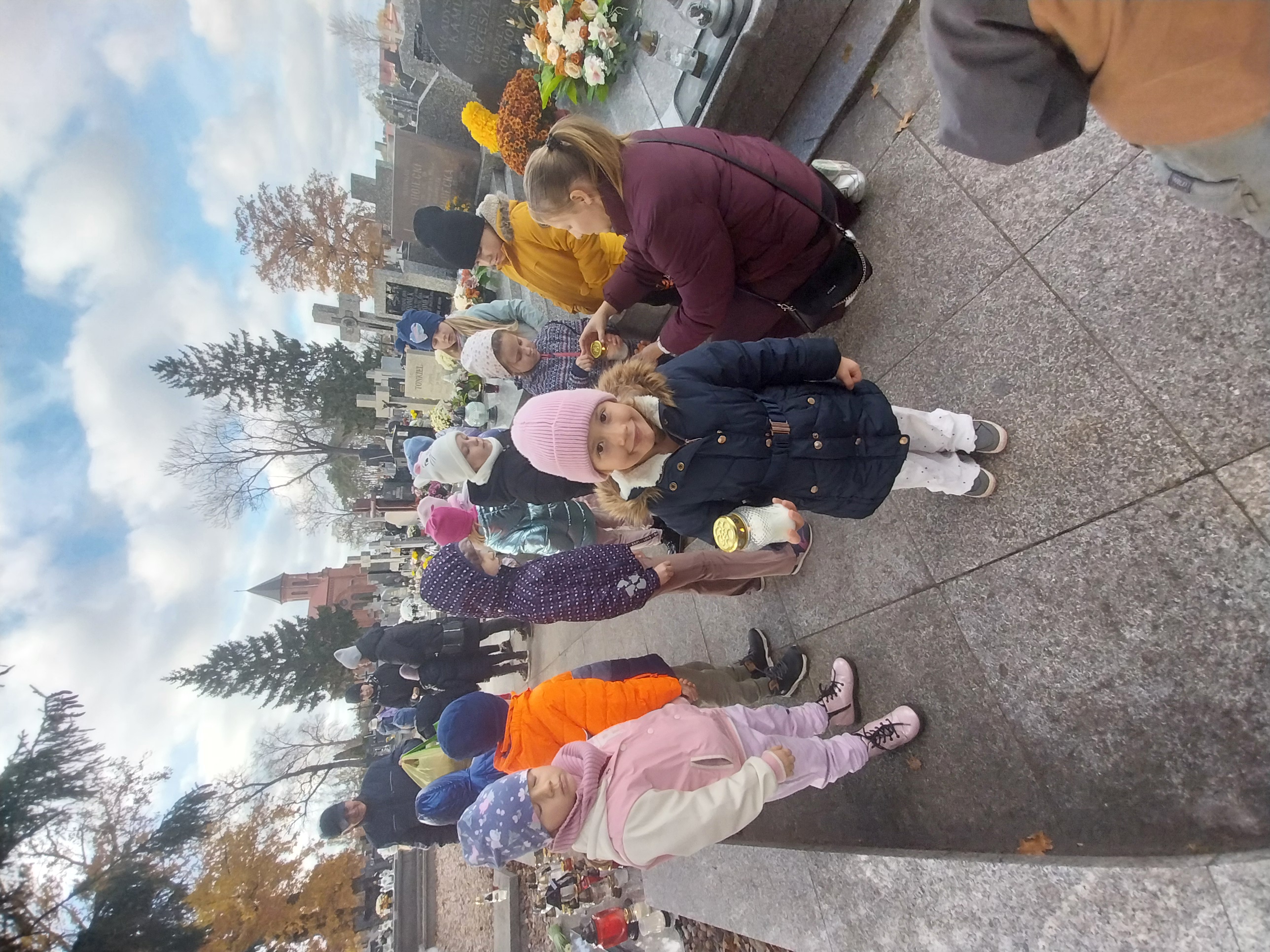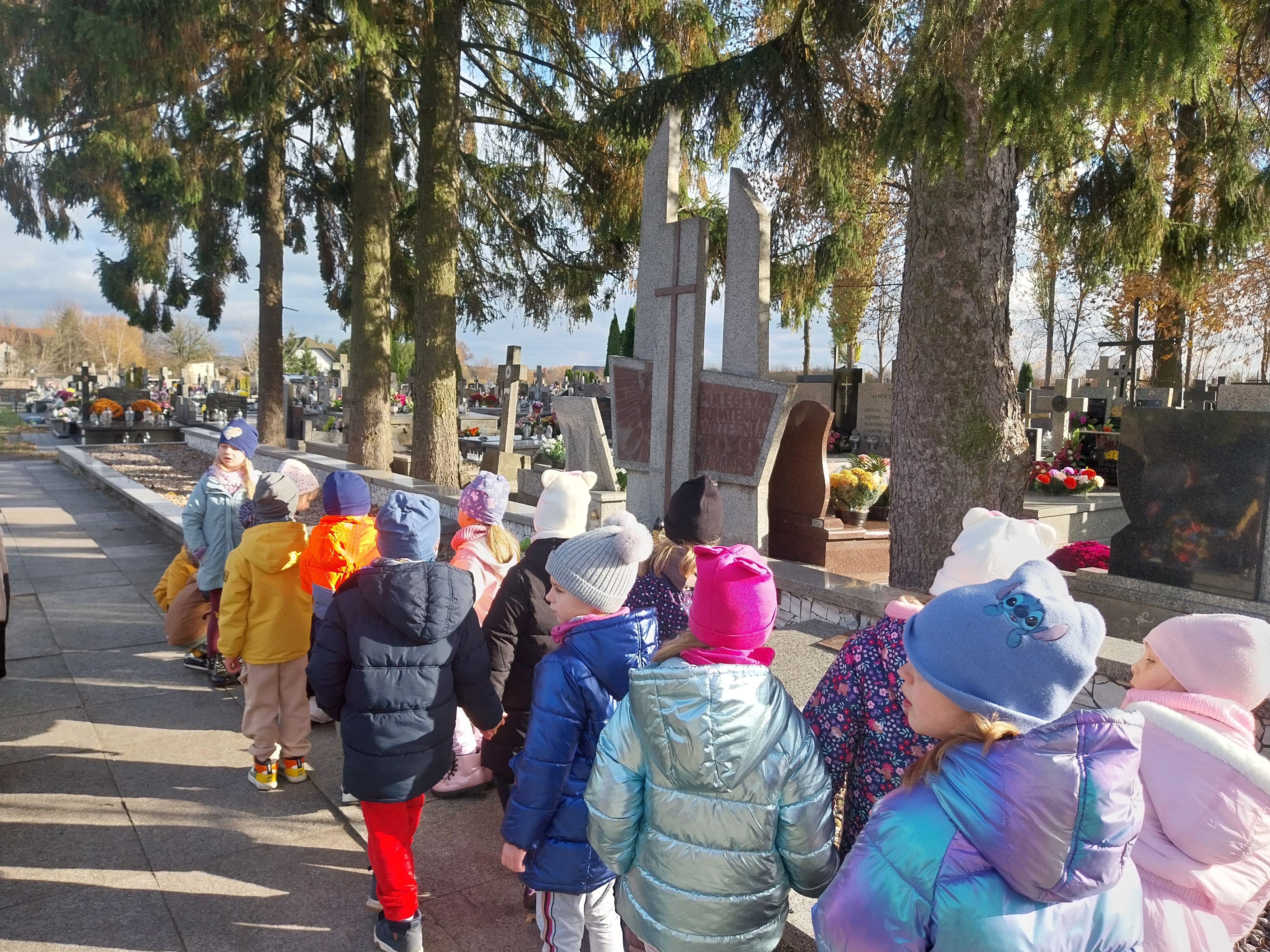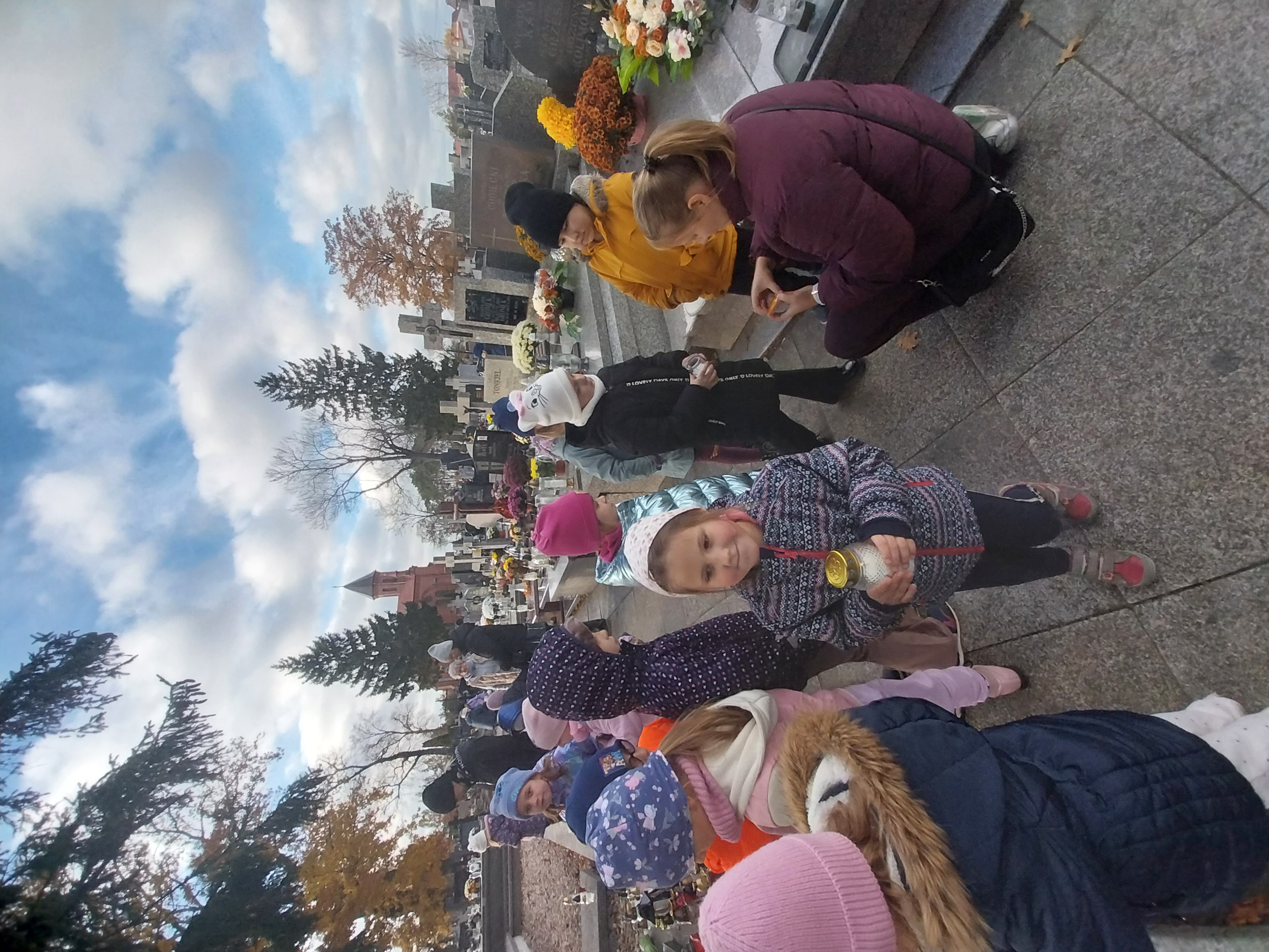 Wycieczka na cmentarz parafialny dnia 31 października to wyraz szacunku dla osób tam spoczywających. Termin wycieczki związany ze zbliżającymi się listopadowymi świętami 1i 2 listopada oraz 11 listopada. Dzieci obserwowały prace porządkowe na grobach. Odwiedziliśmy mogiłę Żołnierzy Polskich- Bohaterów Września 1939 r. i zapaliliśmy przyniesione przez dzieci znicze.