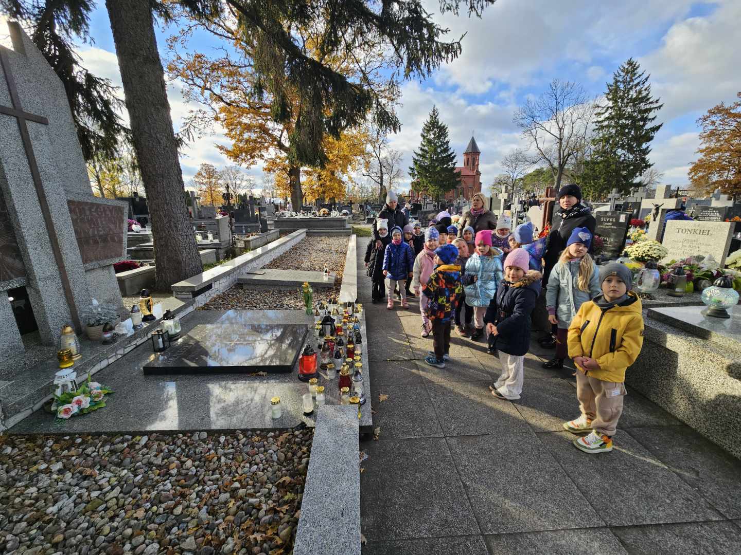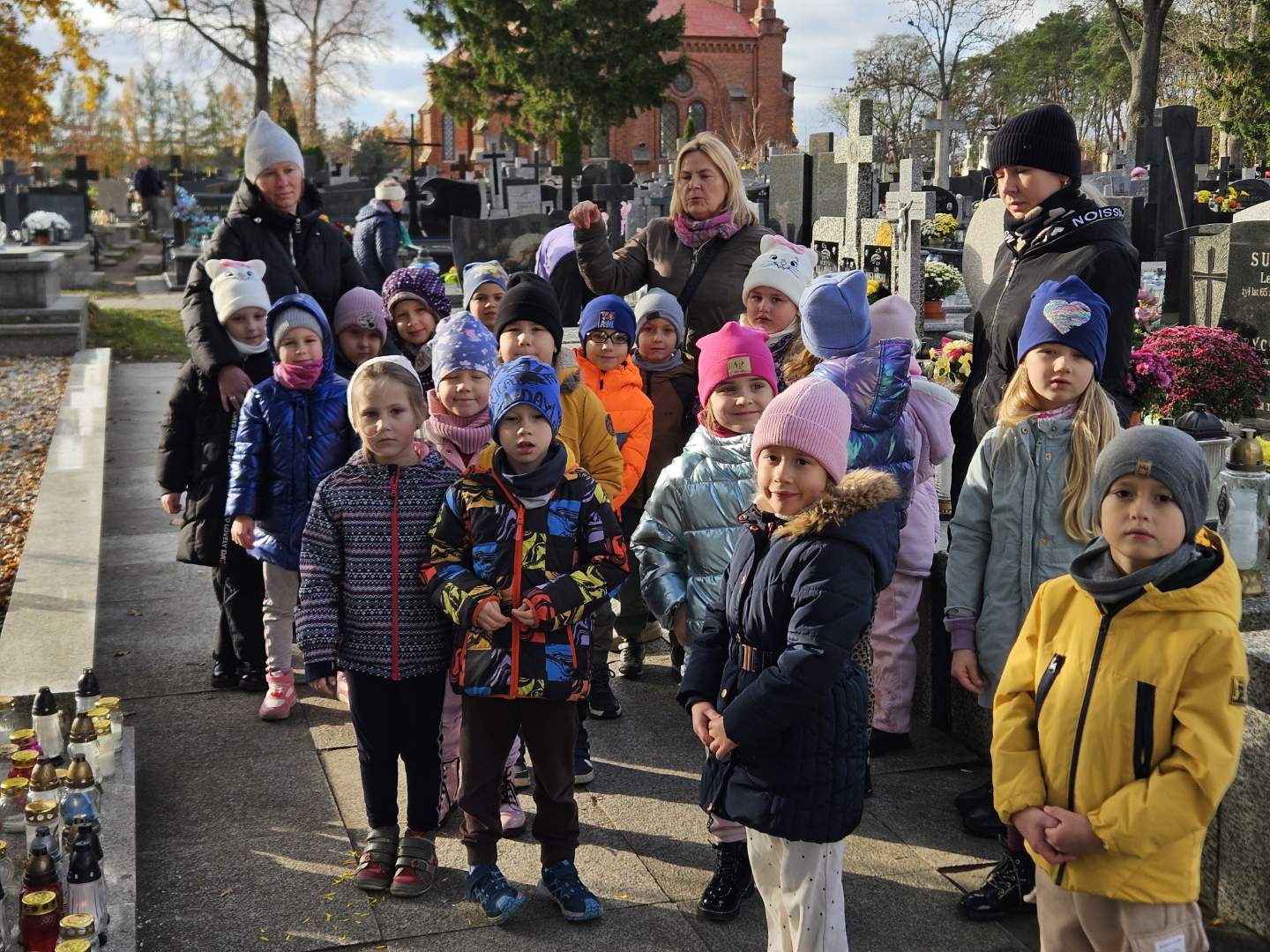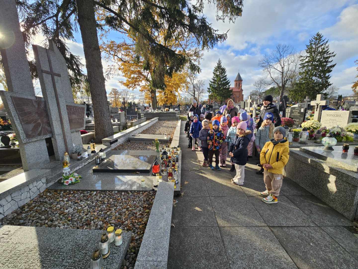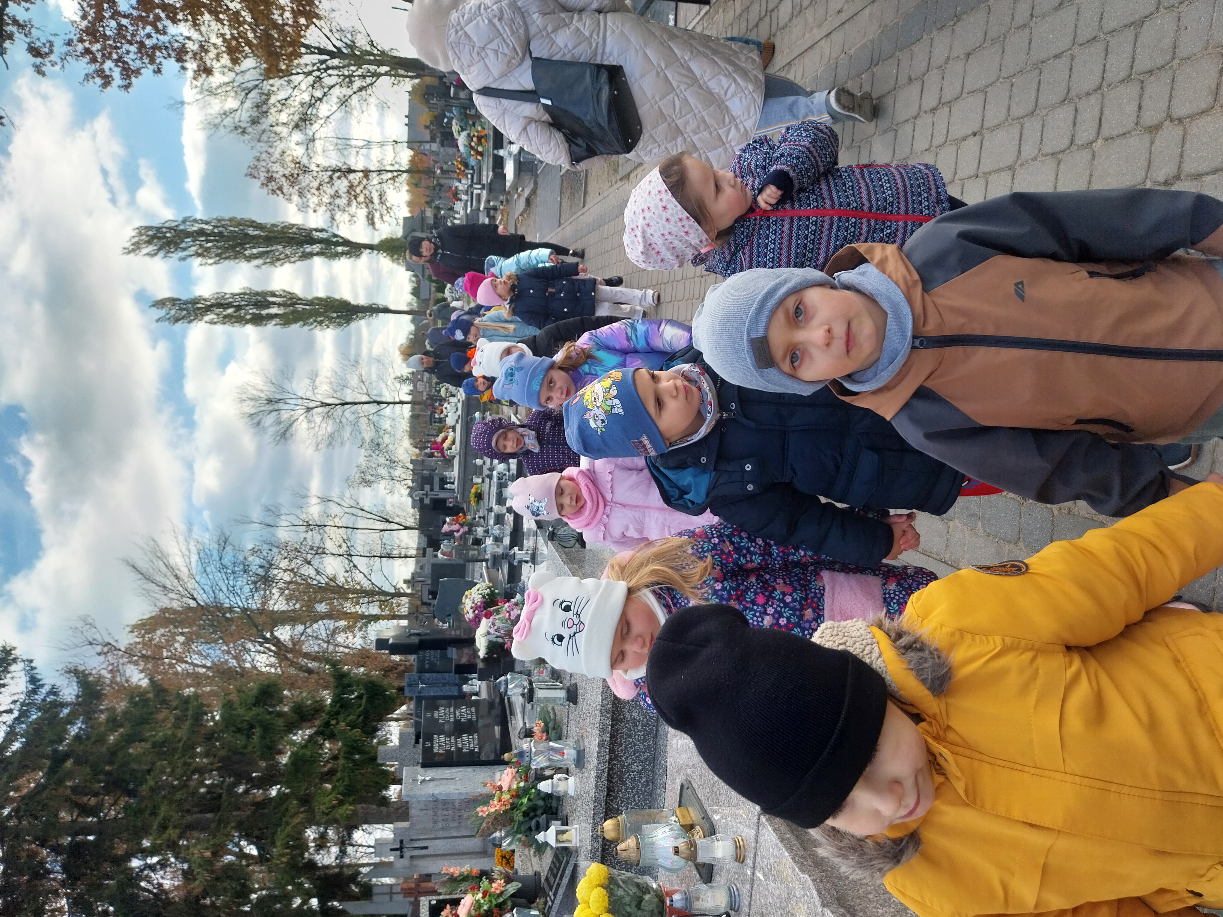Wycieczka na cmentarz parafialny dnia 31 października to wyraz szacunku dla osób tam spoczywających. Termin wycieczki związany ze zbliżającymi się listopadowymi świętami 1i 2 listopada oraz 11 listopada. Dzieci obserwowały prace porządkowe na grobach. Odwiedziliśmy mogiłę Żołnierzy Polskich- Bohaterów Września 1939 r. i zapaliliśmy przyniesione przez dzieci znicze.