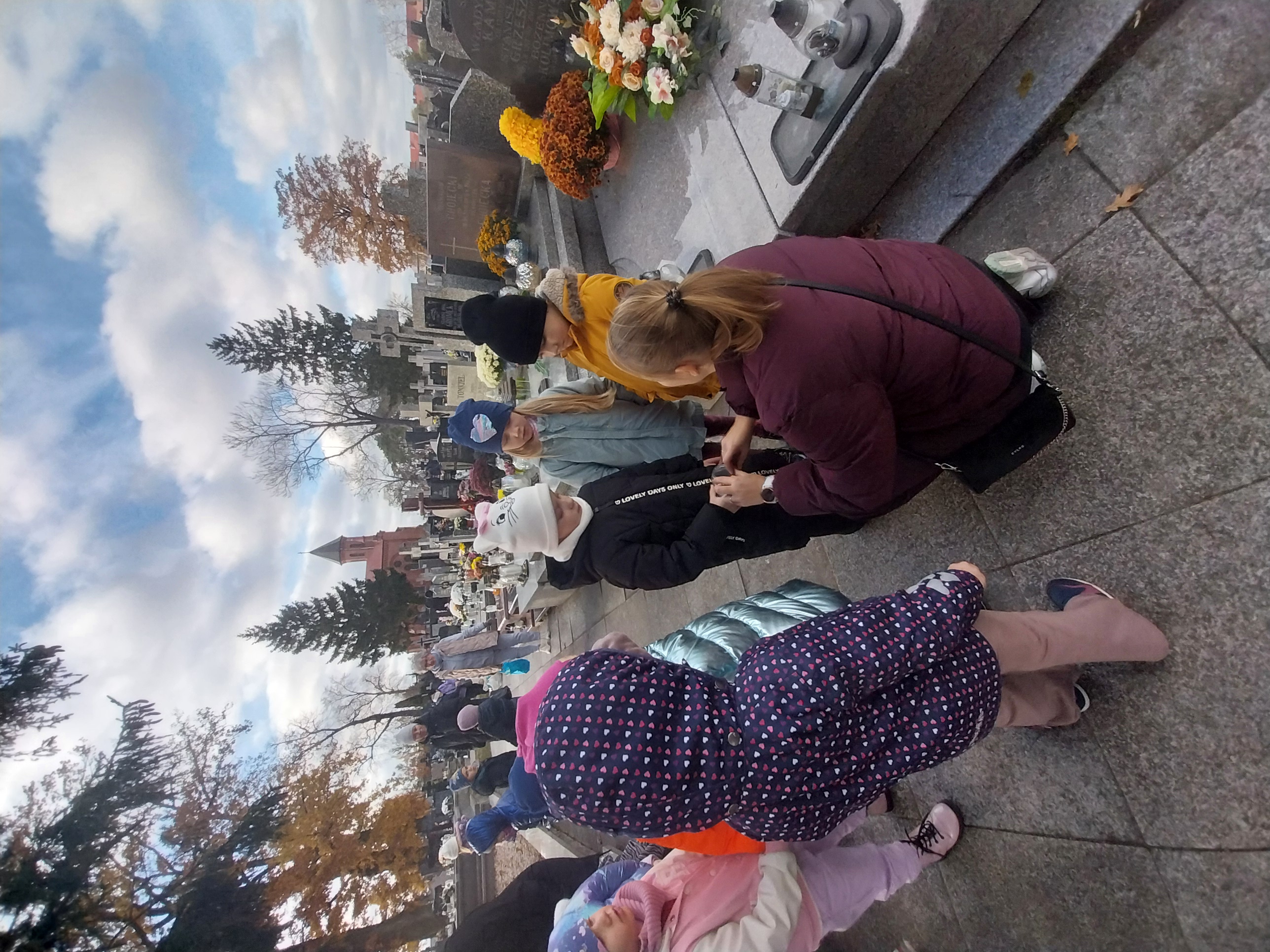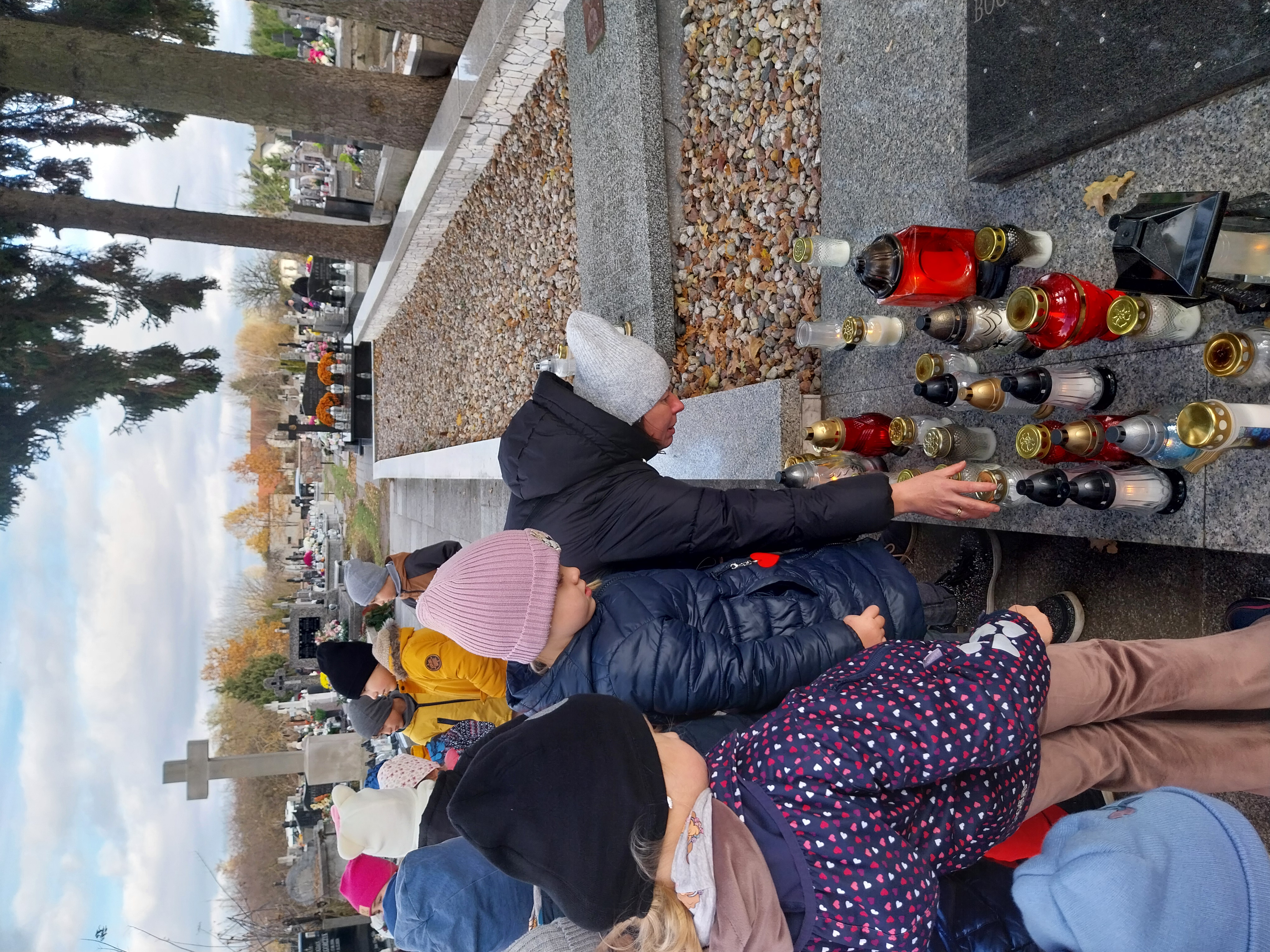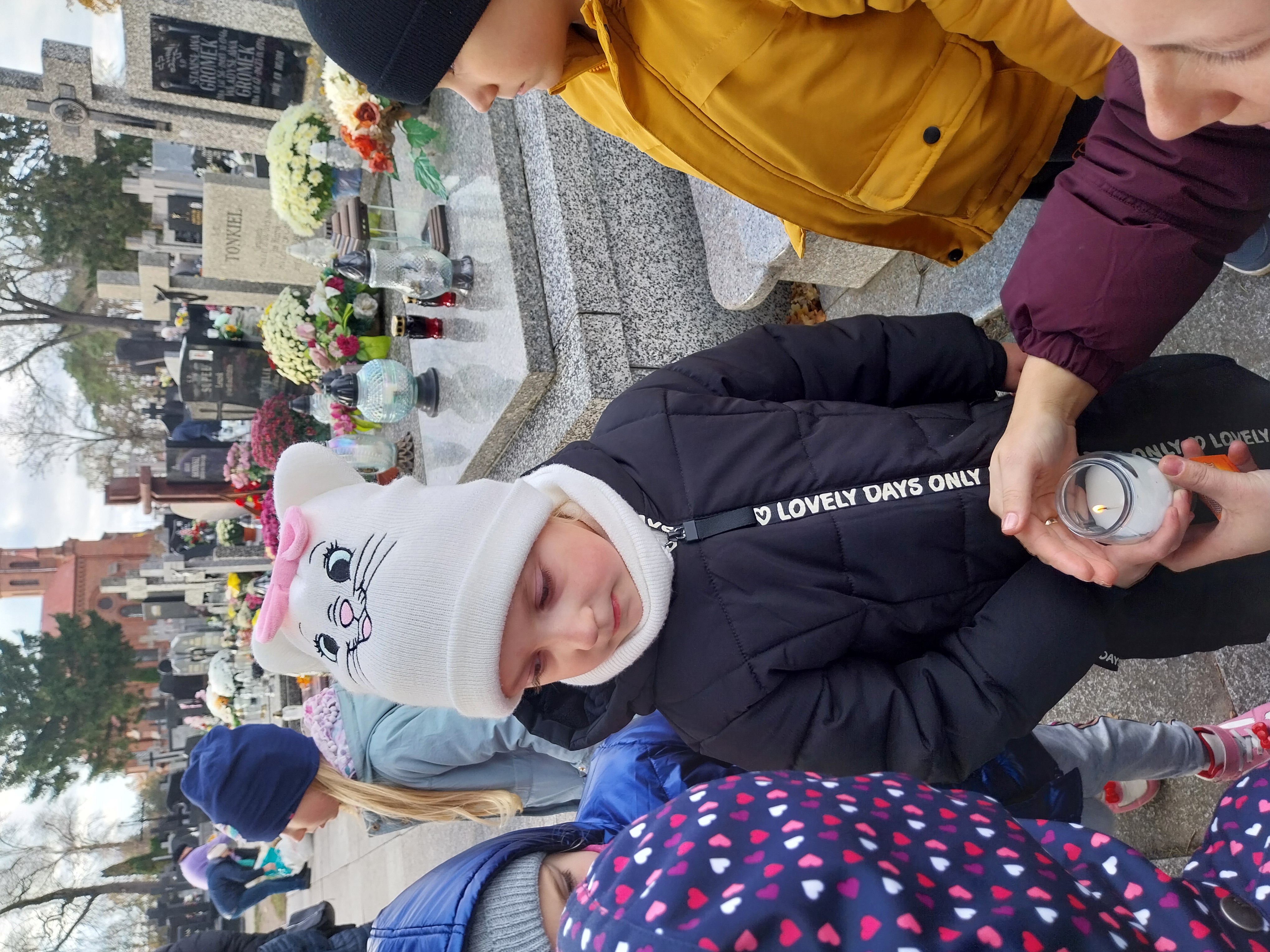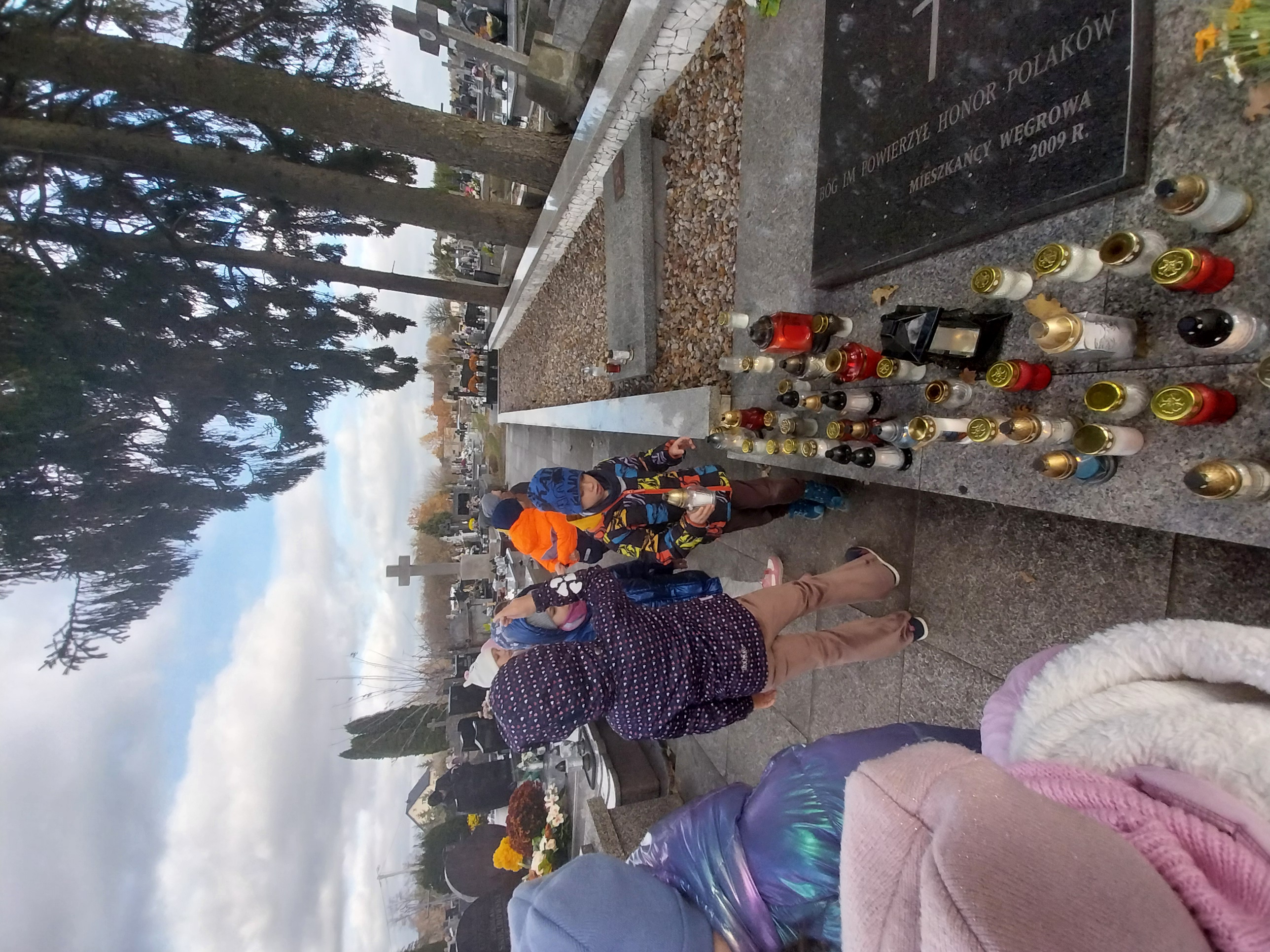 Wycieczka na cmentarz parafialny dnia 31 października to wyraz szacunku dla osób tam spoczywających. Termin wycieczki związany ze zbliżającymi się listopadowymi świętami 1i 2 listopada oraz 11 listopada. Dzieci obserwowały prace porządkowe na grobach. Odwiedziliśmy mogiłę Żołnierzy Polskich- Bohaterów Września 1939 r. i zapaliliśmy przyniesione przez dzieci znicze.