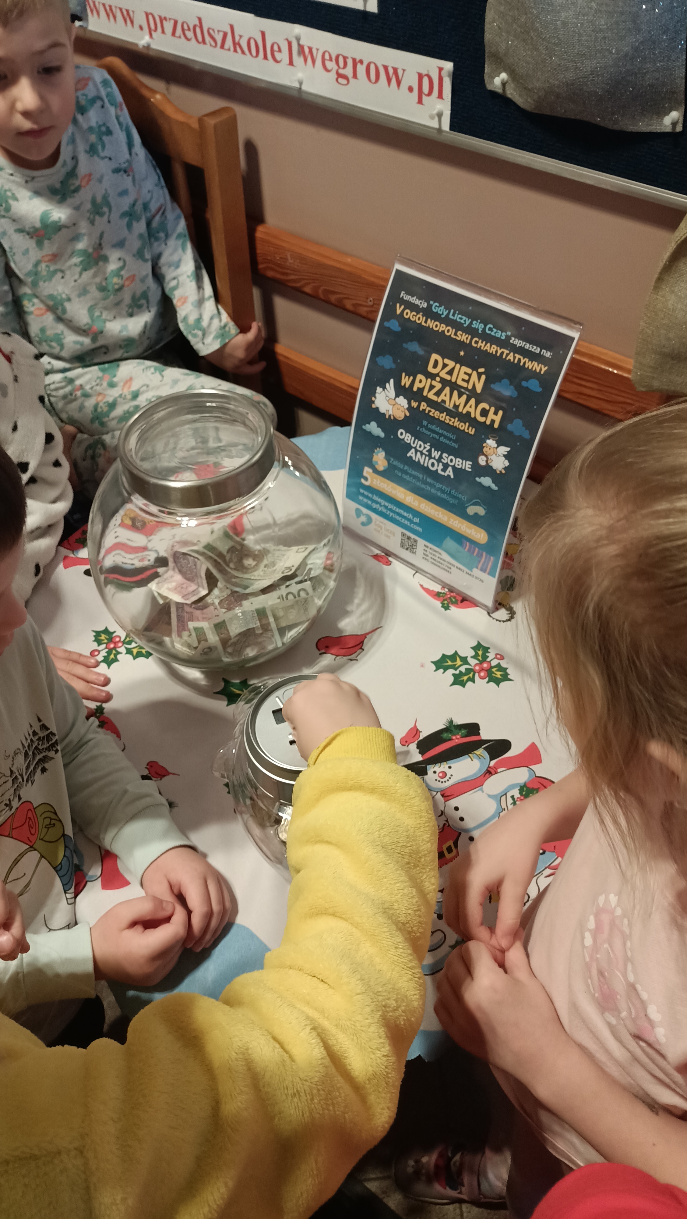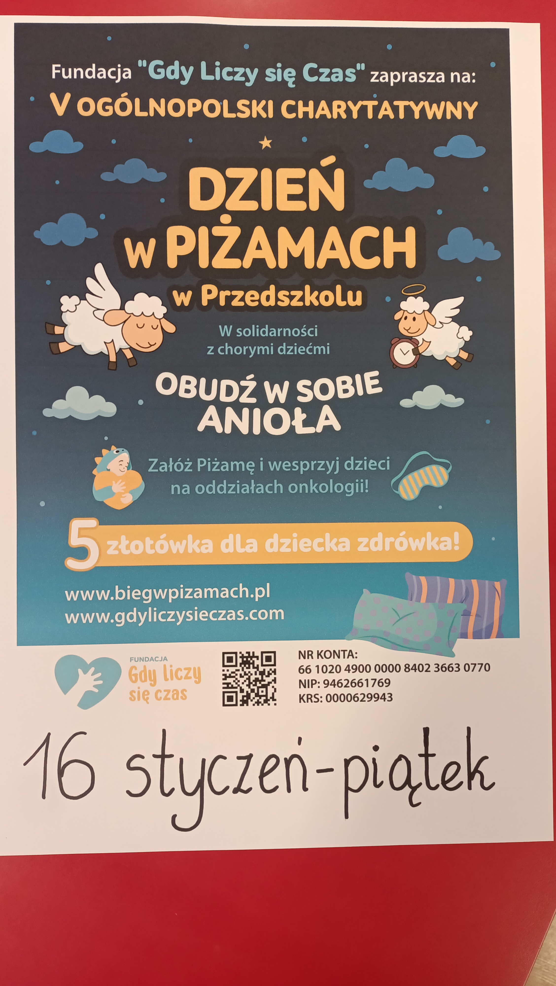 16.01.2026 r. (piątek) Misie wzięły udział w Charytatywnym Dniu w Piżamach. Tego dnia, zakładając piżamy, okazaliśmy solidarność z dziećmi przebywającymi na oddziałach onkologicznych. Towarzyszyło nam dużo radości i wspólnej zabawy, a jednocześnie wsparliśmy finansowo fundację „Gdy liczy się czas”.