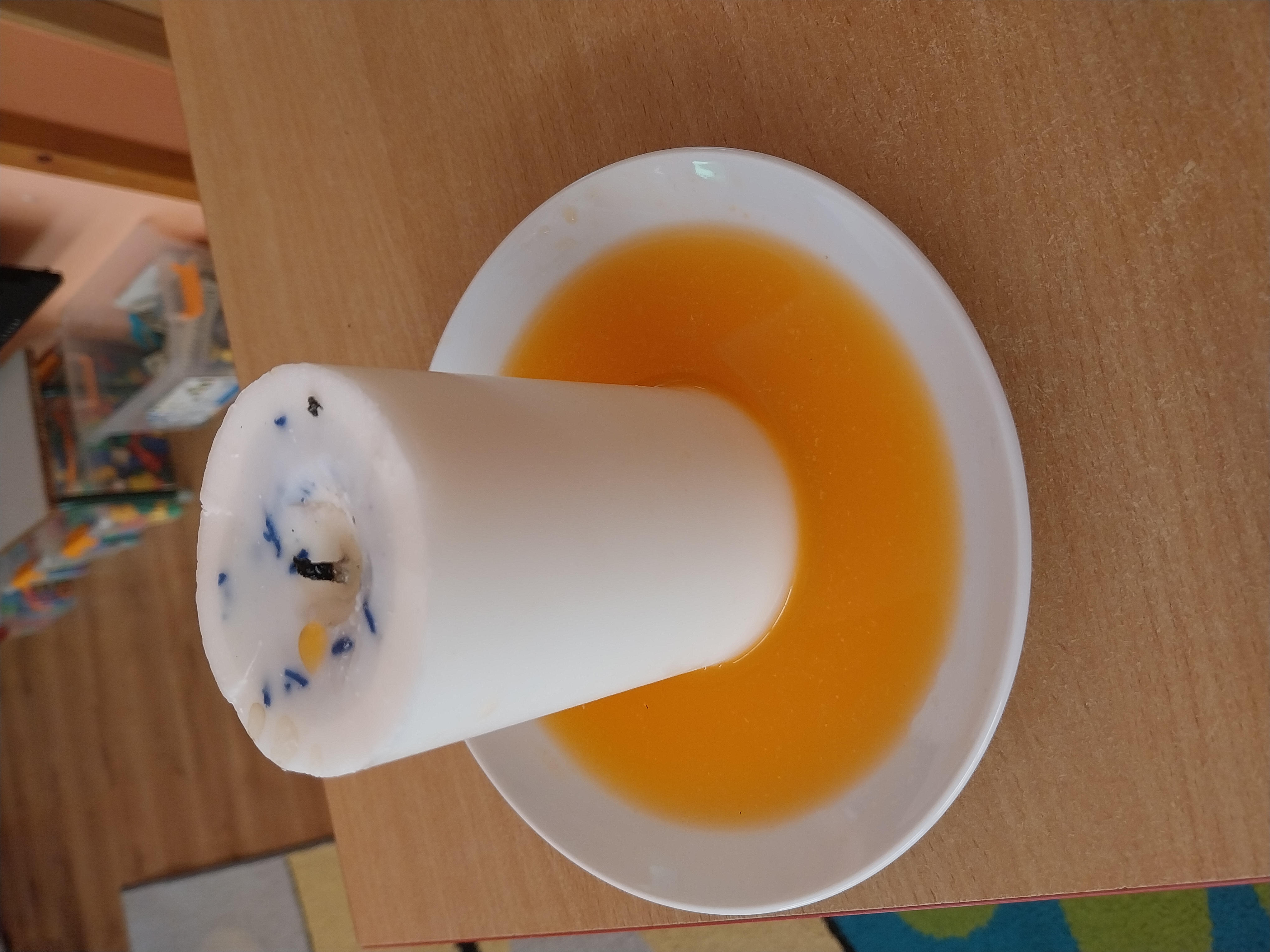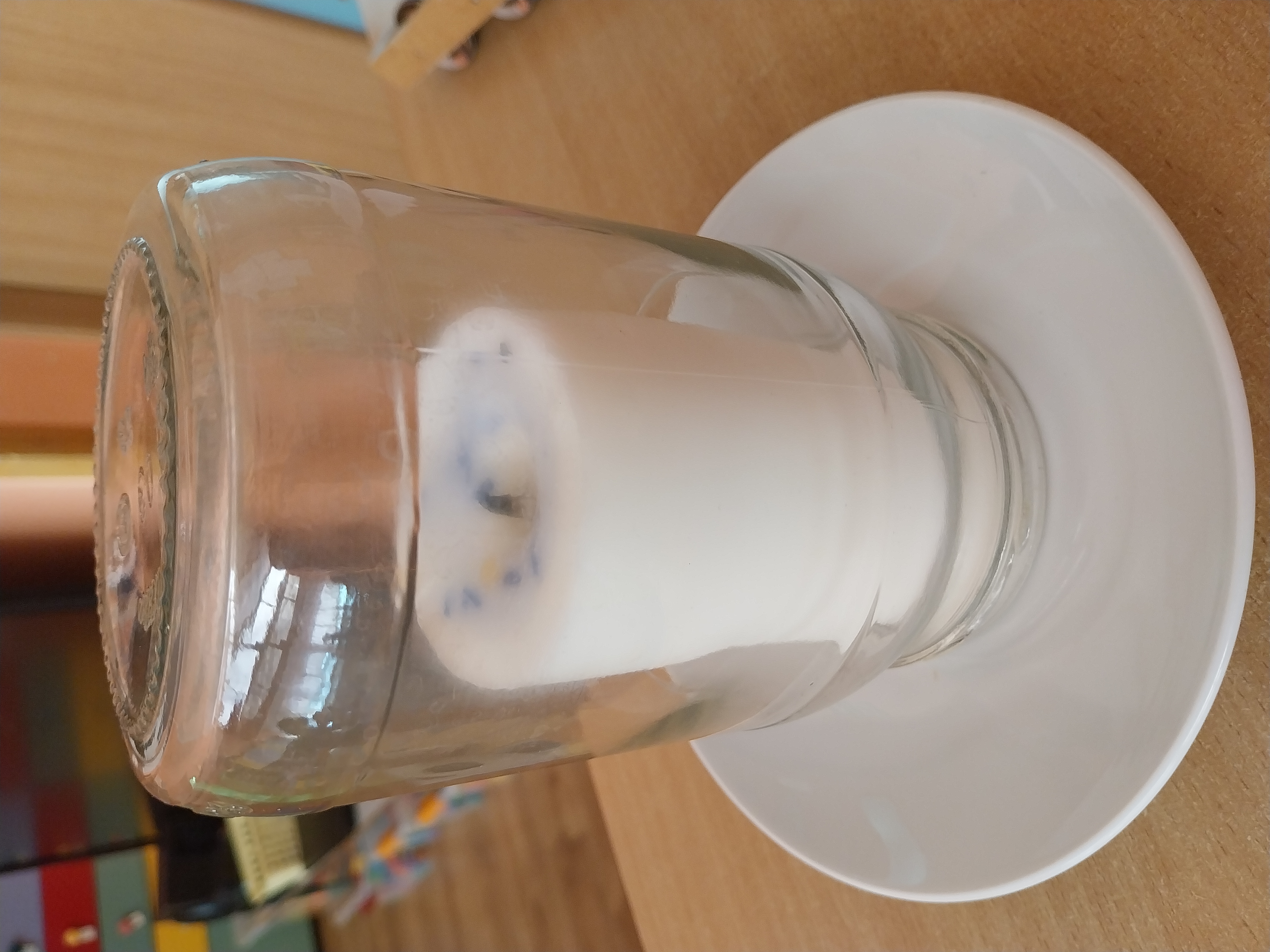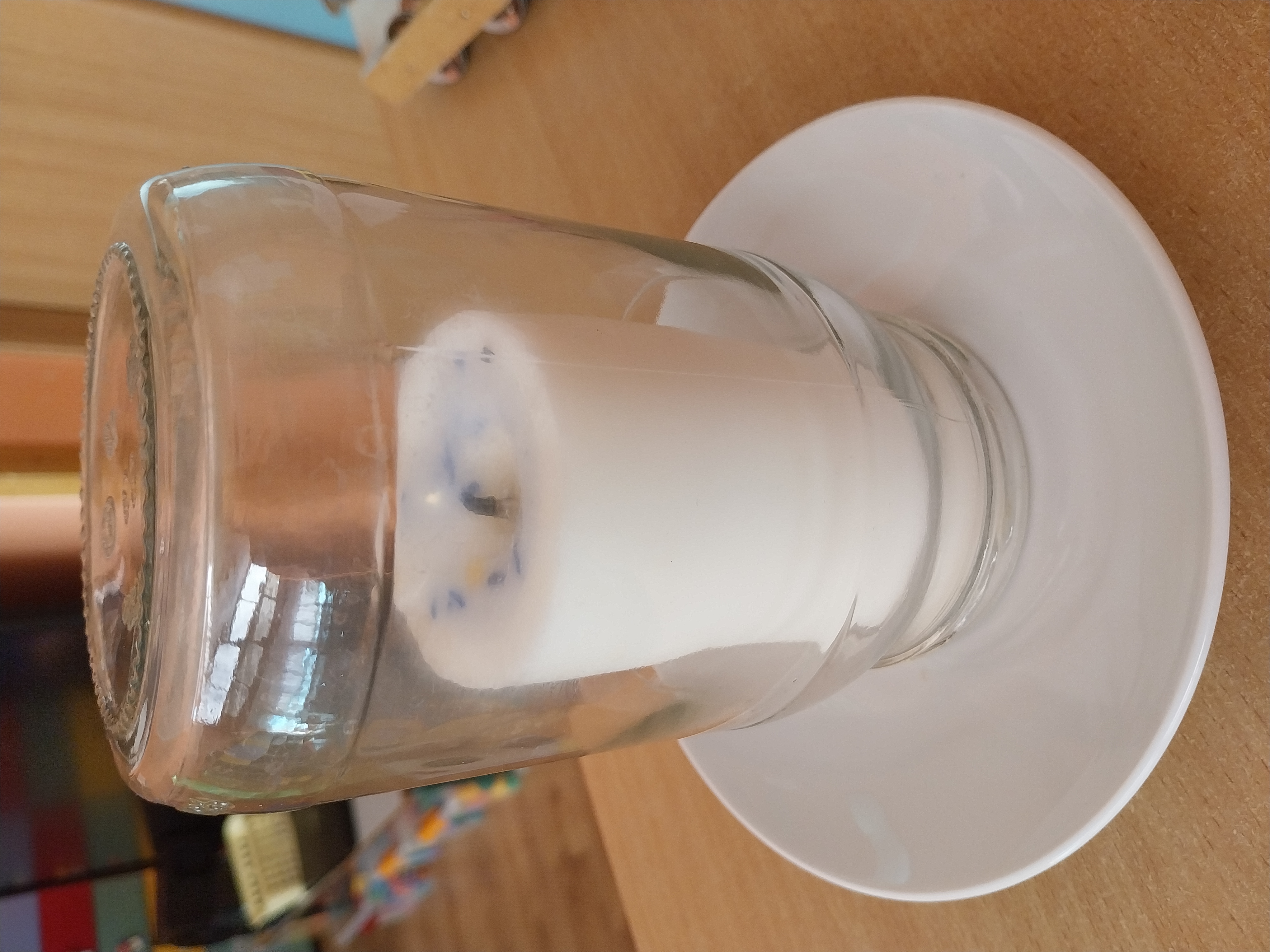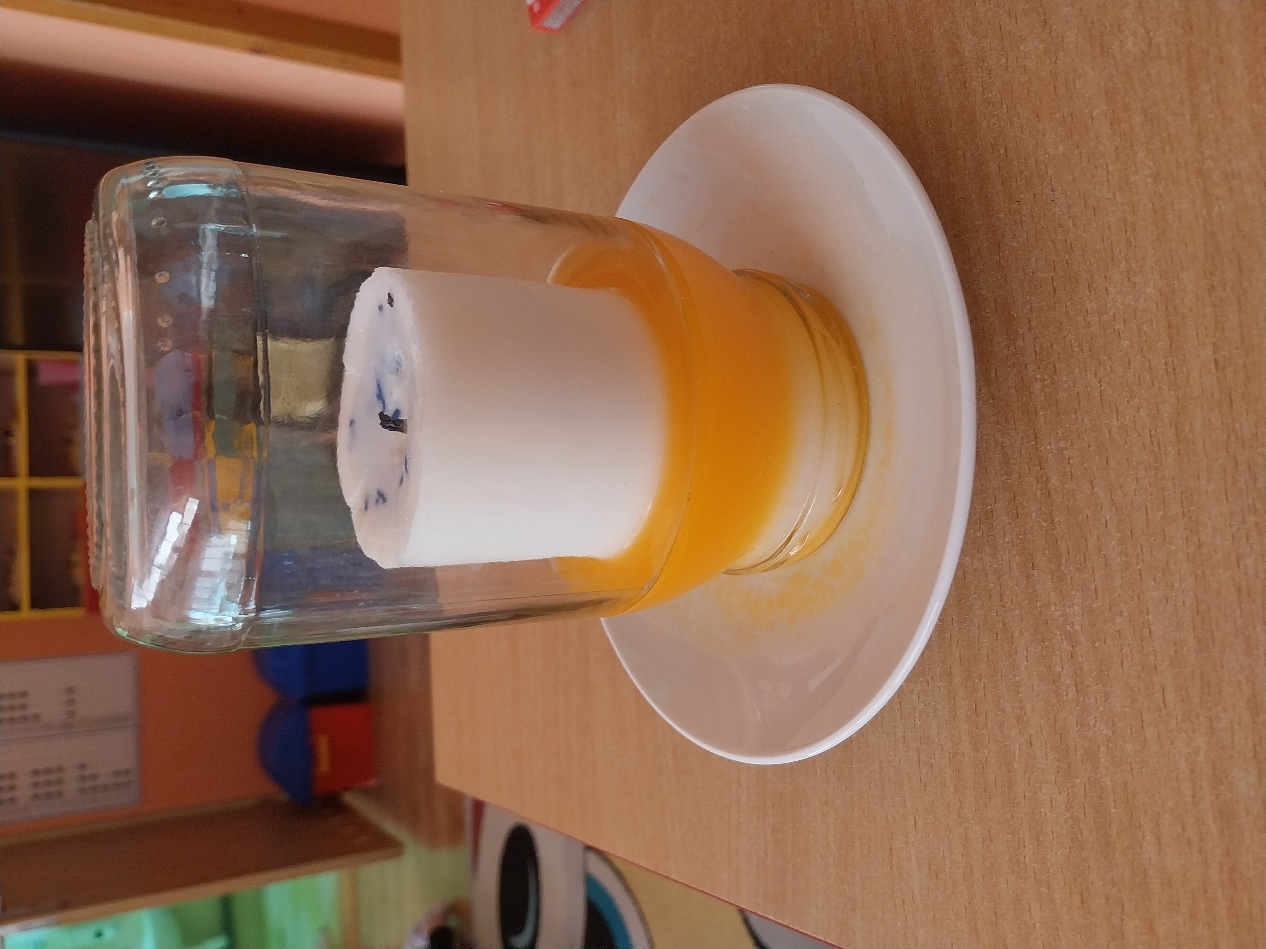 2. Doświadczenie z gaszeniem ognia przez zmniejszenie dopływu tlenu ( świeczka zgaśnie, woda podejdzie do słoika w miejsce tlenu i ją podniesie).