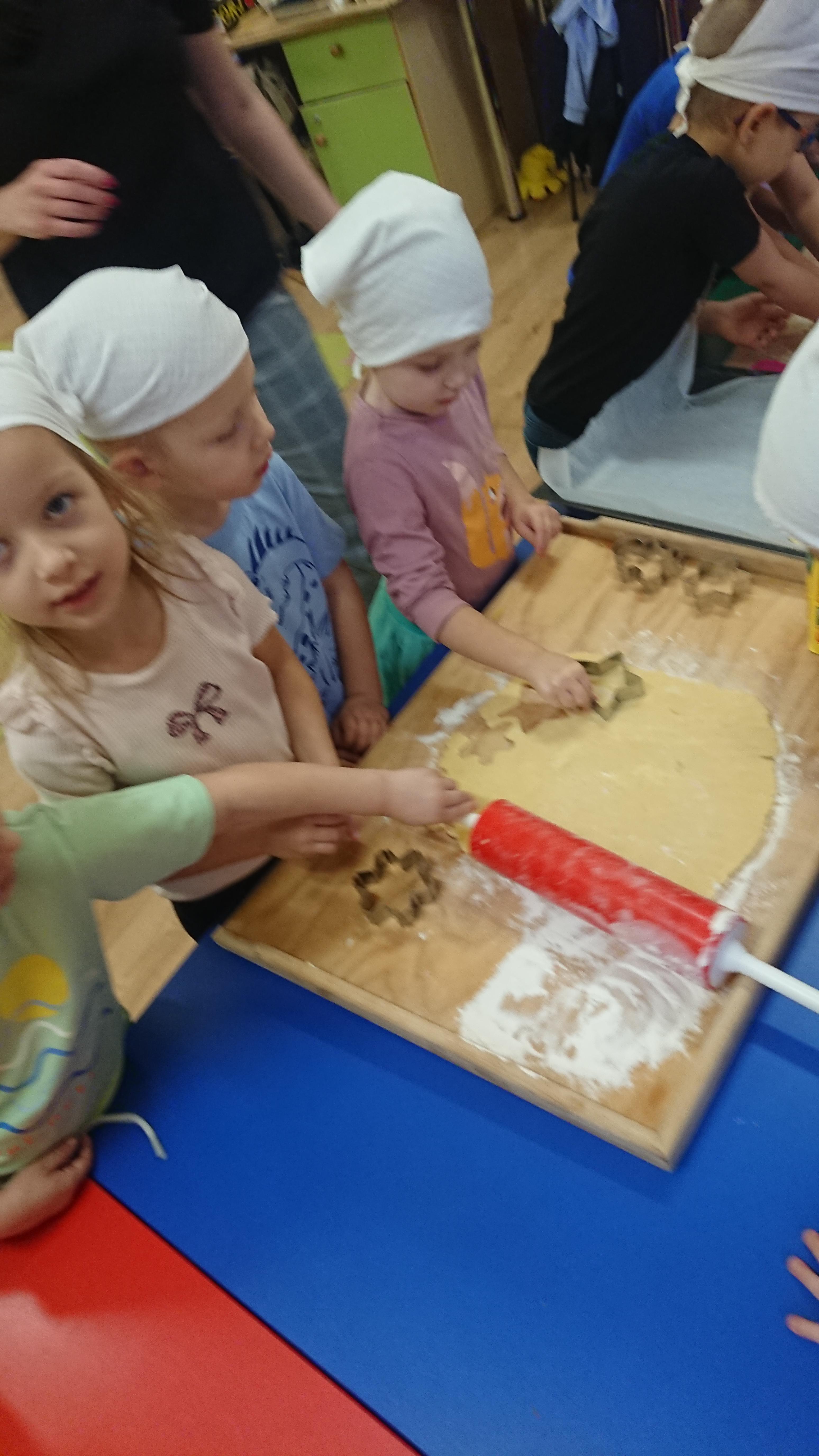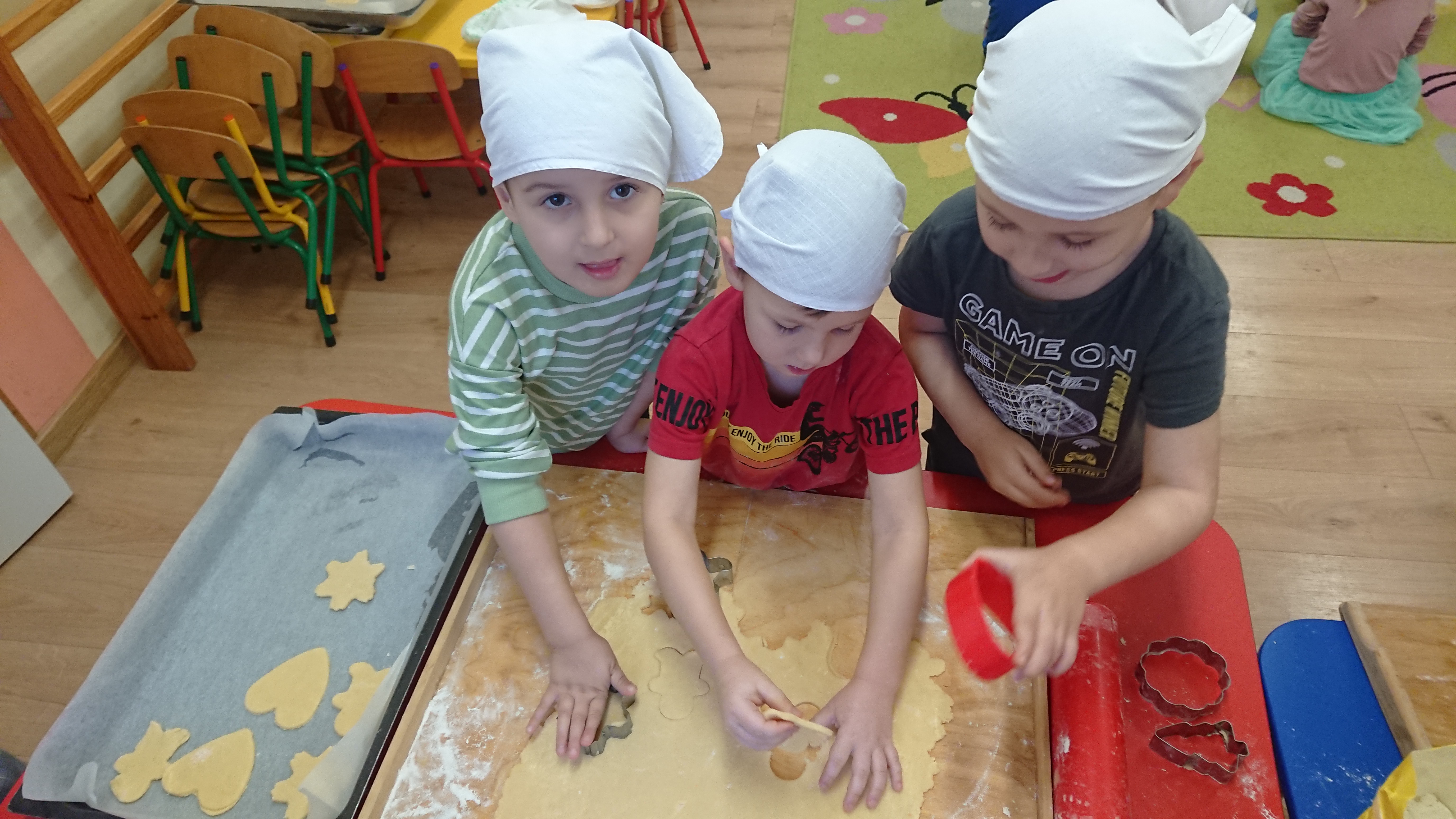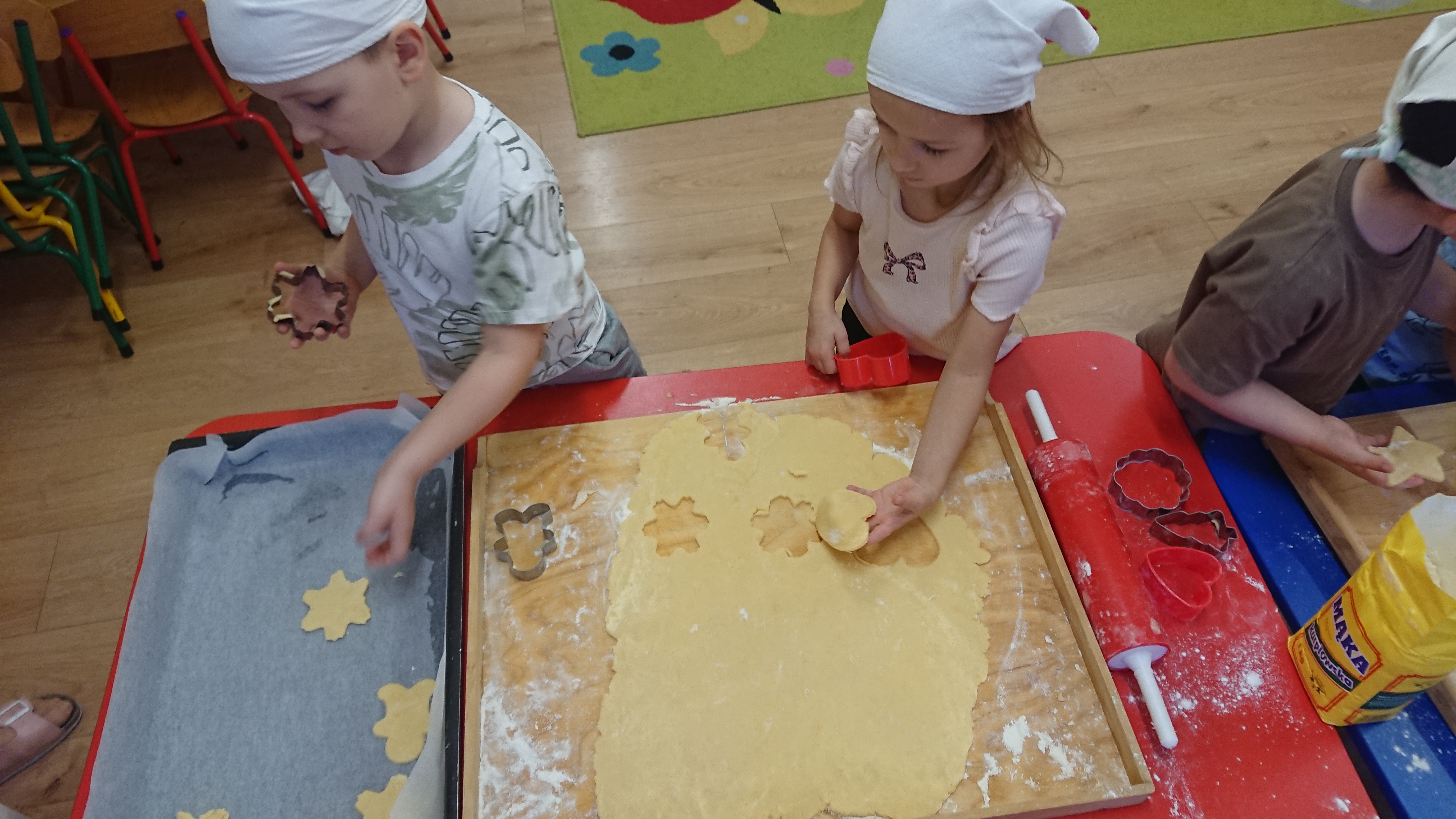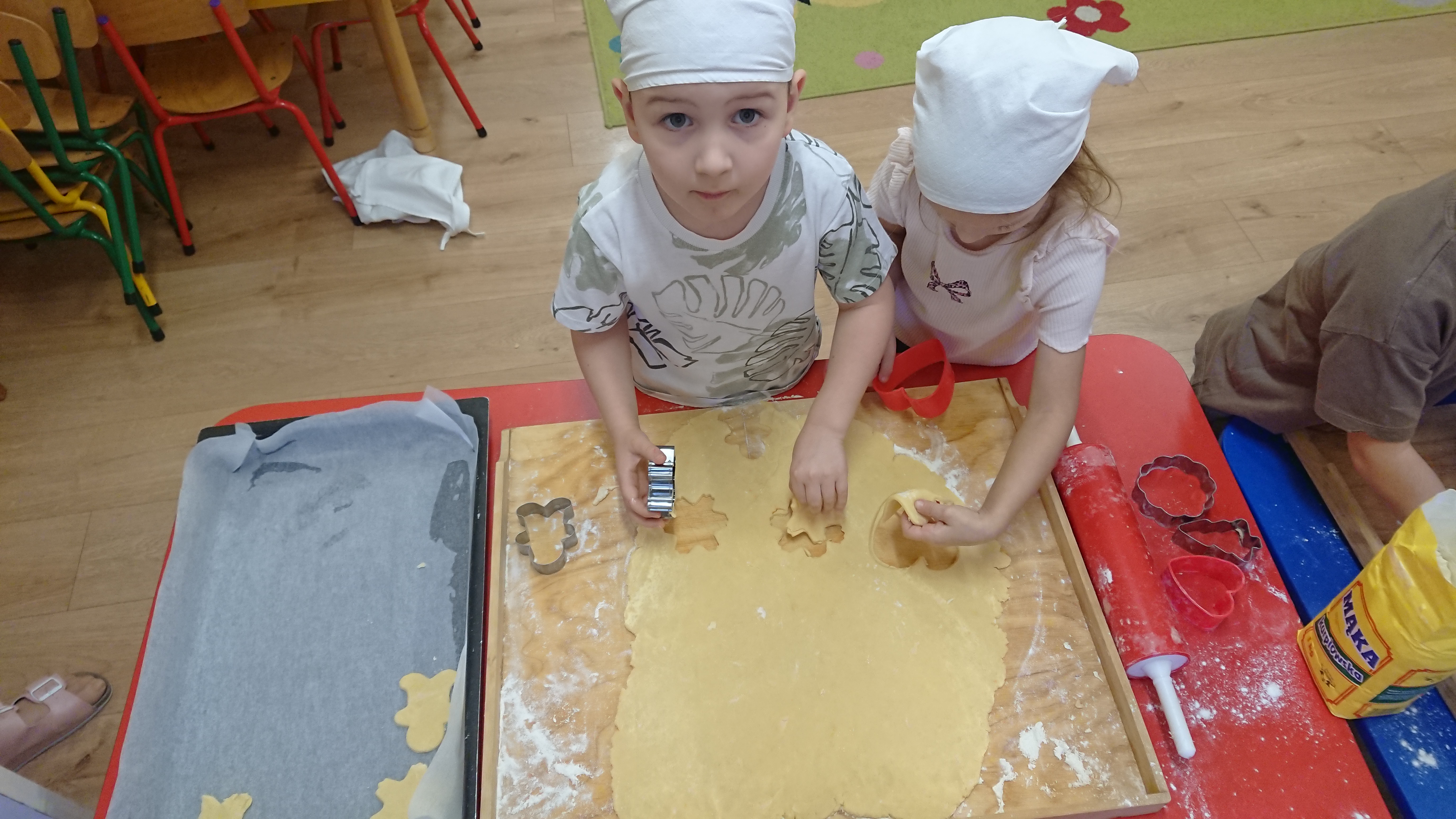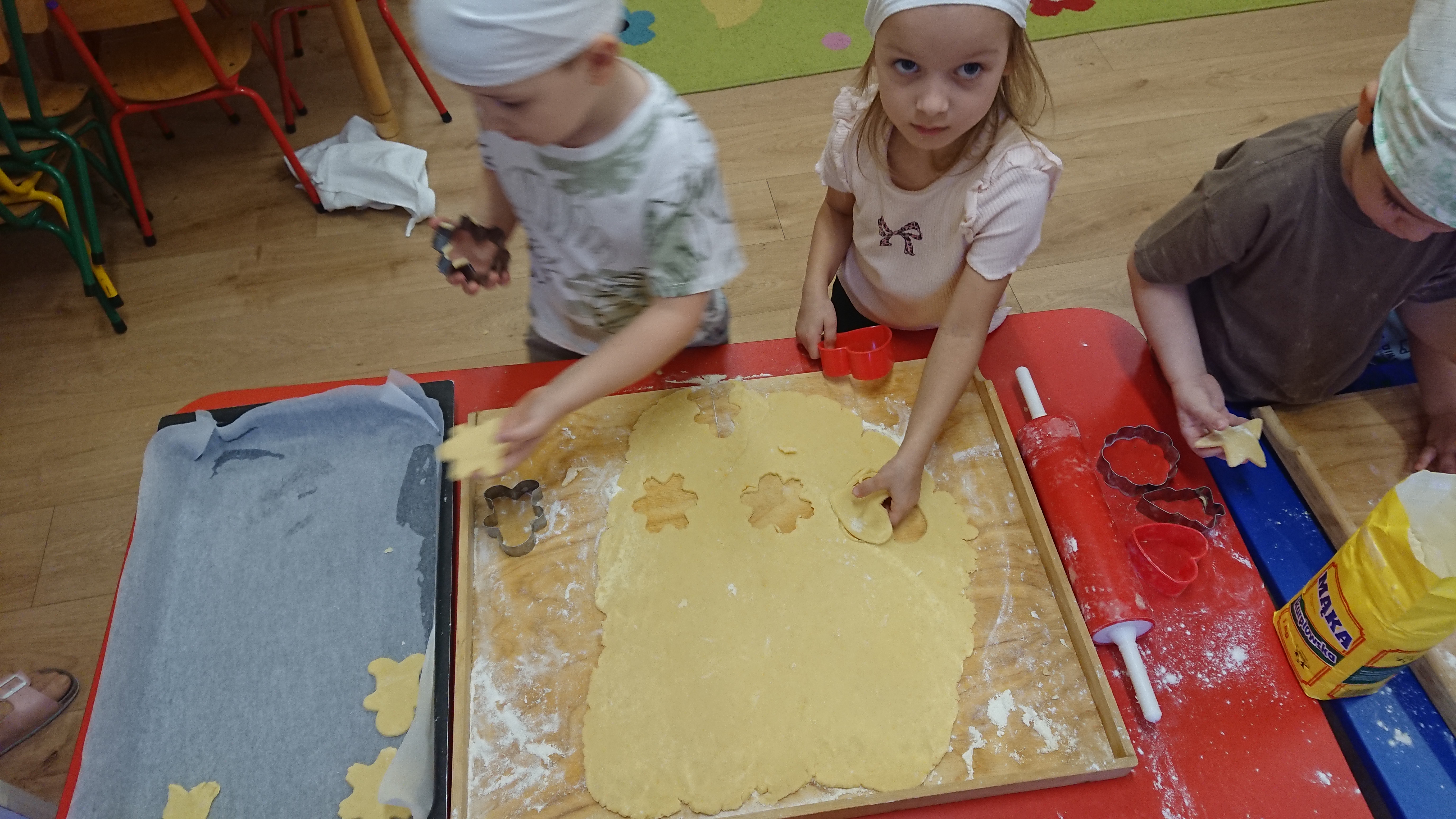 Prace w naszej Elfowej cukierni podzieliliśmy na kilka zespołów czteroosobowych, gdyż każde dziecko chciało brać czynny udział w przygotowaniach. I wspólnymi siłami udało nam się wykroić ponad 150 ciasteczek.