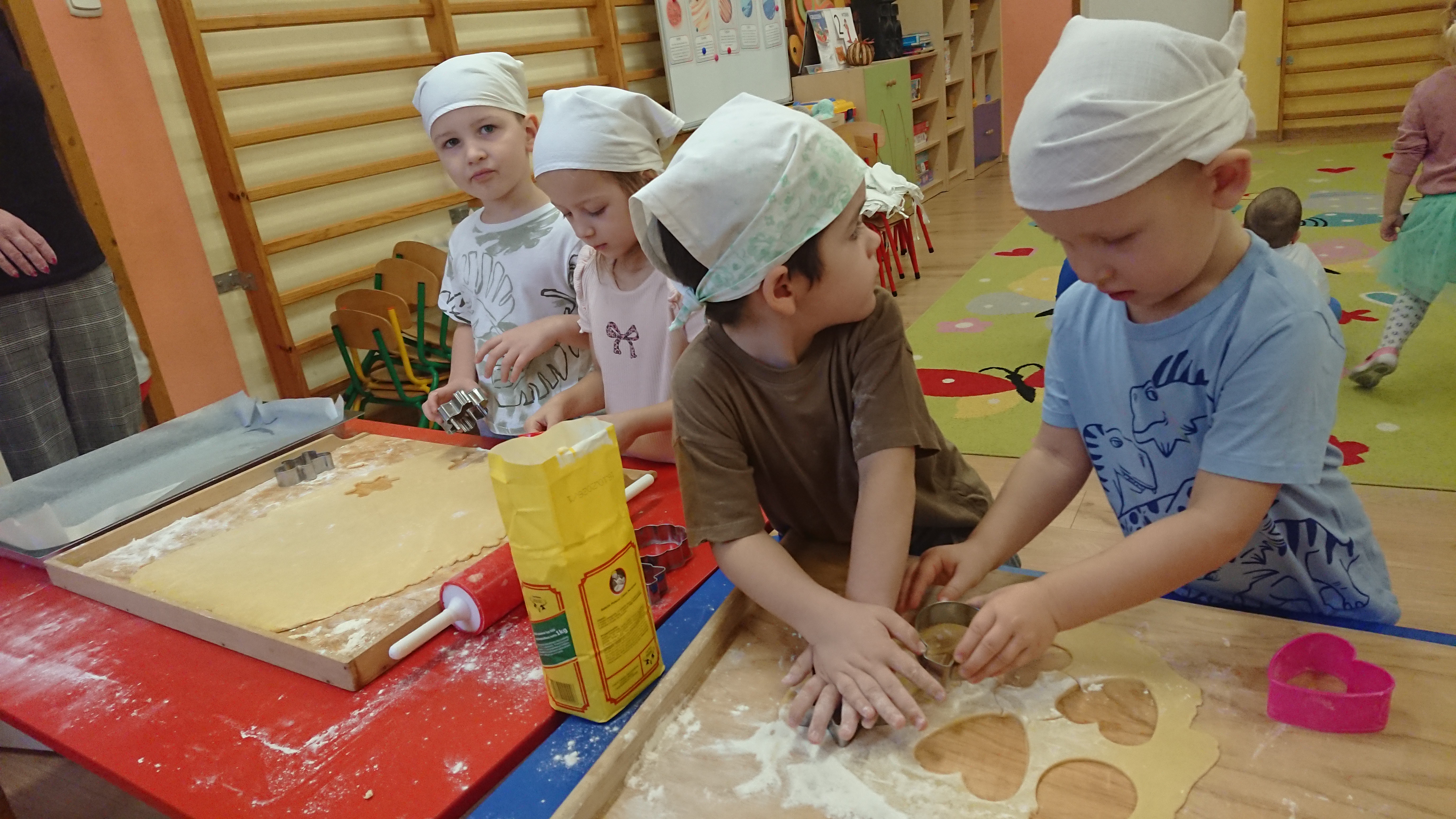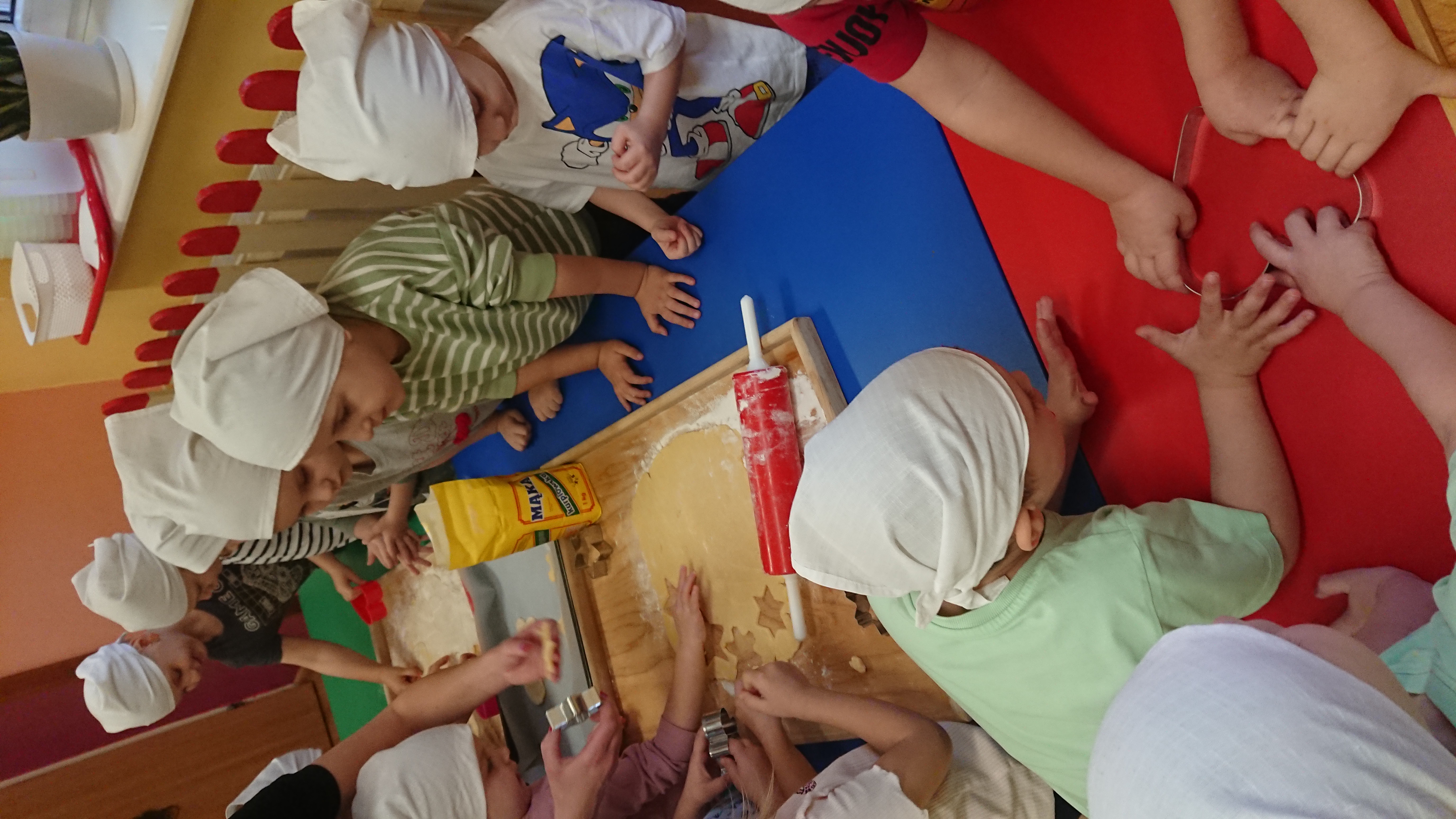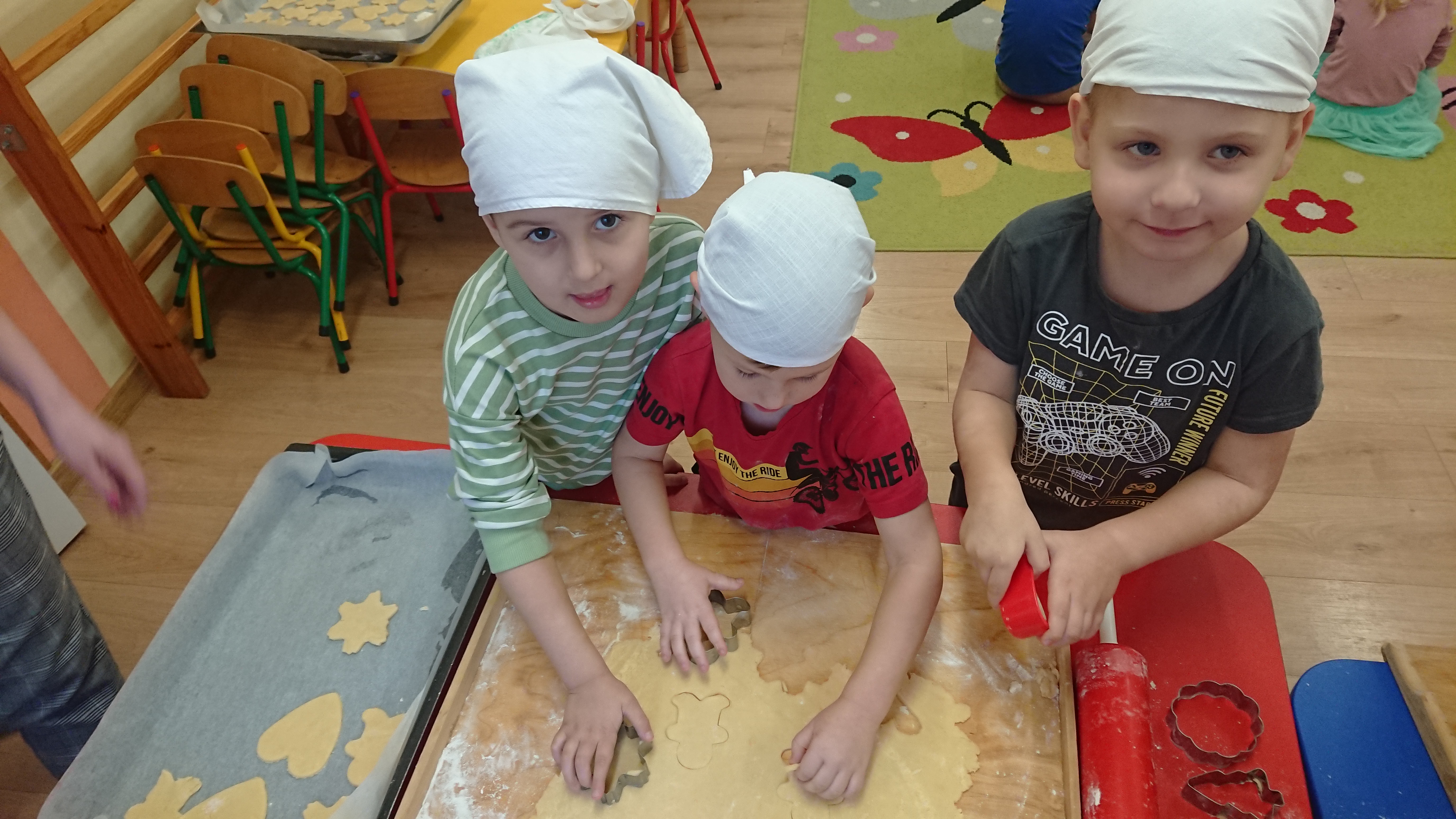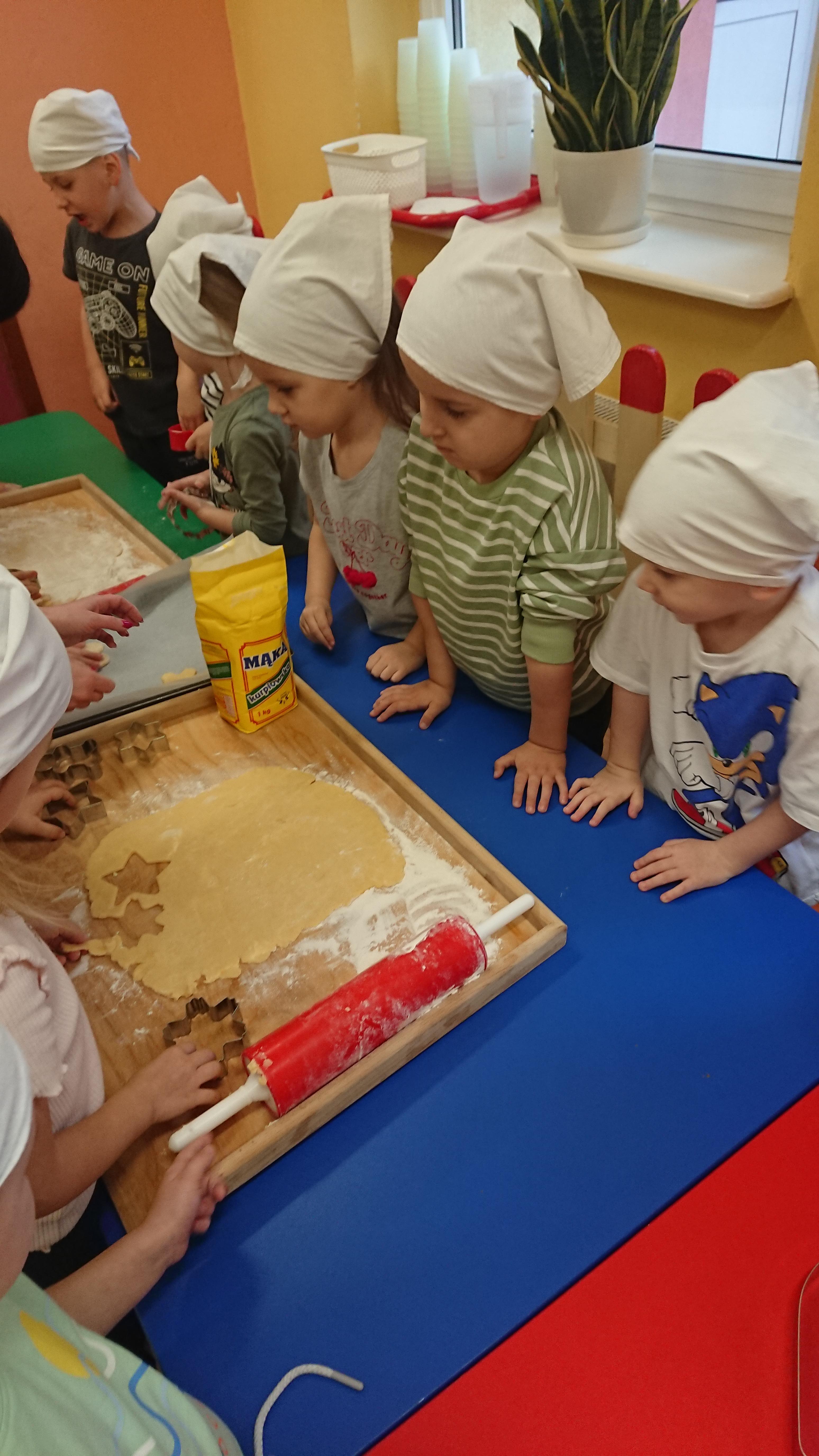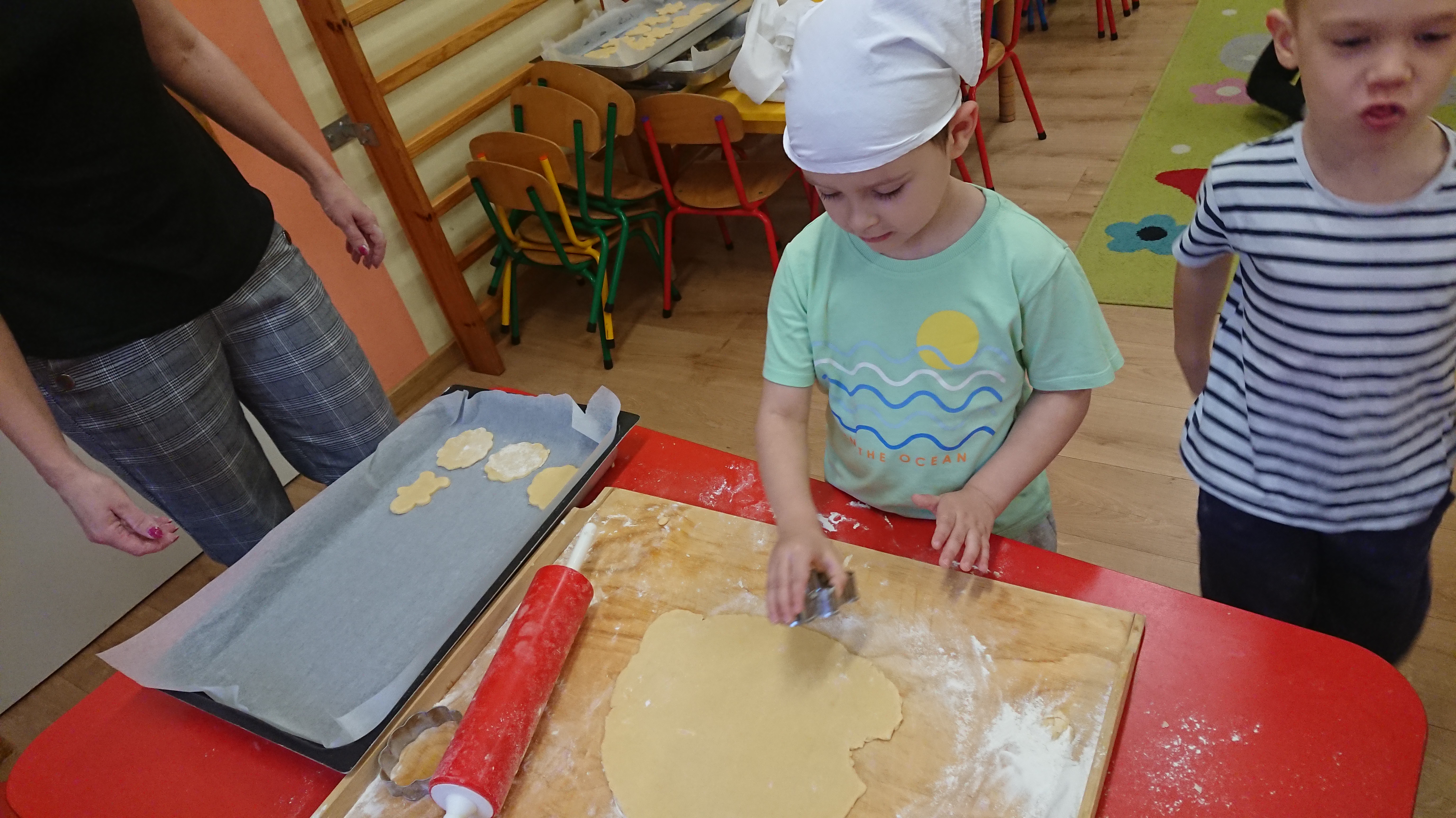 Prace w naszej Elfowej cukierni podzieliliśmy na kilka zespołów czteroosobowych, gdyż każde dziecko chciało brać czynny udział w przygotowaniach. I wspólnymi siłami udało nam się wykroić ponad 150 ciasteczek.