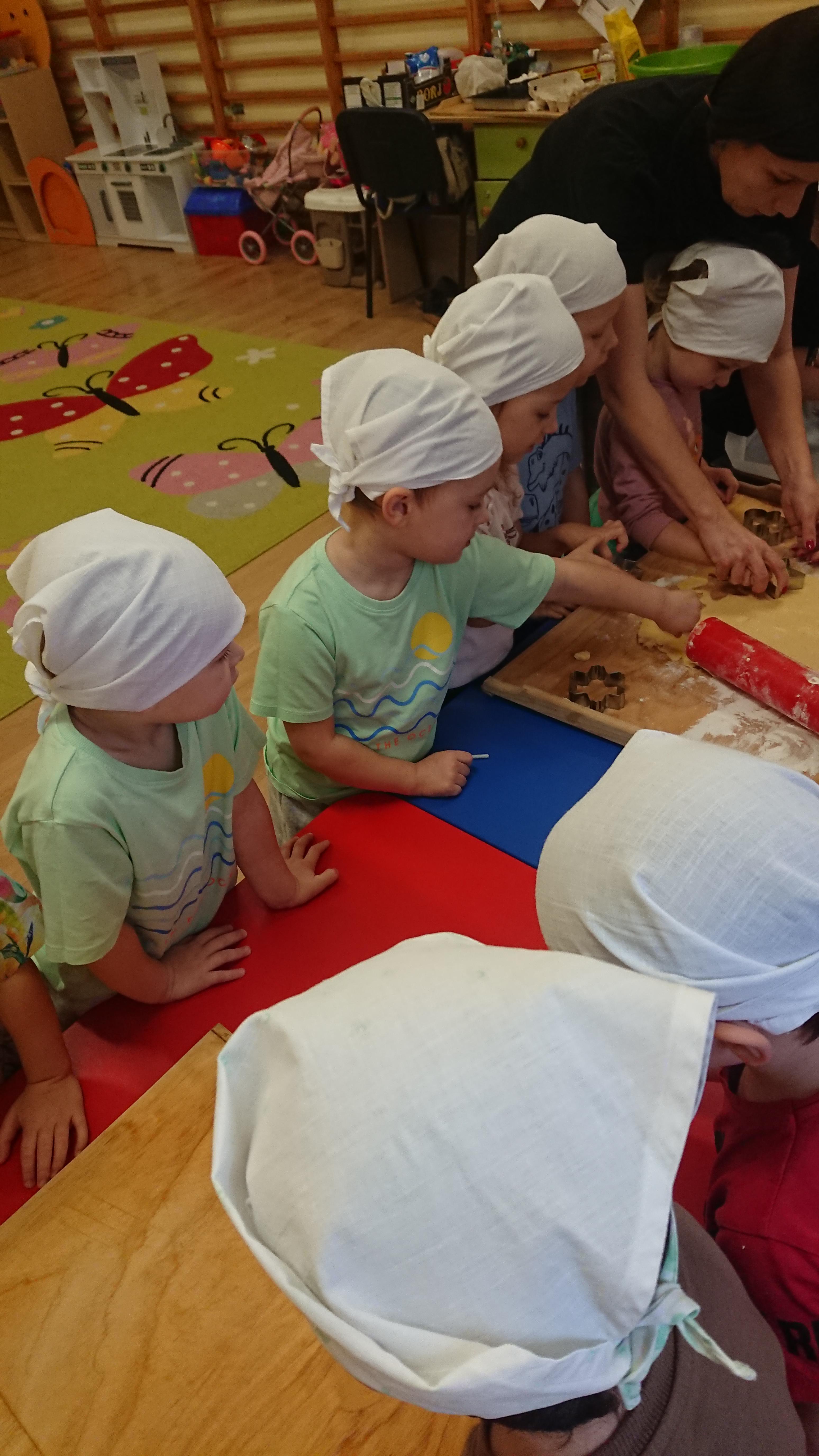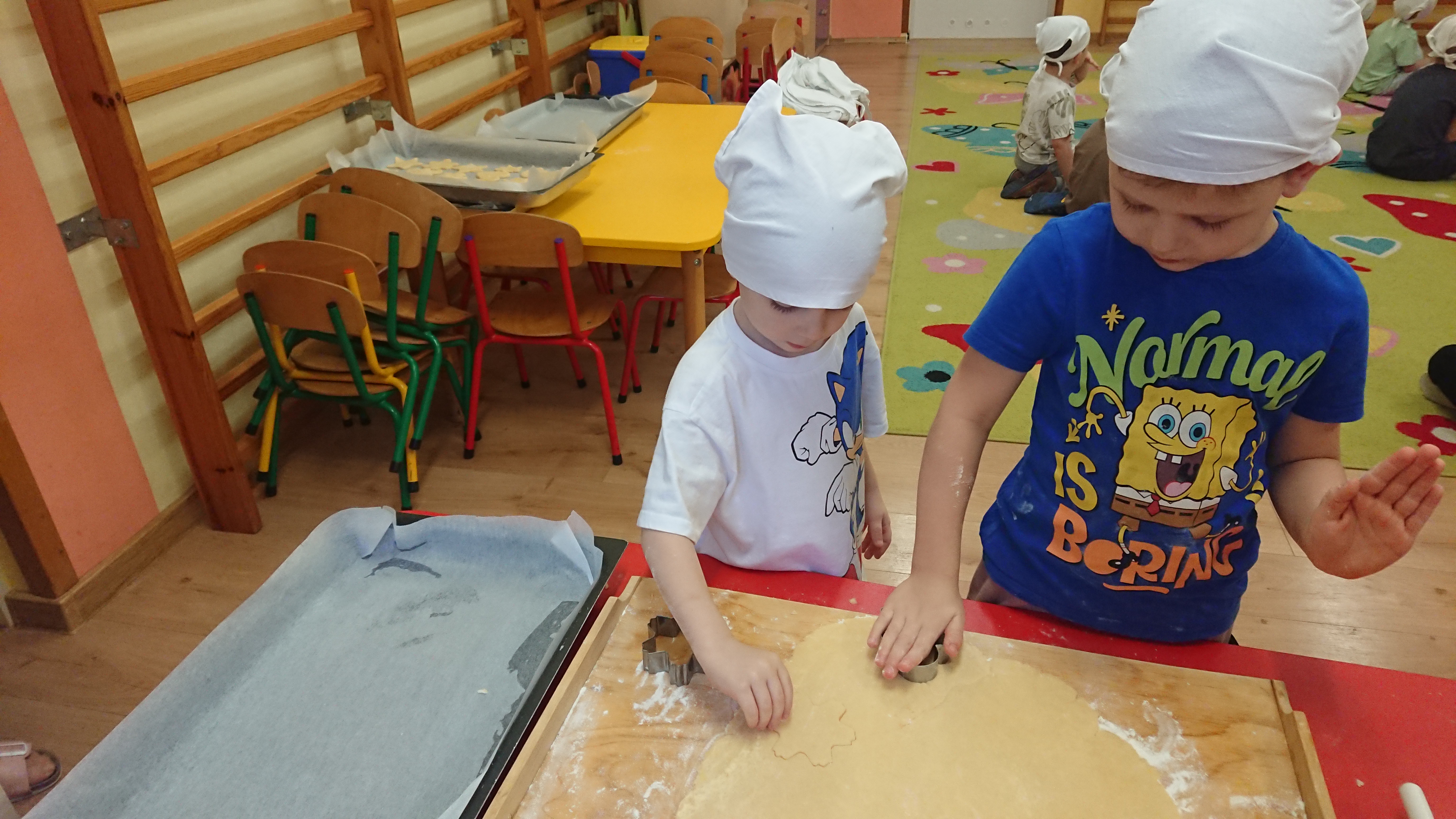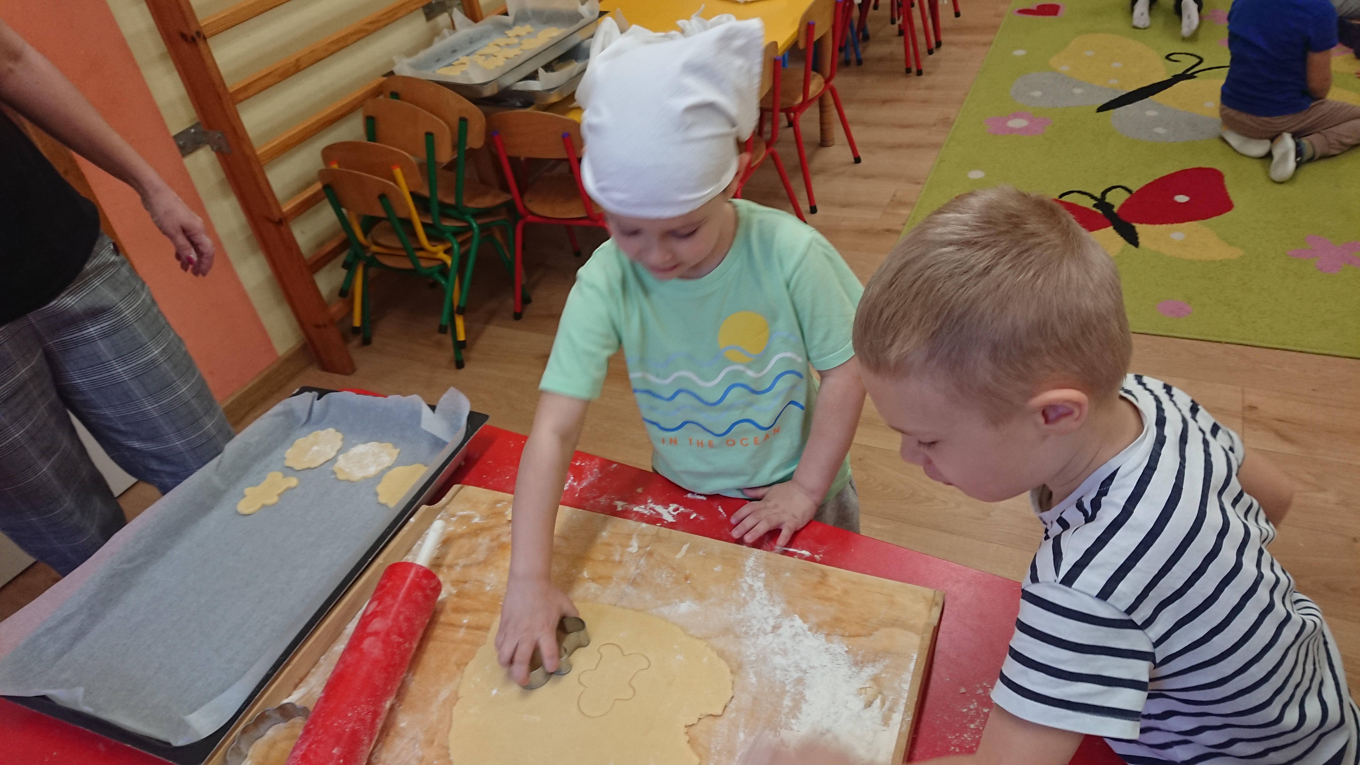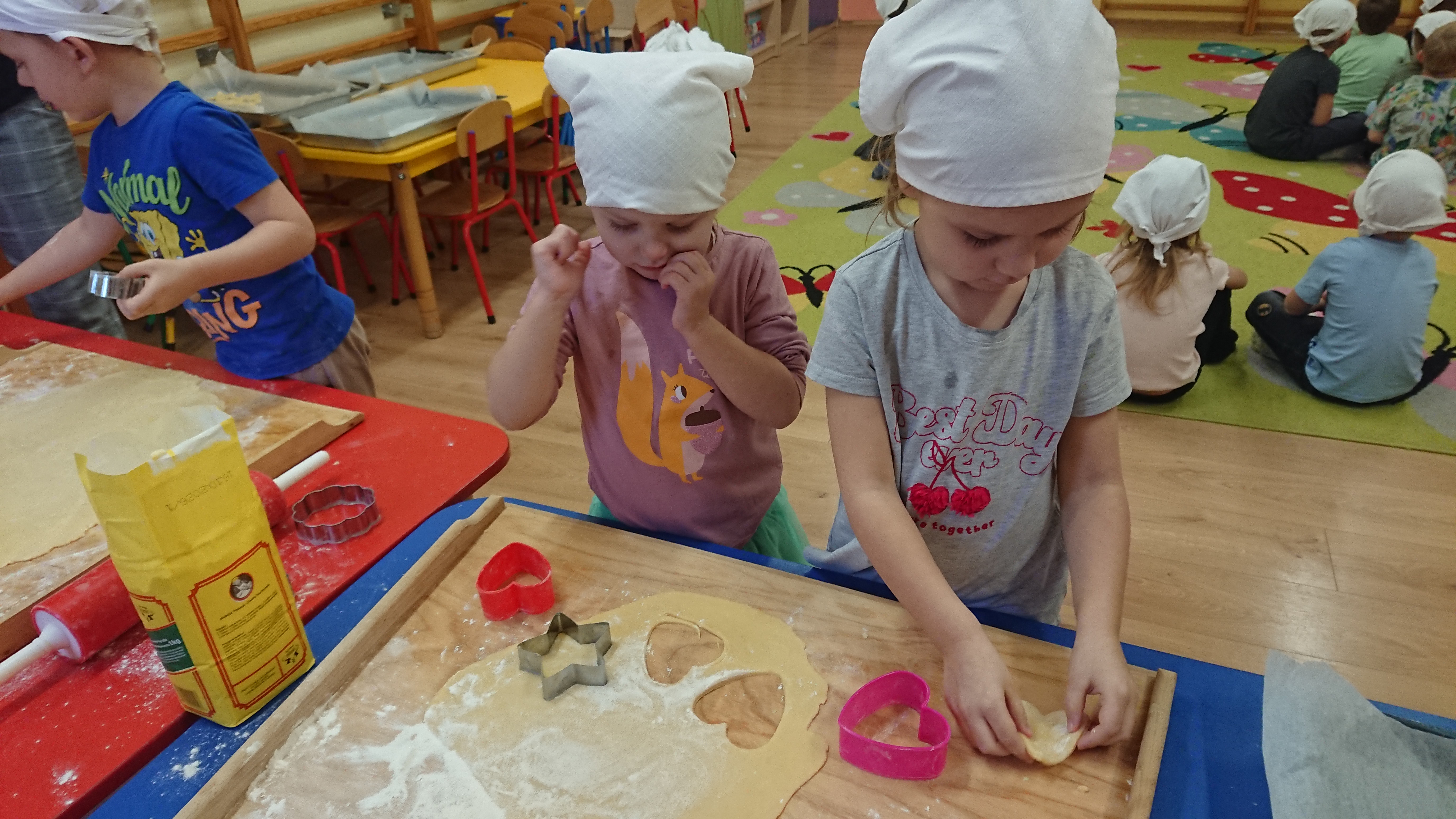 Prace w naszej Elfowej cukierni podzieliliśmy na kilka zespołów czteroosobowych, gdyż każde dziecko chciało brać czynny udział w przygotowaniach. I wspólnymi siłami udało nam się wykroić ponad 150 ciasteczek.