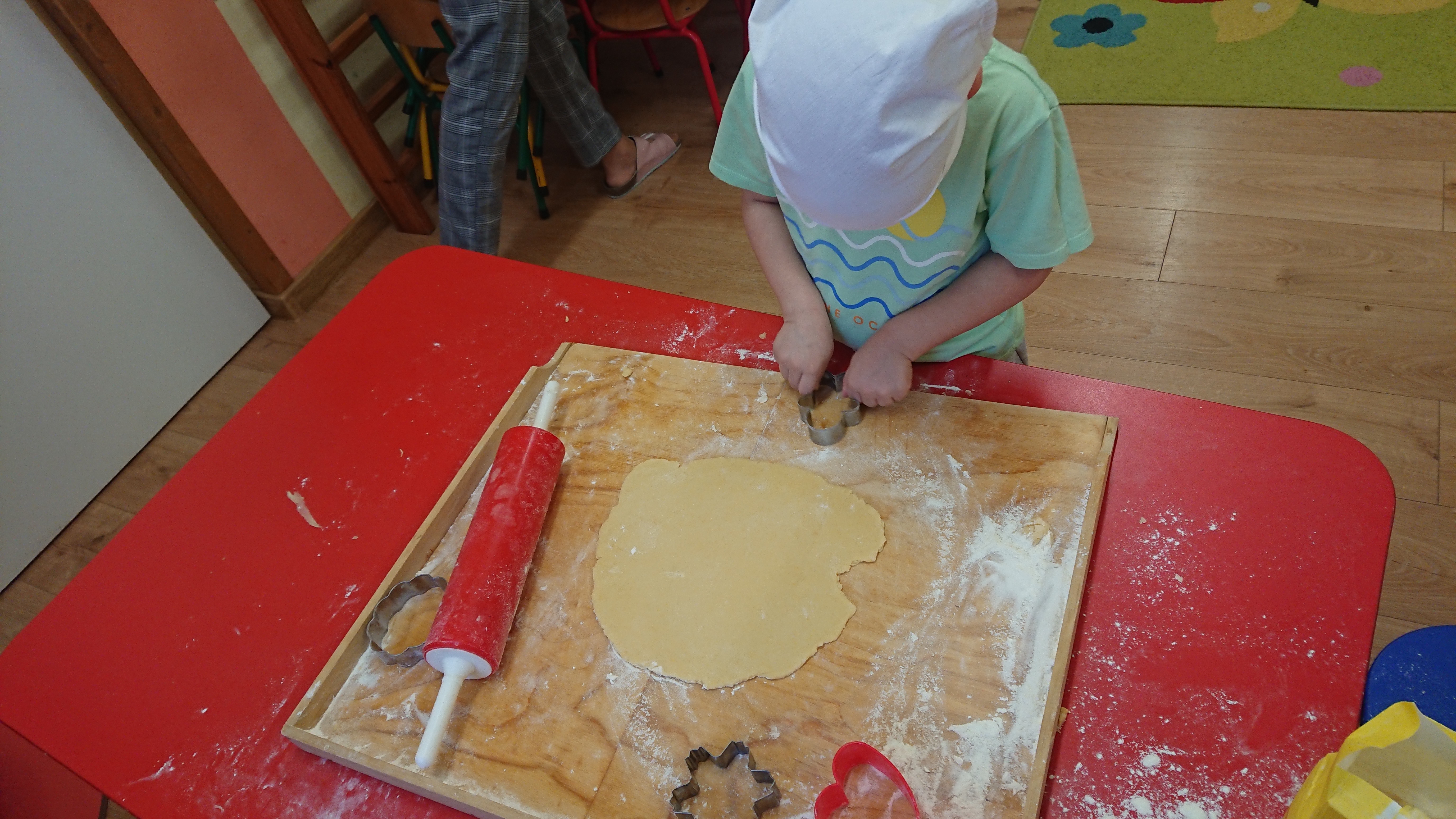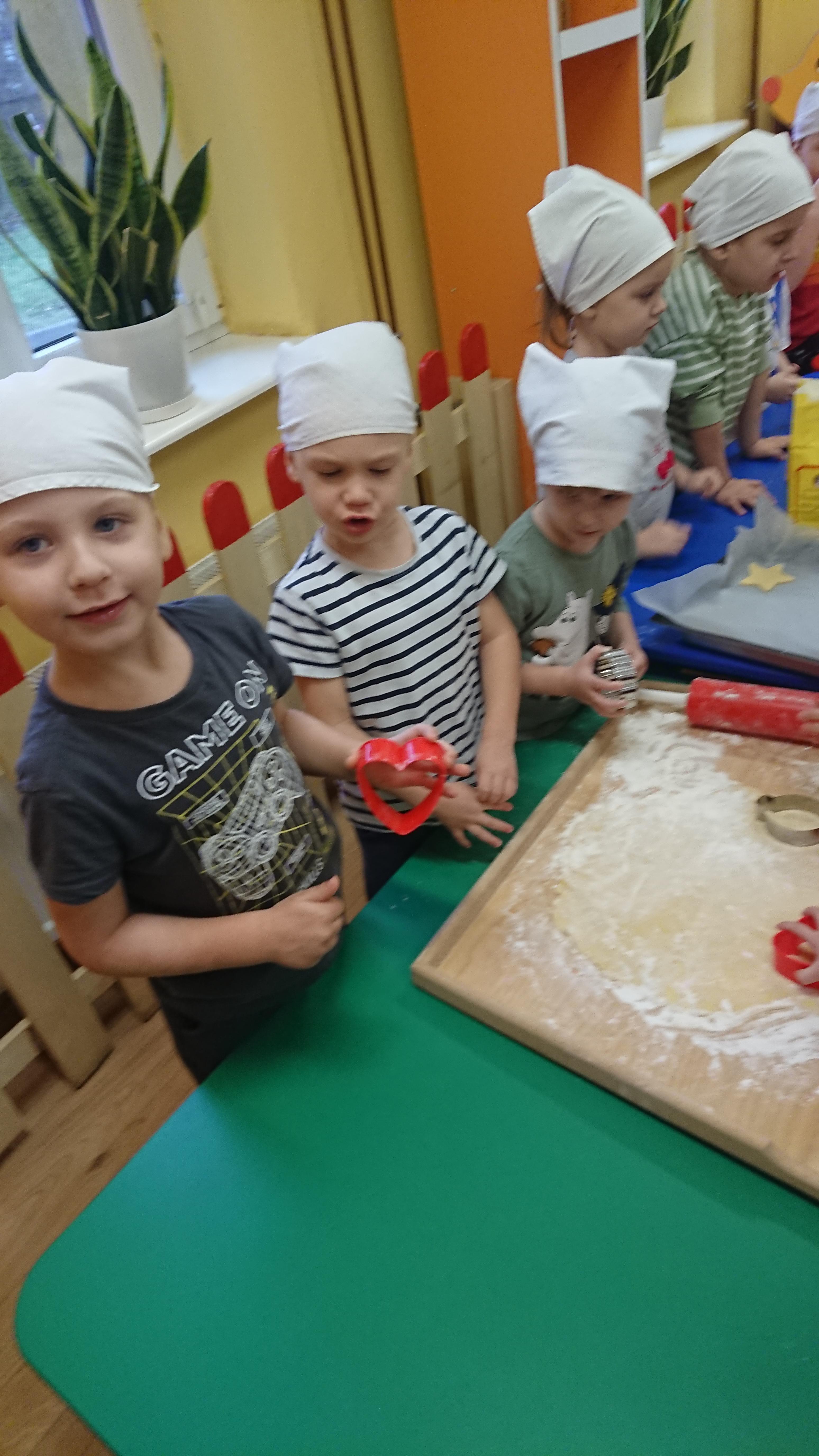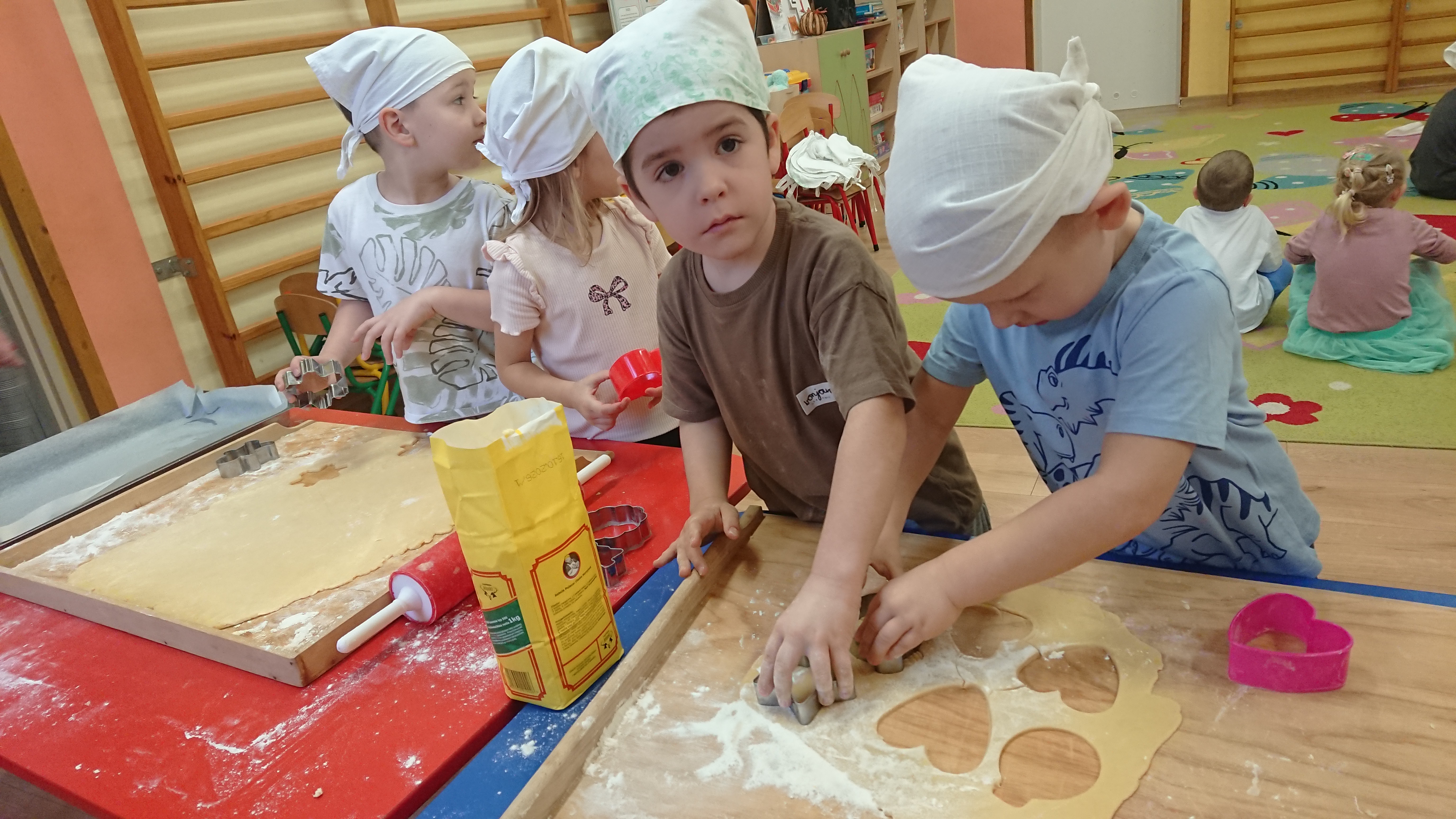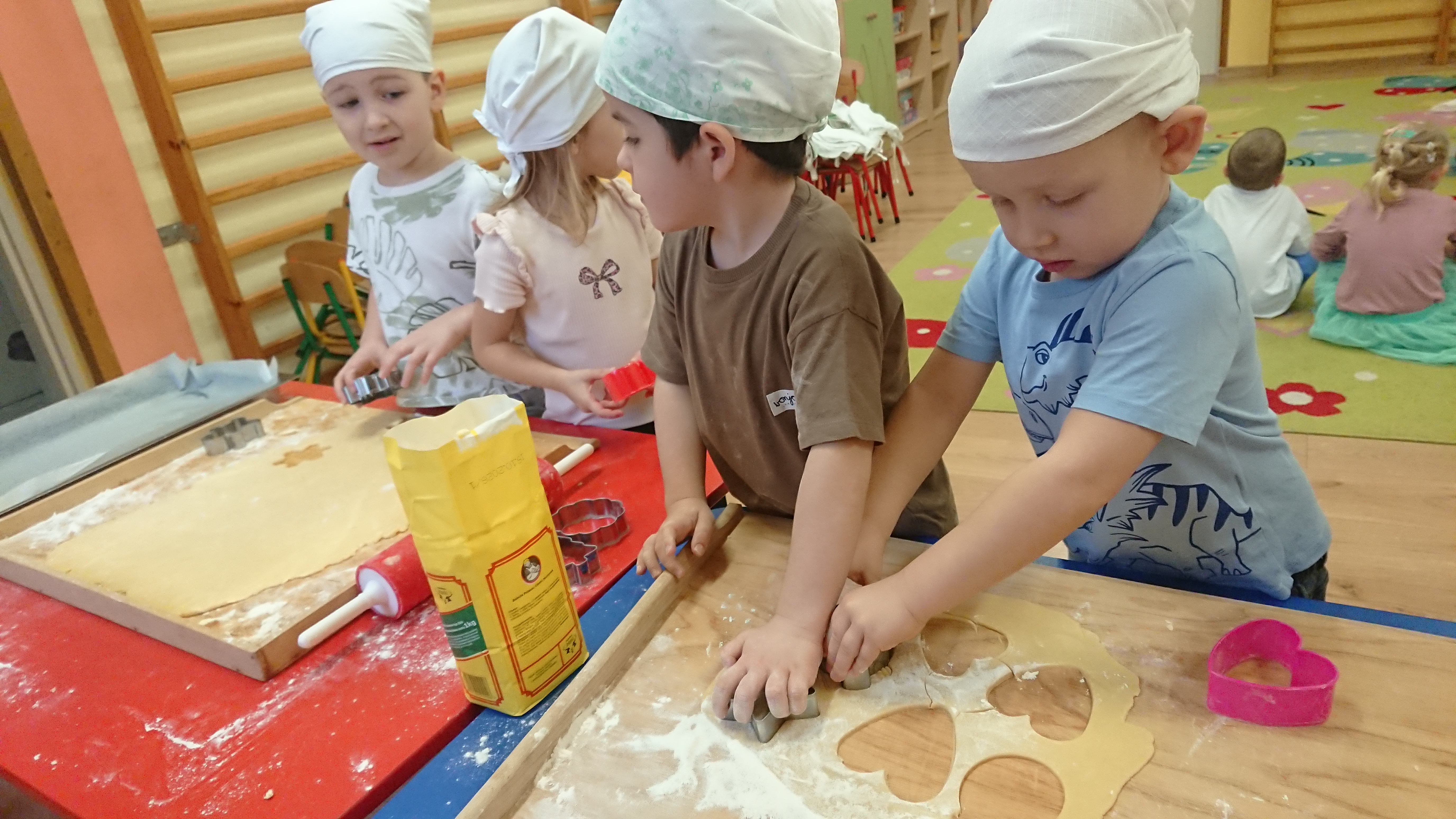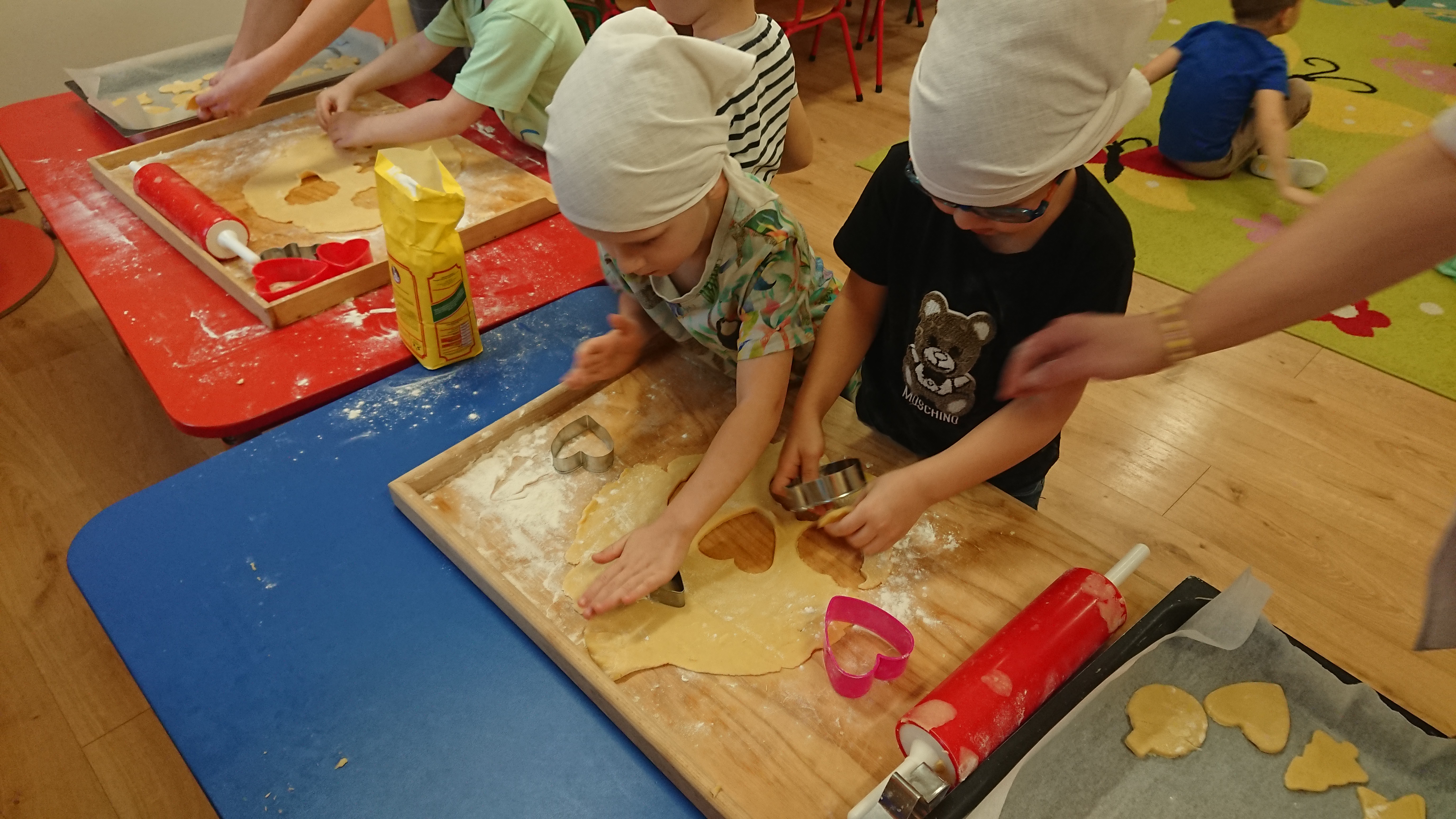 Prace w naszej Elfowej cukierni podzieliliśmy na kilka zespołów czteroosobowych, gdyż każde dziecko chciało brać czynny udział w przygotowaniach. I wspólnymi siłami udało nam się wykroić ponad 150 ciasteczek.