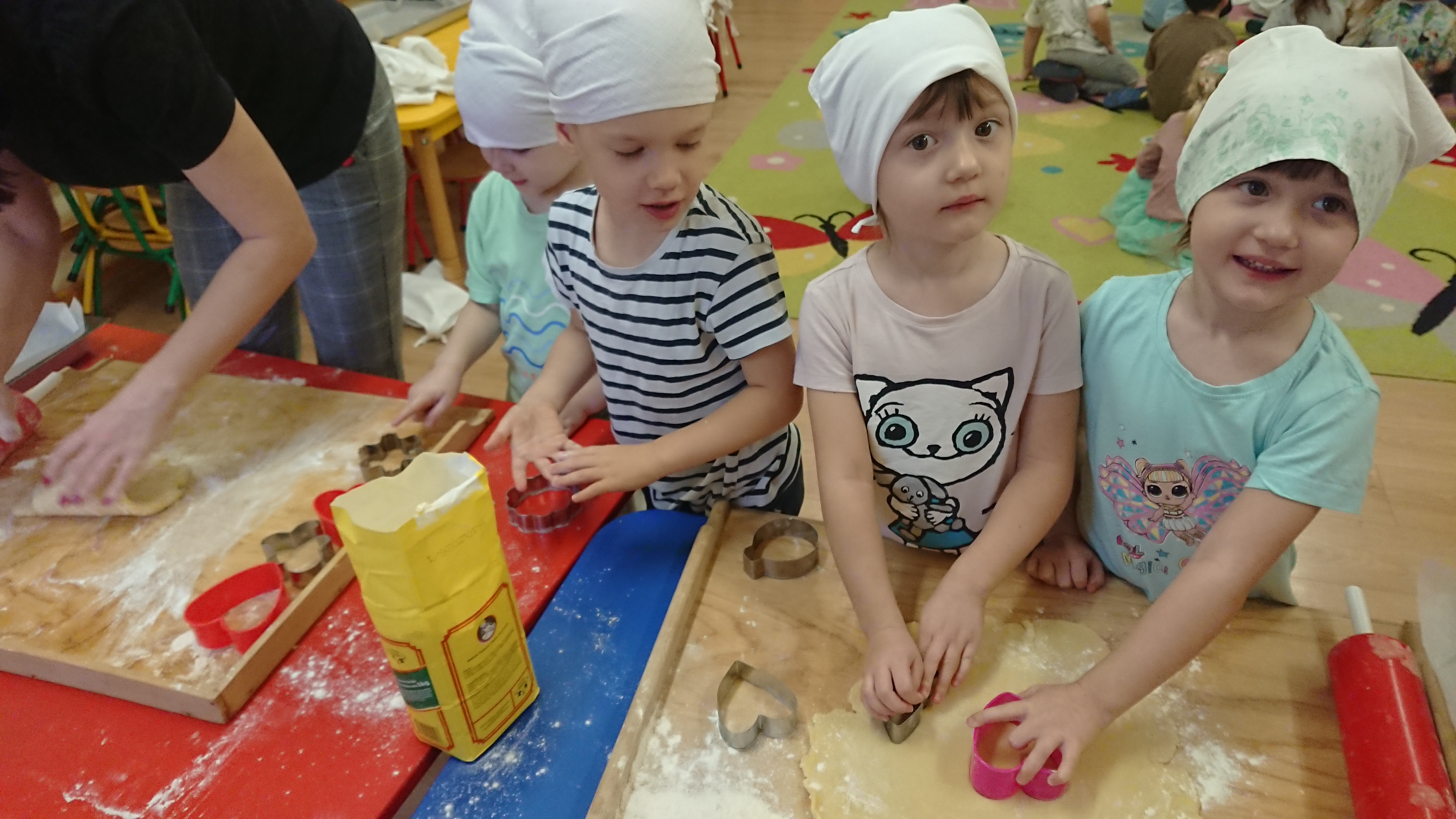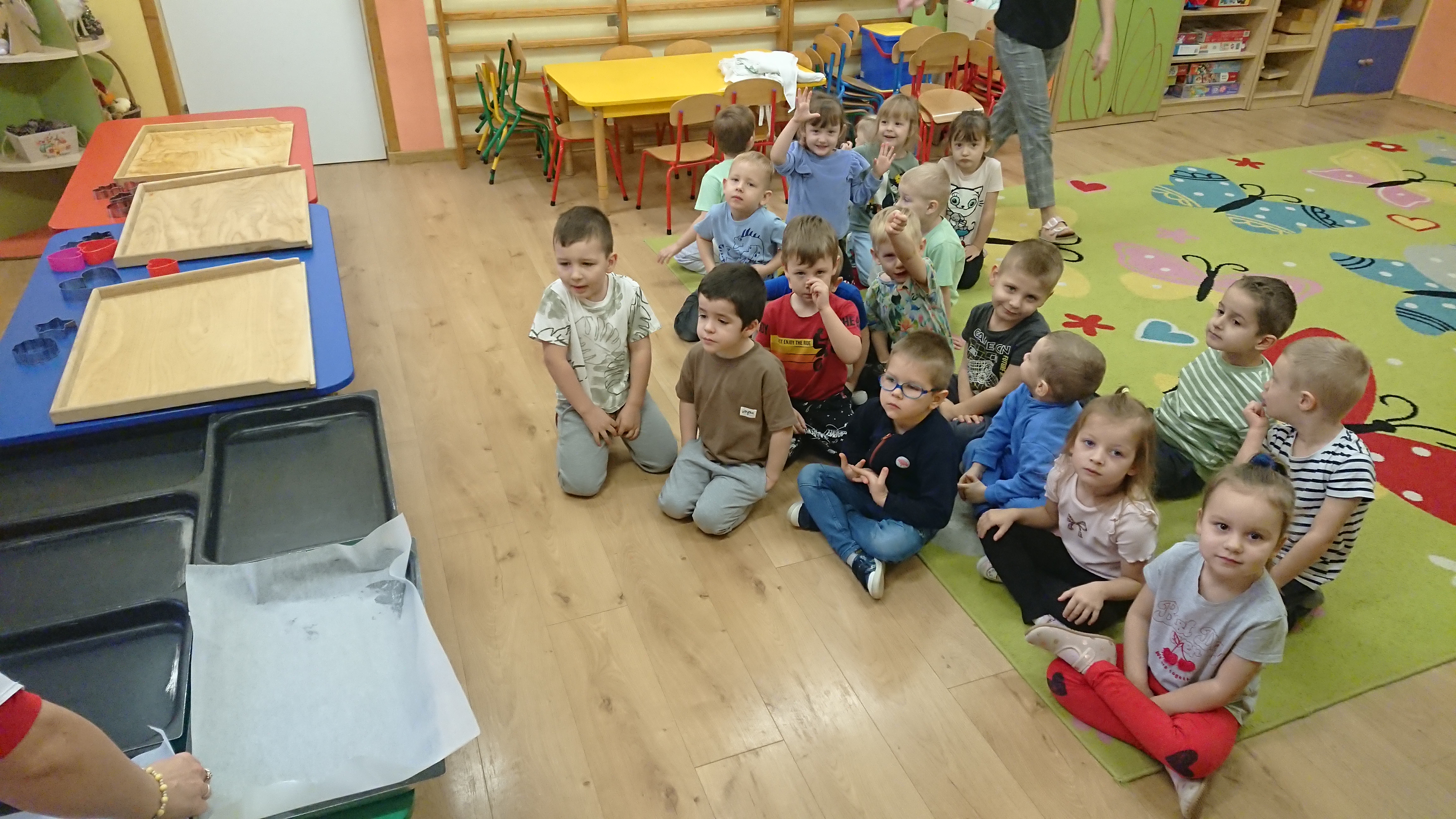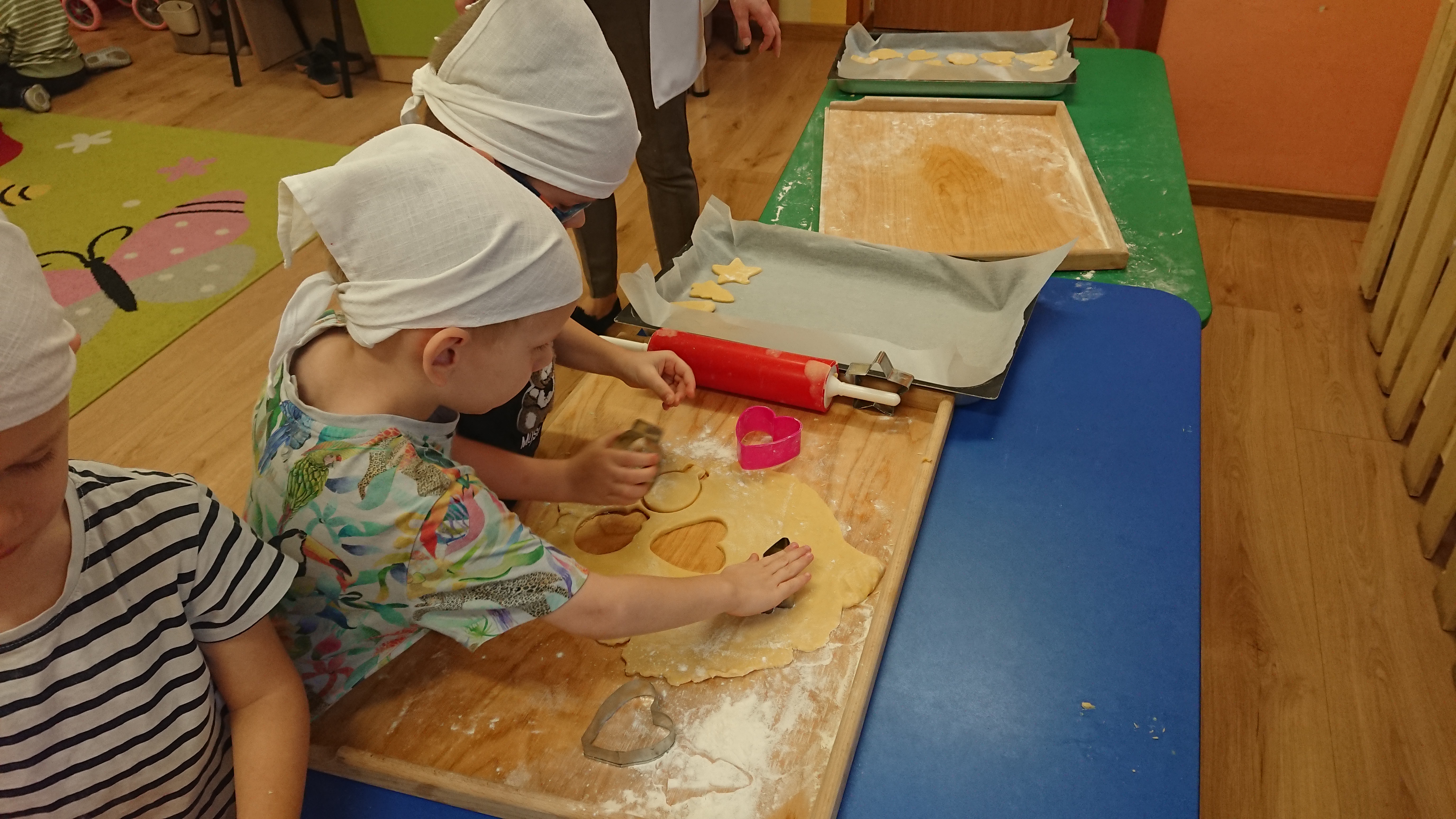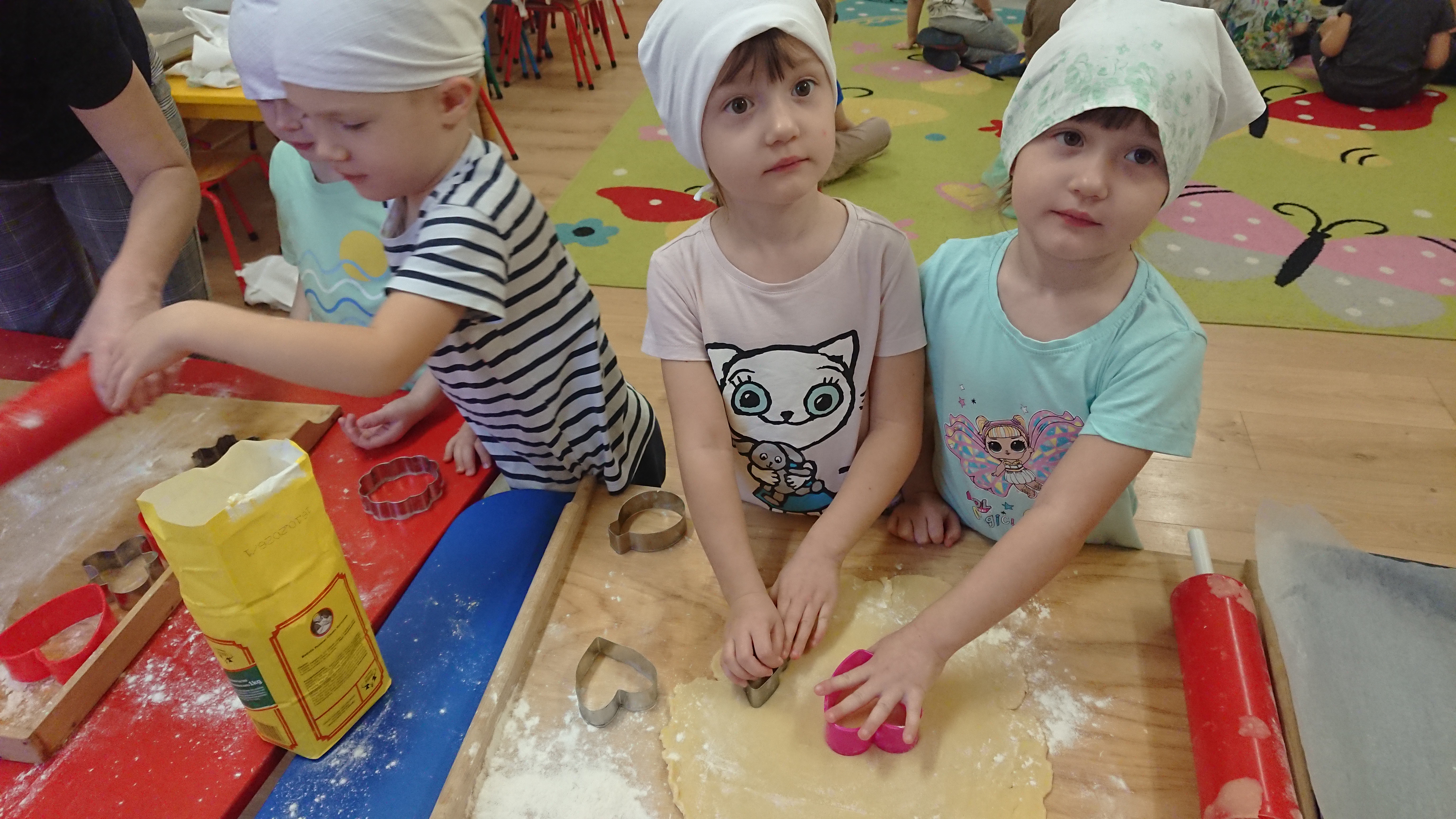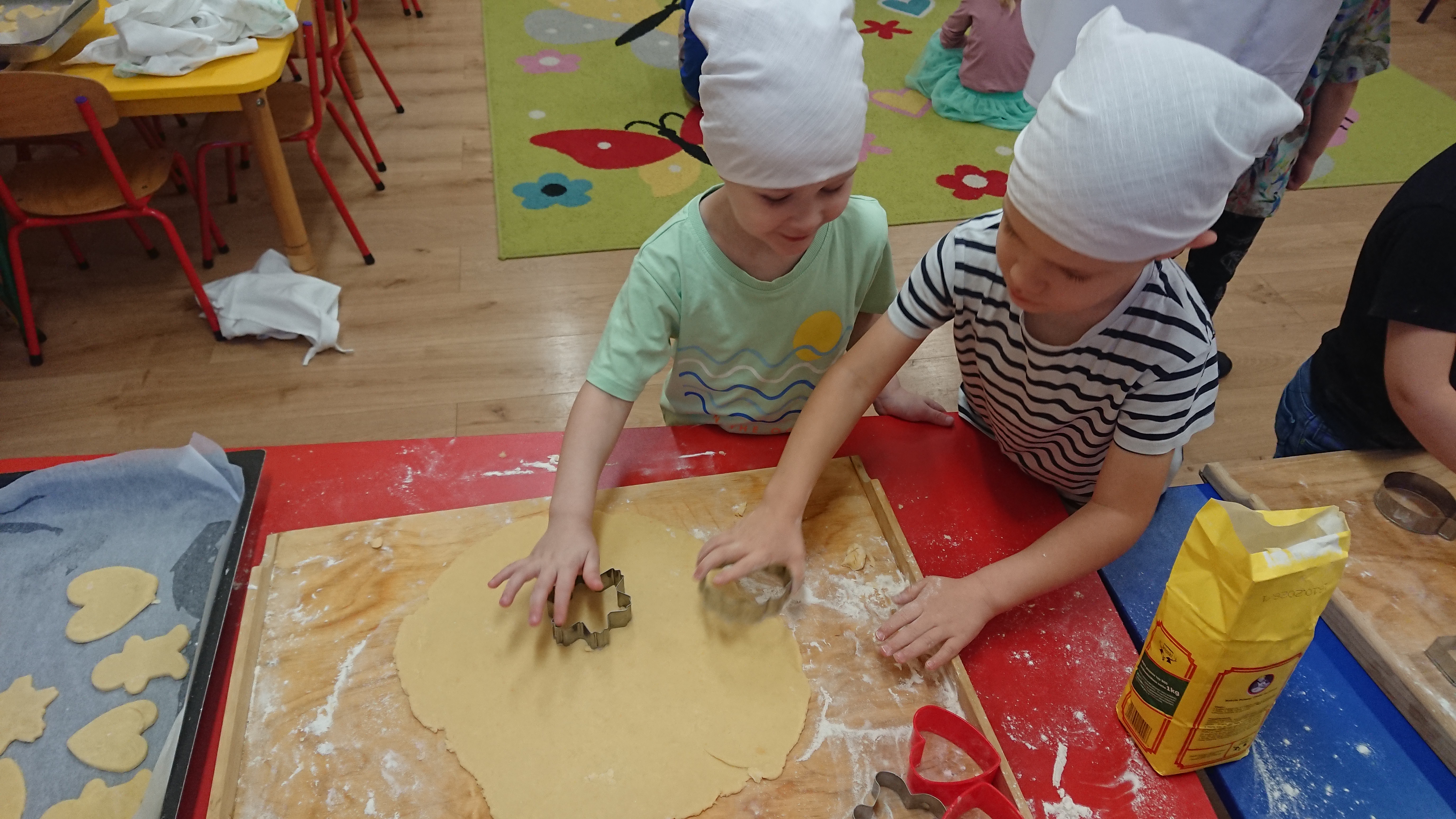 Prace w naszej Elfowej cukierni podzieliliśmy na kilka zespołów czteroosobowych, gdyż każde dziecko chciało brać czynny udział w przygotowaniach. I wspólnymi siłami udało nam się wykroić ponad 150 ciasteczek.