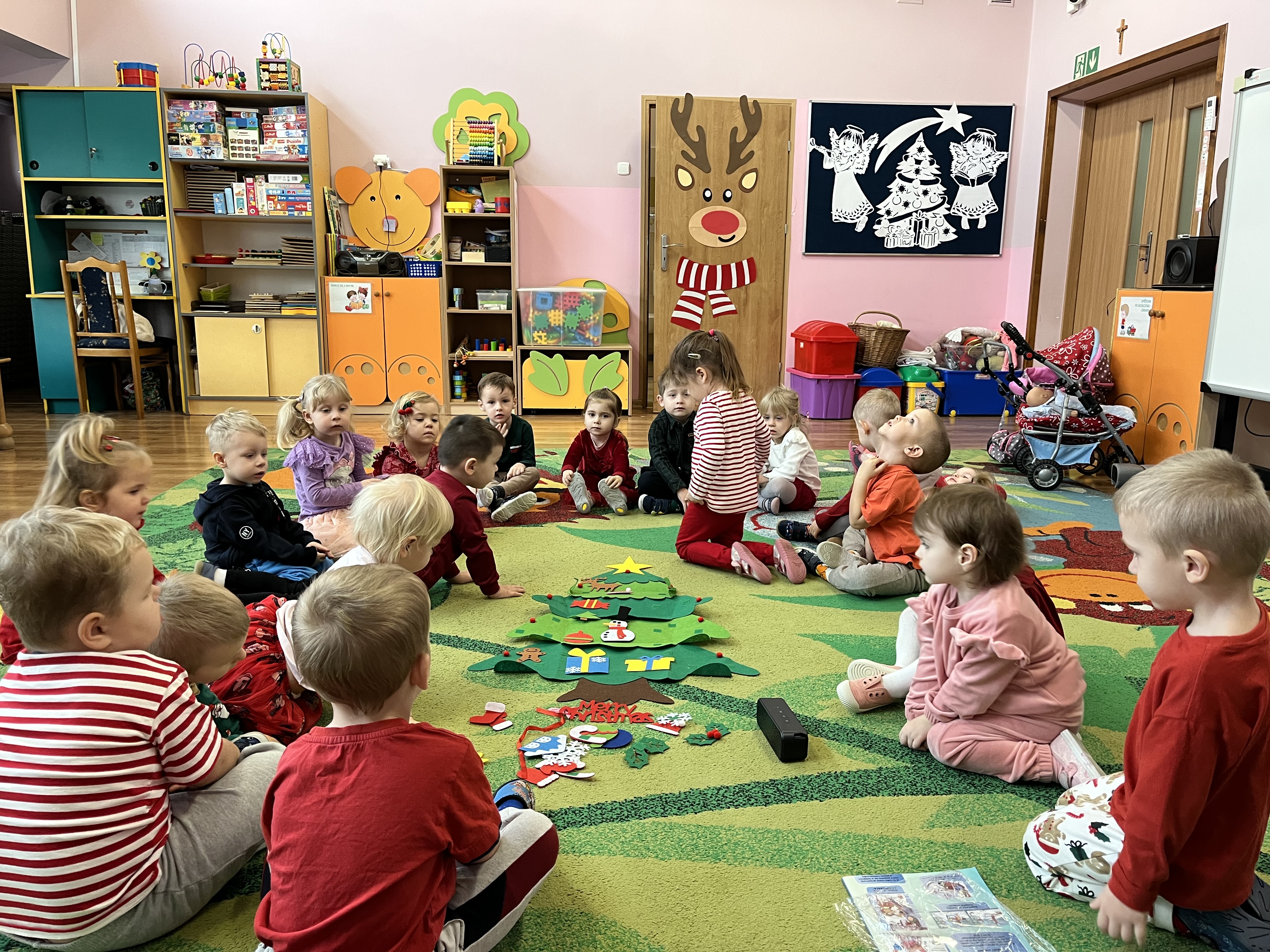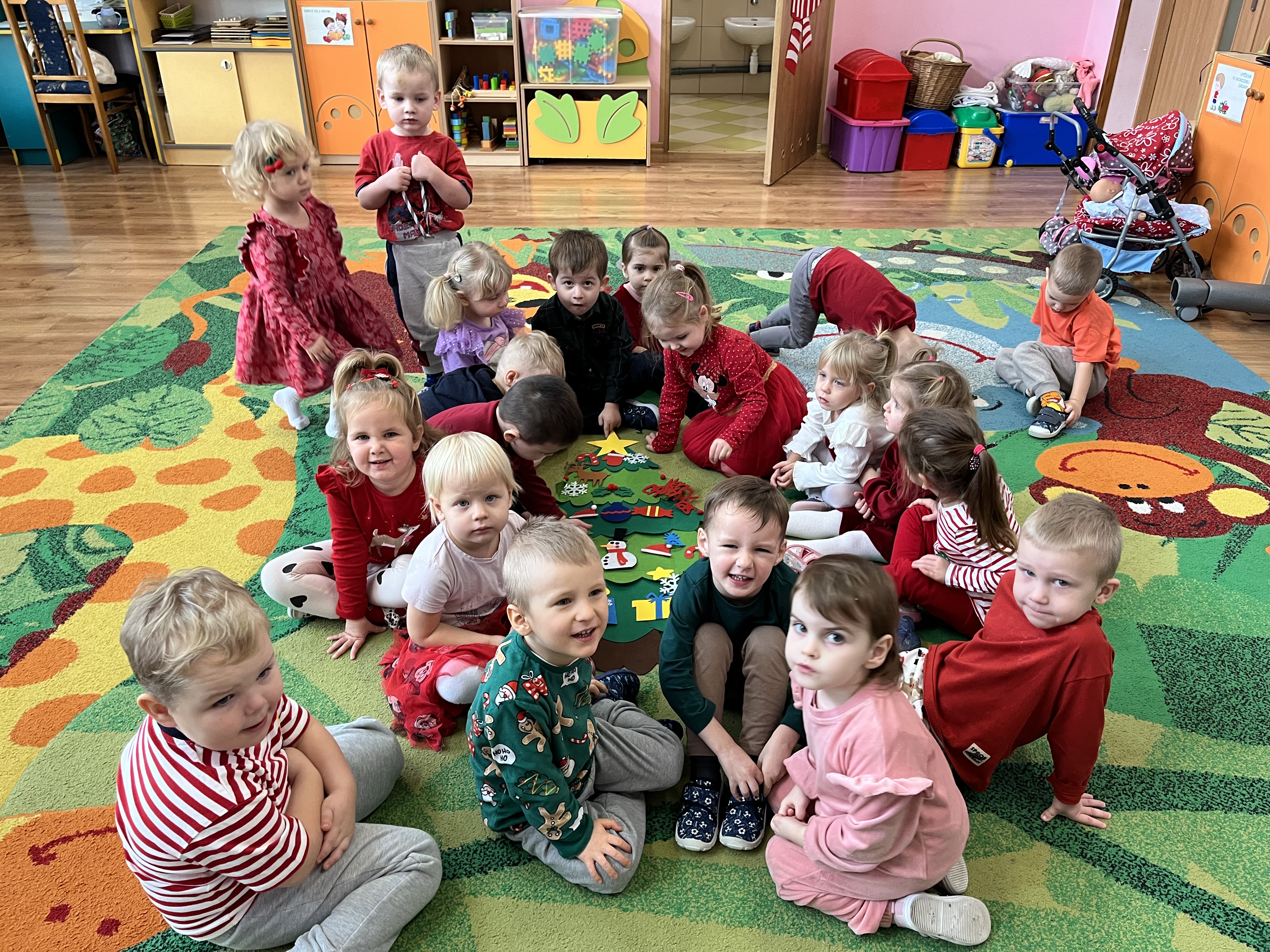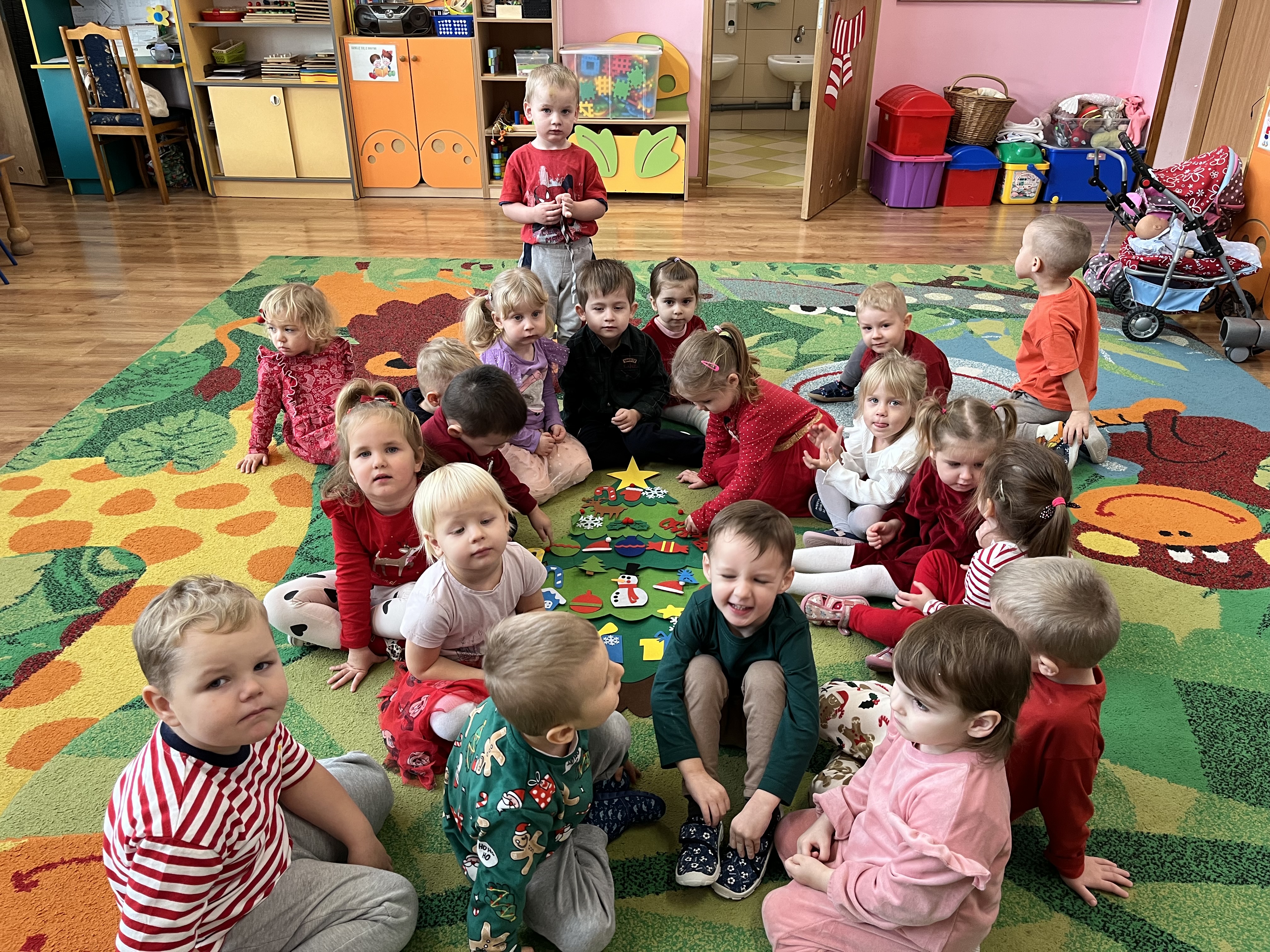6 grudnia obchodziliśmy w naszej grupie radosne Mikołajki. Tego dnia „Pszczółki” miały wyjątkowe zadanie – wspólnie ubierały swoją symboliczną choinkę. Dzieci z wielkim zaangażowaniem i radością dekorowały drzewko, wprowadzając do sali prawdziwie świąteczny nastrój.