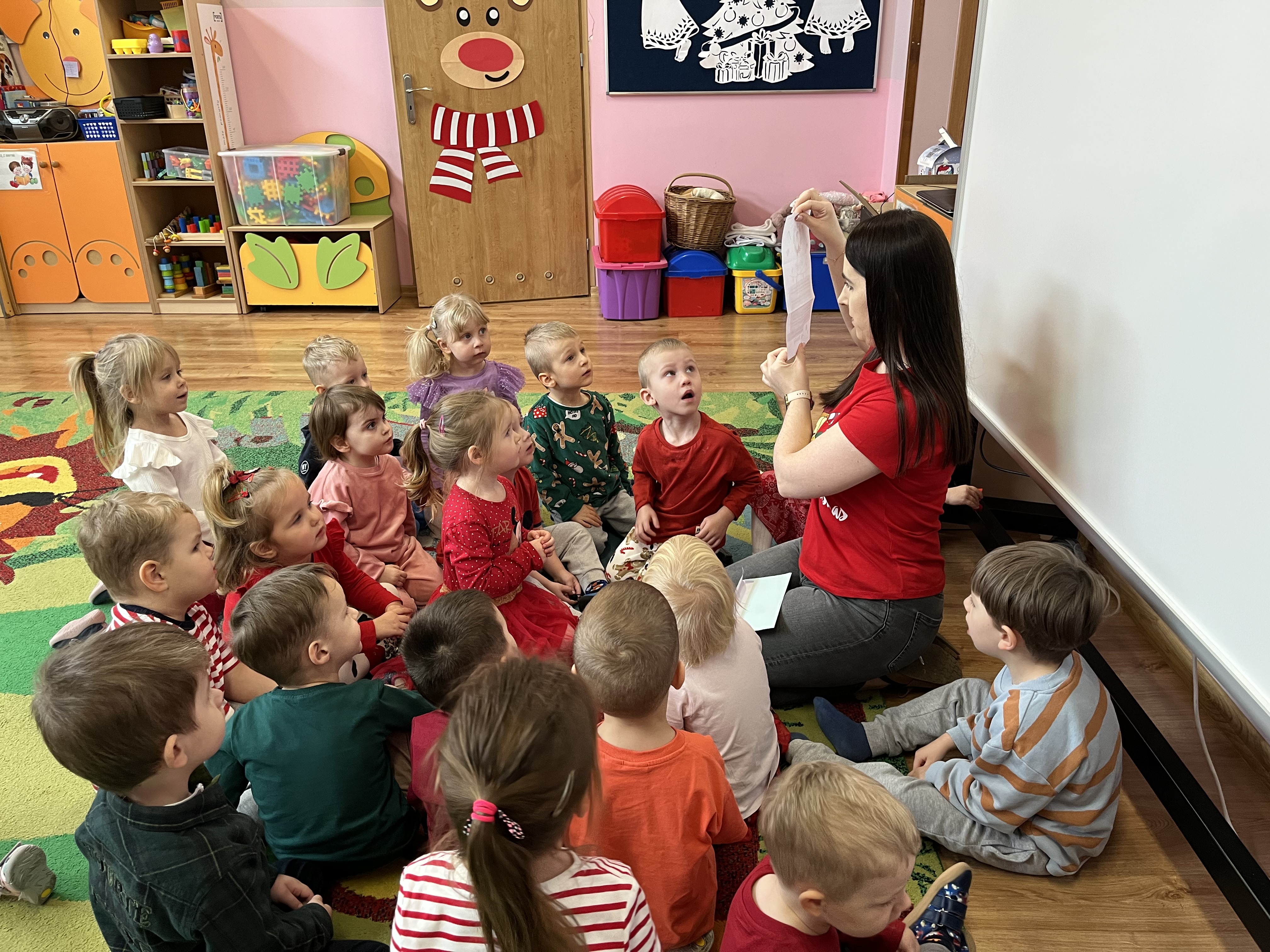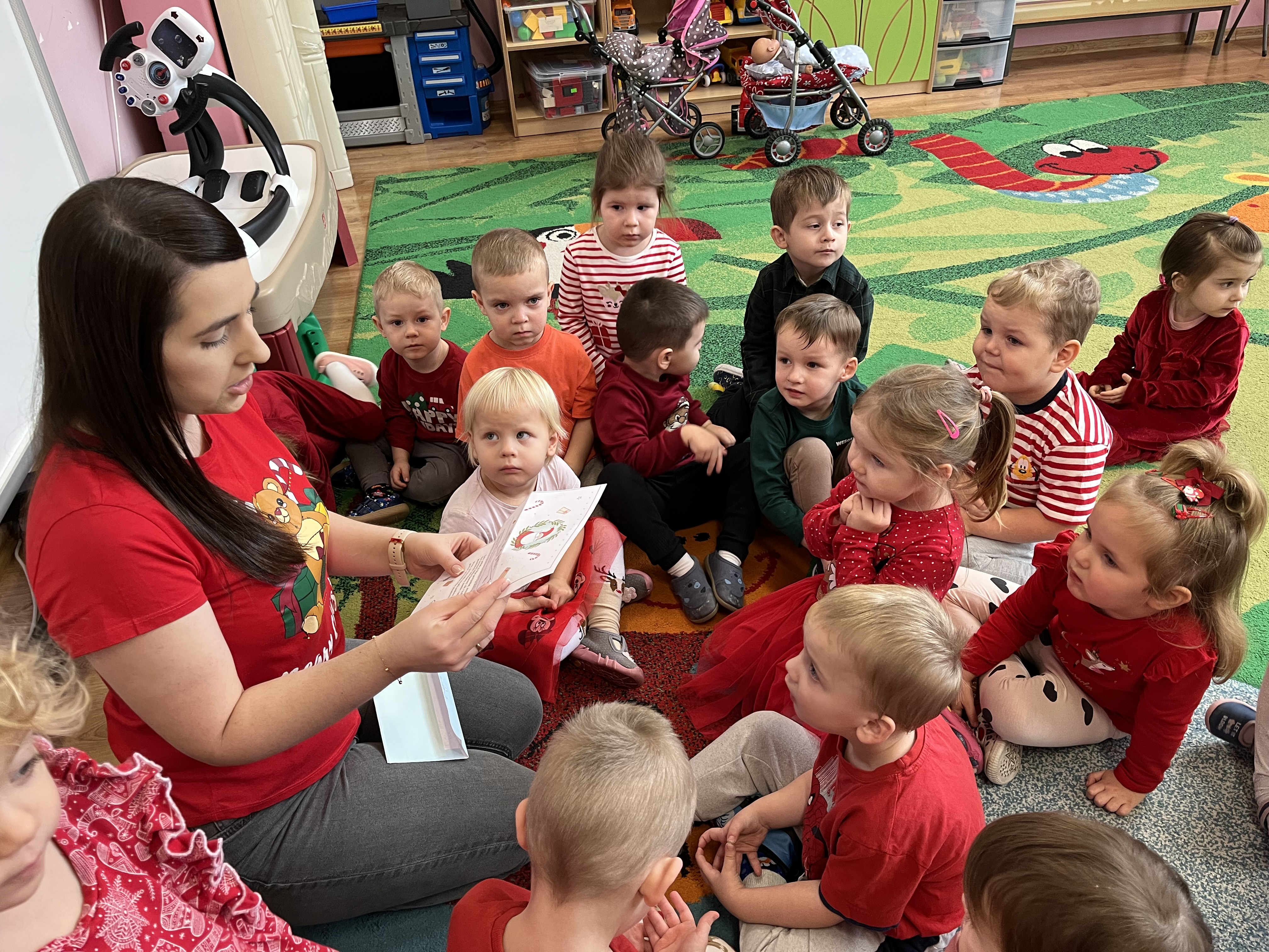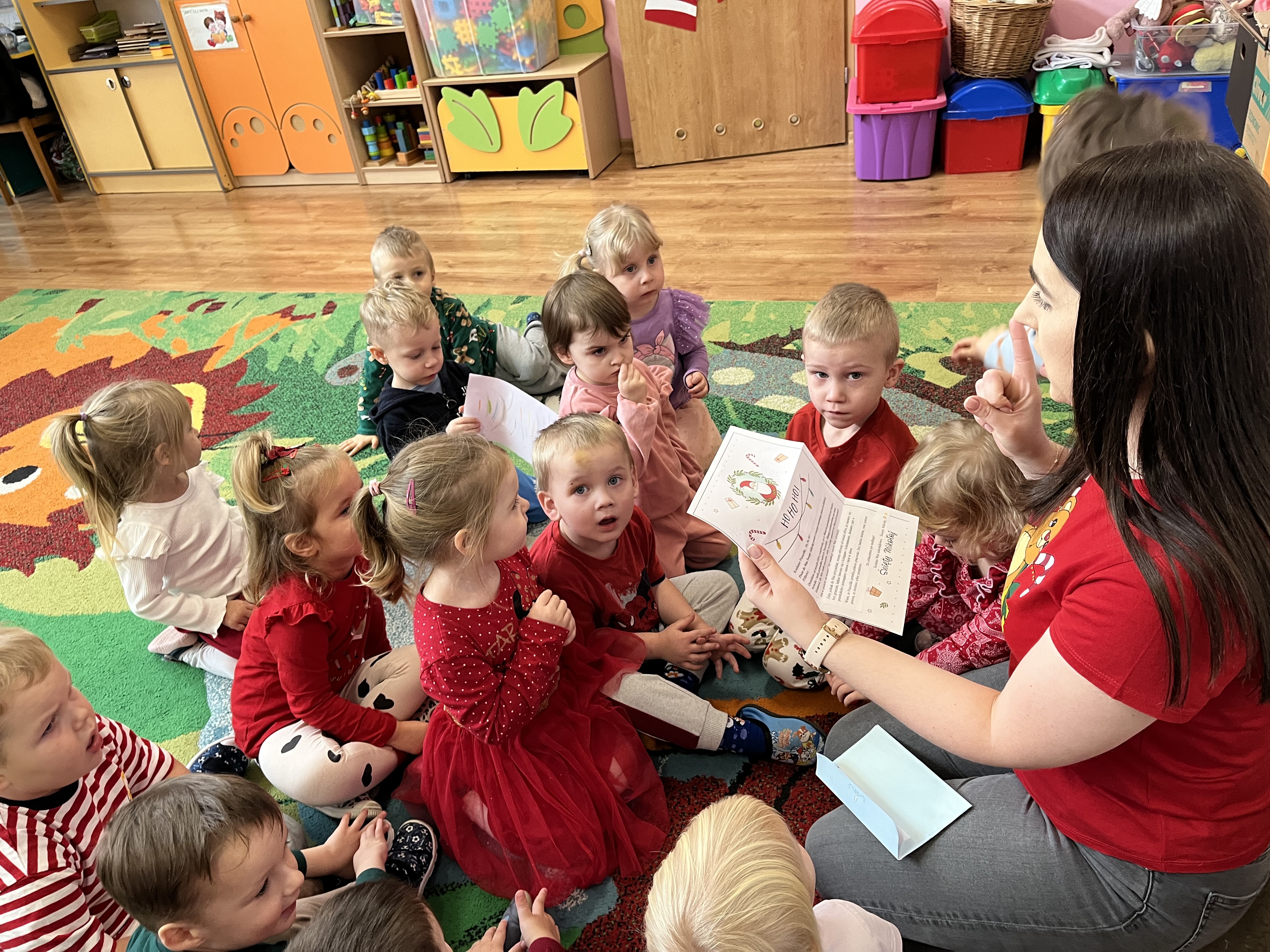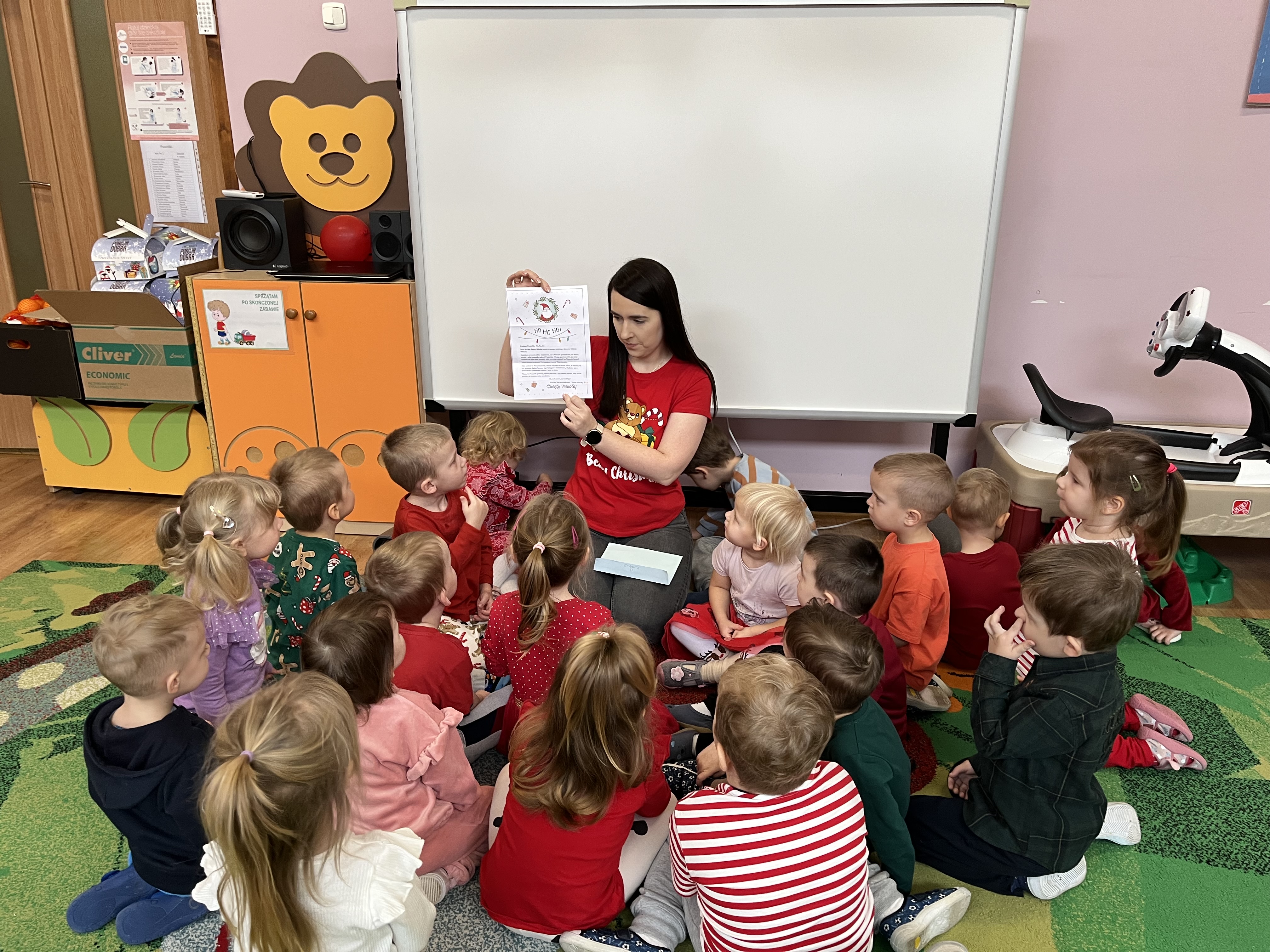 Zanim odnaleźliśmy prezenty, pod drzwiami czekała na nas miła niespodzianka – list od samego Mikołaja. W swoim liście Mikołaj prosił dzieci, aby były grzeczne, słuchały rodziców oraz pań, a także chętnie pomagały w domu. Po przeczytaniu listu, tuż za drzwiami, znaleźliśmy prezenty przygotowane dla „Pszczółek”.