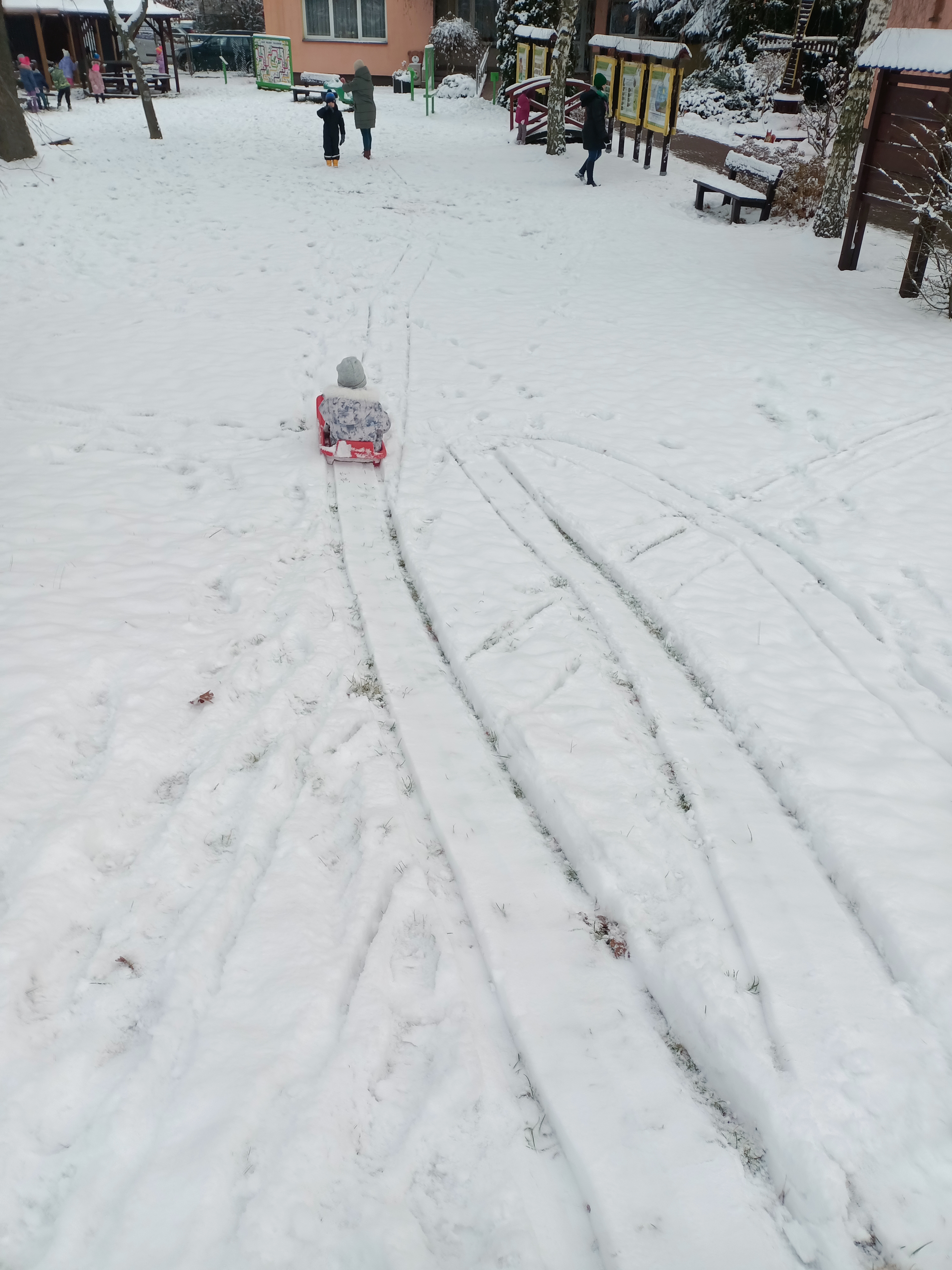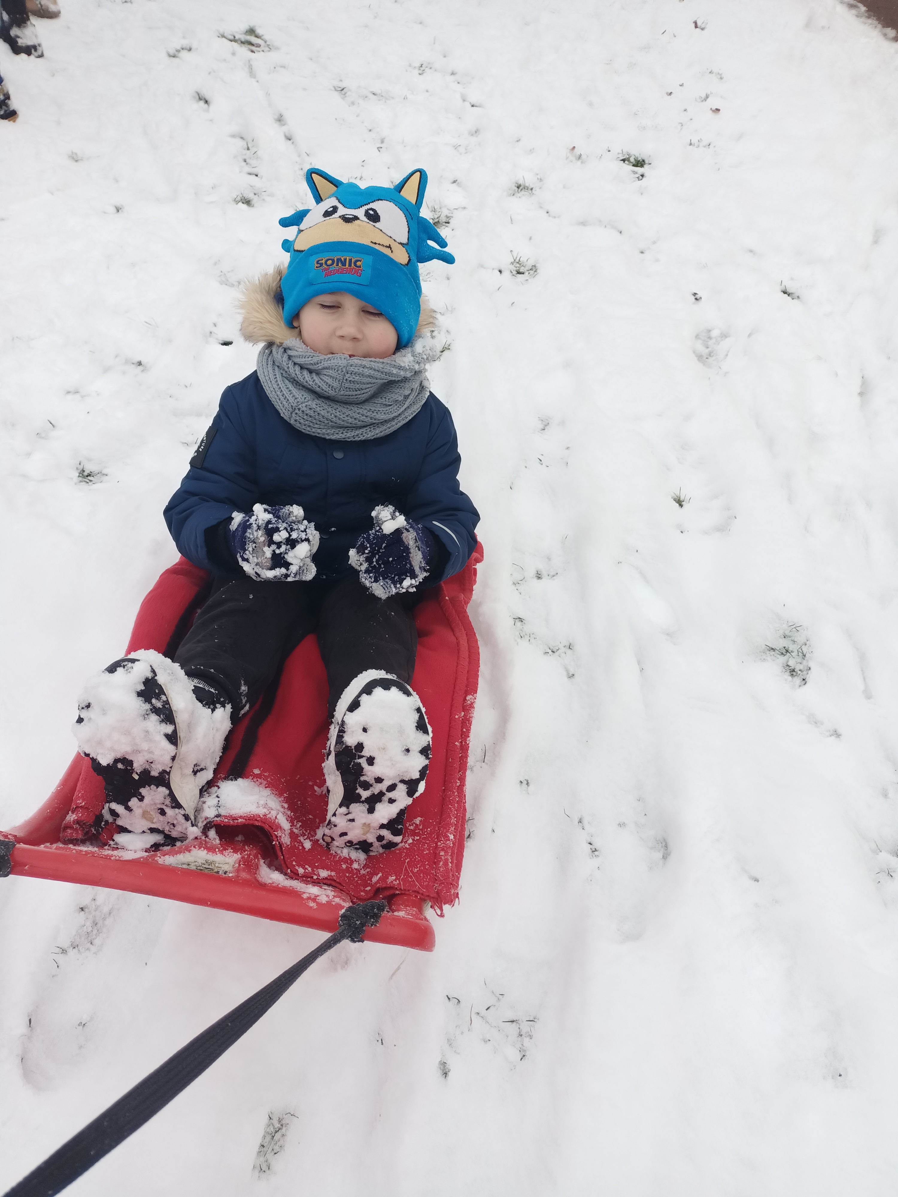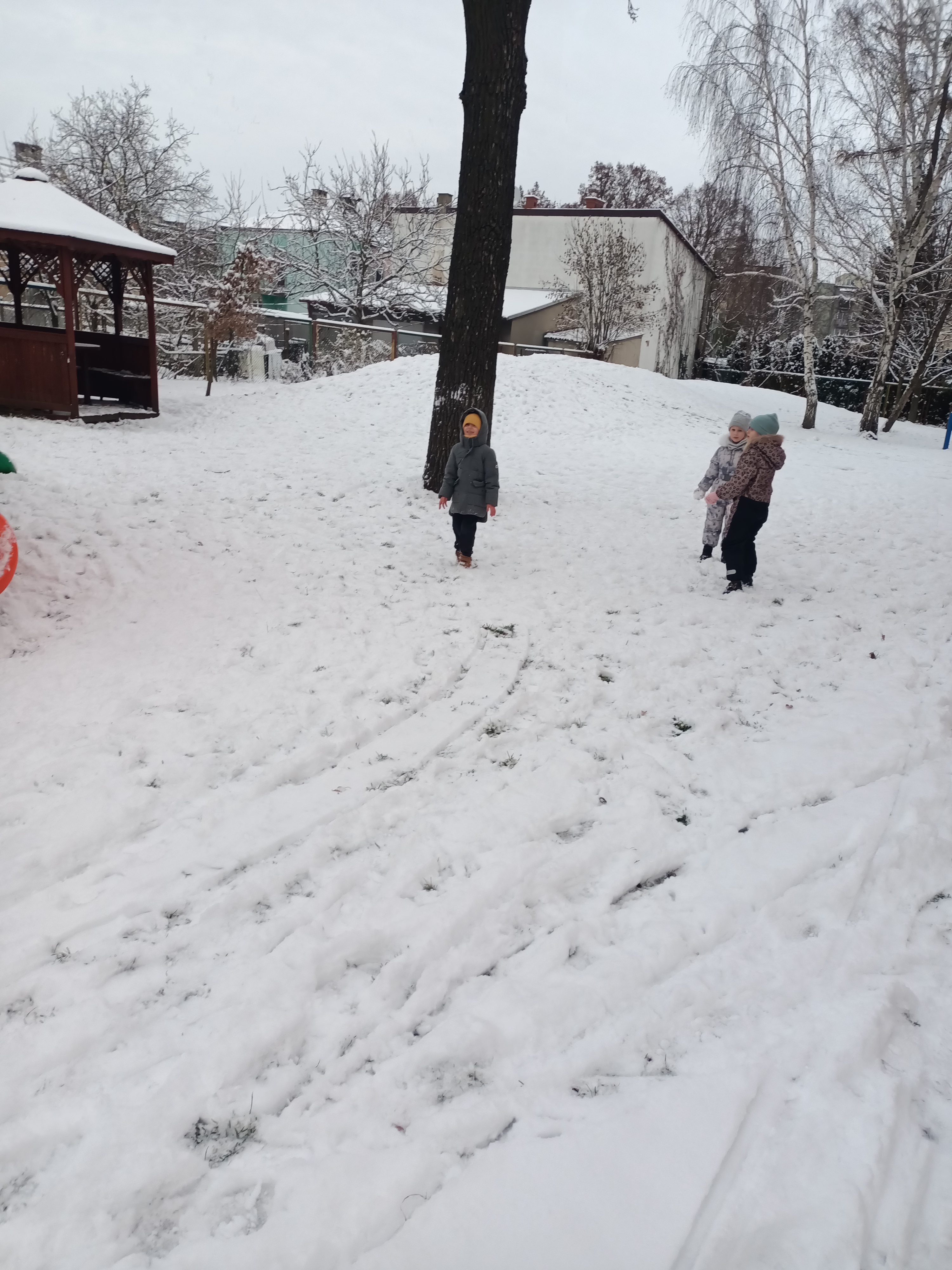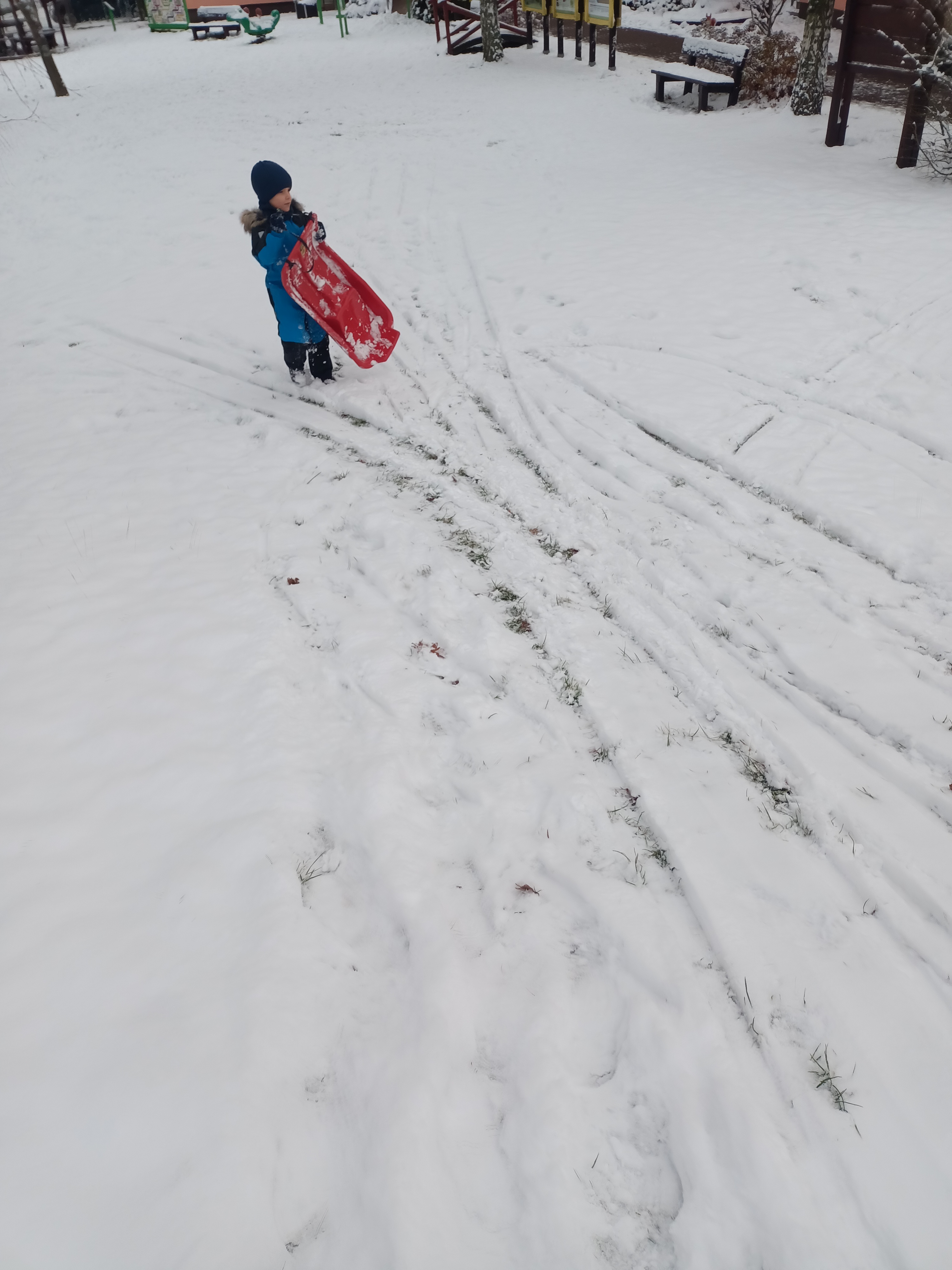 Spadł pierwszy śnieg, a dzieci od rana z wielką ekscytacją dopytywały, kiedy wyjdziemy na nasze przedszkolne podwórko. Wobec tak ogromnej radości nie można było pozostać obojętnym, dlatego wybraliśmy się na świeże powietrze. Dzieci z entuzjazmem wyciągnęły sanki i pełne energii ruszyły na górkę, ciesząc się pierwszym zimowym szaleństwem.