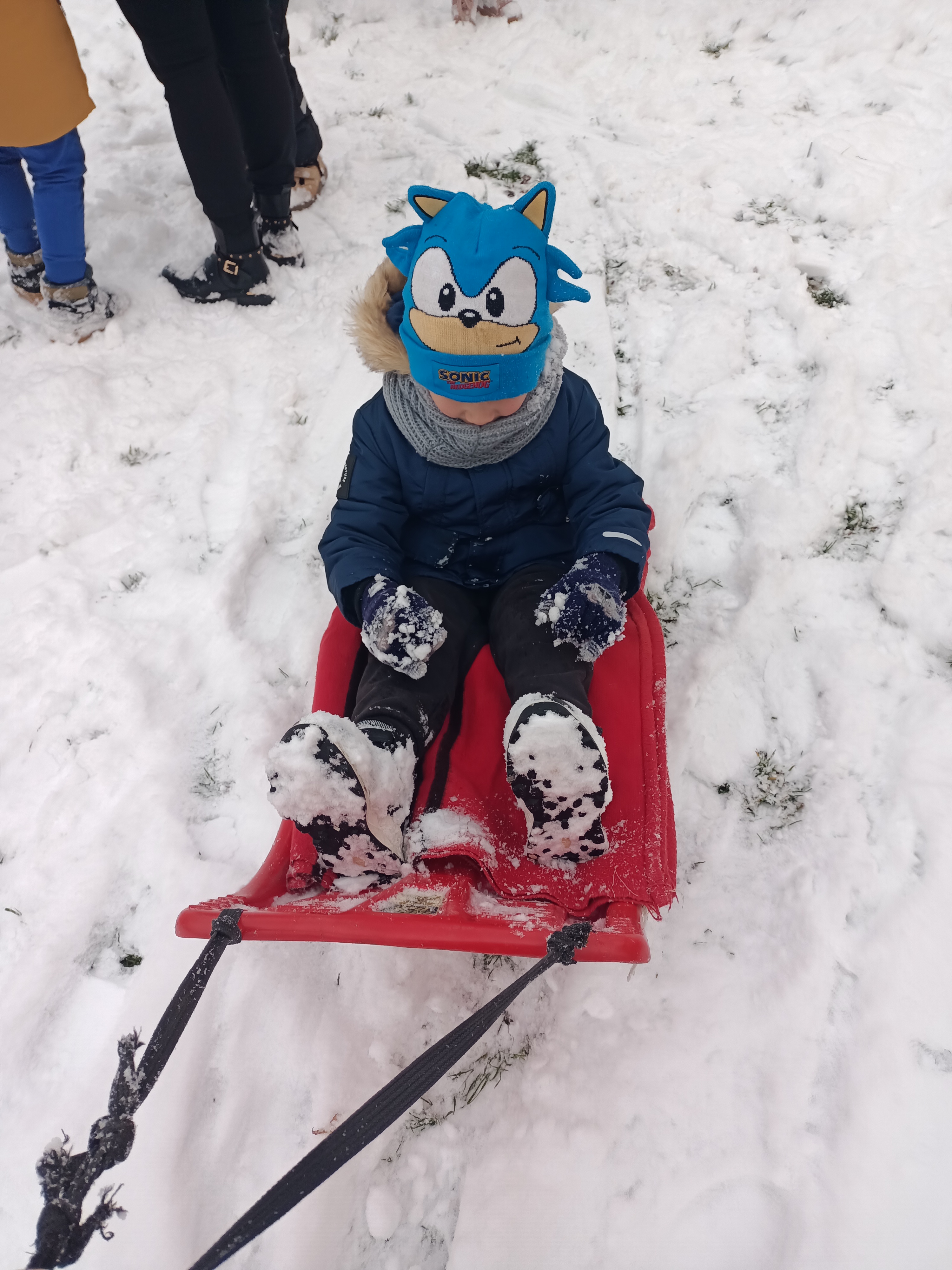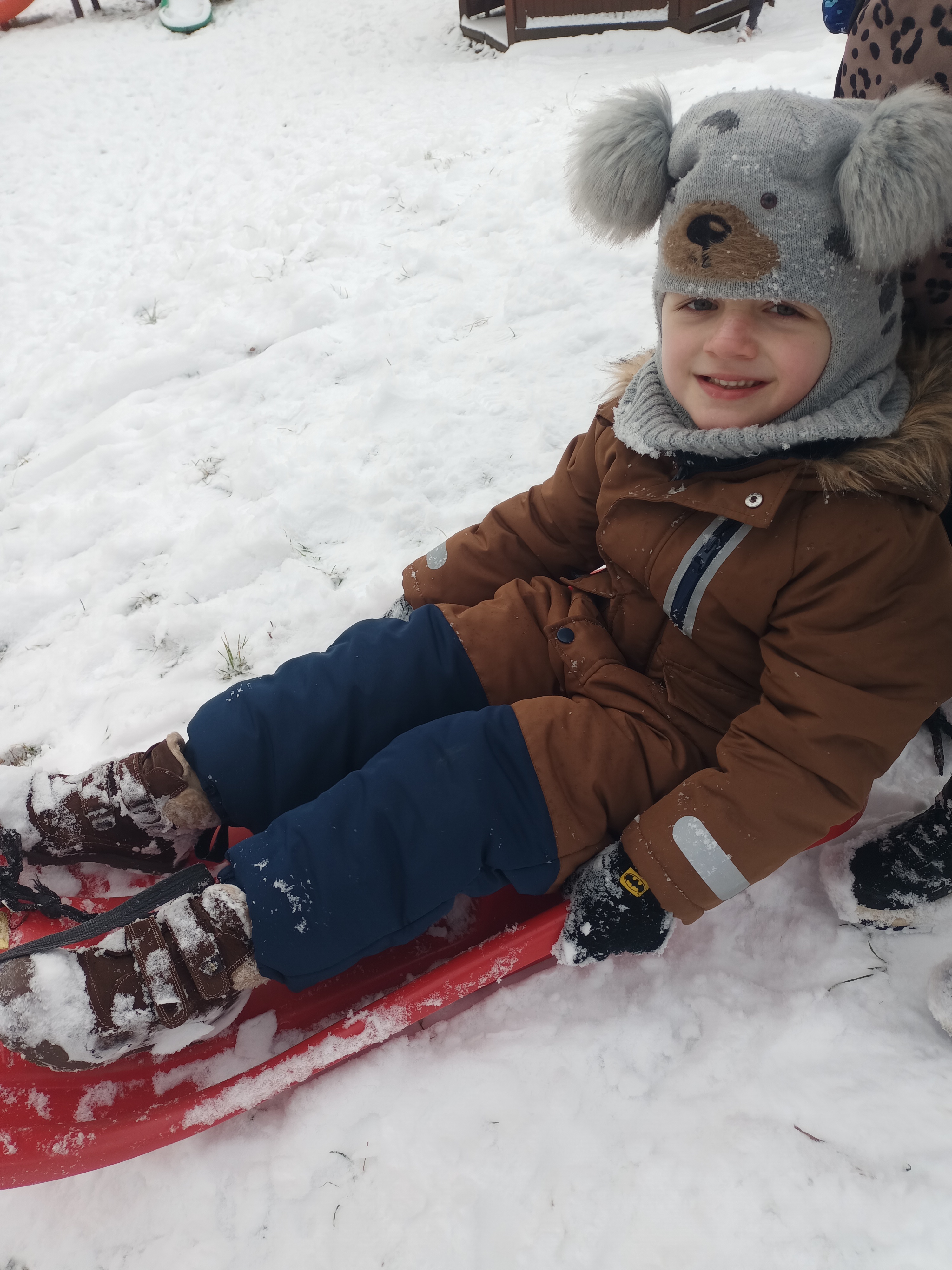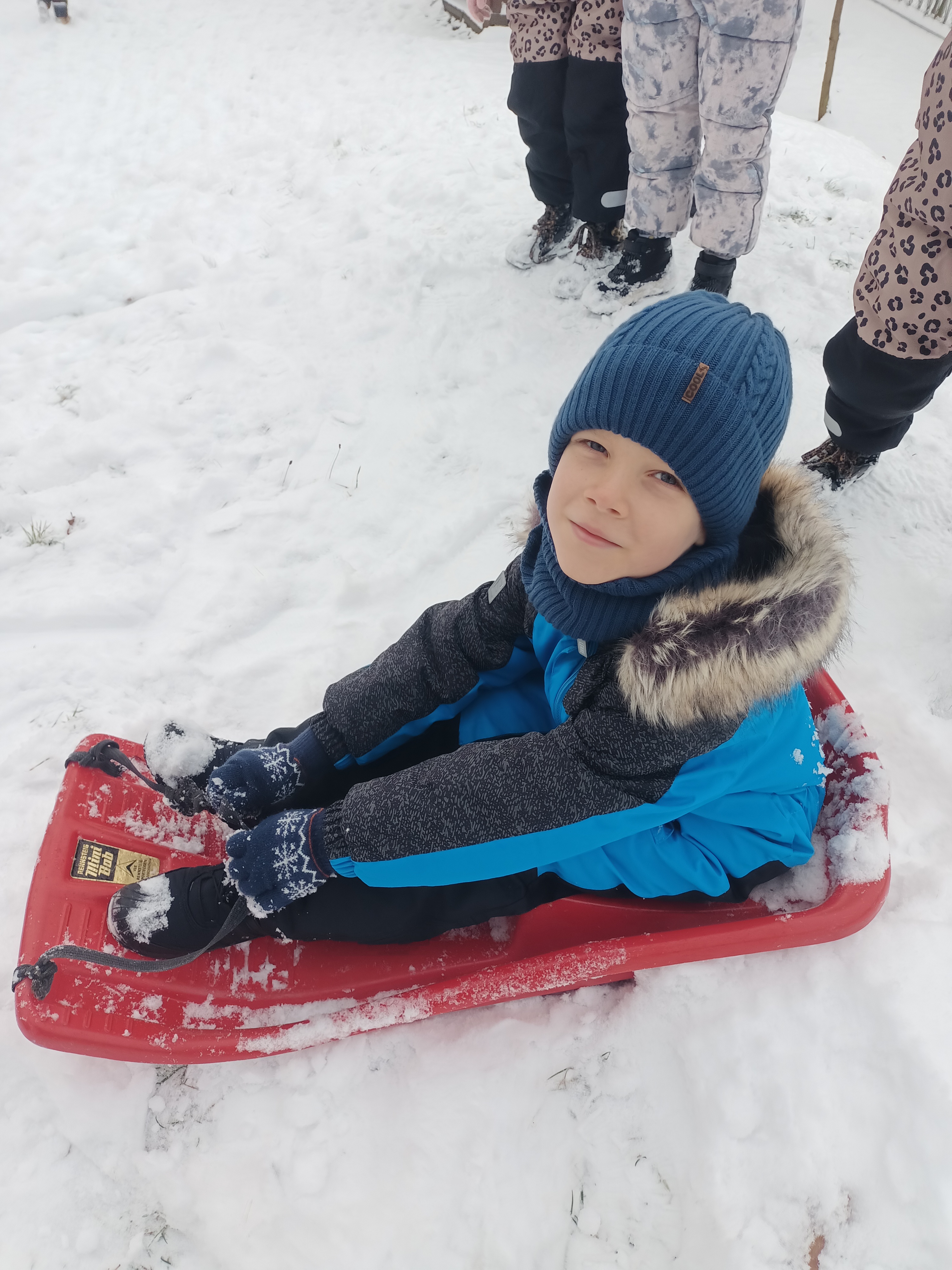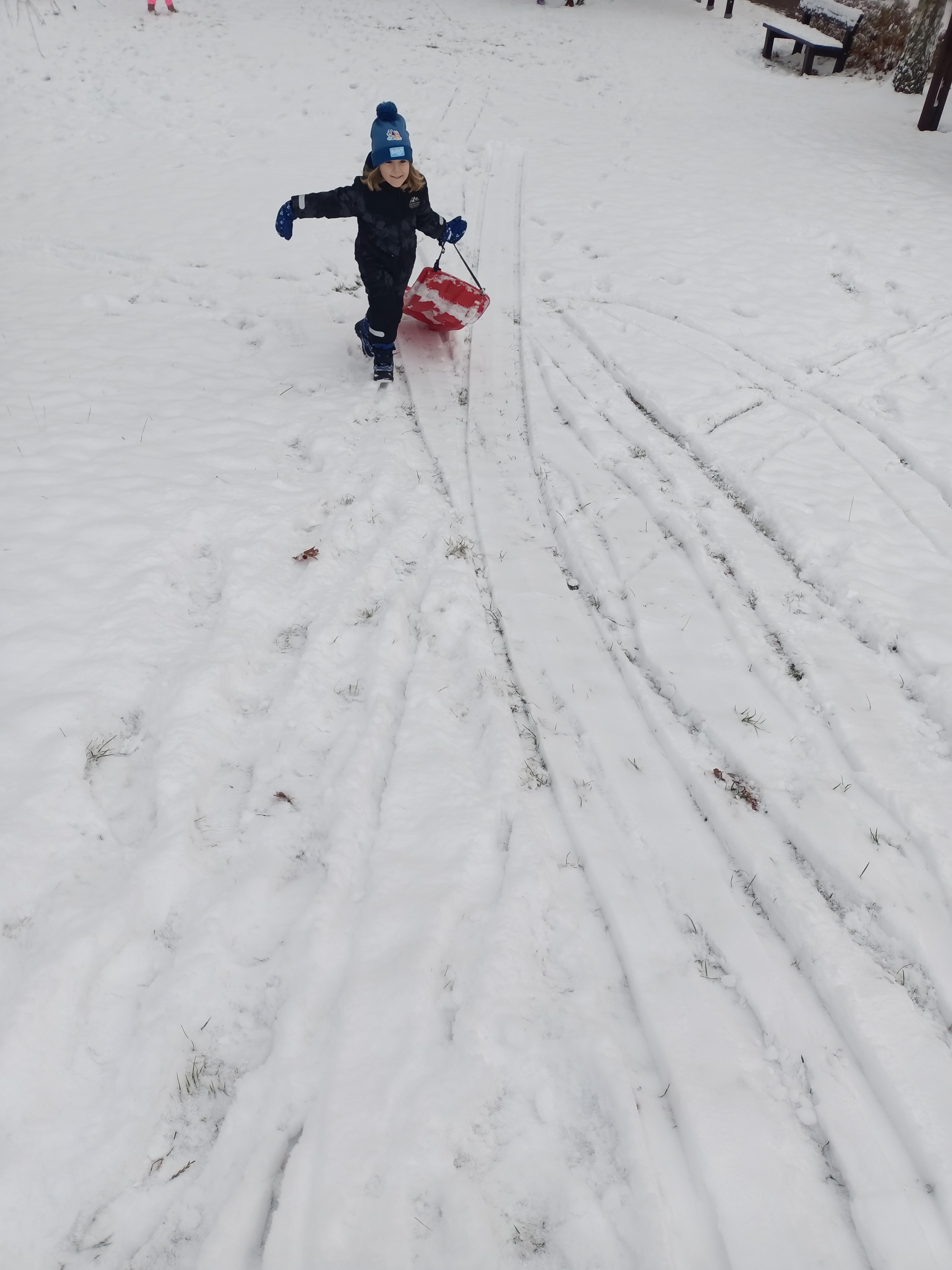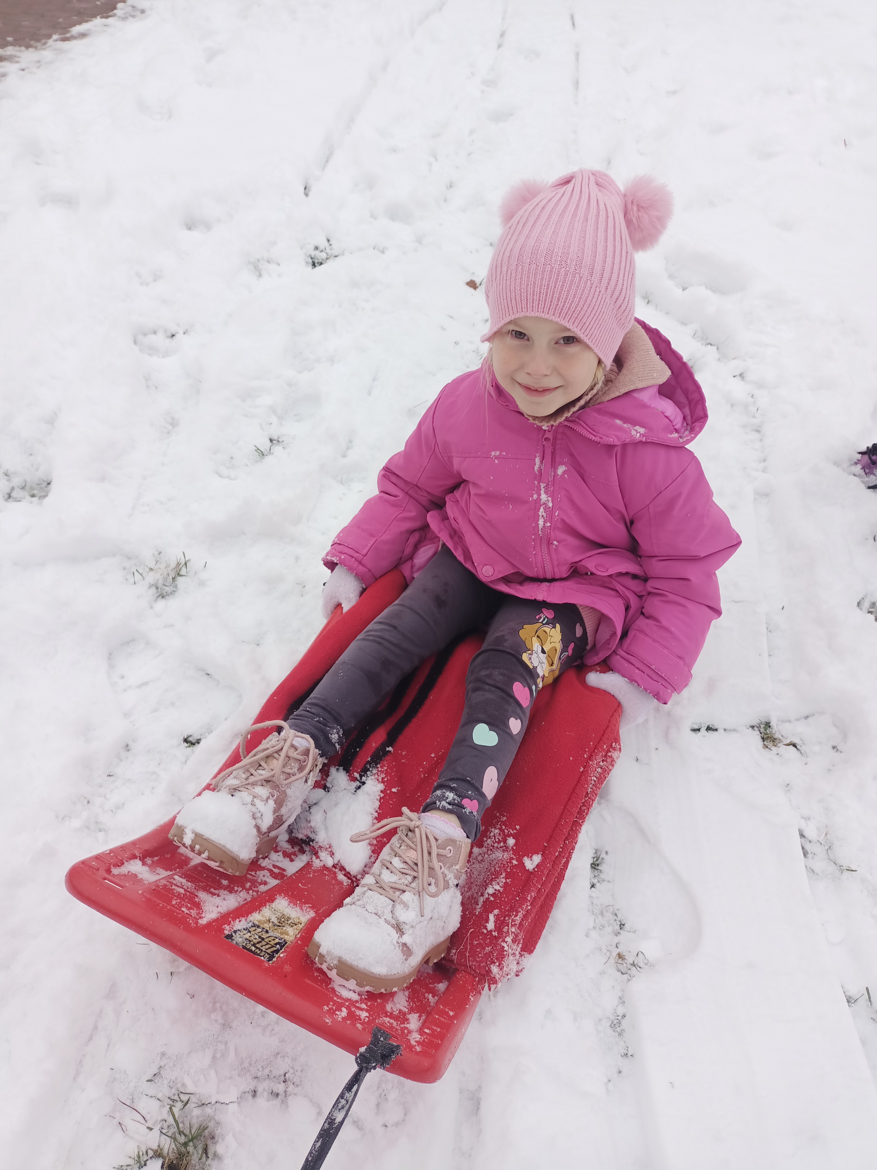 Spadł pierwszy śnieg, a dzieci od rana z wielką ekscytacją dopytywały, kiedy wyjdziemy na nasze przedszkolne podwórko. Wobec tak ogromnej radości nie można było pozostać obojętnym, dlatego wybraliśmy się na świeże powietrze. Dzieci z entuzjazmem wyciągnęły sanki i pełne energii ruszyły na górkę, ciesząc się pierwszym zimowym szaleństwem.