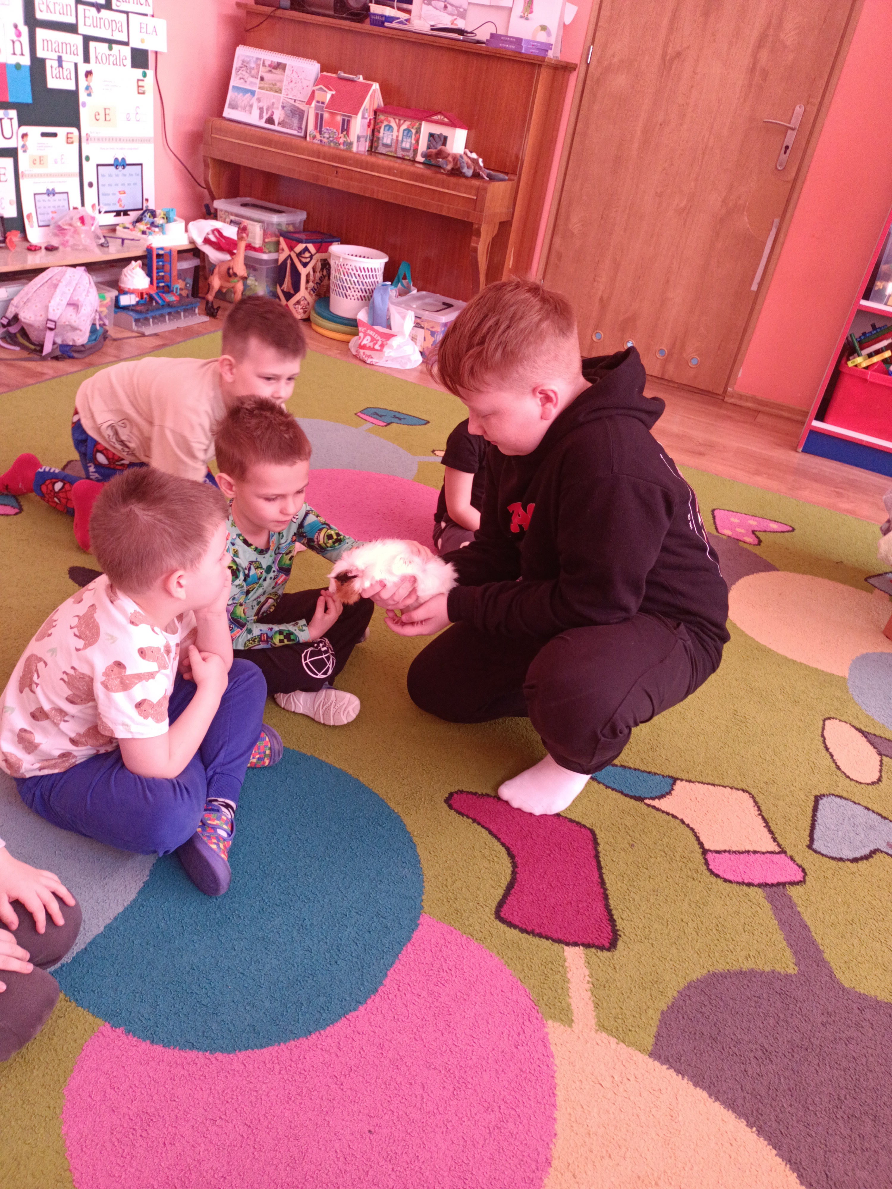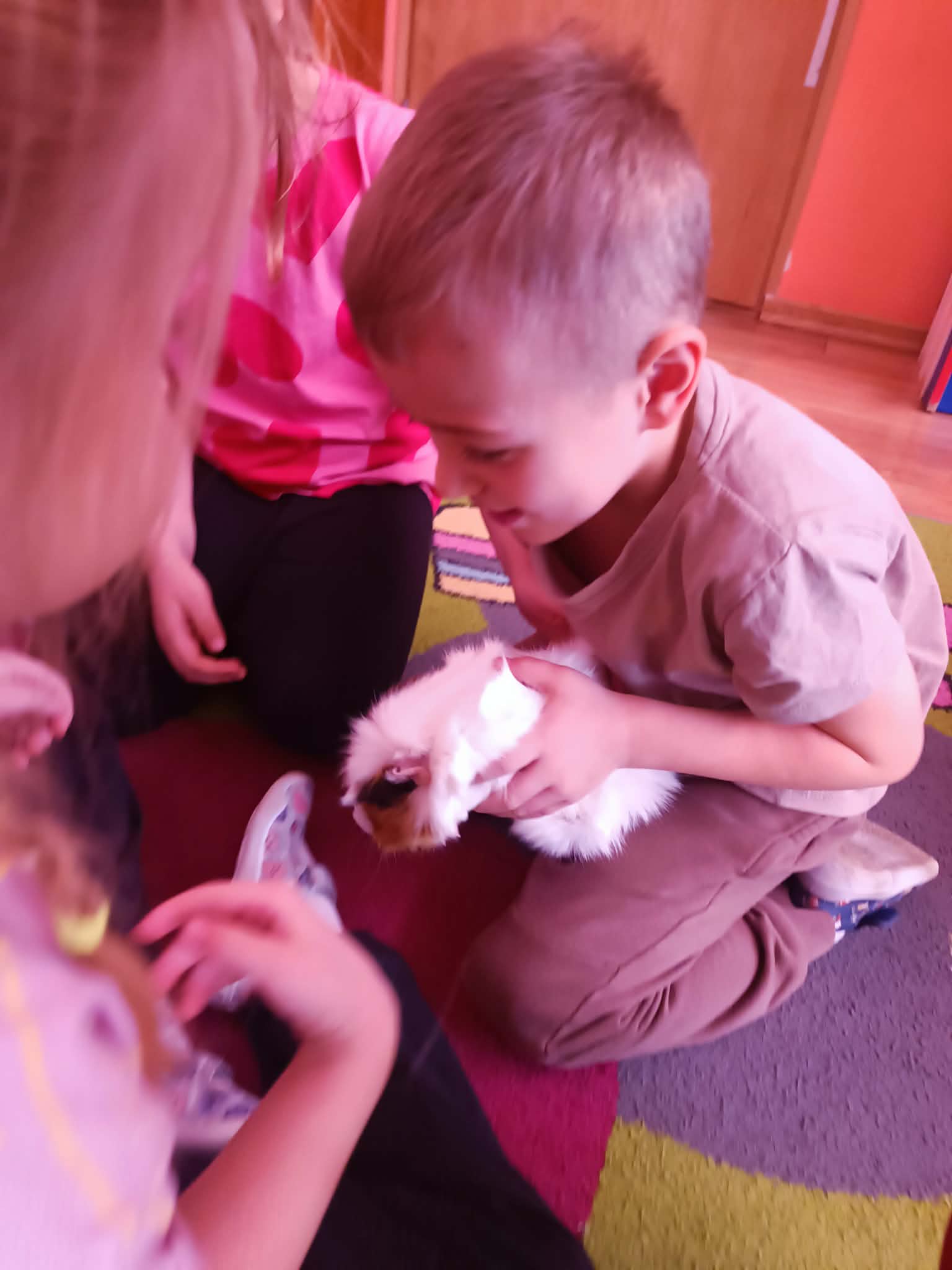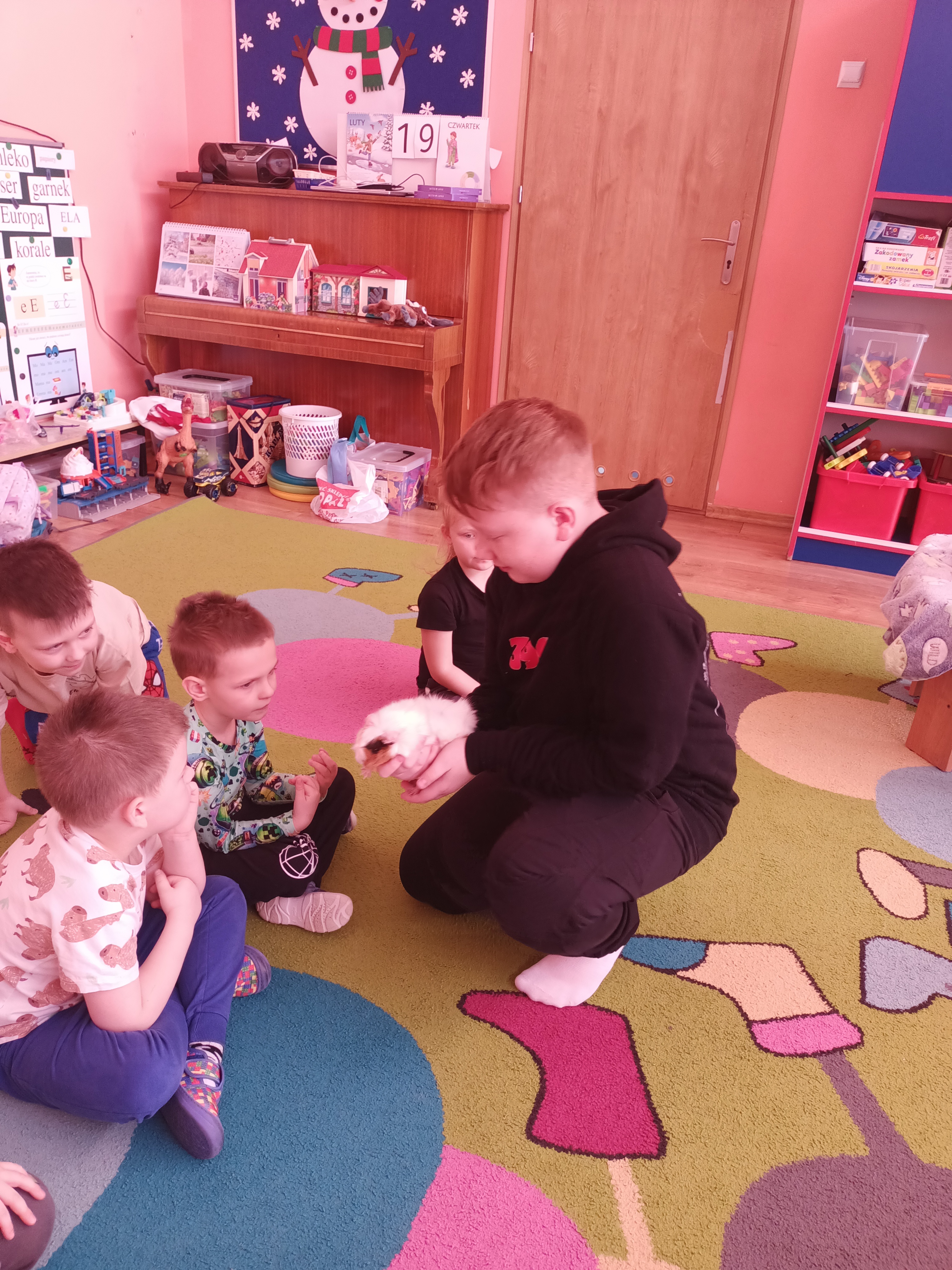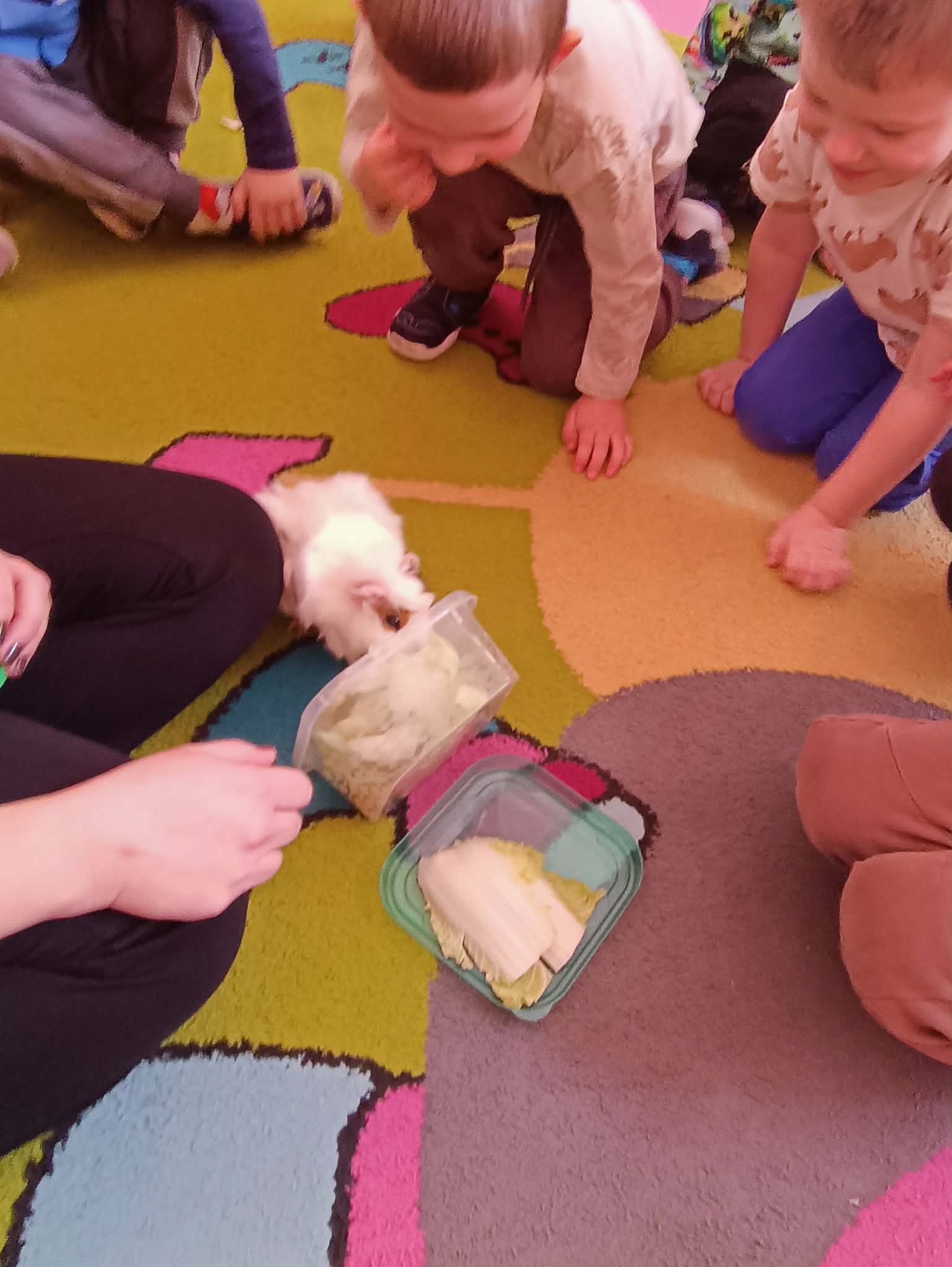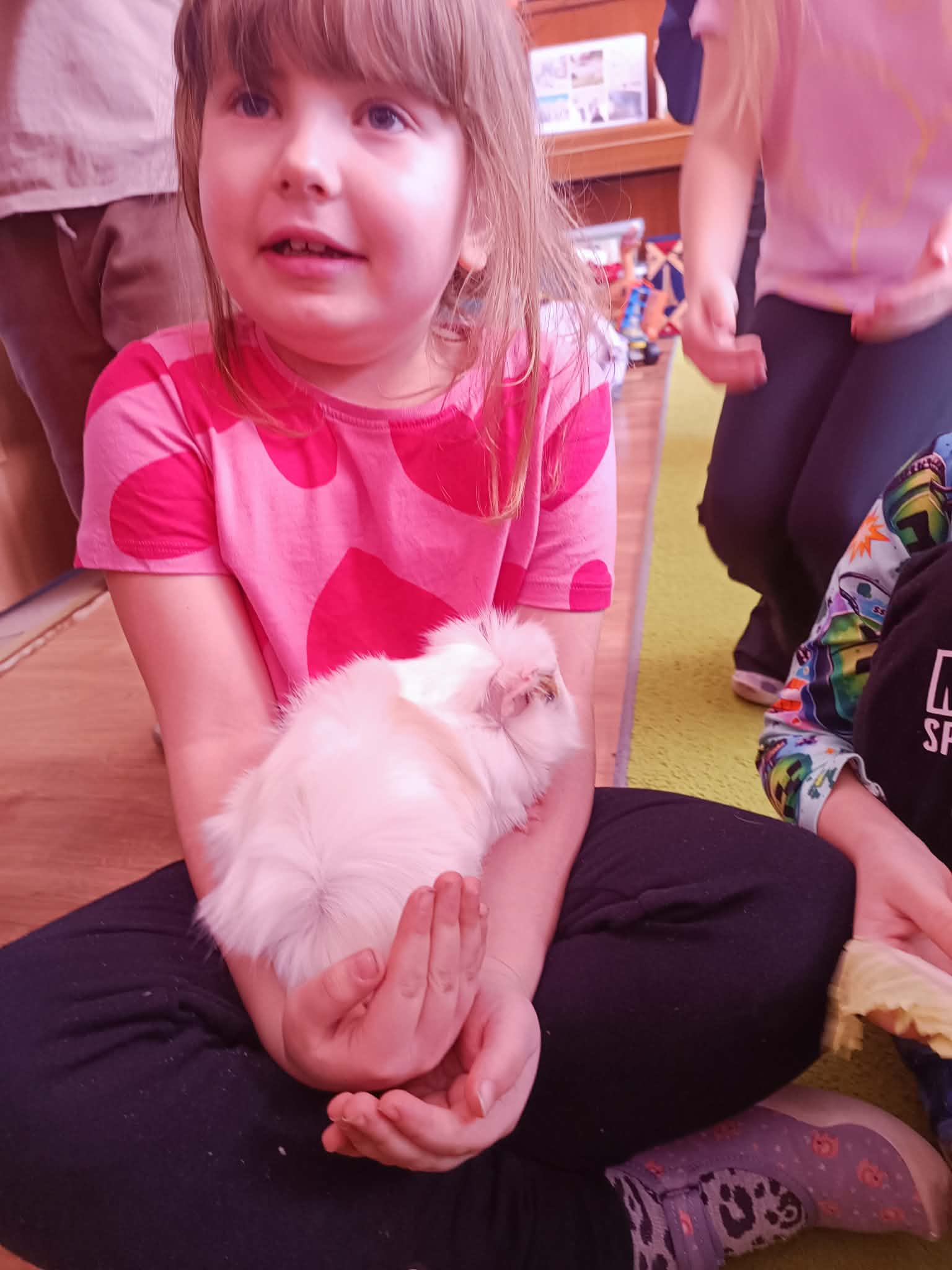 Tomek nie przyszedł sam, ponieważ towarzyszyła mu Pyza – świnka morska. Chłopcy opowiedzieli nam, co Pyza lubi robić i jeść oraz kiedy się kąpie. Dowiedzieliśmy się, jak należy opiekować się świnką morską i czego potrzebuje, aby być zdrową i szczęśliwą.