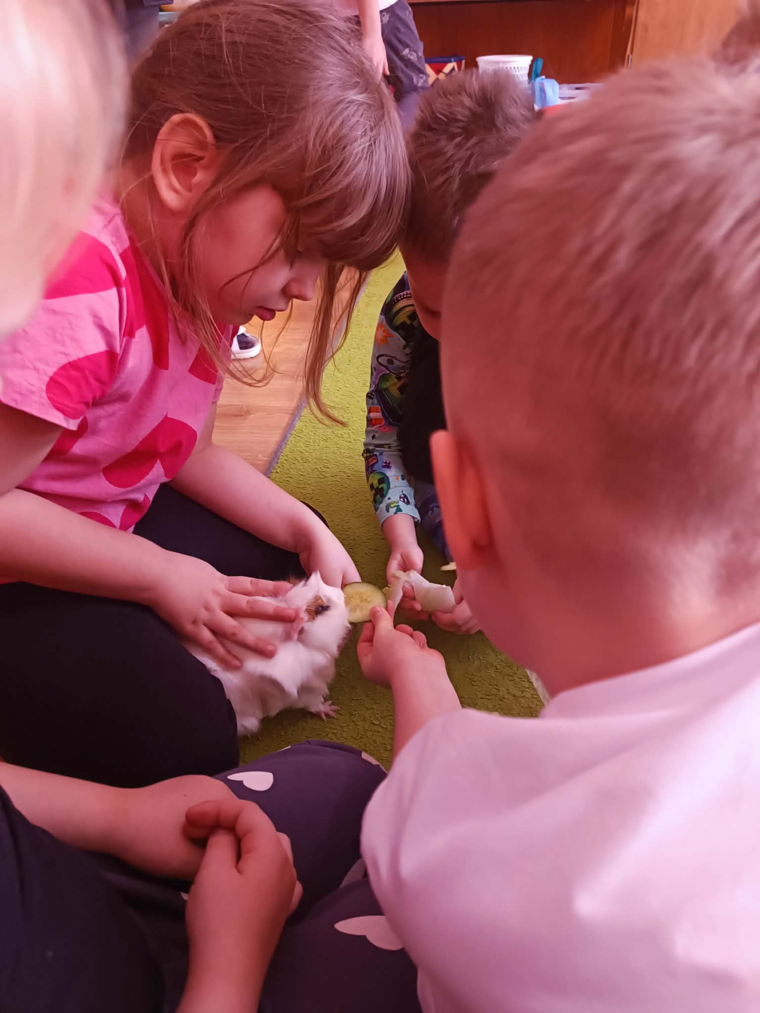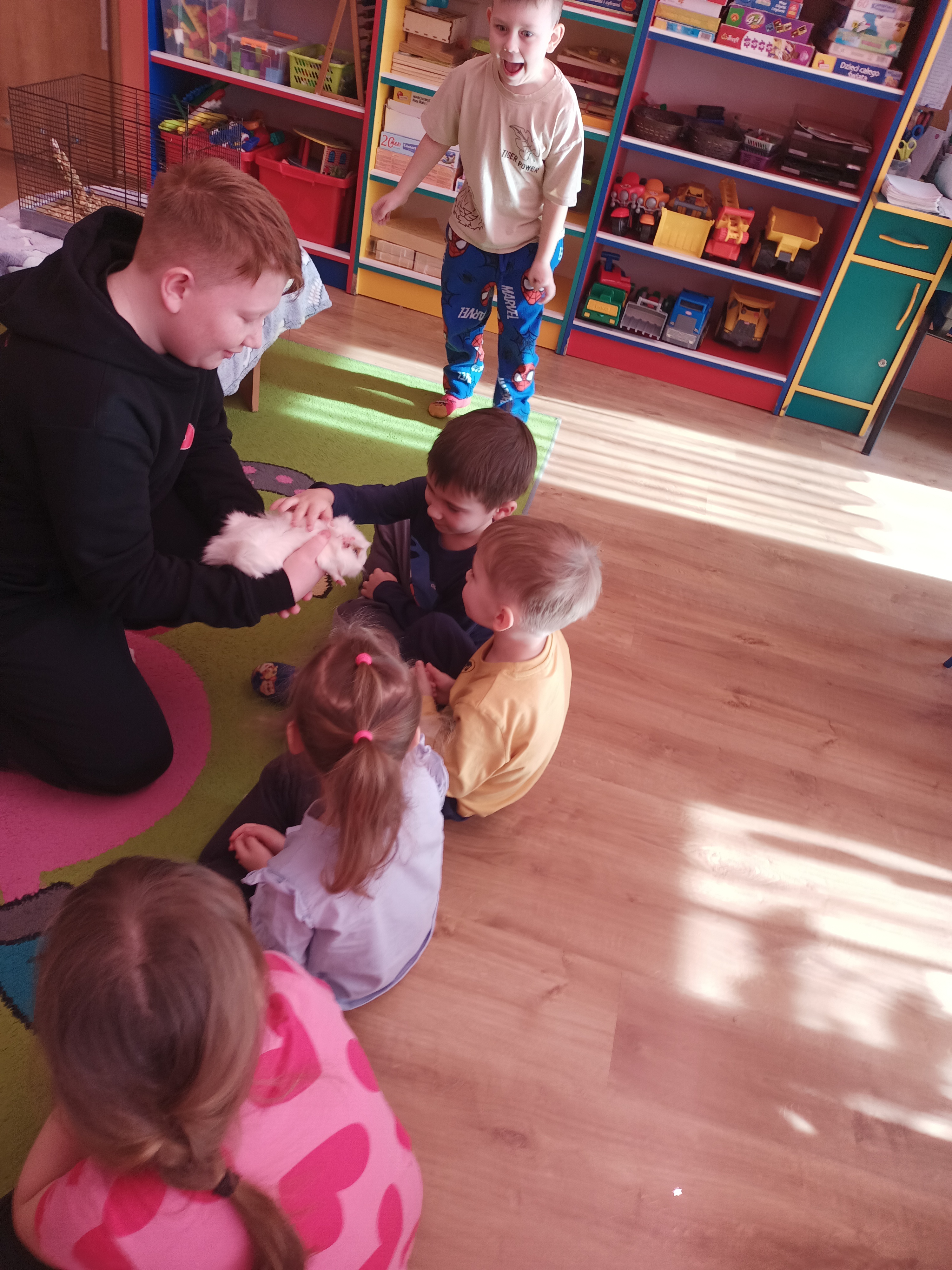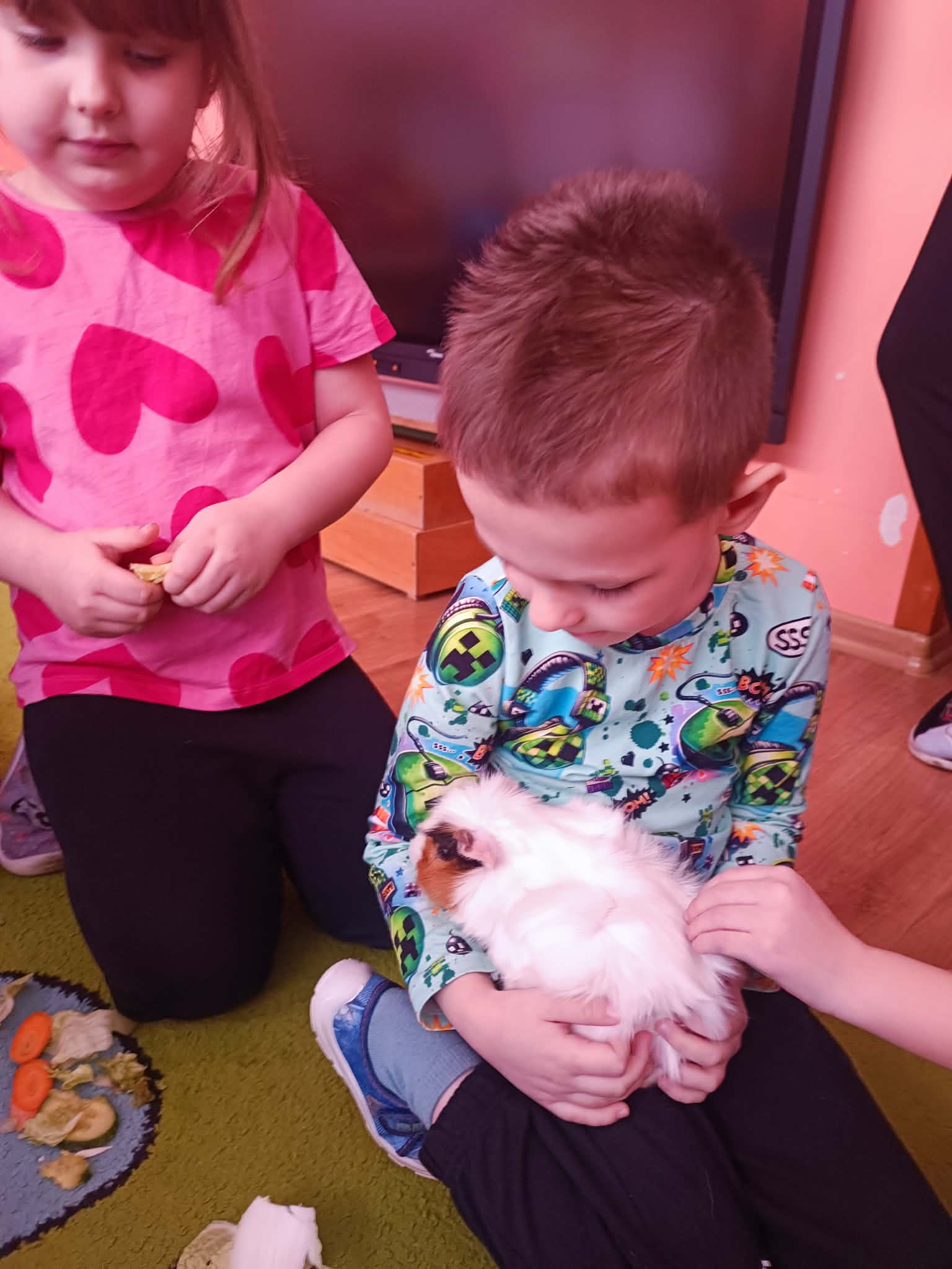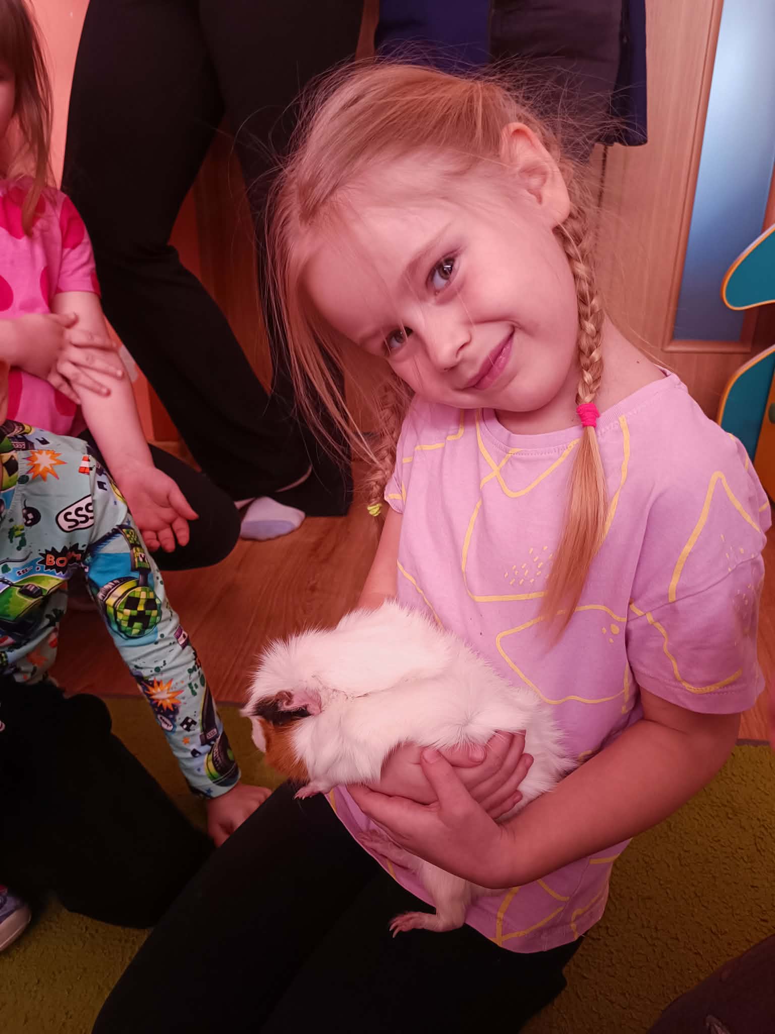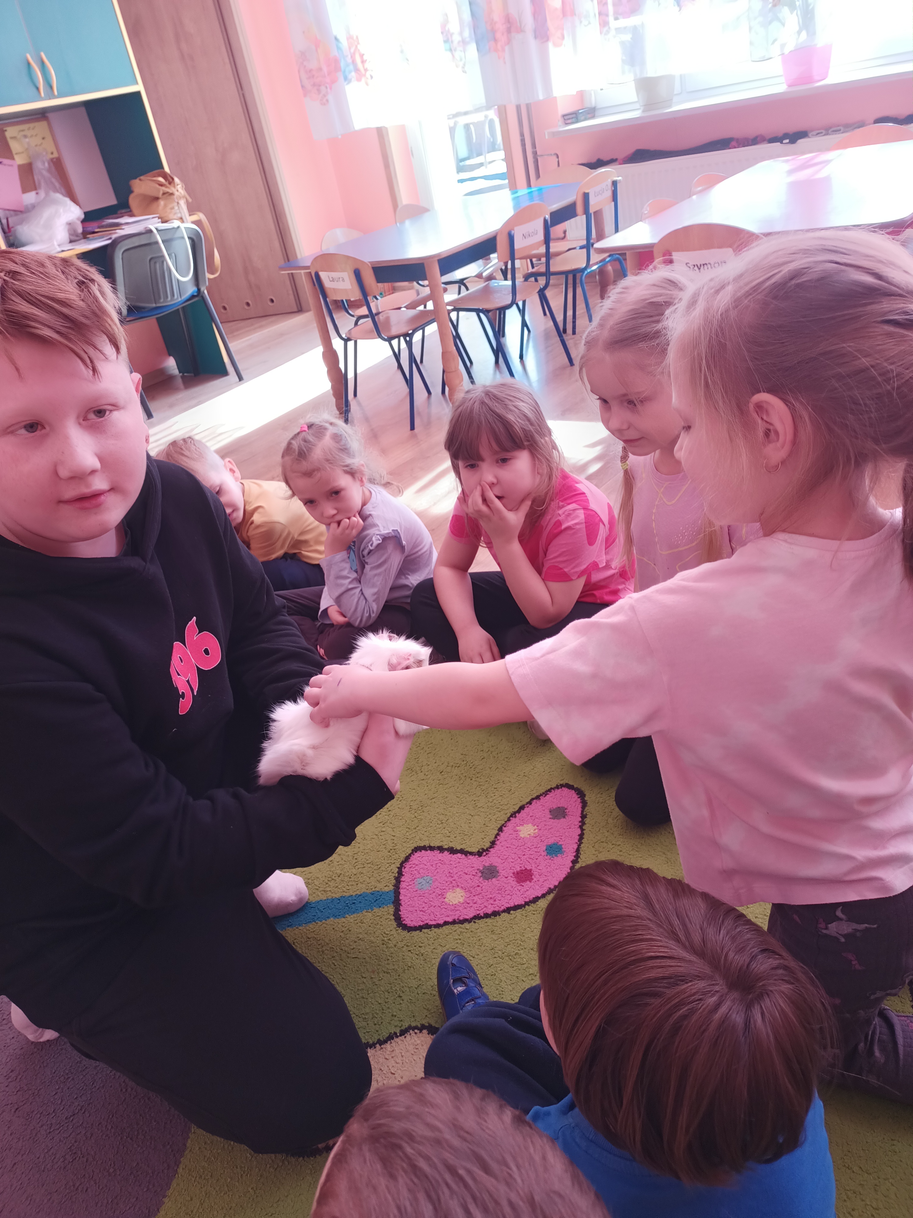 Tomek nie przyszedł sam, ponieważ towarzyszyła mu Pyza – świnka morska. Chłopcy opowiedzieli nam, co Pyza lubi robić i jeść oraz kiedy się kąpie. Dowiedzieliśmy się, jak należy opiekować się świnką morską i czego potrzebuje, aby być zdrową i szczęśliwą.