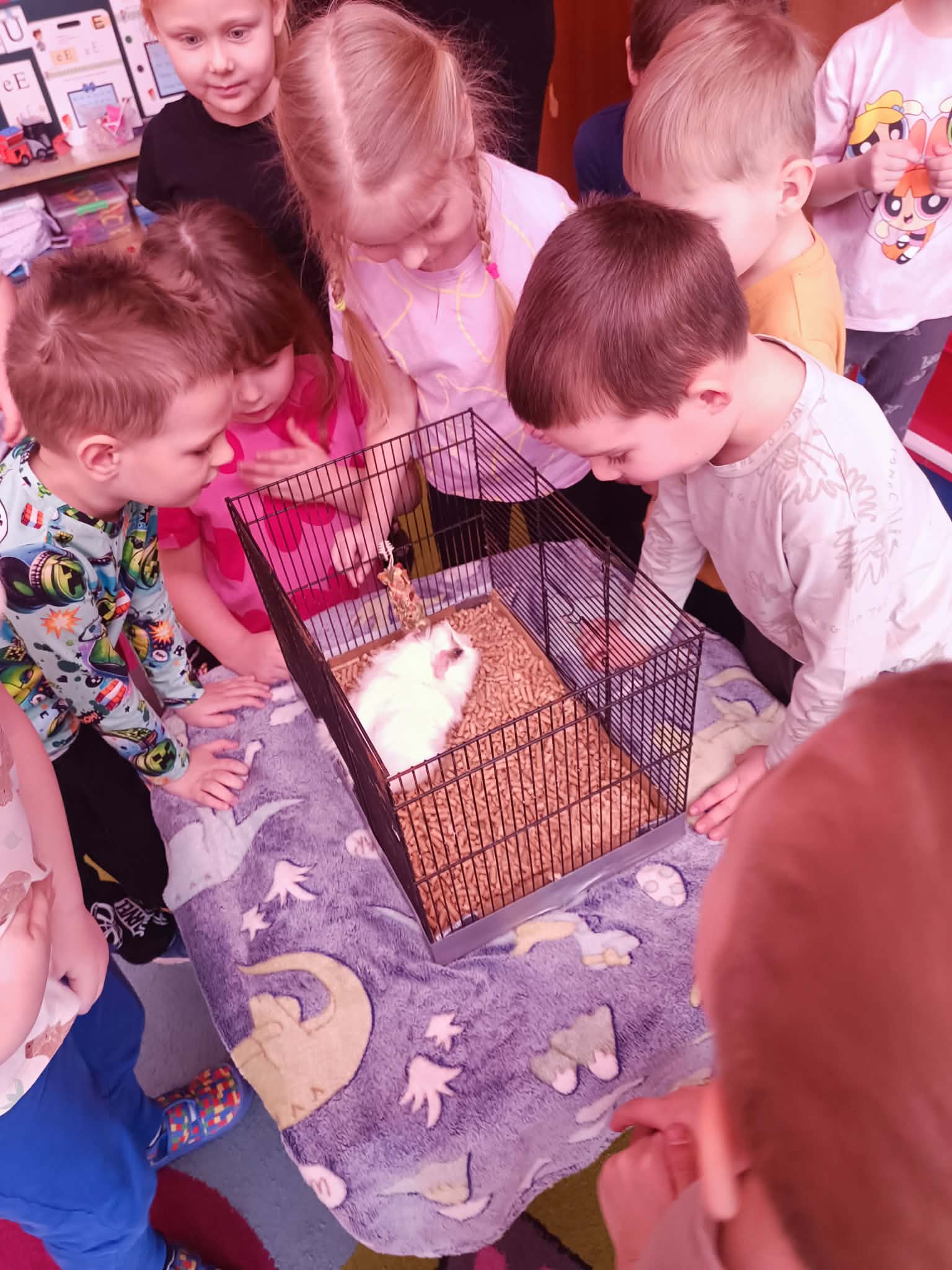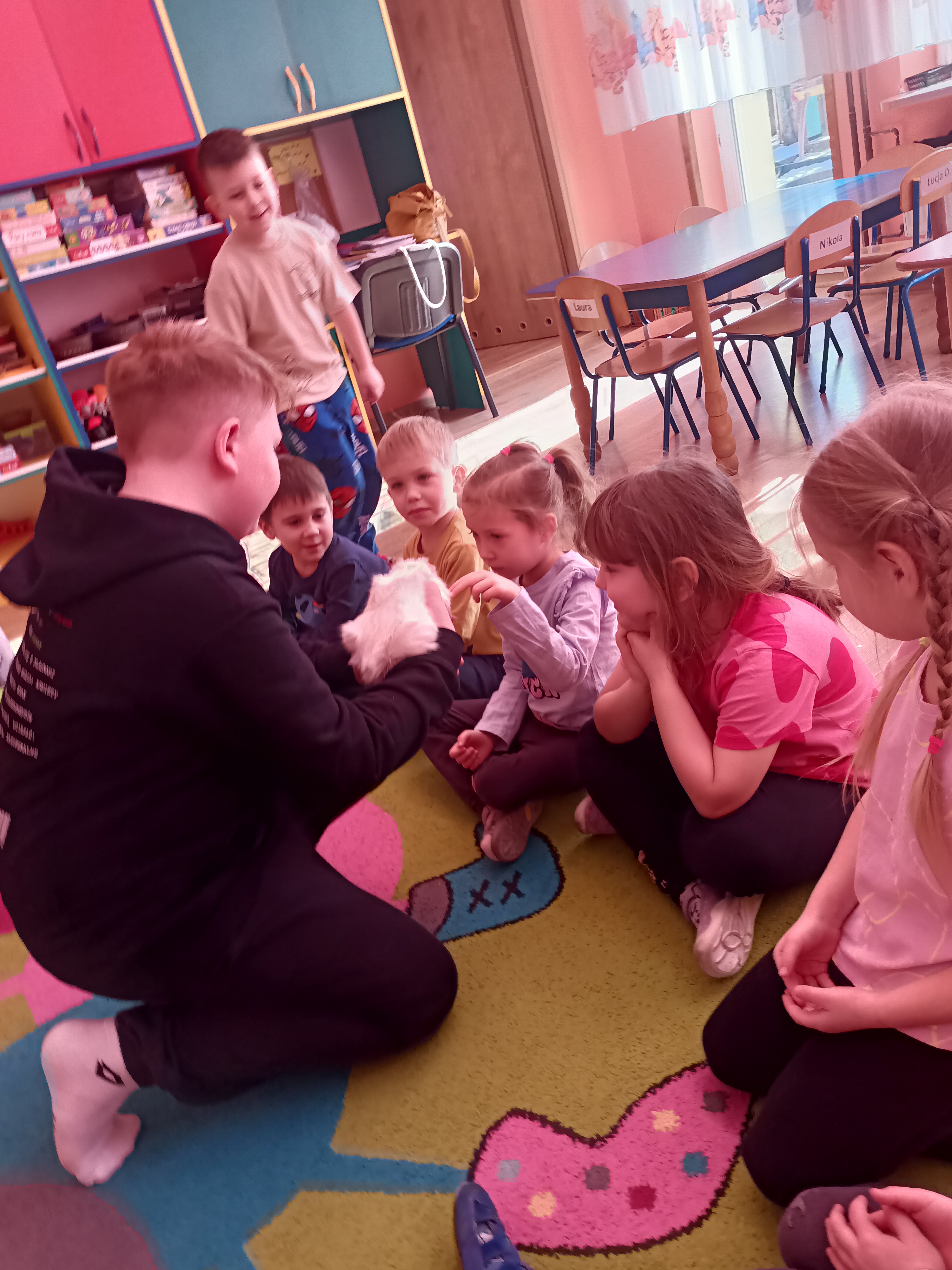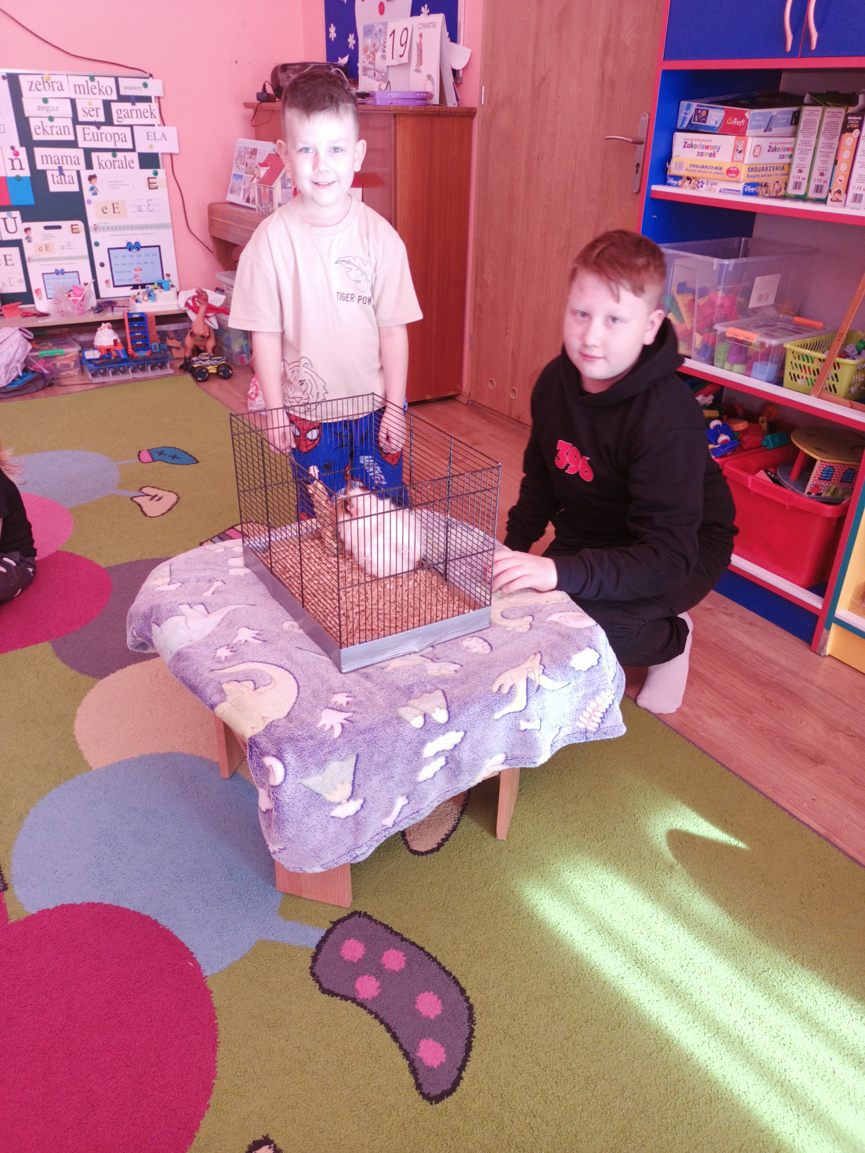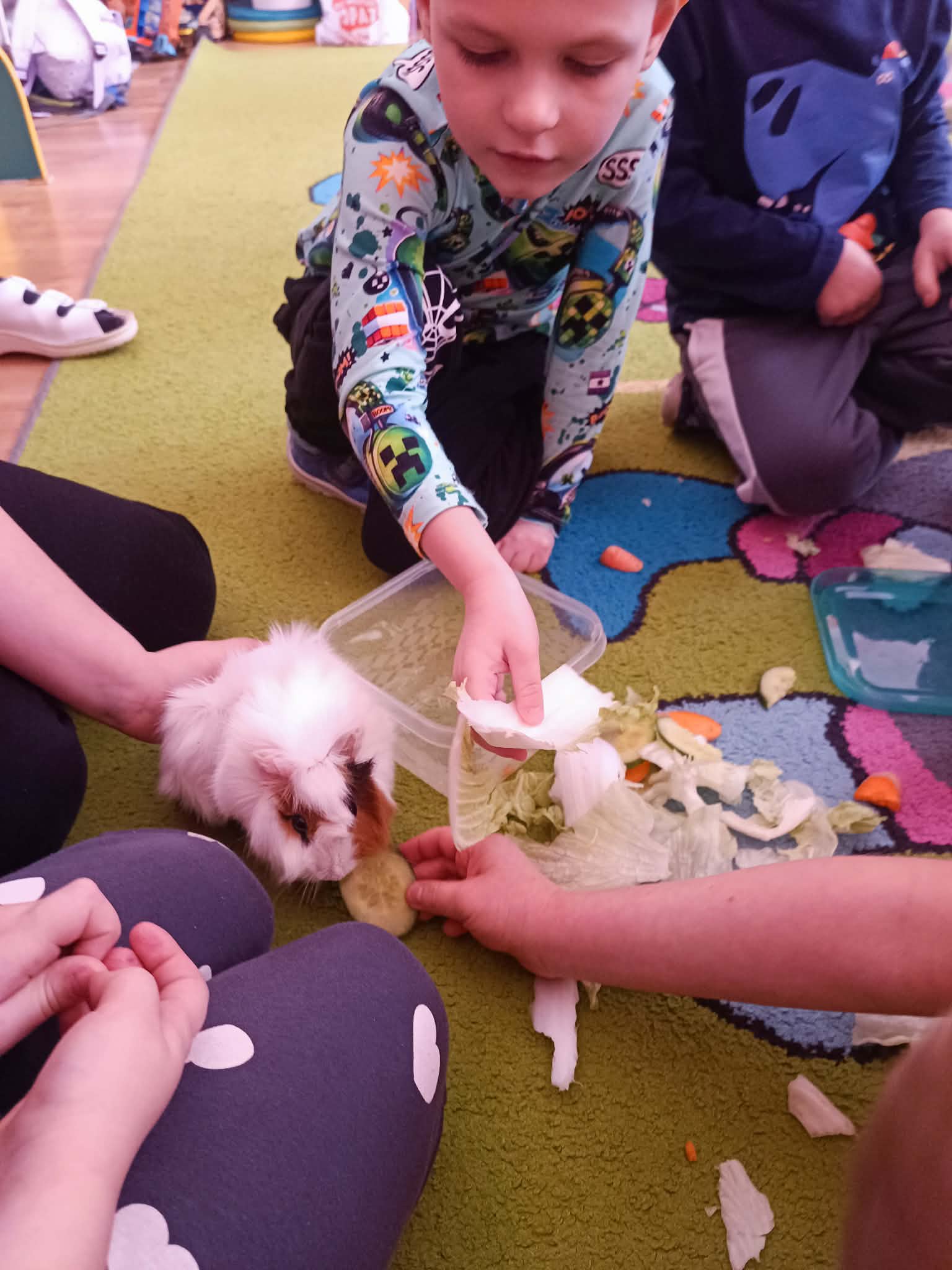 Tomek nie przyszedł sam, ponieważ towarzyszyła mu Pyza – świnka morska. Chłopcy opowiedzieli nam, co Pyza lubi robić i jeść oraz kiedy się kąpie. Dowiedzieliśmy się, jak należy opiekować się świnką morską i czego potrzebuje, aby być zdrową i szczęśliwą.