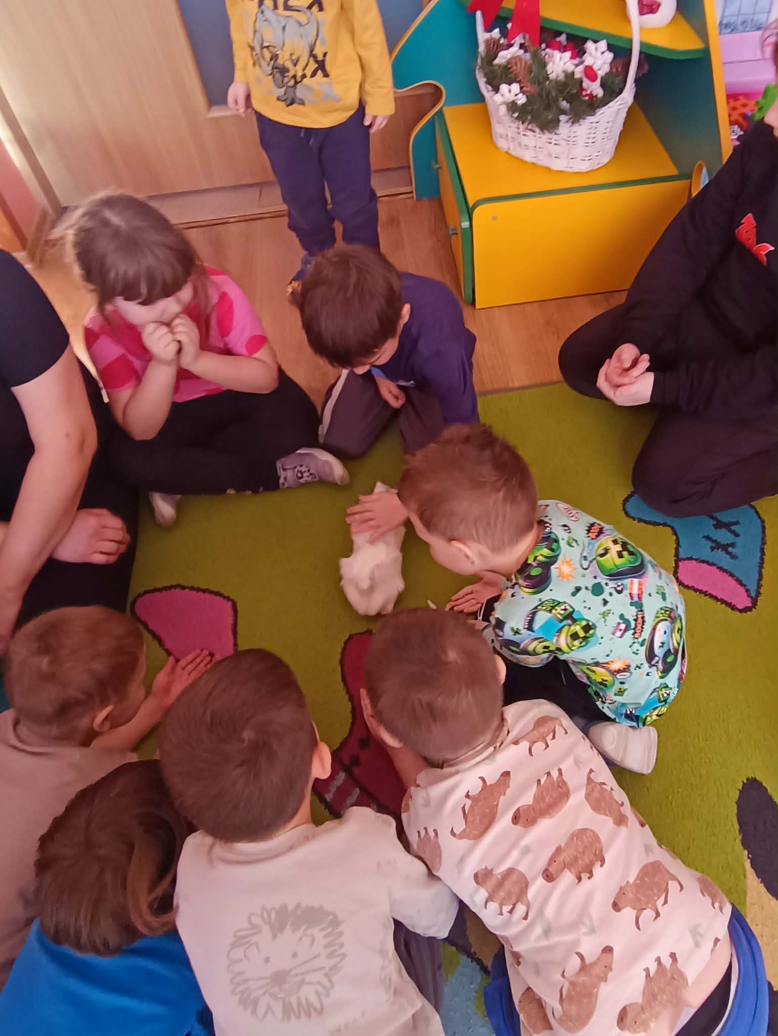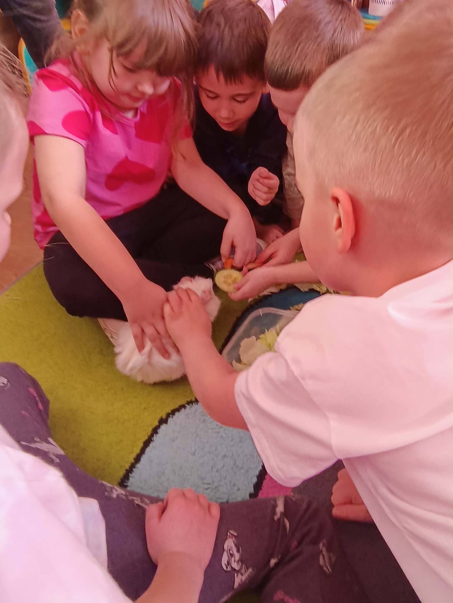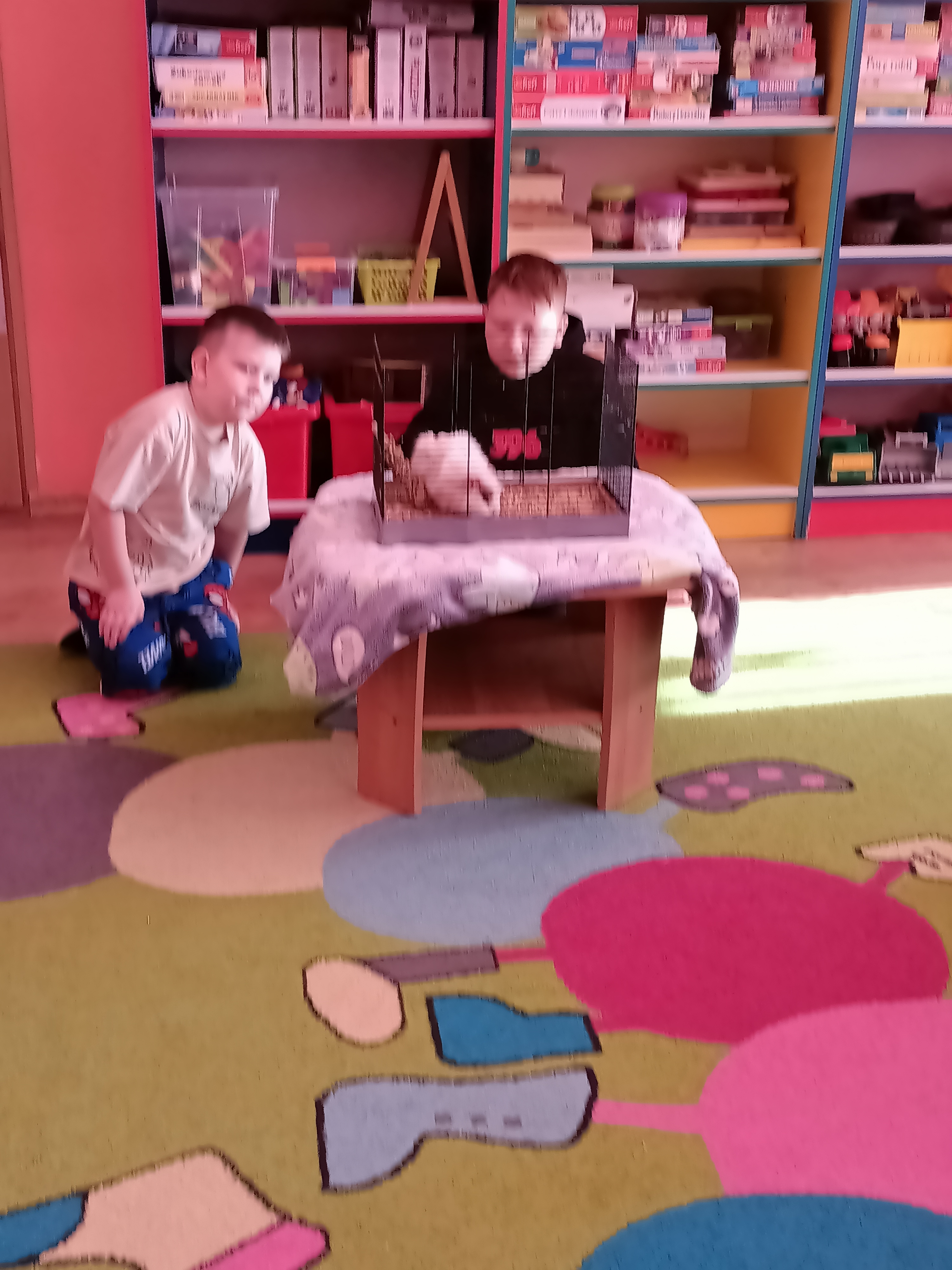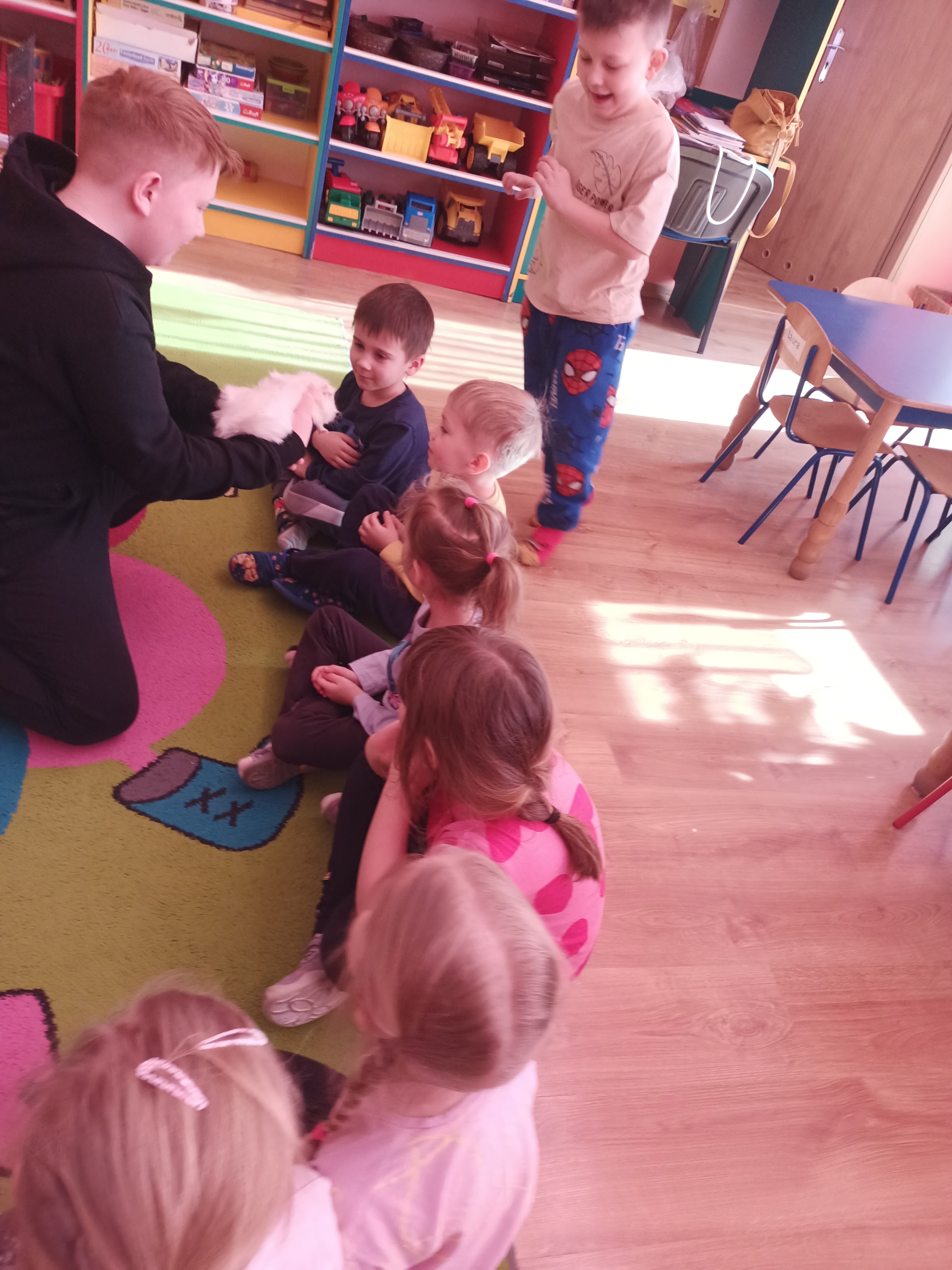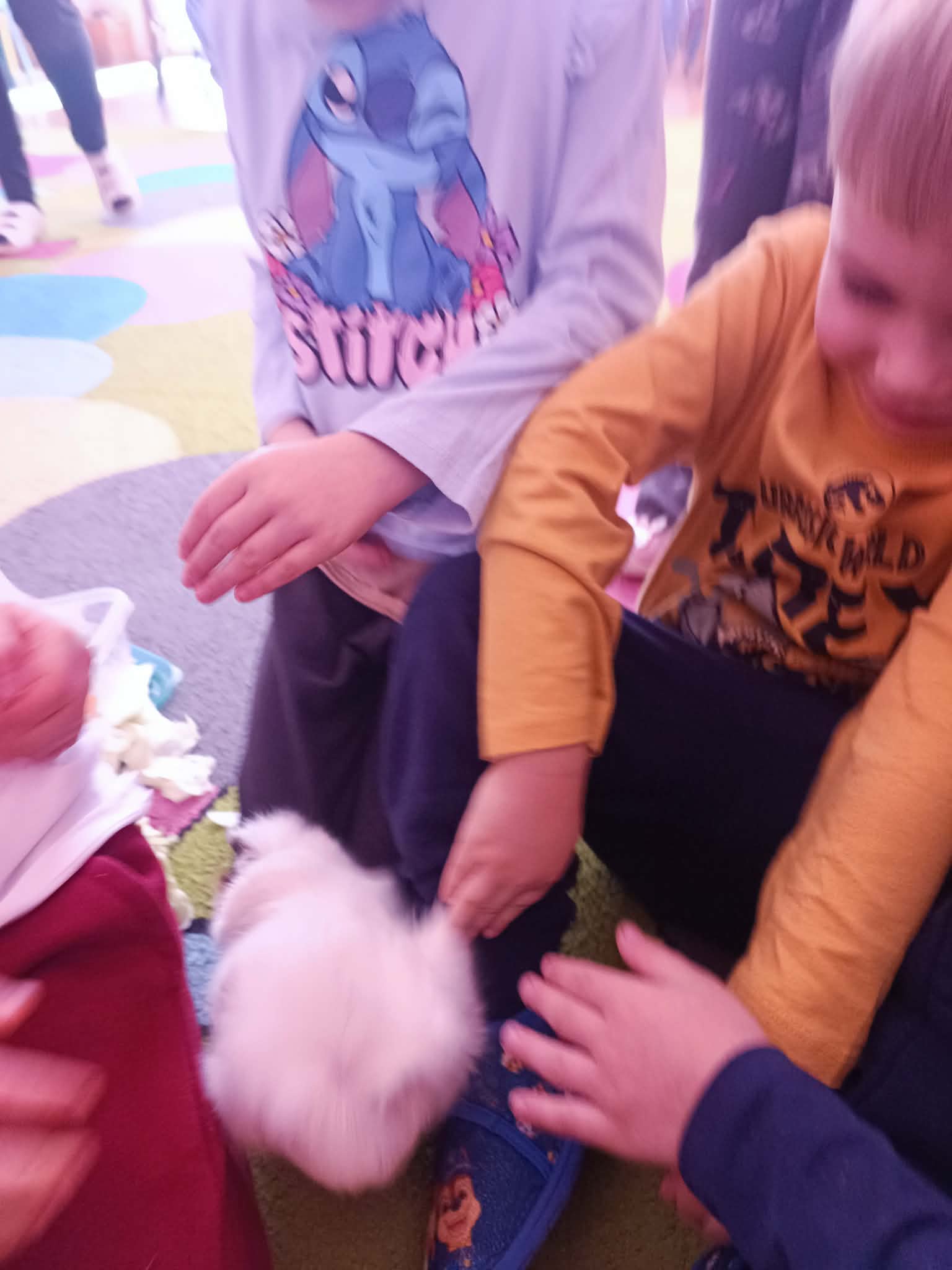 Tomek nie przyszedł sam, ponieważ towarzyszyła mu Pyza – świnka morska. Chłopcy opowiedzieli nam, co Pyza lubi robić i jeść oraz kiedy się kąpie. Dowiedzieliśmy się, jak należy opiekować się świnką morską i czego potrzebuje, aby być zdrową i szczęśliwą.