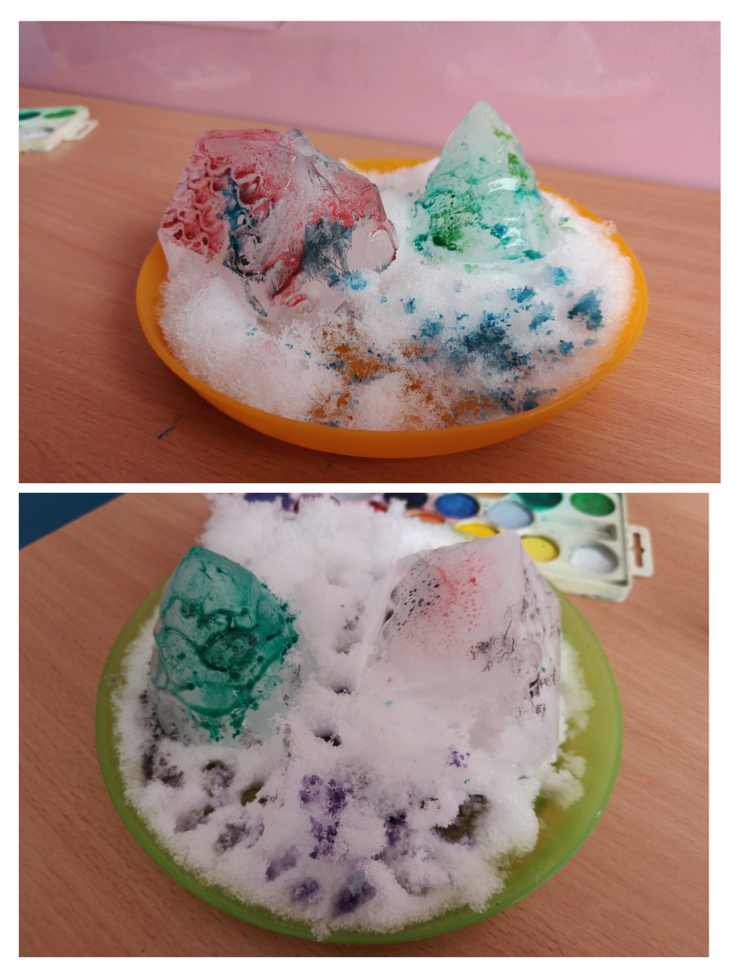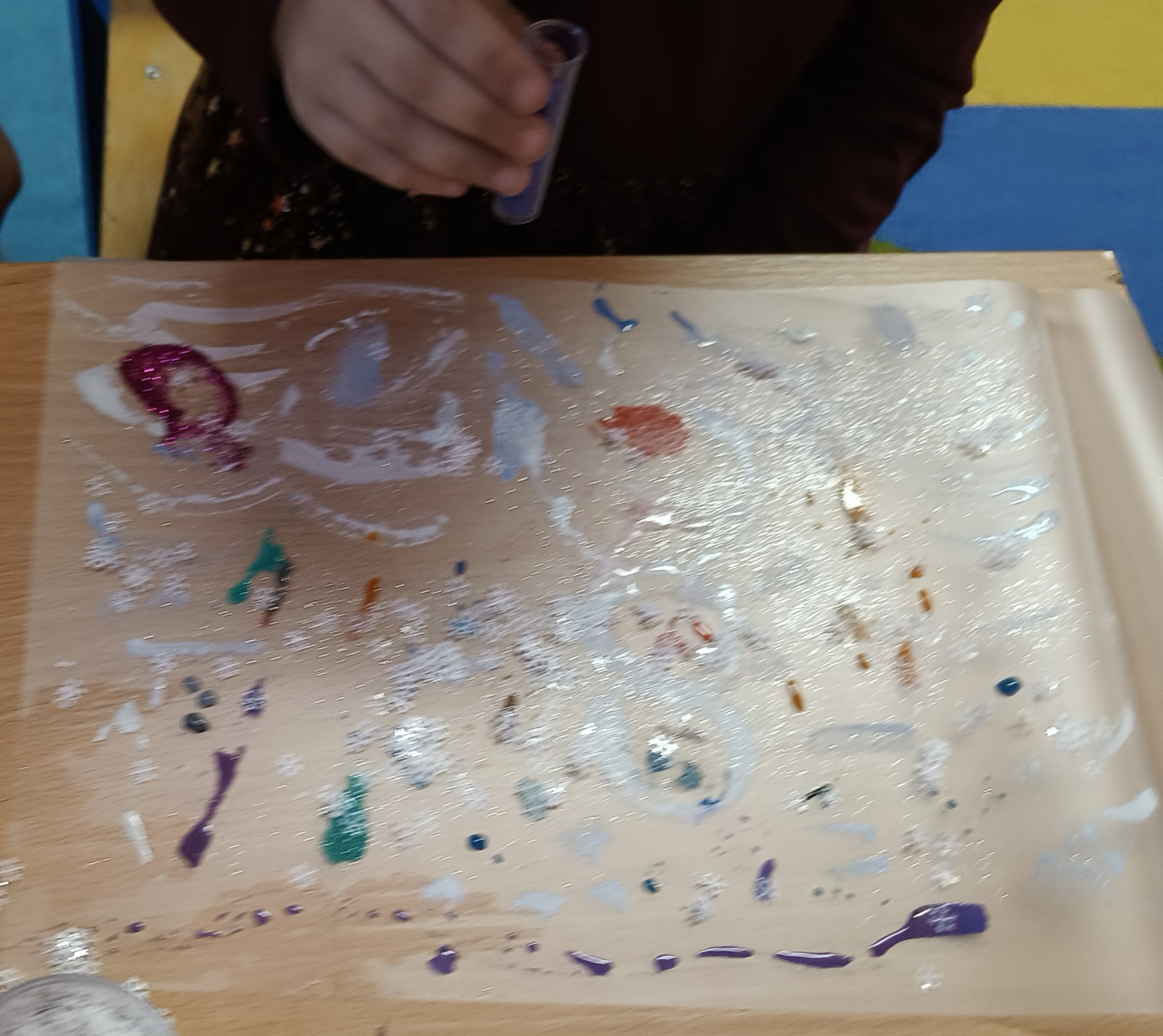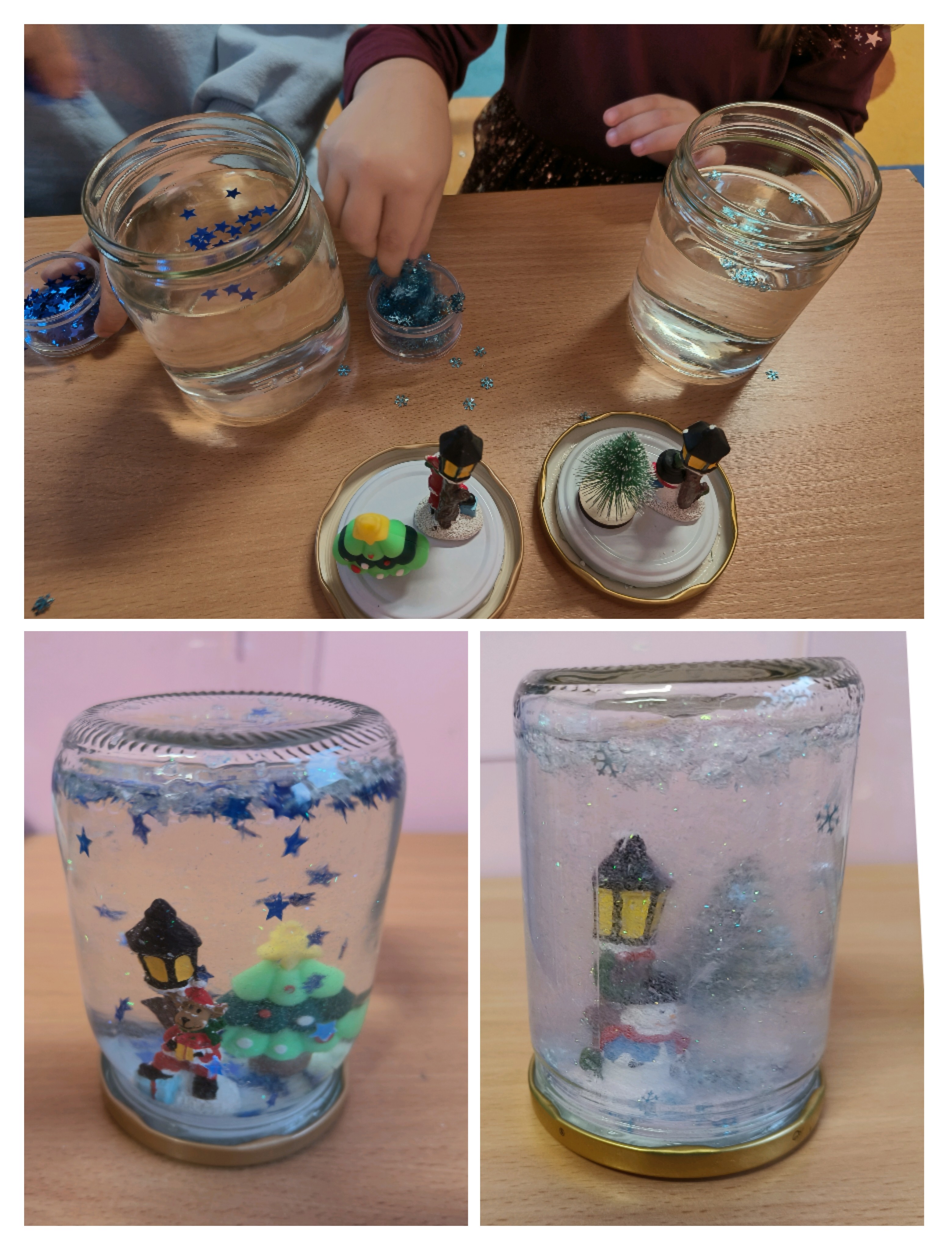 Podczas zajęć przedszkolaki wykonały śnieżne kule w słoiku, rozwijając kreatywność i sprawność manualną. Tworzyły również zimowe lampiony, eksperymentując z kolorami i światłem, a także malowały lodowe figury rozwijając zmysł dotyku poprzez bezpośredni kontakt z lodem.