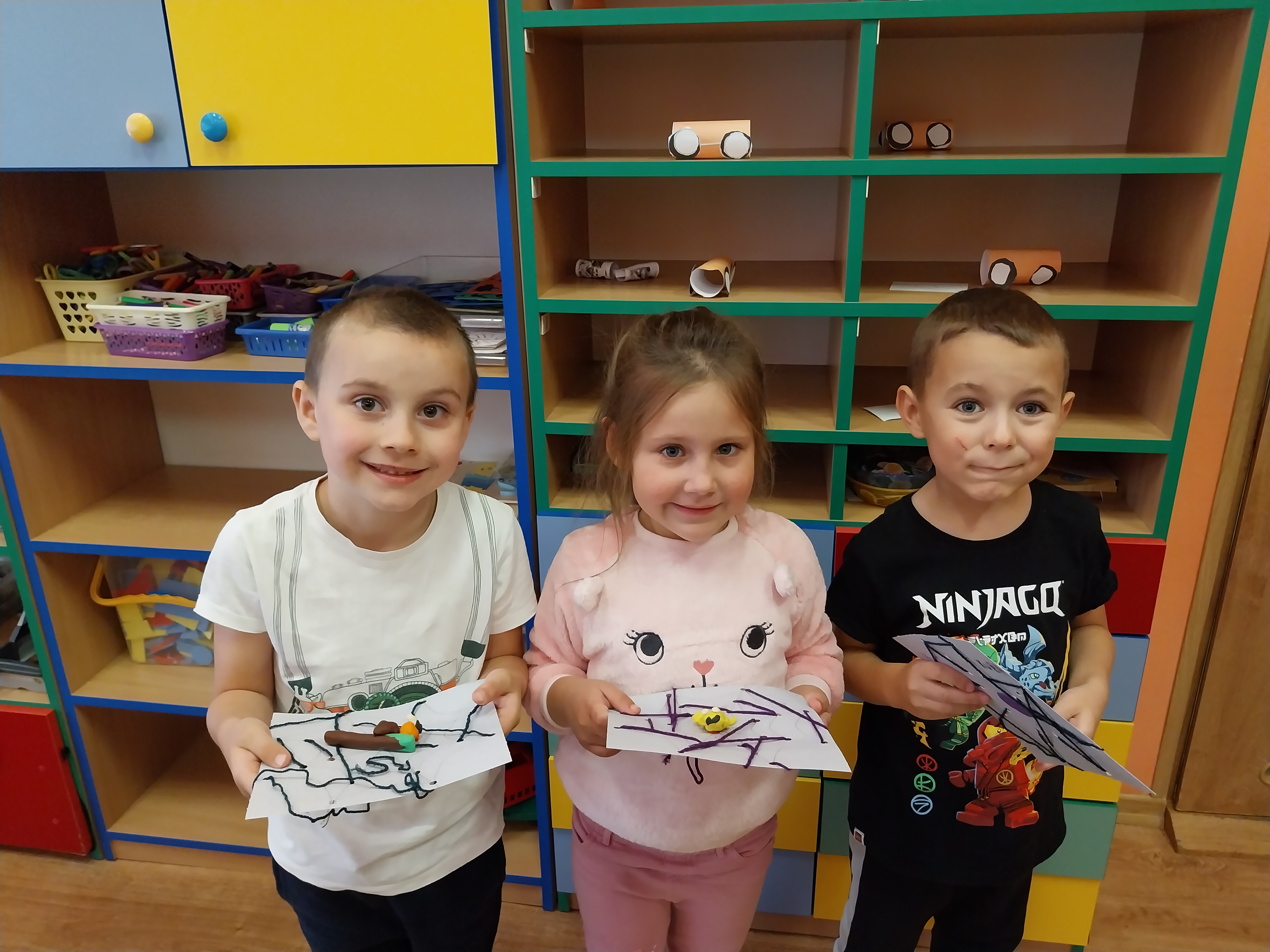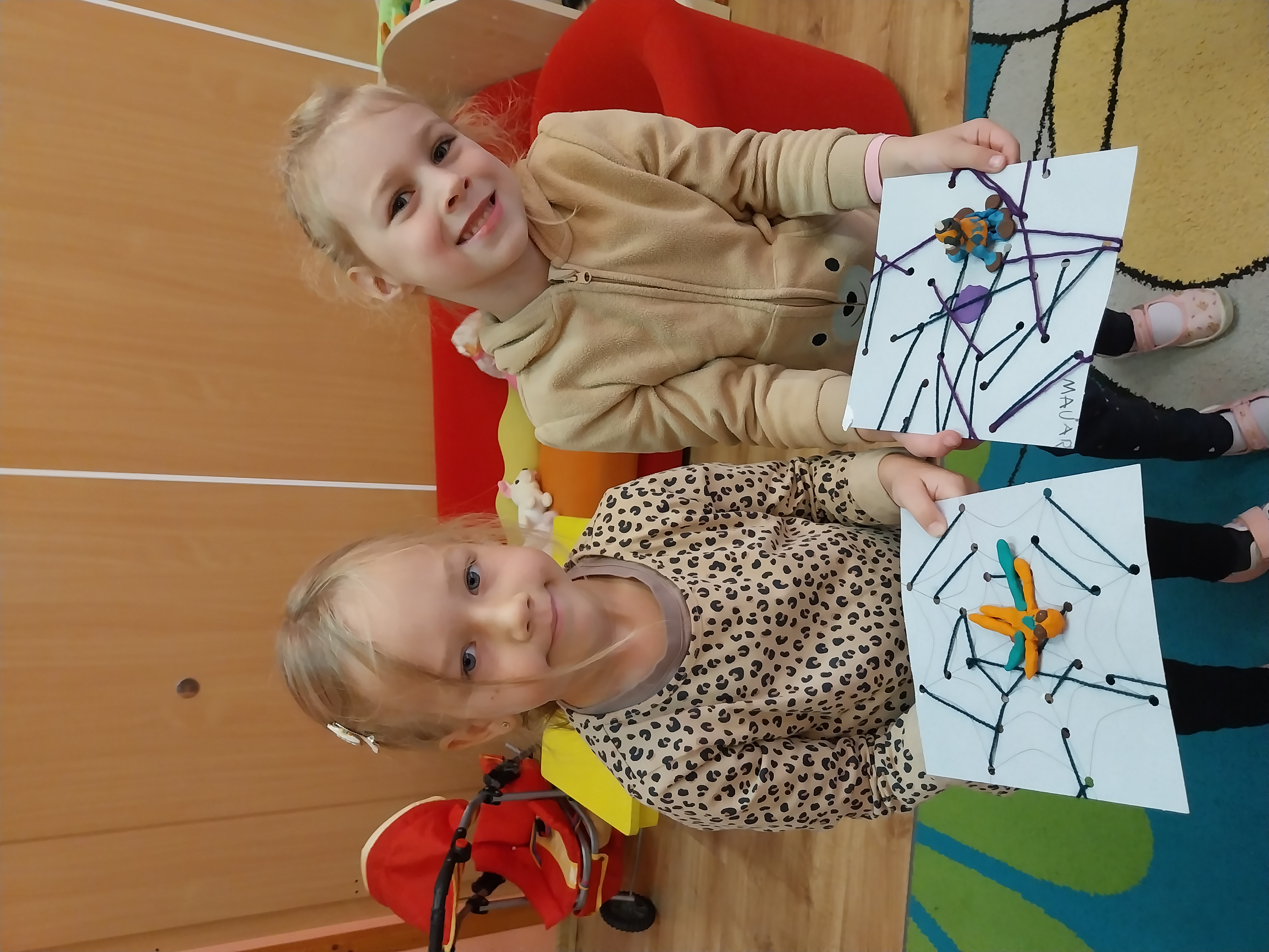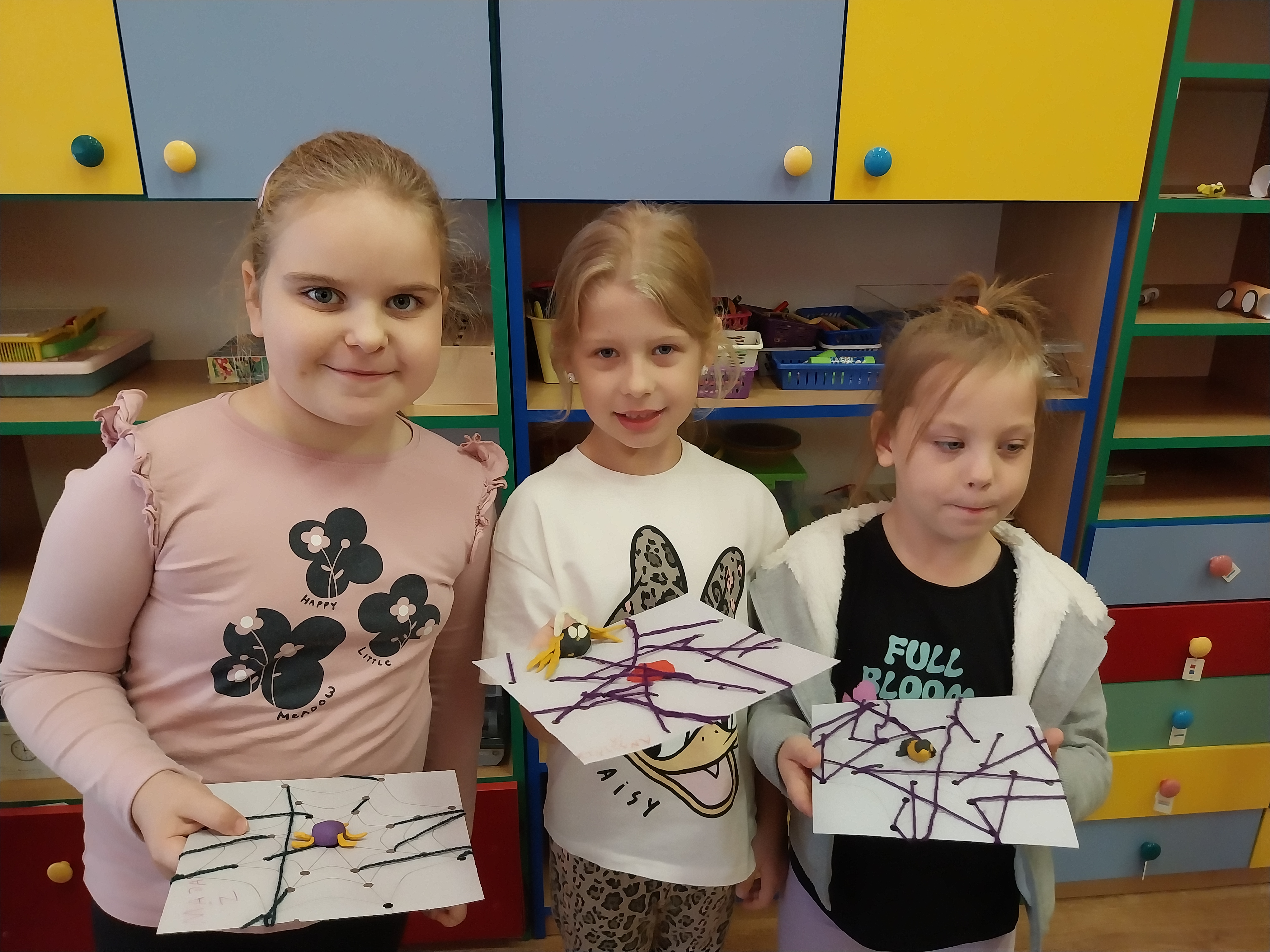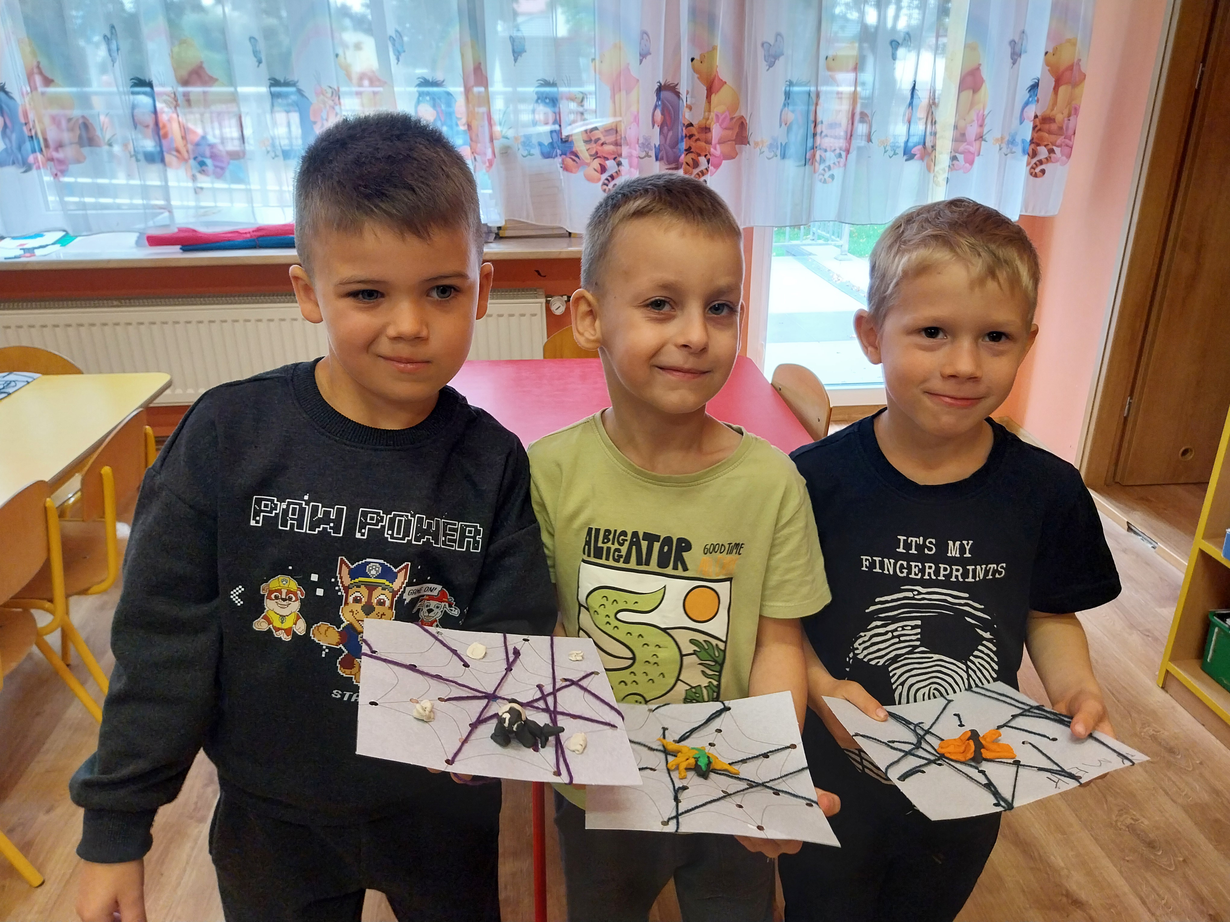 Zajączki i ich prace plastyczno- techniczne zainspirowane obserwacją przyrody i piosenką pt.: "Babie lato"