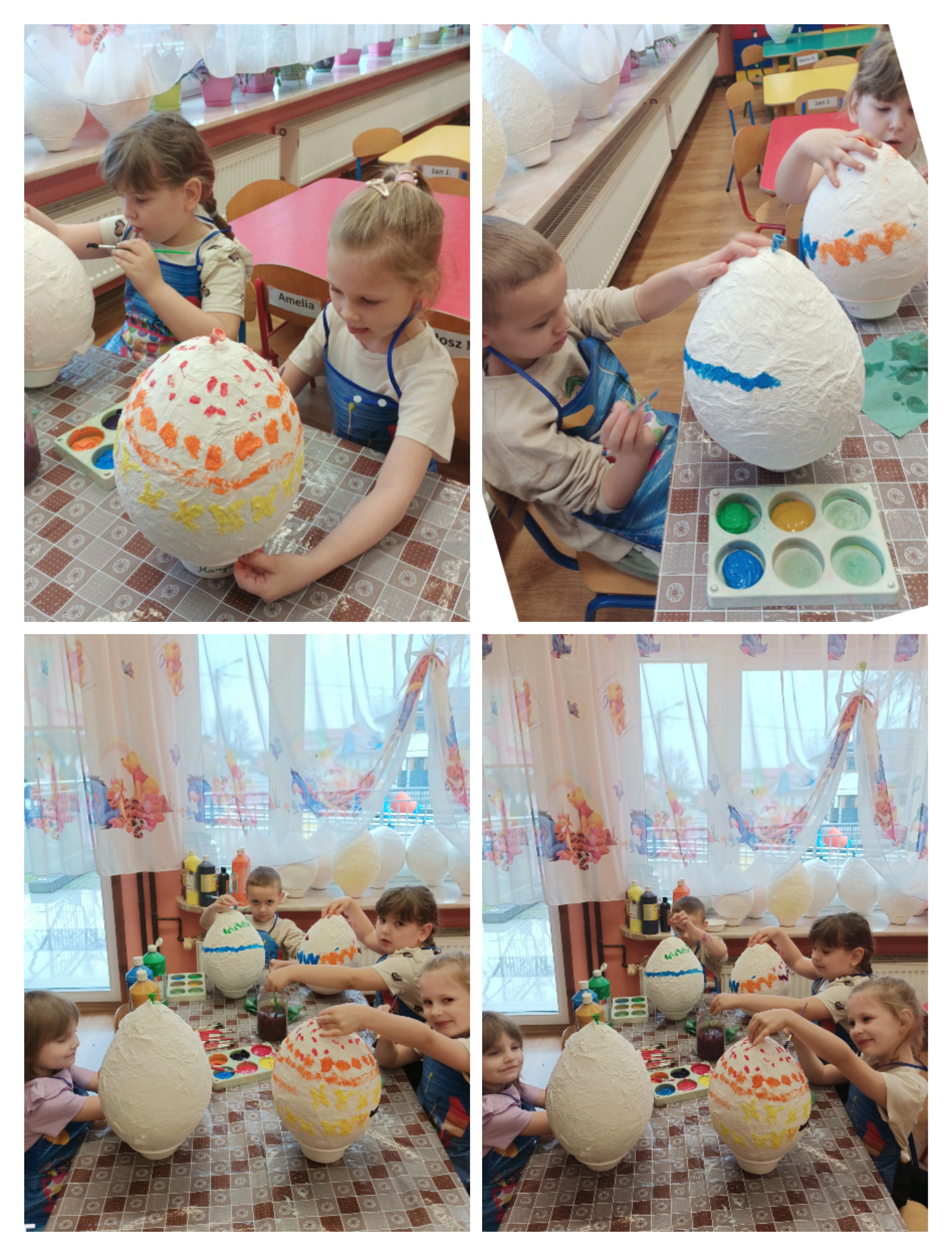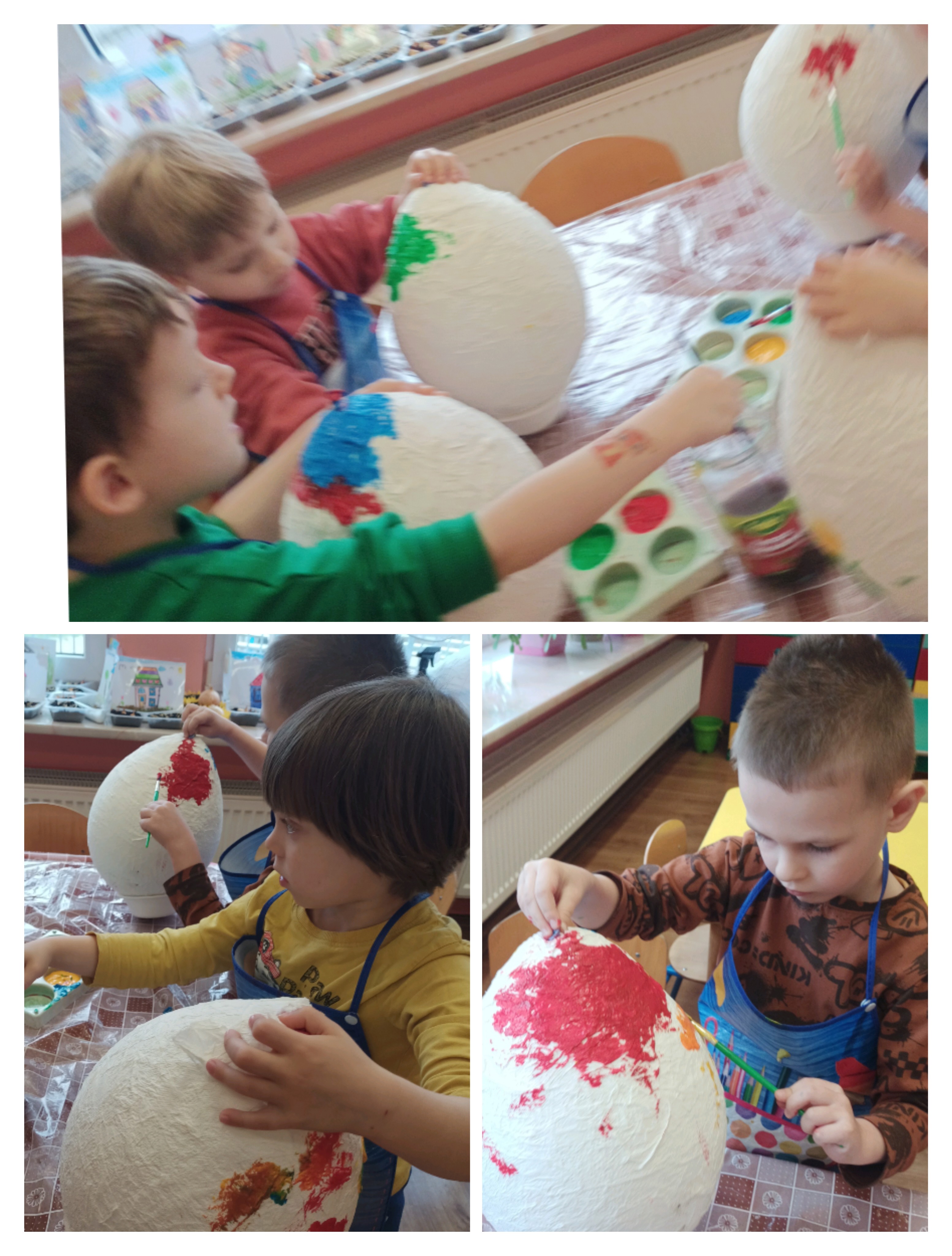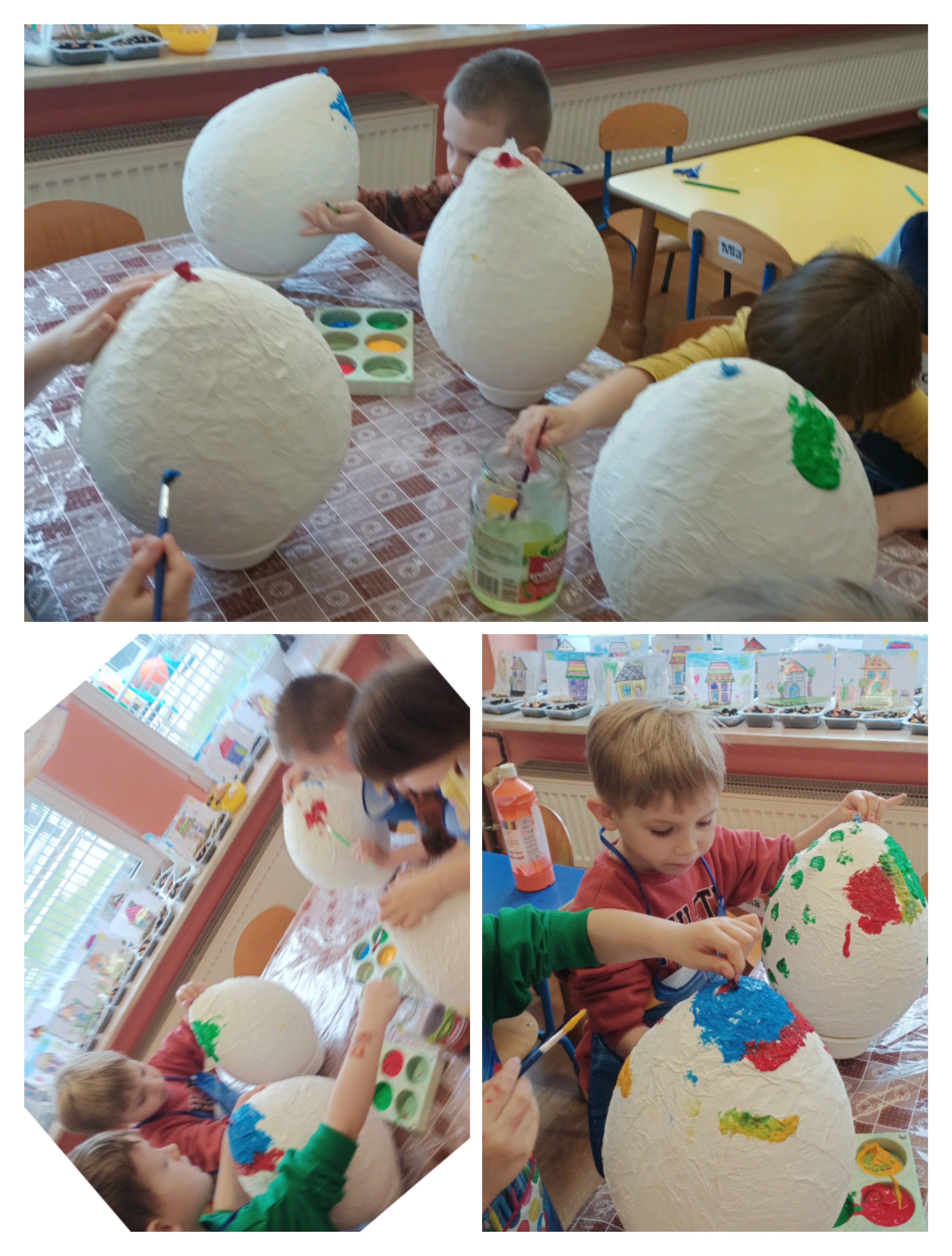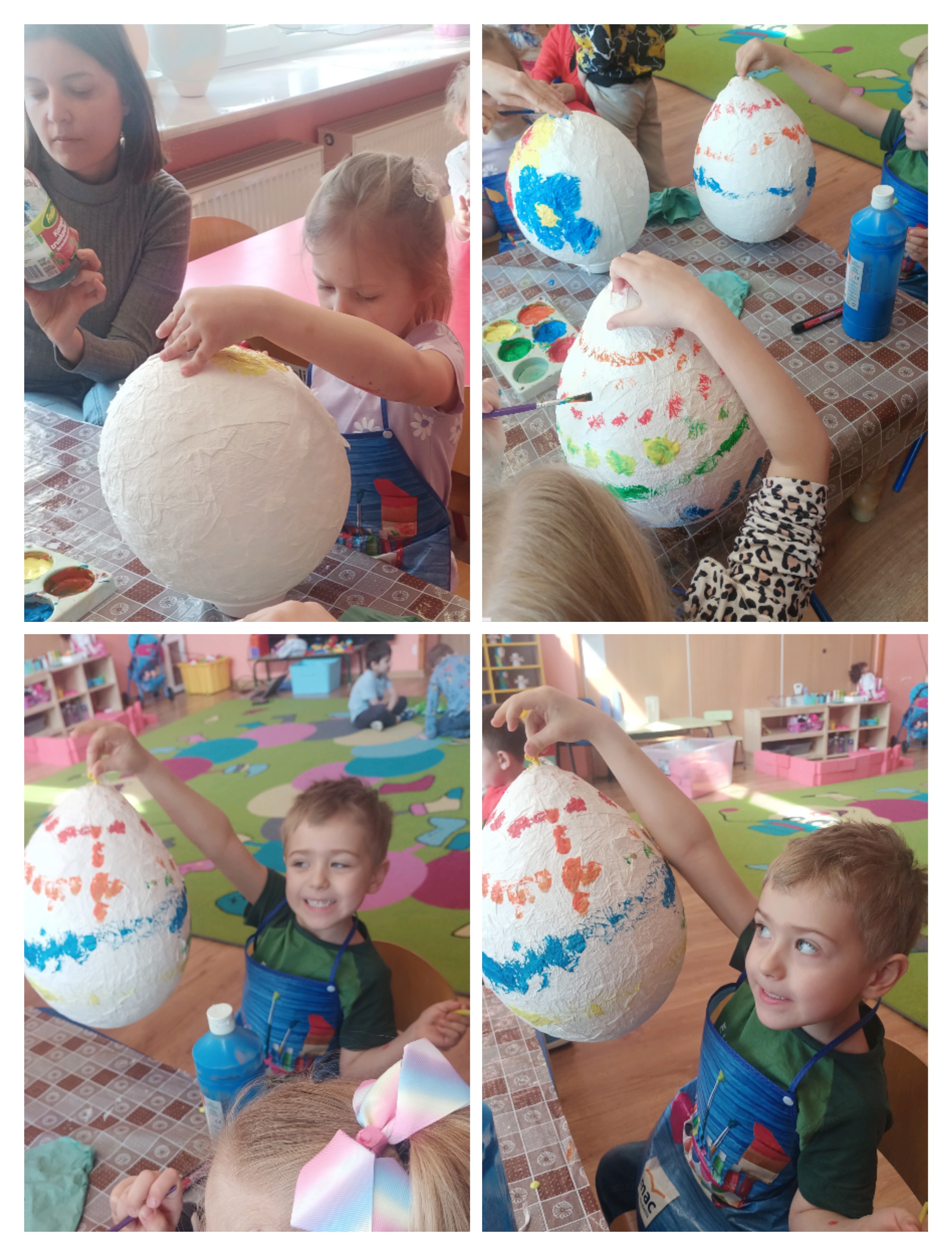 Do wykonania pracy wykorzystano balon jako bazę. Został on oklejony kawałkami papieru toaletowego nasączonego wodą, co pozwoliło uzyskać kształt jajka. Po wyschnięciu balon pozostał wewnątrz pracy, nadając jej trwałość i objętość. Całość została pomalowana farbami według pomysłów dzieci. Na zakończenie pisanka została ozdobiona kolorową wstążką, co nadało jej świąteczny i dekoracyjny charakter. Misiom bardzo podobała się ta praca plastyczna i chętnie angażowały się w jej wykonanie. Zapraszamy do fotorelacji.