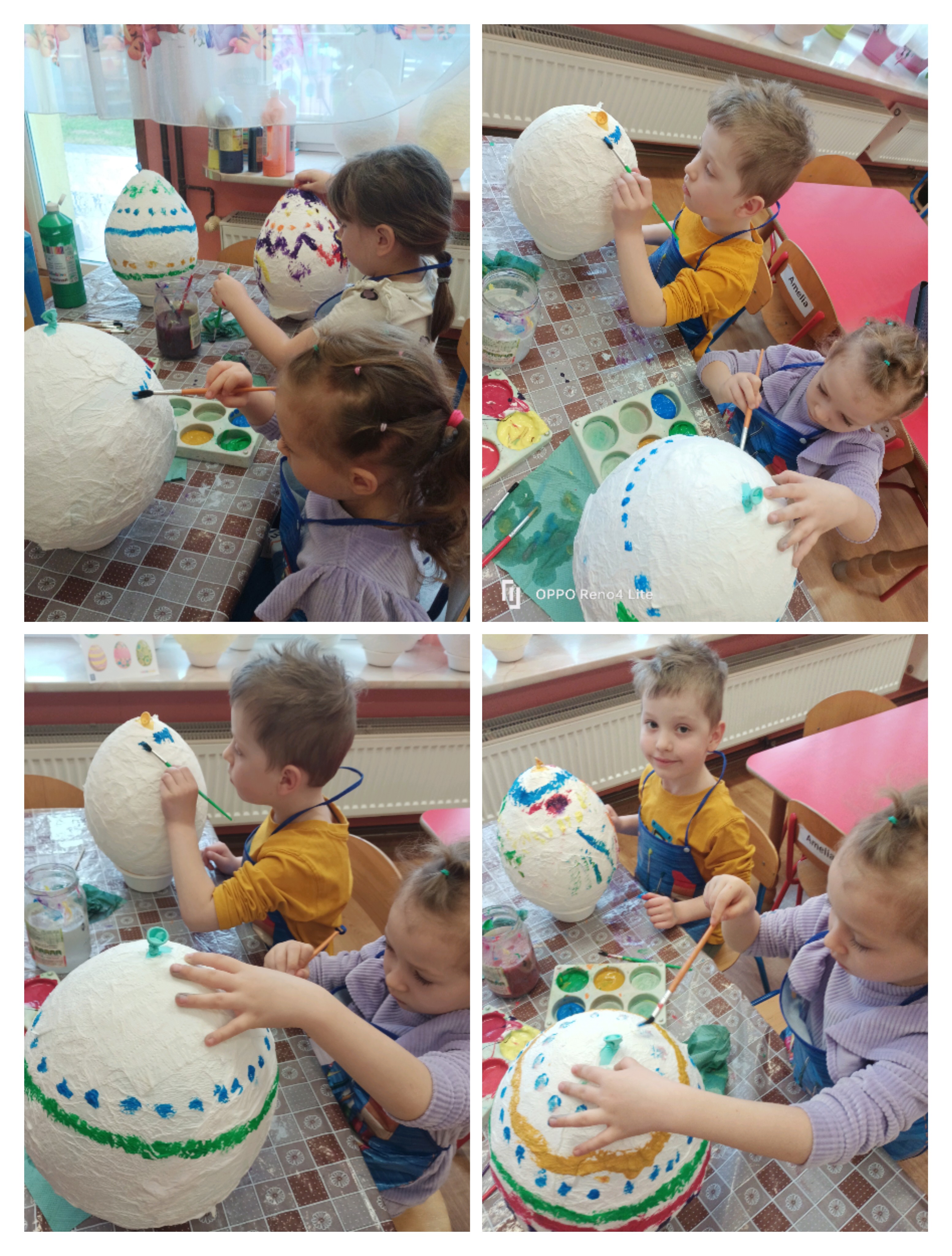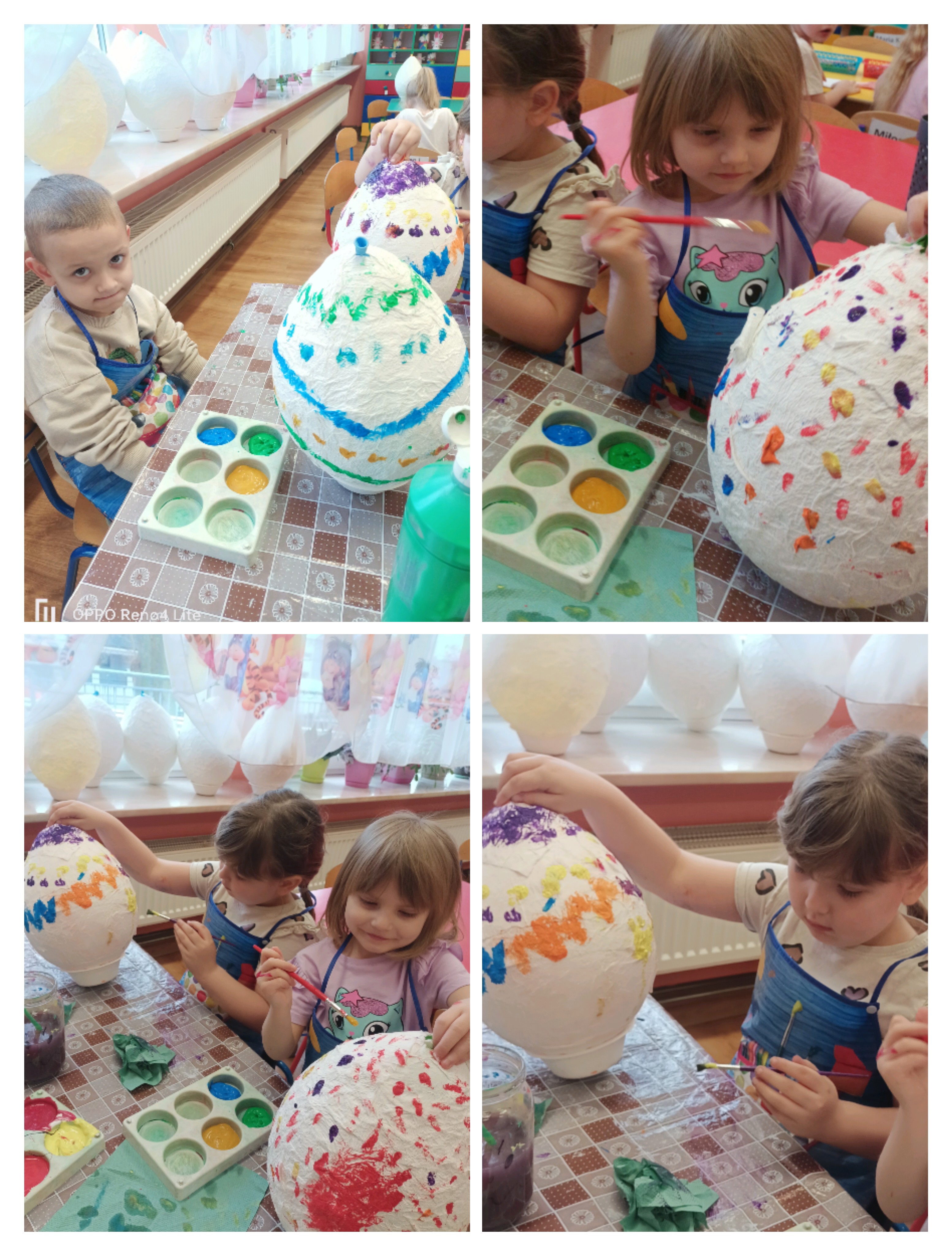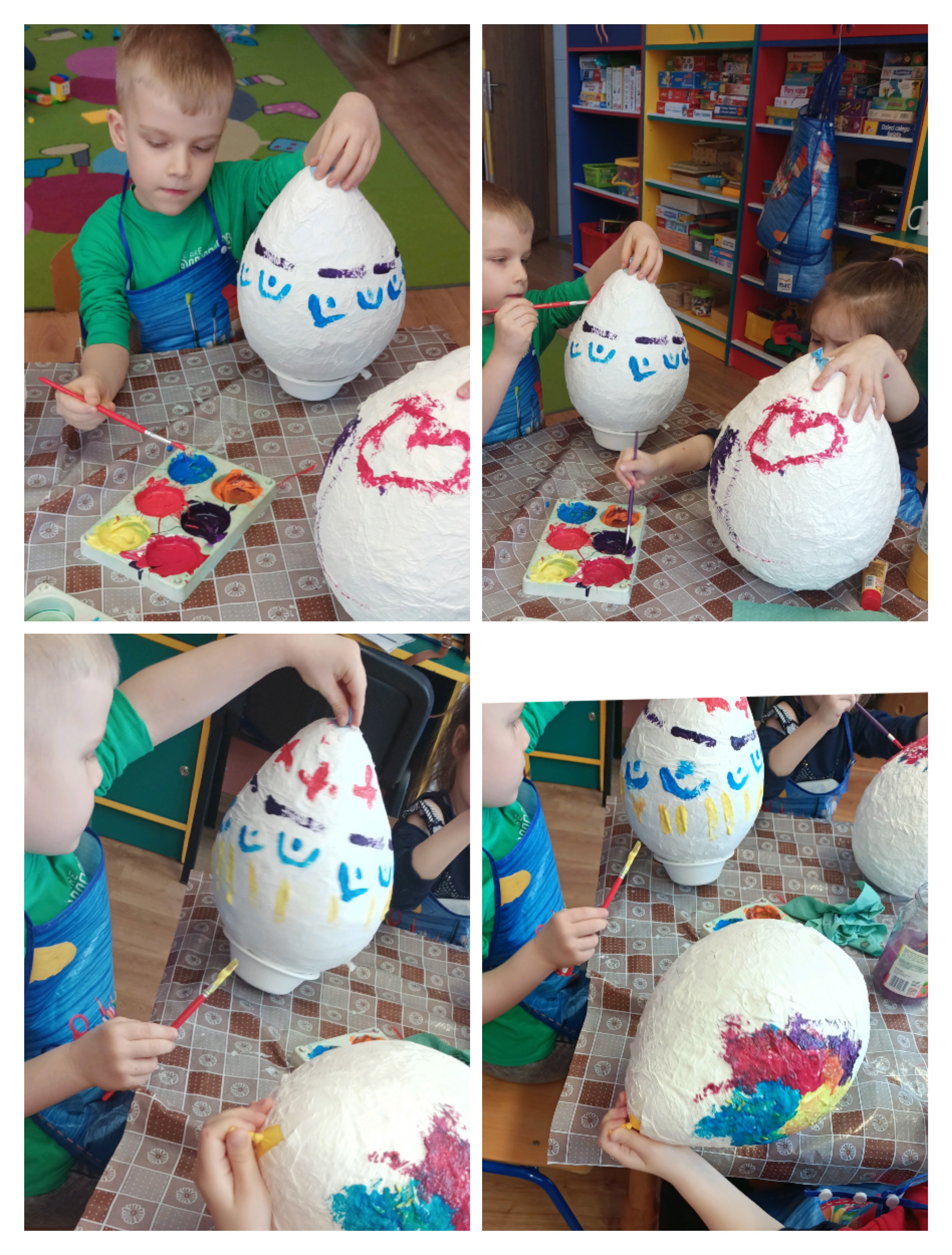 Do wykonania pracy wykorzystano balon jako bazę. Został on oklejony kawałkami papieru toaletowego nasączonego wodą, co pozwoliło uzyskać kształt jajka. Po wyschnięciu balon pozostał wewnątrz pracy, nadając jej trwałość i objętość. Całość została pomalowana farbami według pomysłów dzieci. Na zakończenie pisanka została ozdobiona kolorową wstążką, co nadało jej świąteczny i dekoracyjny charakter. Misiom bardzo podobała się ta praca plastyczna i chętnie angażowały się w jej wykonanie. Zapraszamy do fotorelacji.