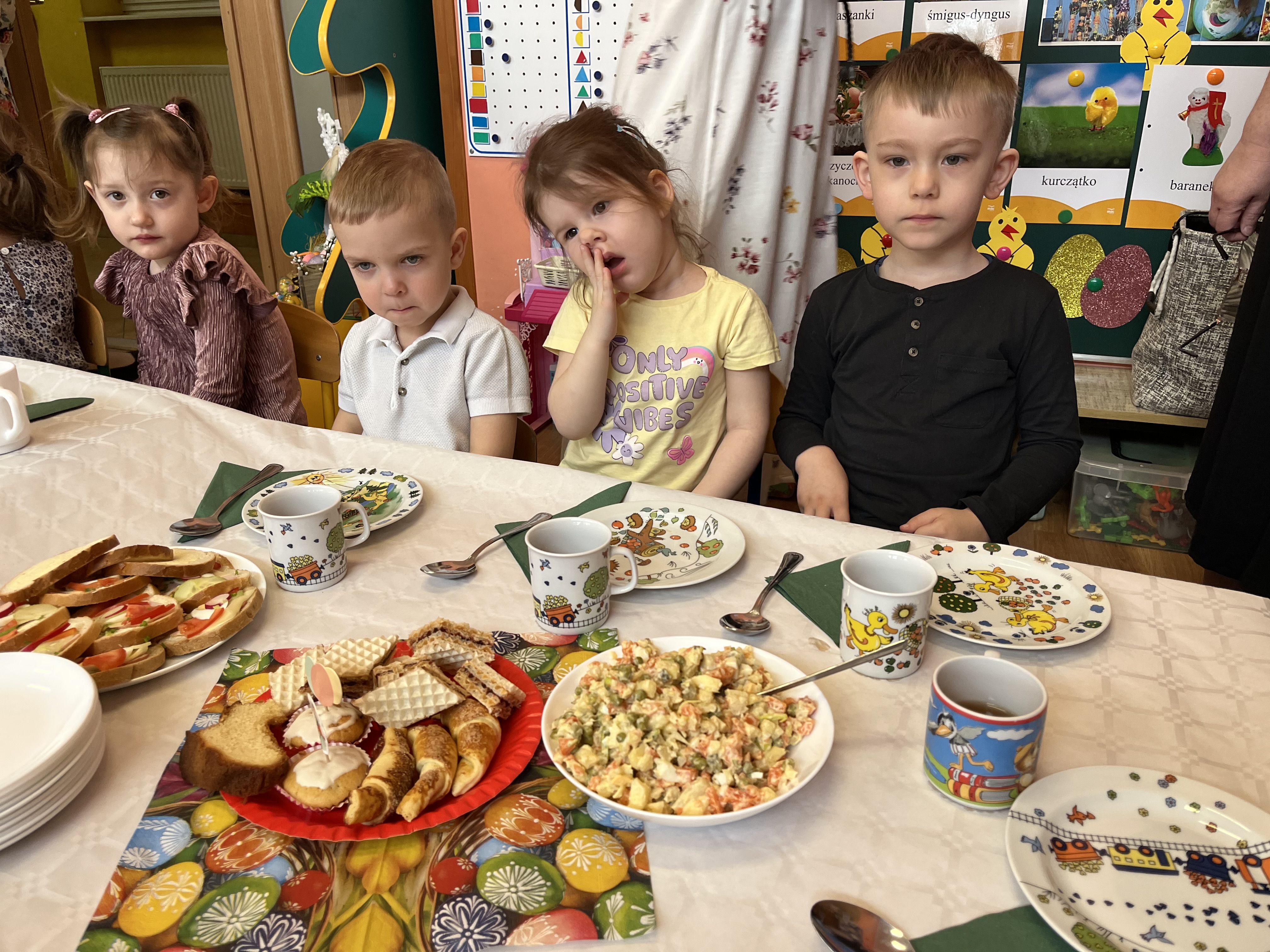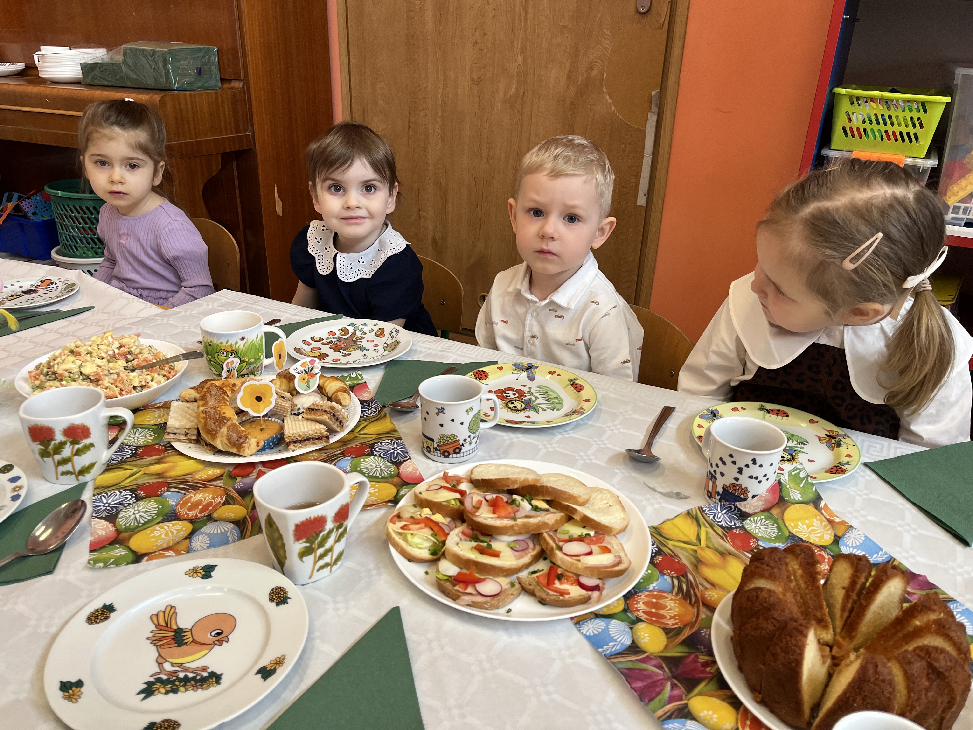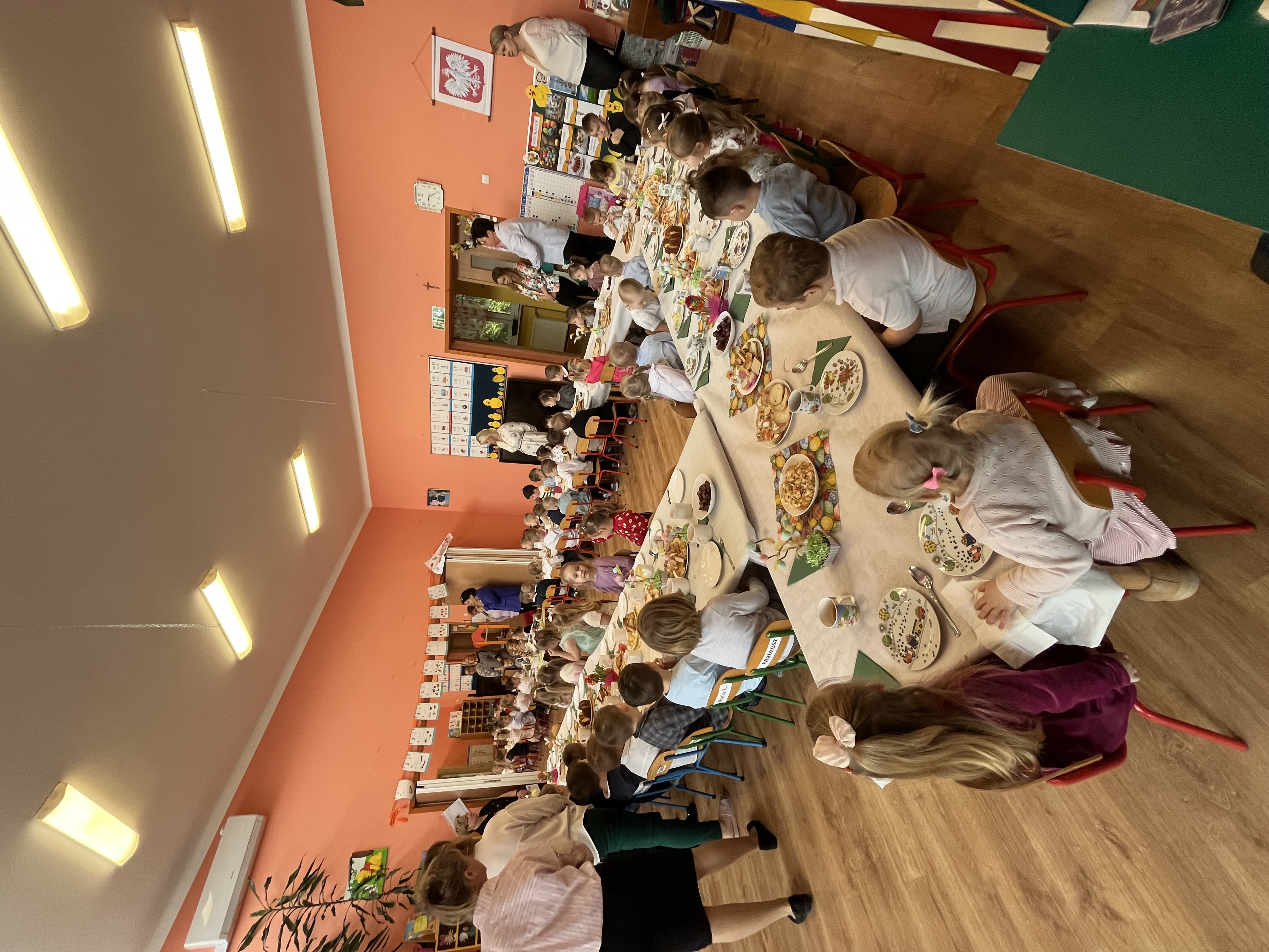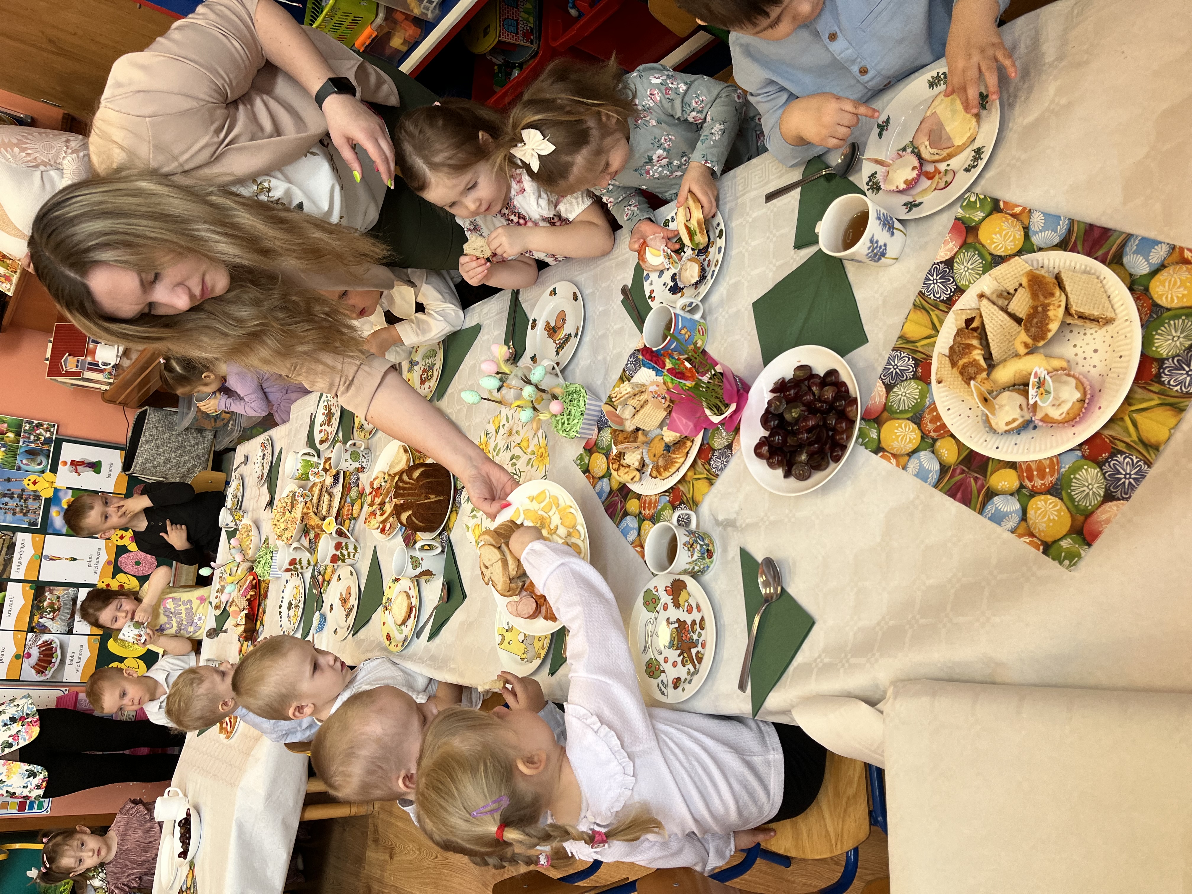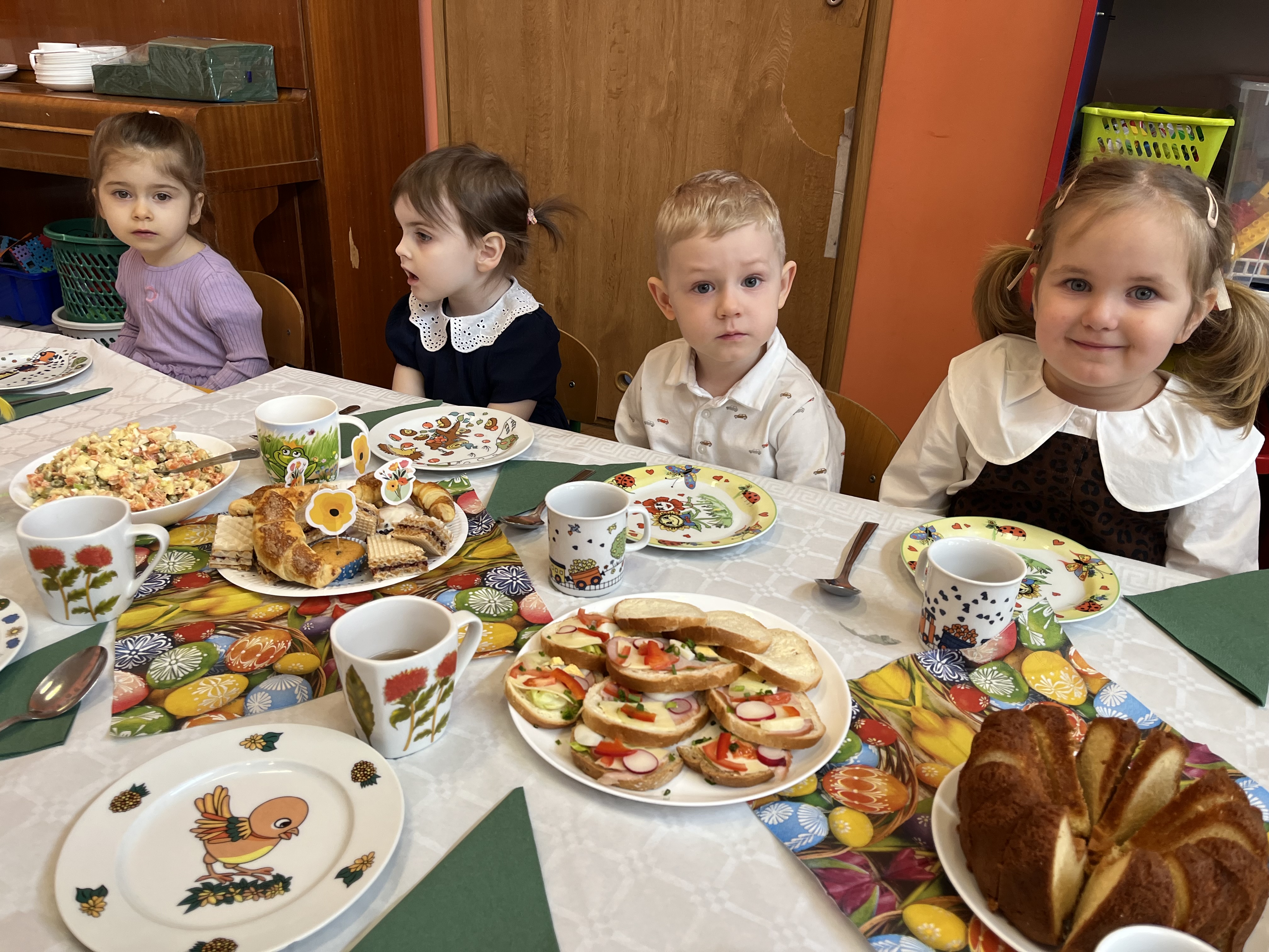 Pani Dominika przypomniała dzieciom o tradycjach wielkanocnych oraz znaczeniu potraw znajdujących się na świątecznym stole. Następnie wszyscy wspólnie zasiedli do stołów i z apetytem zajadali się wielkanocnymi przysmakami.