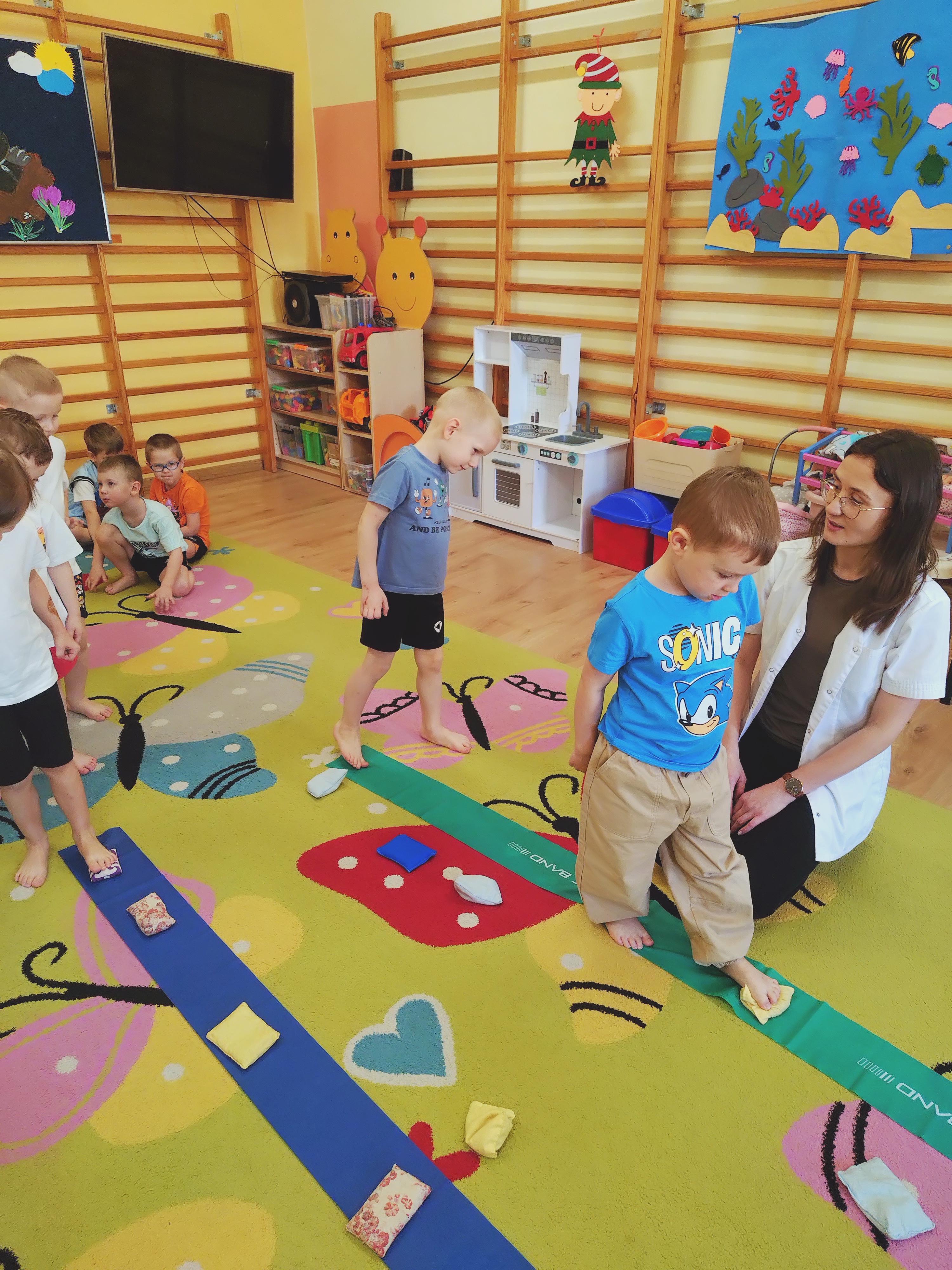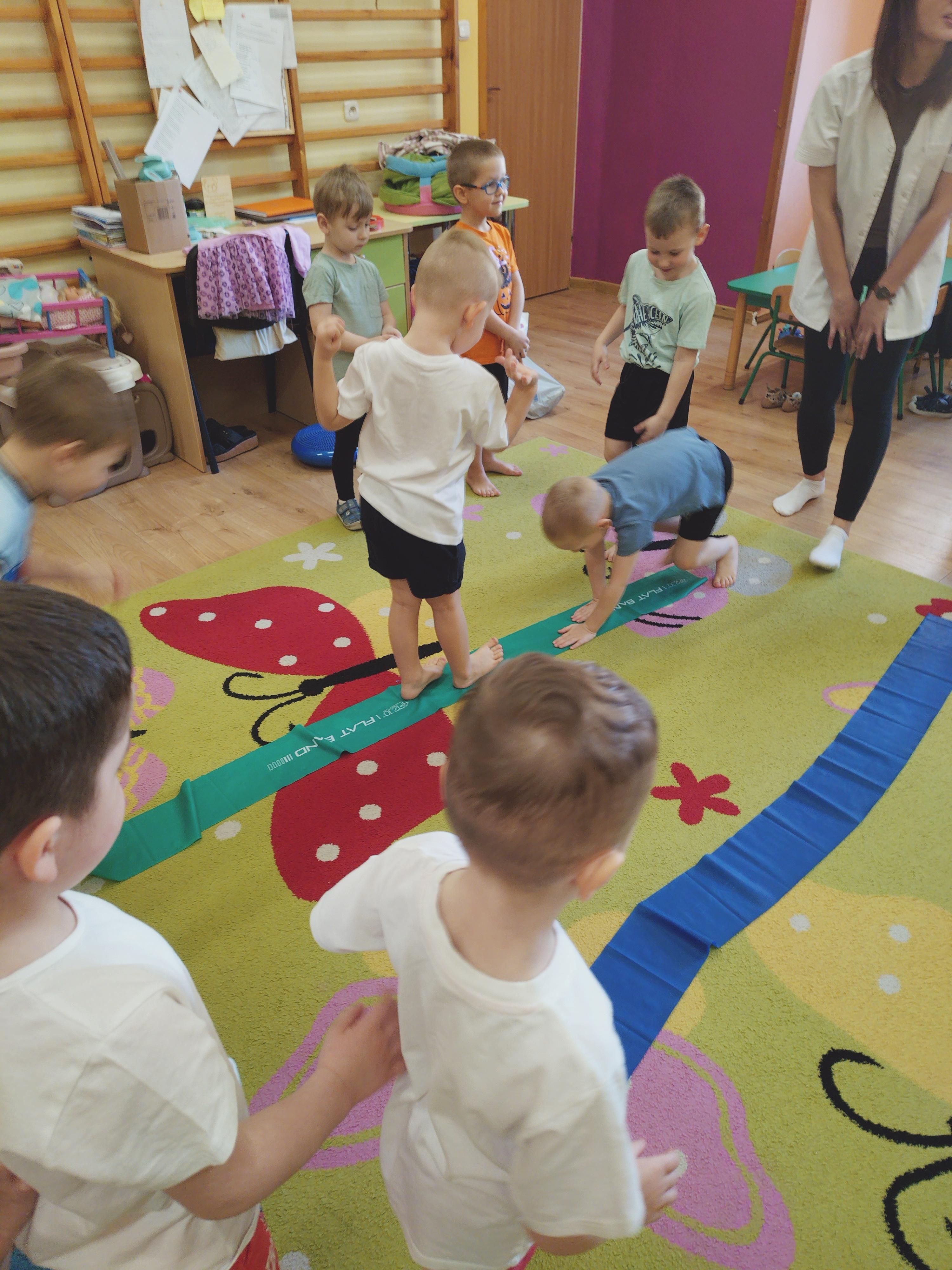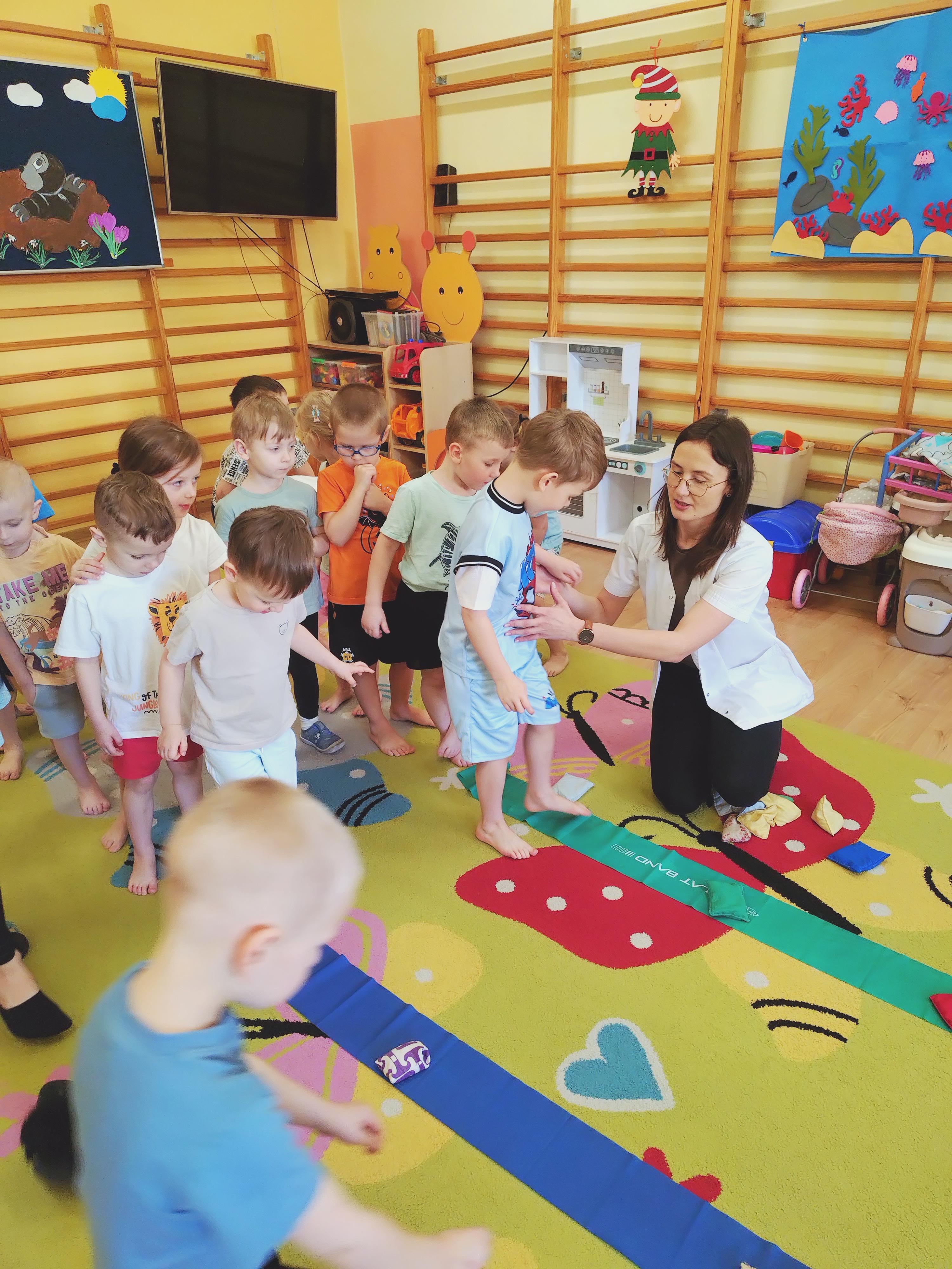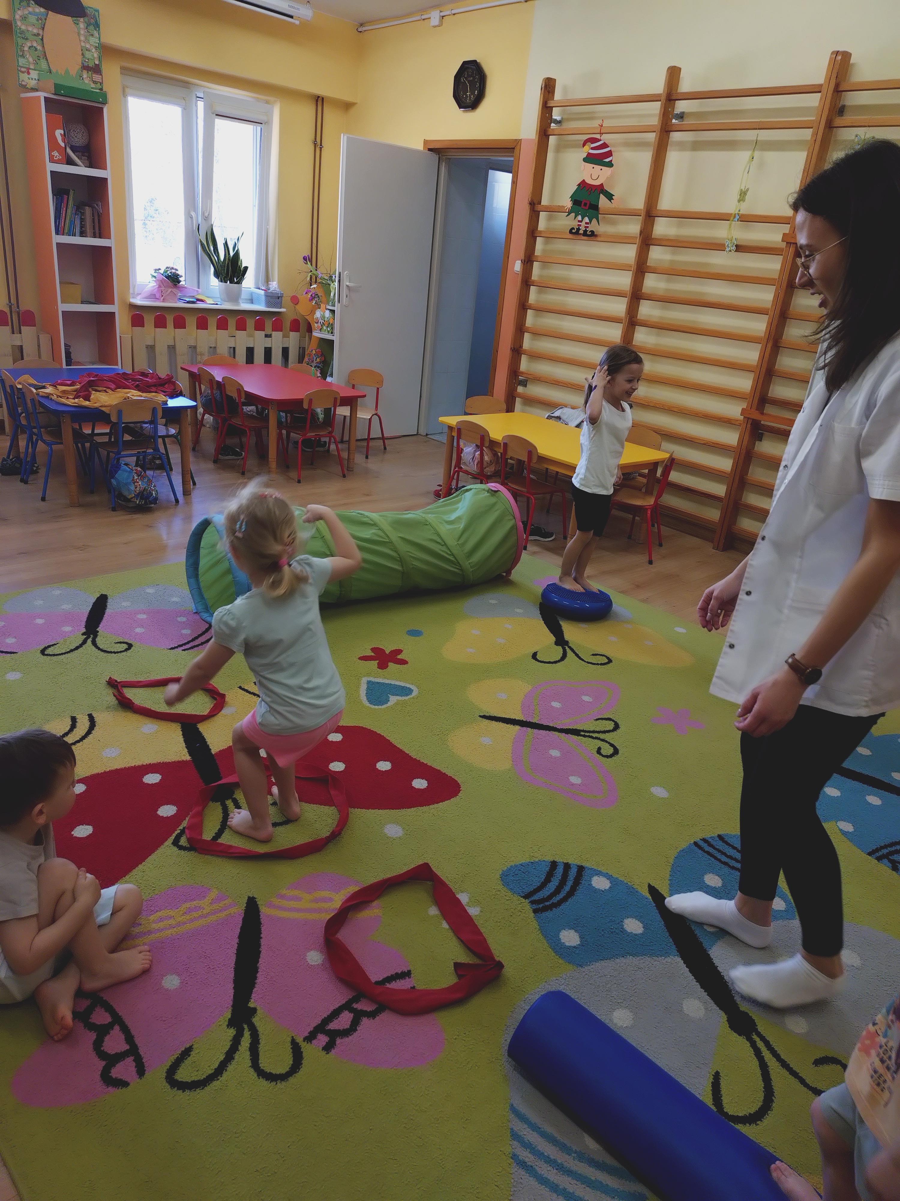 Elfy dowiedziały się, że fizjoterapeuta to osoba, która przez ćwiczenia i różne zabiegi pomaga ludziom w poprawie sprawności ruchowej. Mieliśmy również okazję uczestniczyć w wielu ciekawych ćwiczeniach z wykorzystaniem atrakcyjnych pomocy. Najwięcej entuzjazmu wzbudził tor przeszkód i zawijanie w naleśnika. Choć mieliśmy troszkę kłopotów z czekaniem na swoją kolej, ze wszystkim poradziliśmy sobie doskonale. Ćwiczyliśmy z wielkim zaangażowaniem i radością. Na koniec, podziękowaliśmy naszemu Gościowi śpiewem piosenki i wręczyliśmy pamiątkową tabliczkę Przyjaciela Przedszkola.
