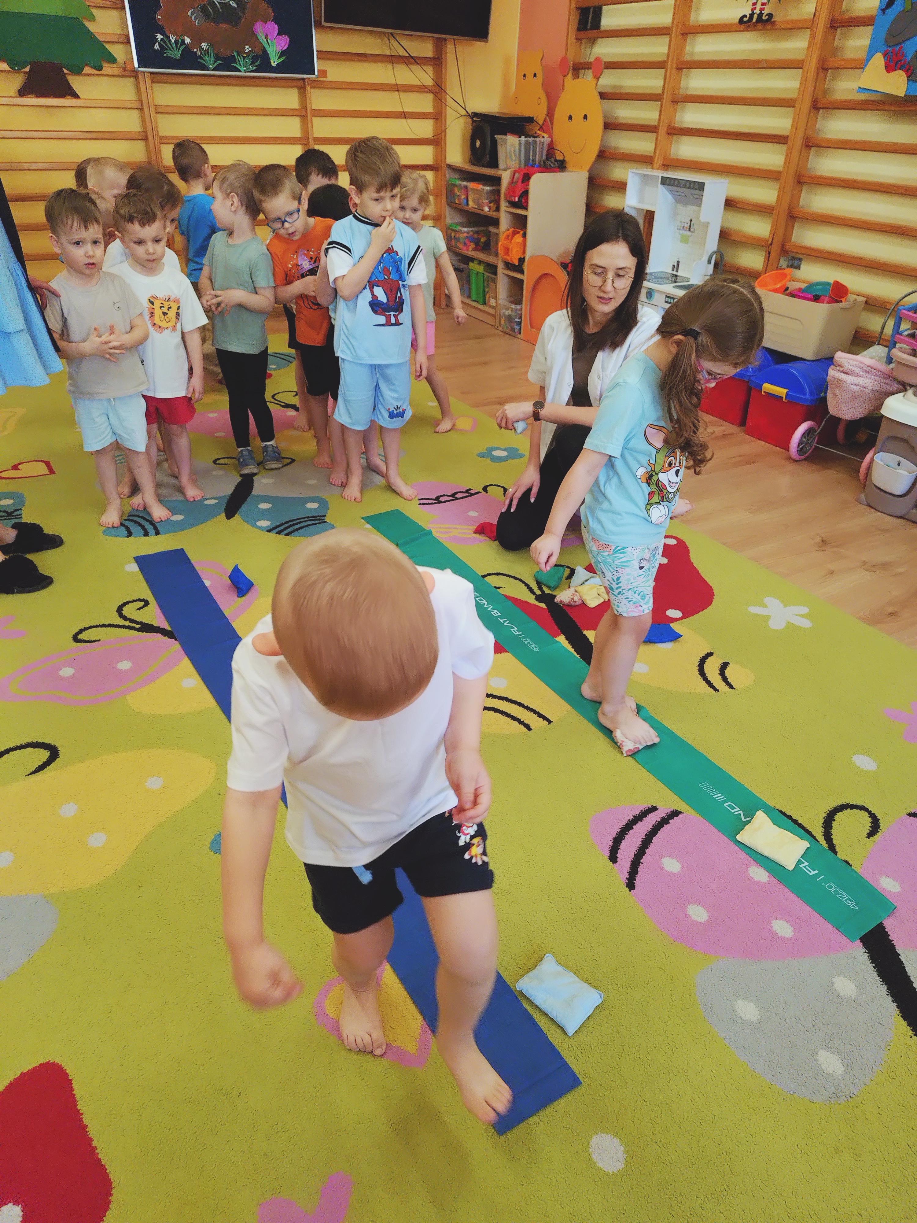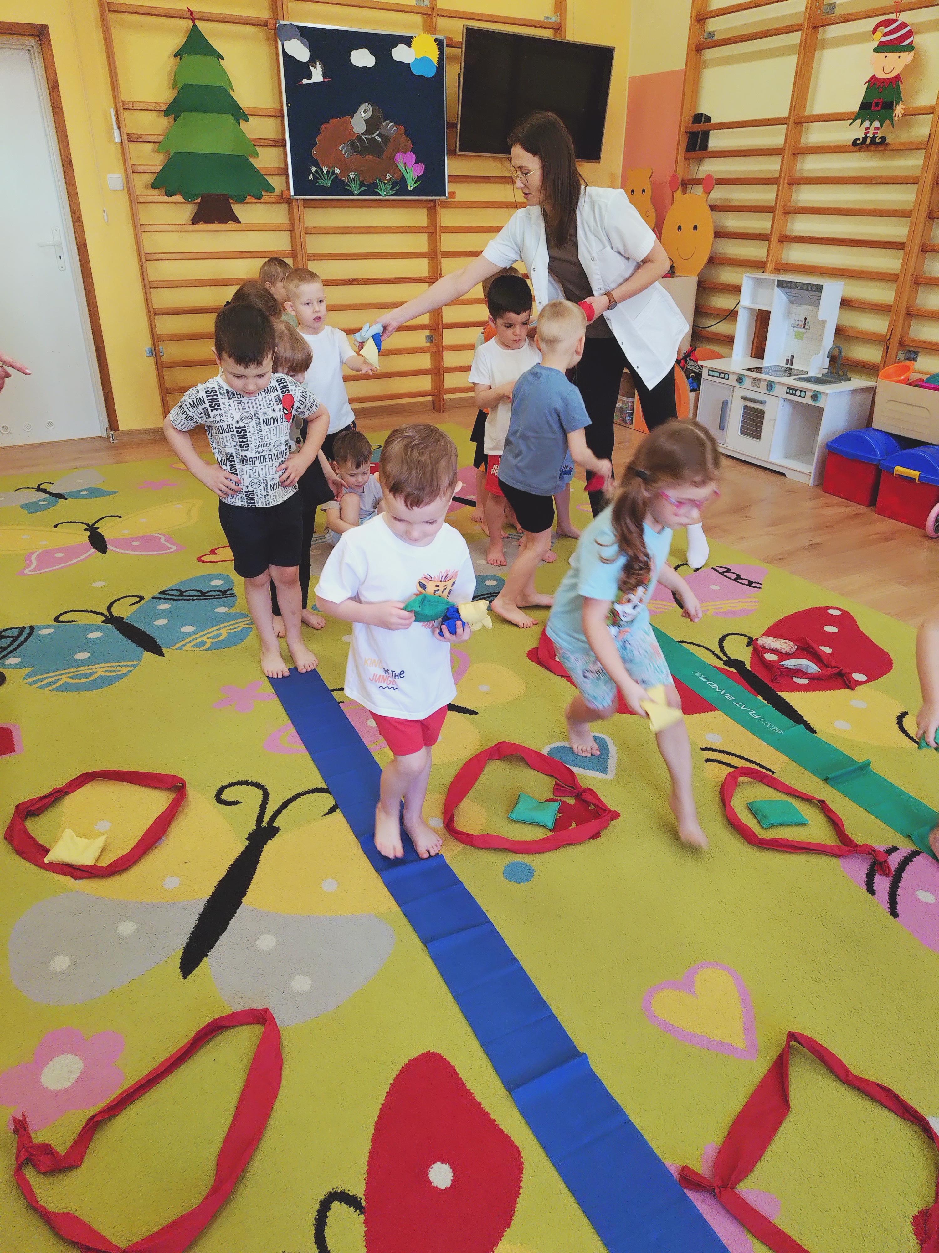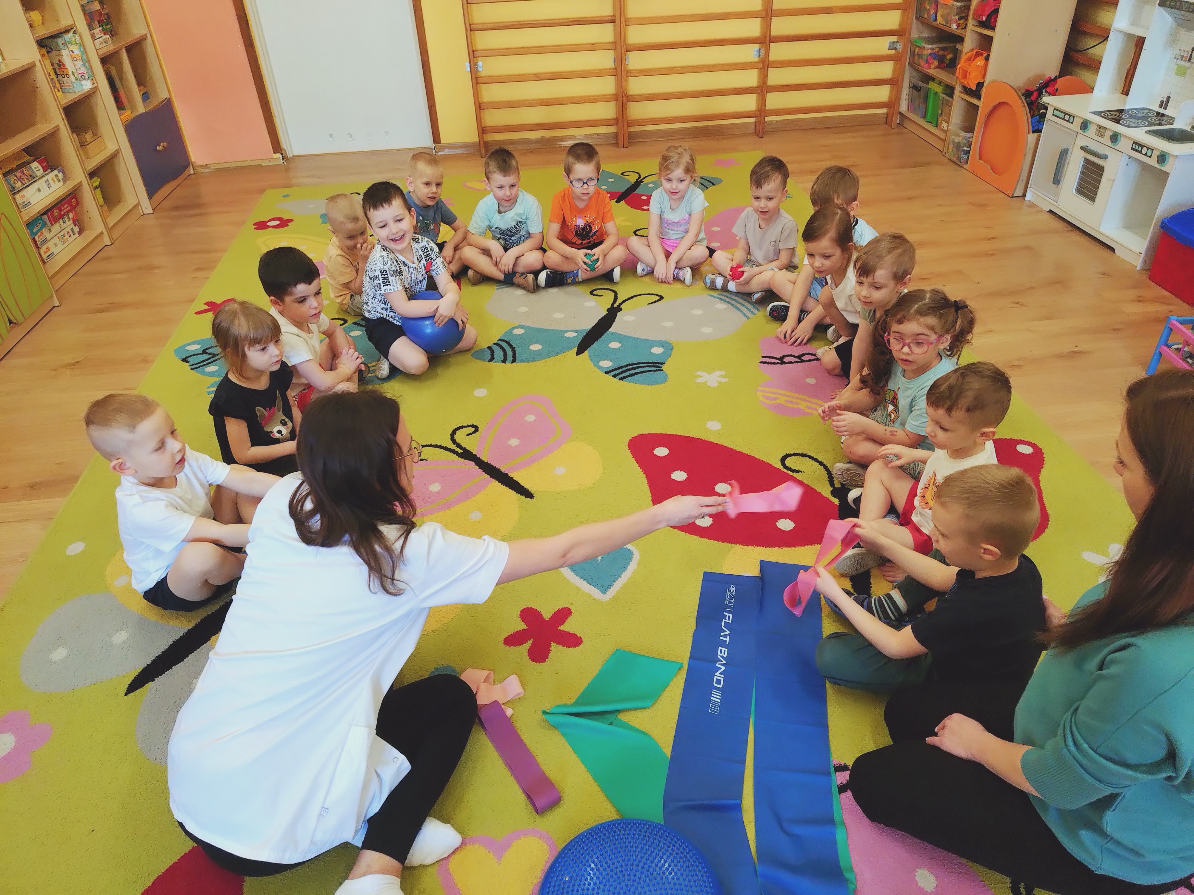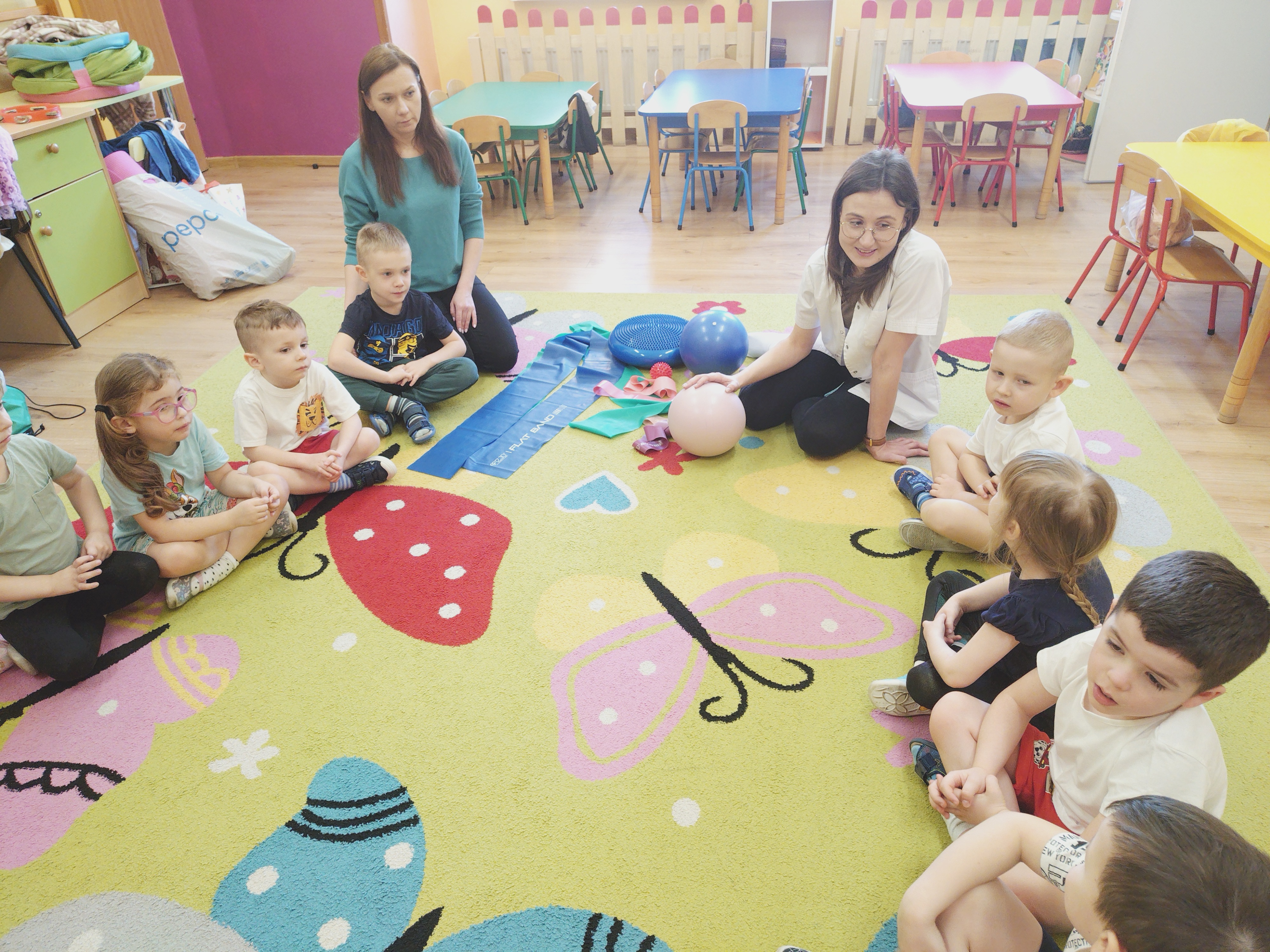Elfy dowiedziały się, że fizjoterapeuta to osoba, która przez ćwiczenia i różne zabiegi pomaga ludziom w poprawie sprawności ruchowej. Mieliśmy również okazję uczestniczyć w wielu ciekawych ćwiczeniach z wykorzystaniem atrakcyjnych pomocy. Najwięcej entuzjazmu wzbudził tor przeszkód i zawijanie w naleśnika. Choć mieliśmy troszkę kłopotów z czekaniem na swoją kolej, ze wszystkim poradziliśmy sobie doskonale. Ćwiczyliśmy z wielkim zaangażowaniem i radością. Na koniec, podziękowaliśmy naszemu Gościowi śpiewem piosenki i wręczyliśmy pamiątkową tabliczkę Przyjaciela Przedszkola.