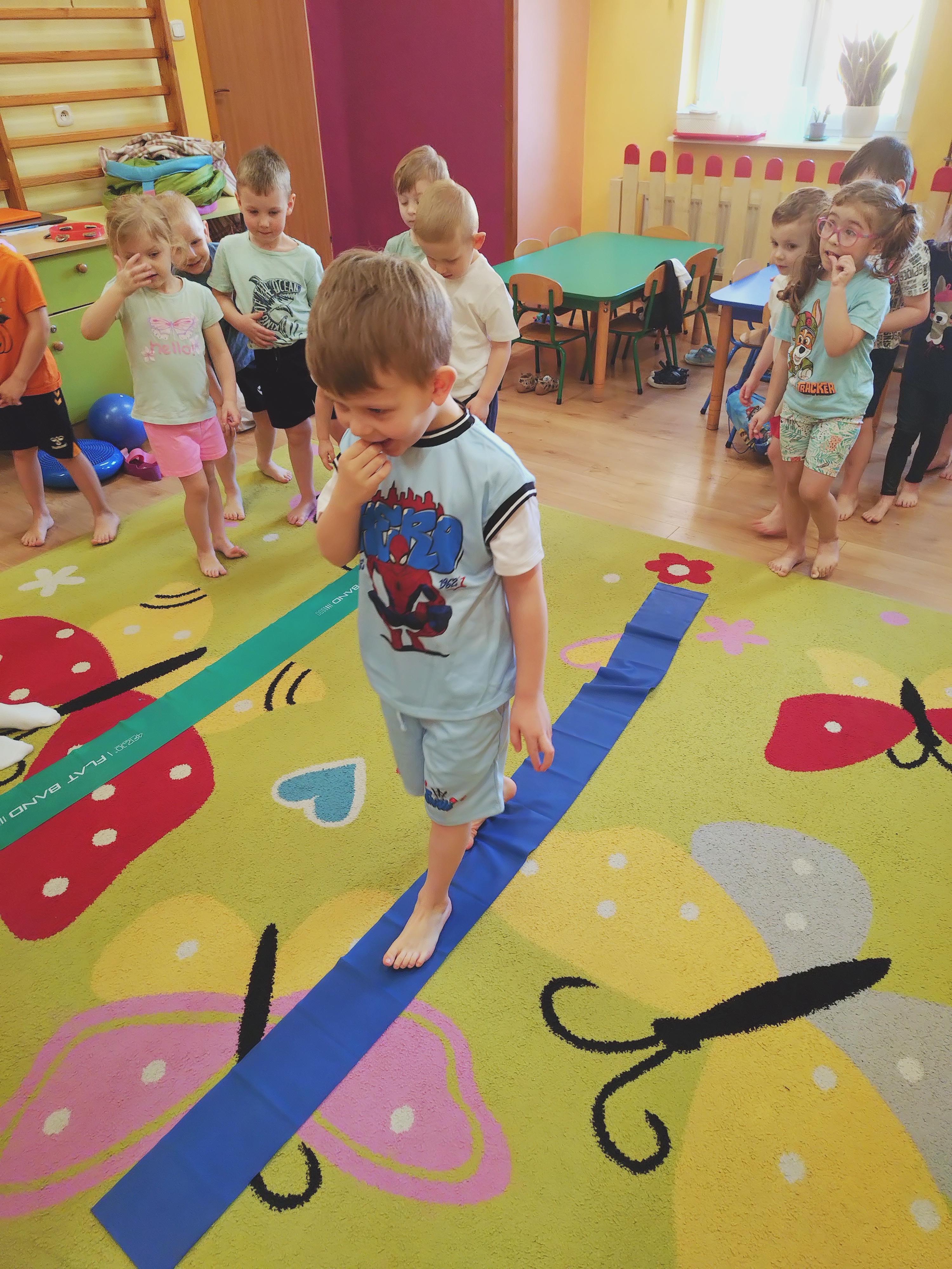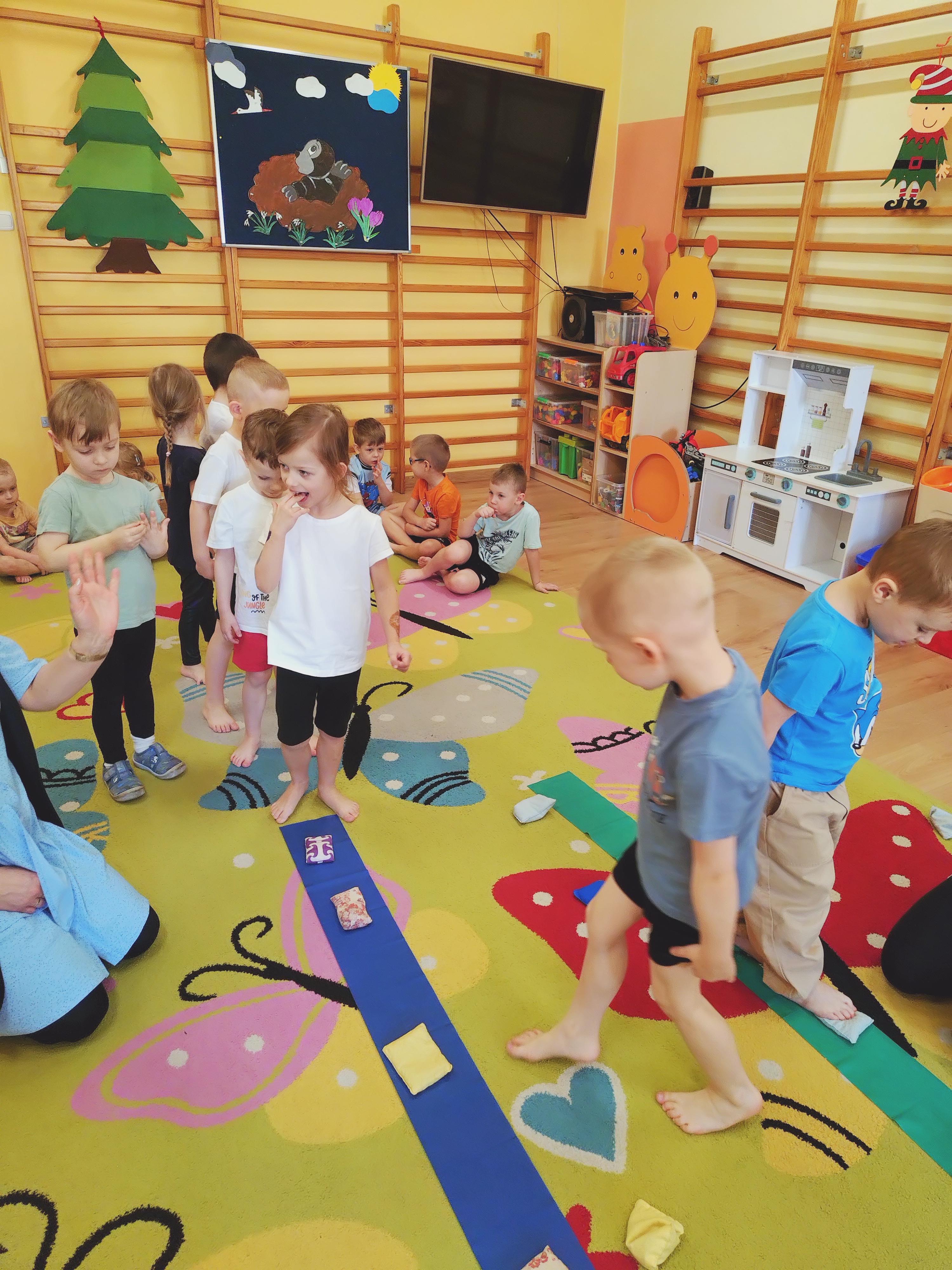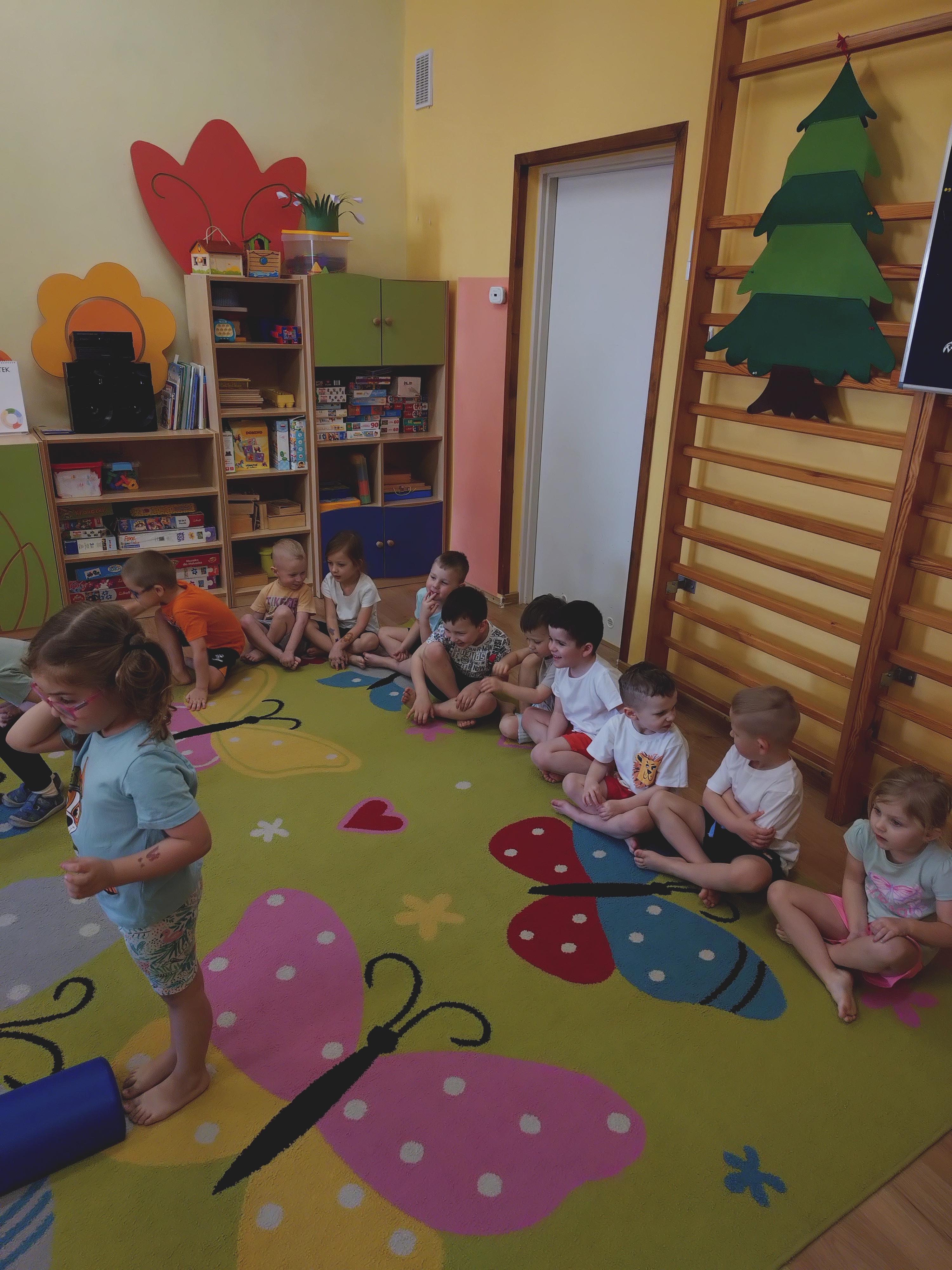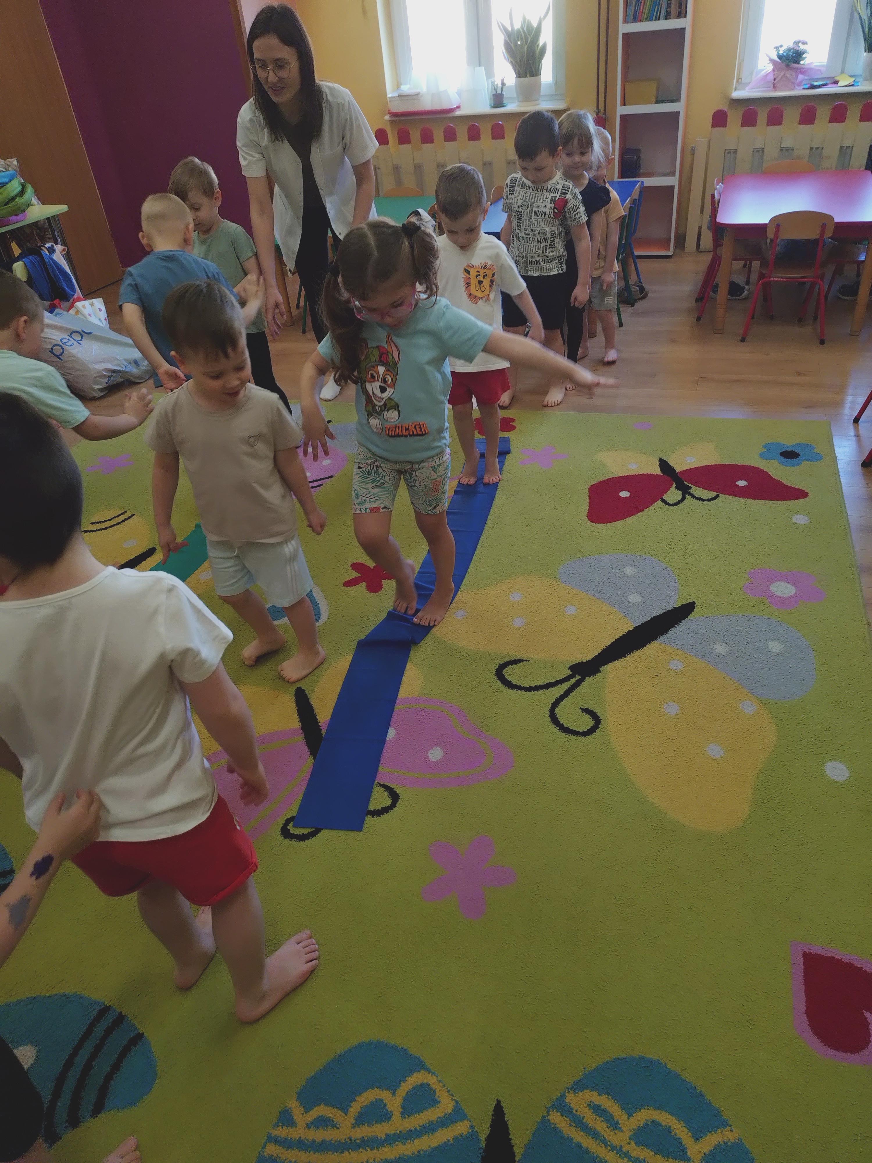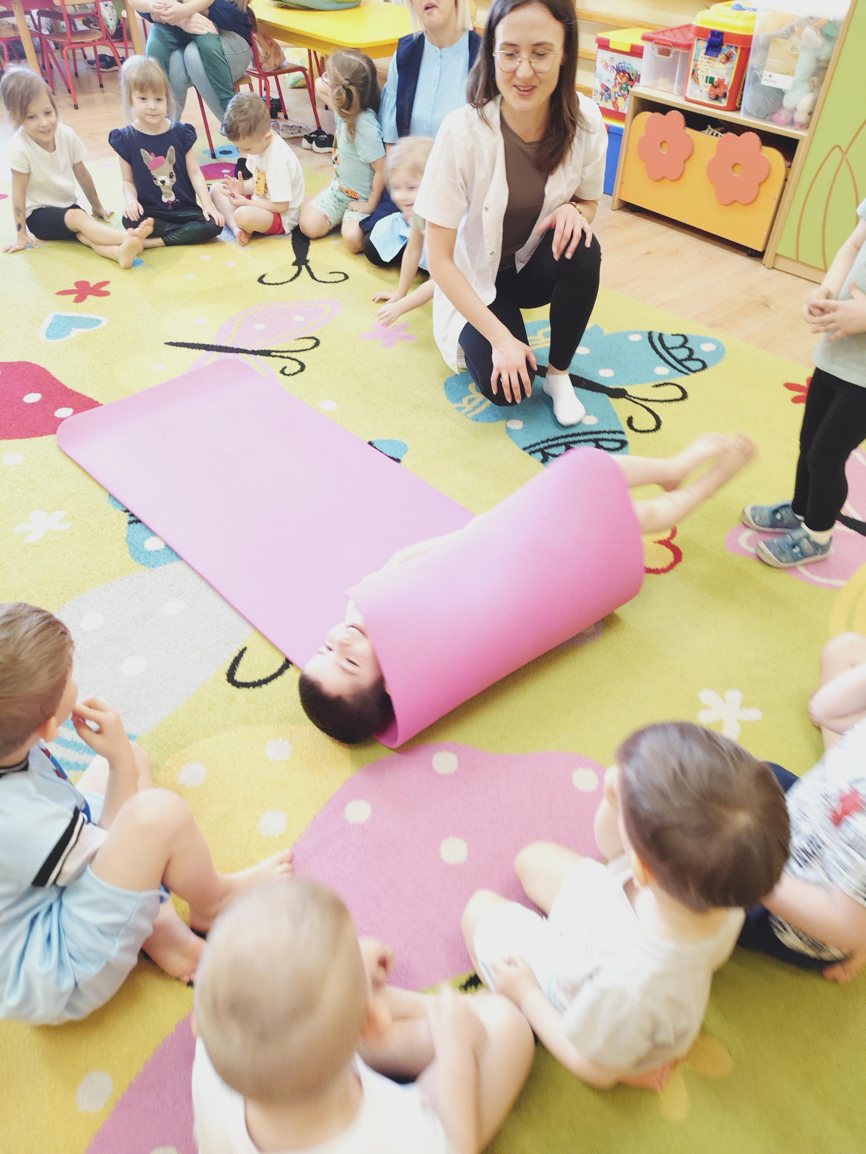 Elfy dowiedziały się, że fizjoterapeuta to osoba, która przez ćwiczenia i różne zabiegi pomaga ludziom w poprawie sprawności ruchowej. Mieliśmy również okazję uczestniczyć w wielu ciekawych ćwiczeniach z wykorzystaniem atrakcyjnych pomocy. Najwięcej entuzjazmu wzbudził tor przeszkód i zawijanie w naleśnika. Choć mieliśmy troszkę kłopotów z czekaniem na swoją kolej, ze wszystkim poradziliśmy sobie doskonale. Ćwiczyliśmy z wielkim zaangażowaniem i radością. Na koniec, podziękowaliśmy naszemu Gościowi śpiewem piosenki i wręczyliśmy pamiątkową tabliczkę Przyjaciela Przedszkola.