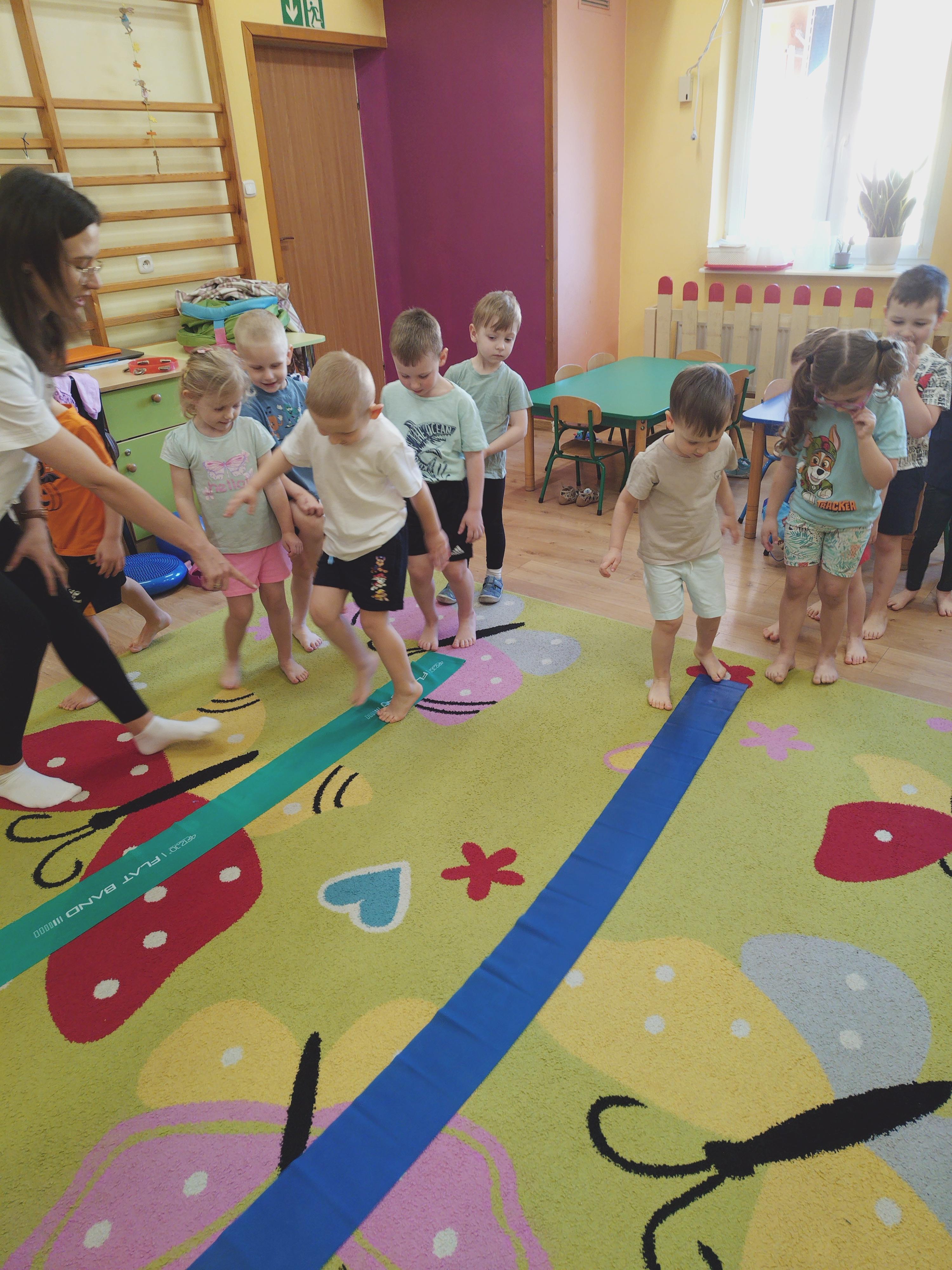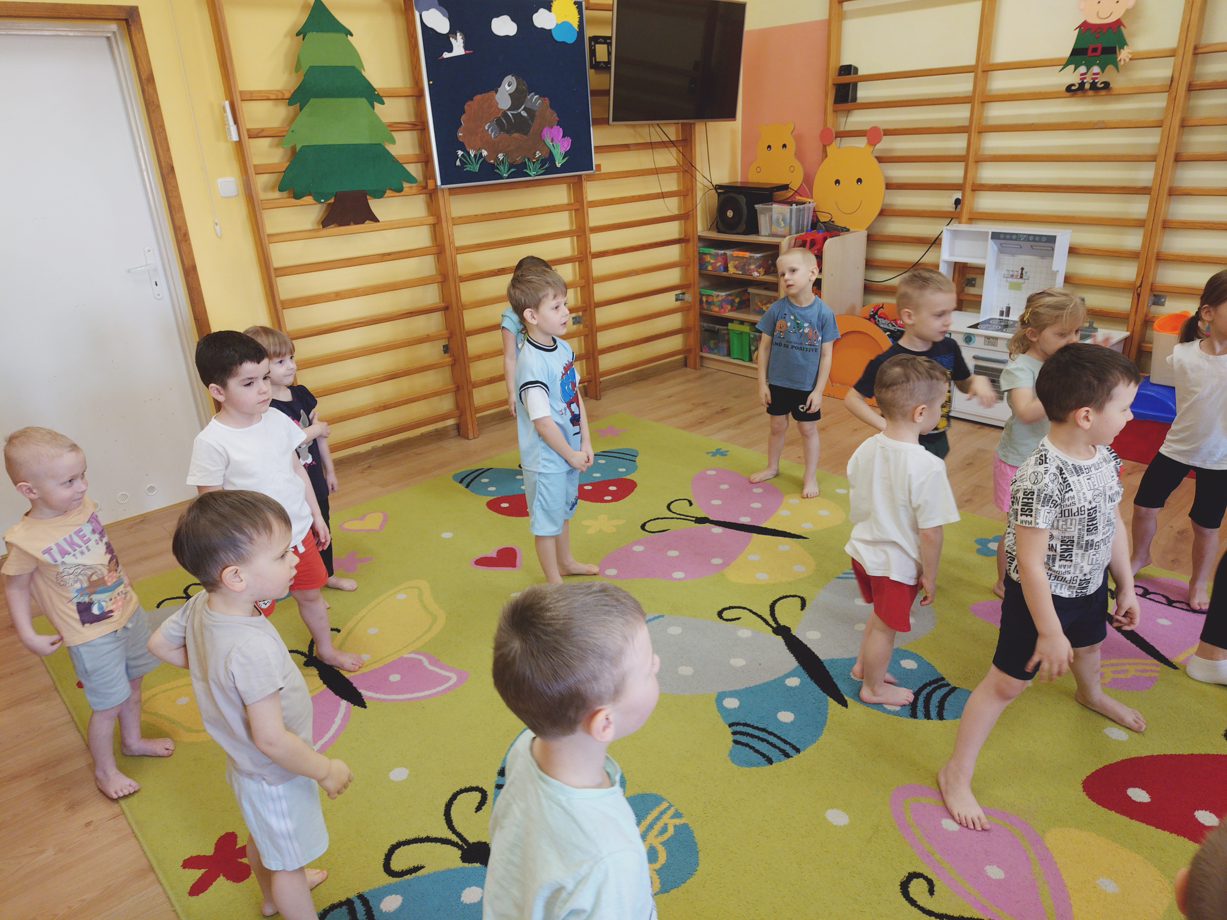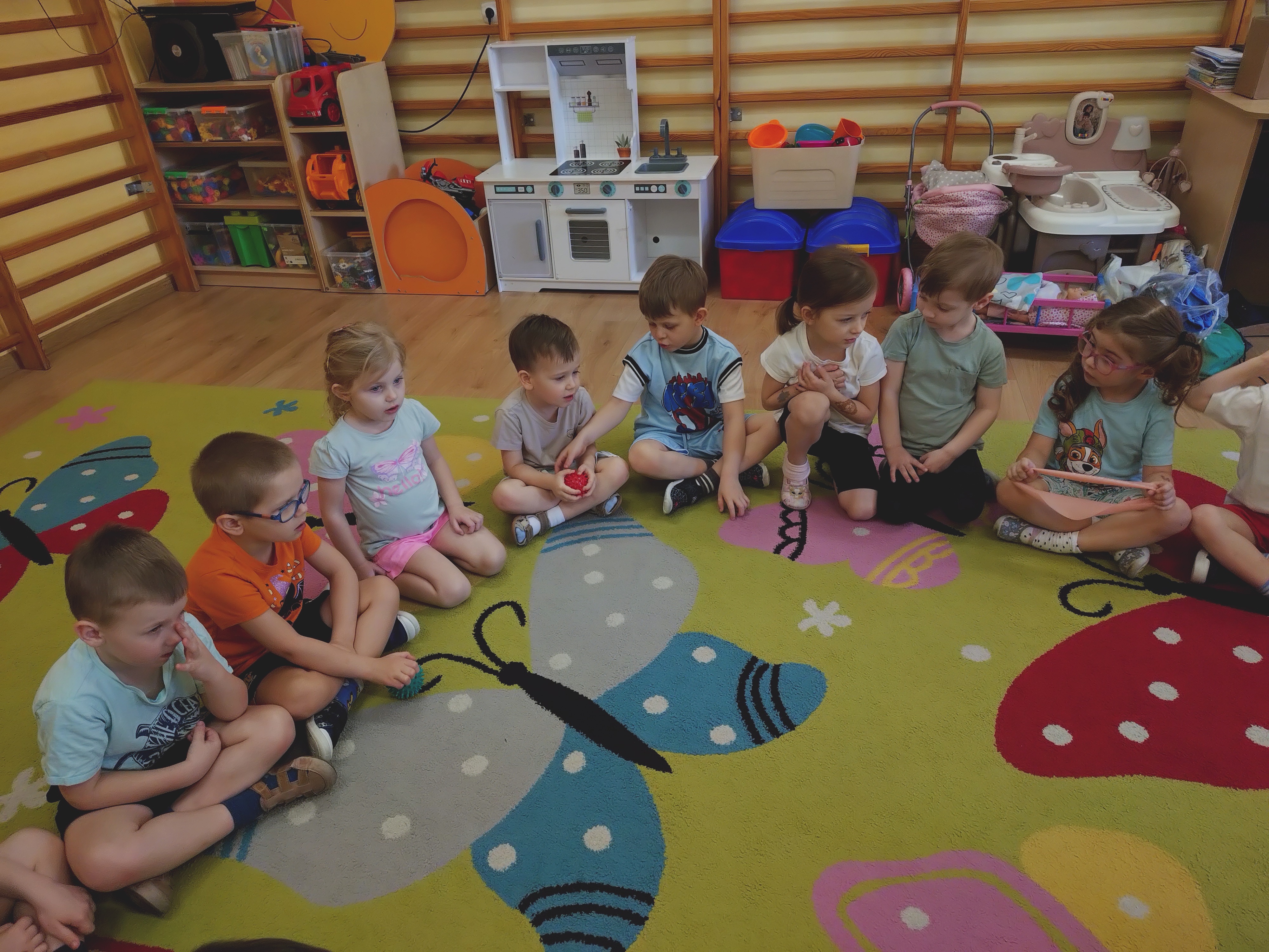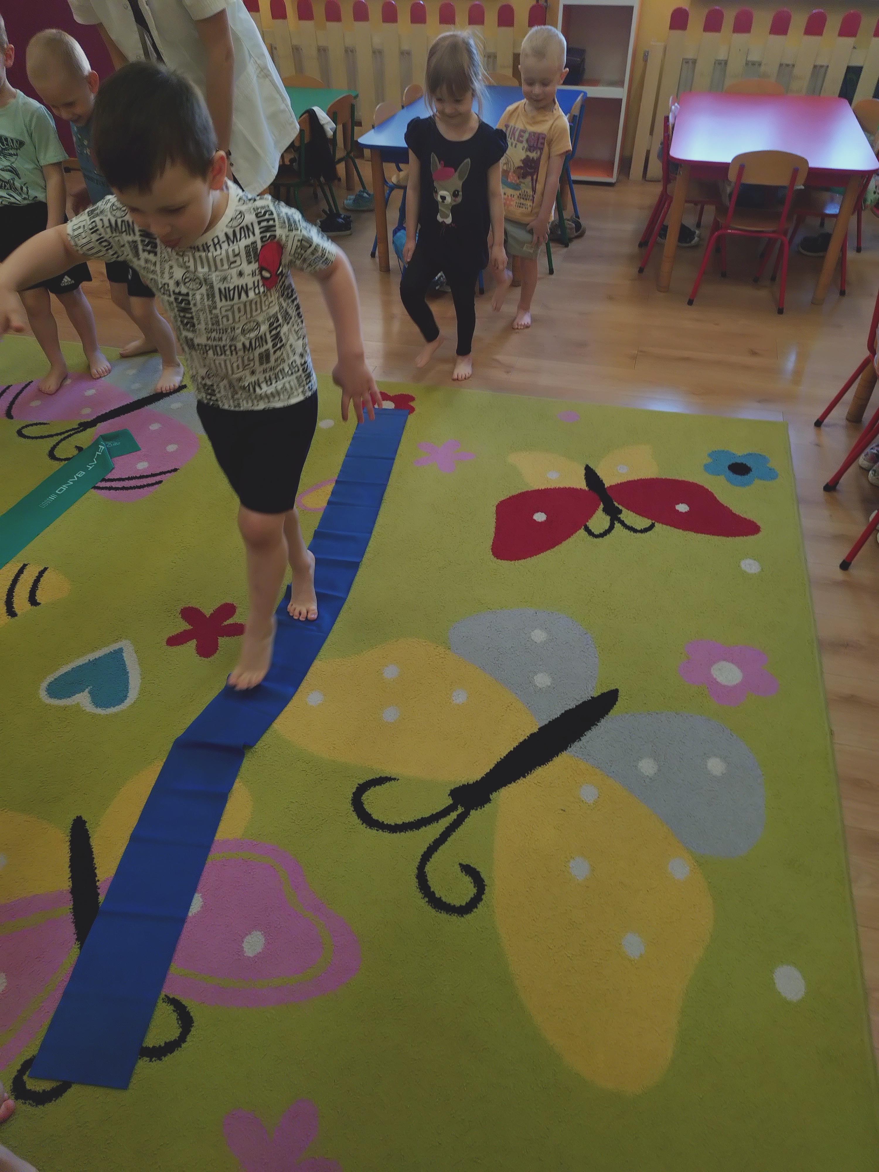 Elfy dowiedziały się, że fizjoterapeuta to osoba, która przez ćwiczenia i różne zabiegi pomaga ludziom w poprawie sprawności ruchowej. Mieliśmy również okazję uczestniczyć w wielu ciekawych ćwiczeniach z wykorzystaniem atrakcyjnych pomocy. Najwięcej entuzjazmu wzbudził tor przeszkód i zawijanie w naleśnika. Choć mieliśmy troszkę kłopotów z czekaniem na swoją kolej, ze wszystkim poradziliśmy sobie doskonale. Ćwiczyliśmy z wielkim zaangażowaniem i radością. Na koniec, podziękowaliśmy naszemu Gościowi śpiewem piosenki i wręczyliśmy pamiątkową tabliczkę Przyjaciela Przedszkola.