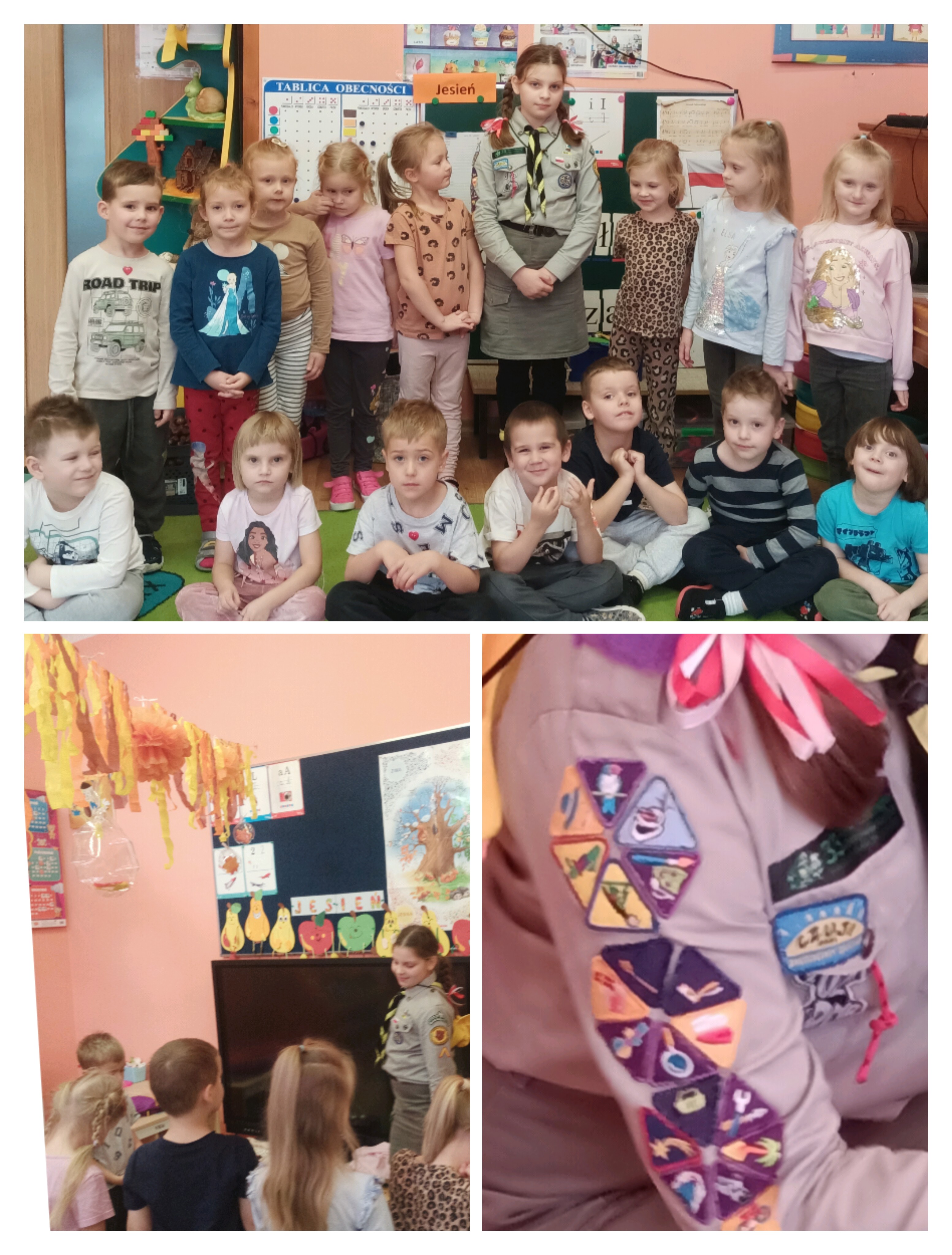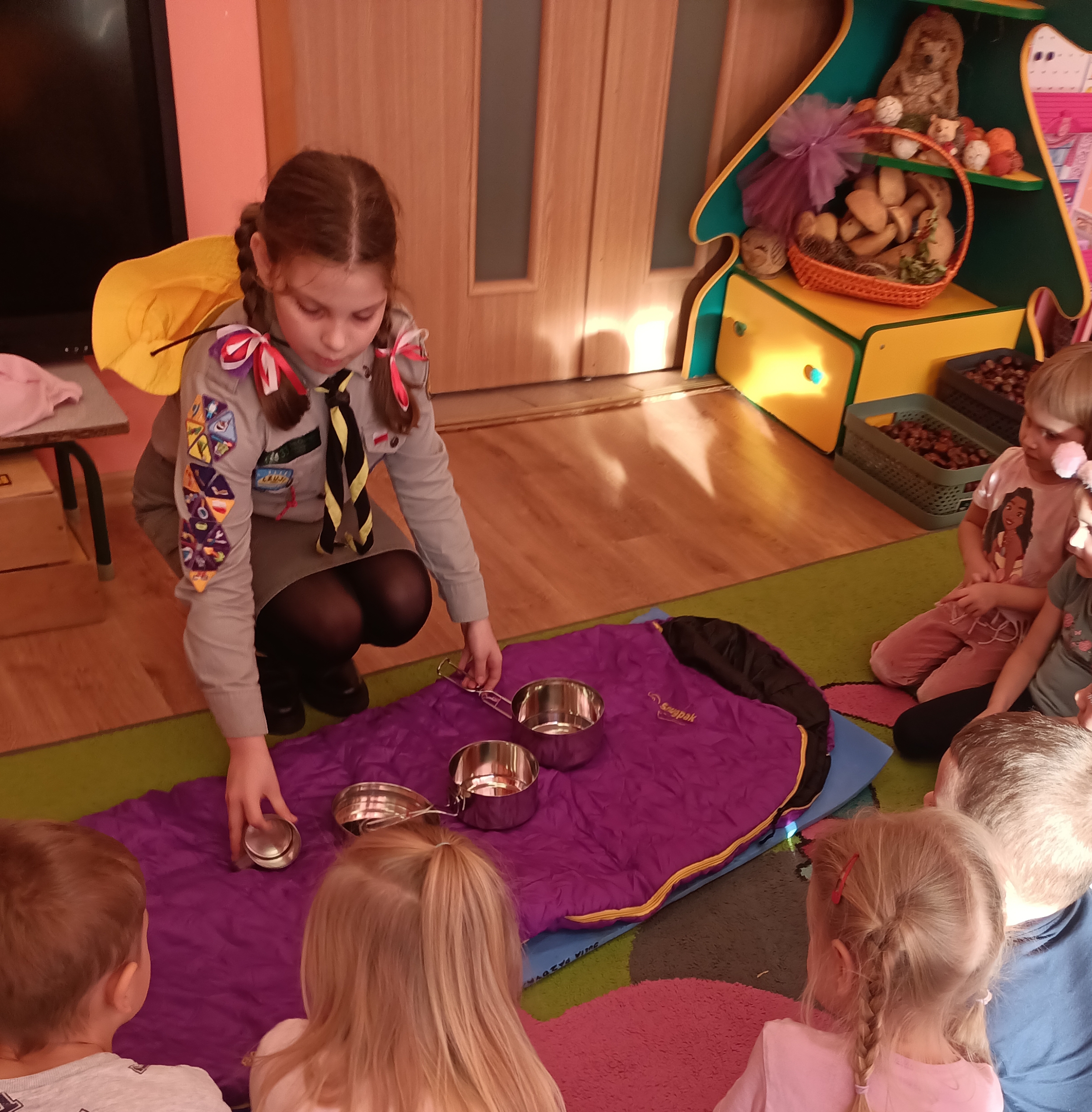 Julia wyjaśniła również, czym są tropy i odznaki, które zuchy mogą zdobywać, wykazując się wiedzą, umiejętnościami oraz wykonując poszczególne zadania. Dzięki temu dzieci dowiedziały się, że w zuchowej przygodzie ważna jest współpraca, dobra zabawa i systematyczne dążenie do celu.