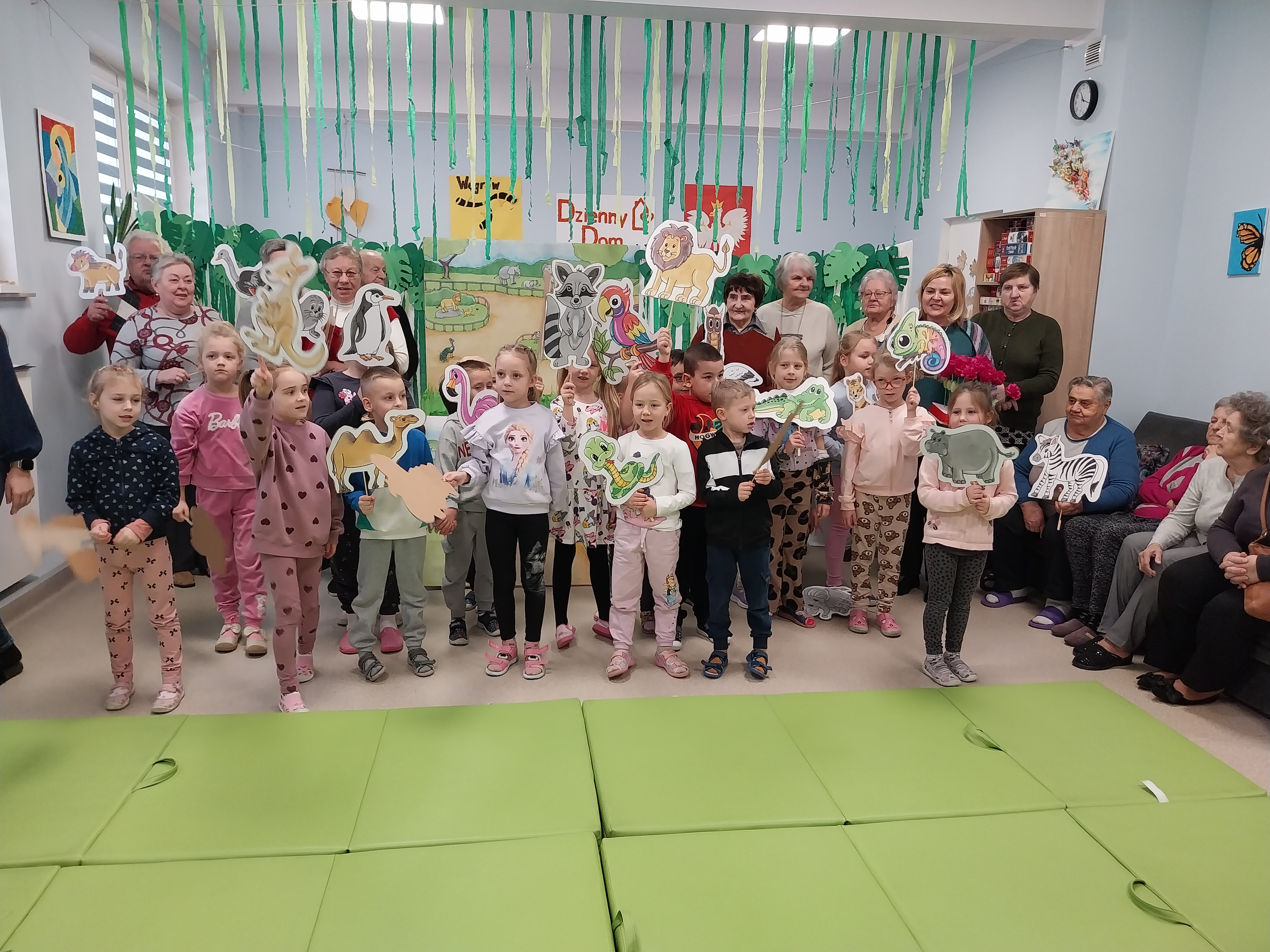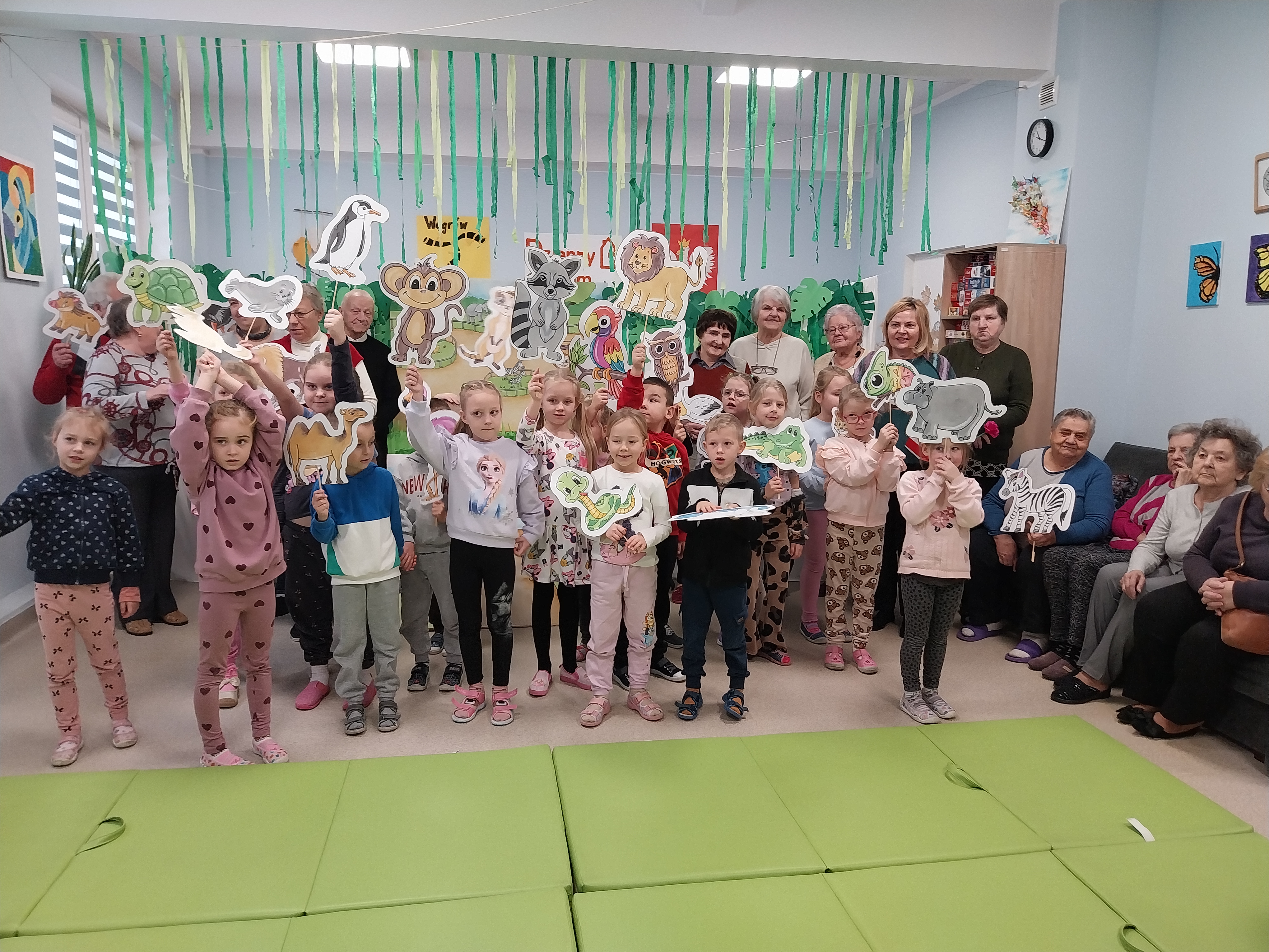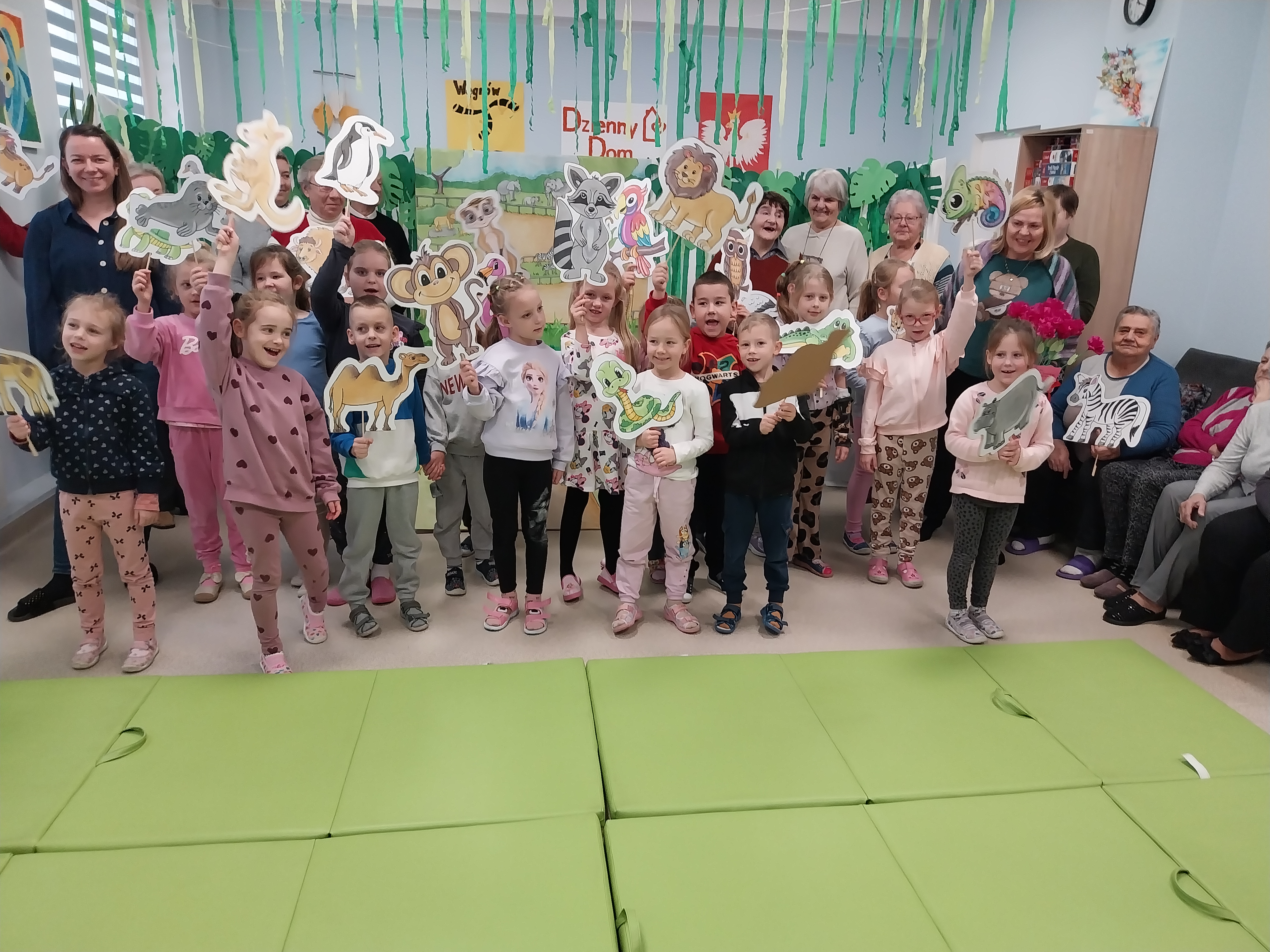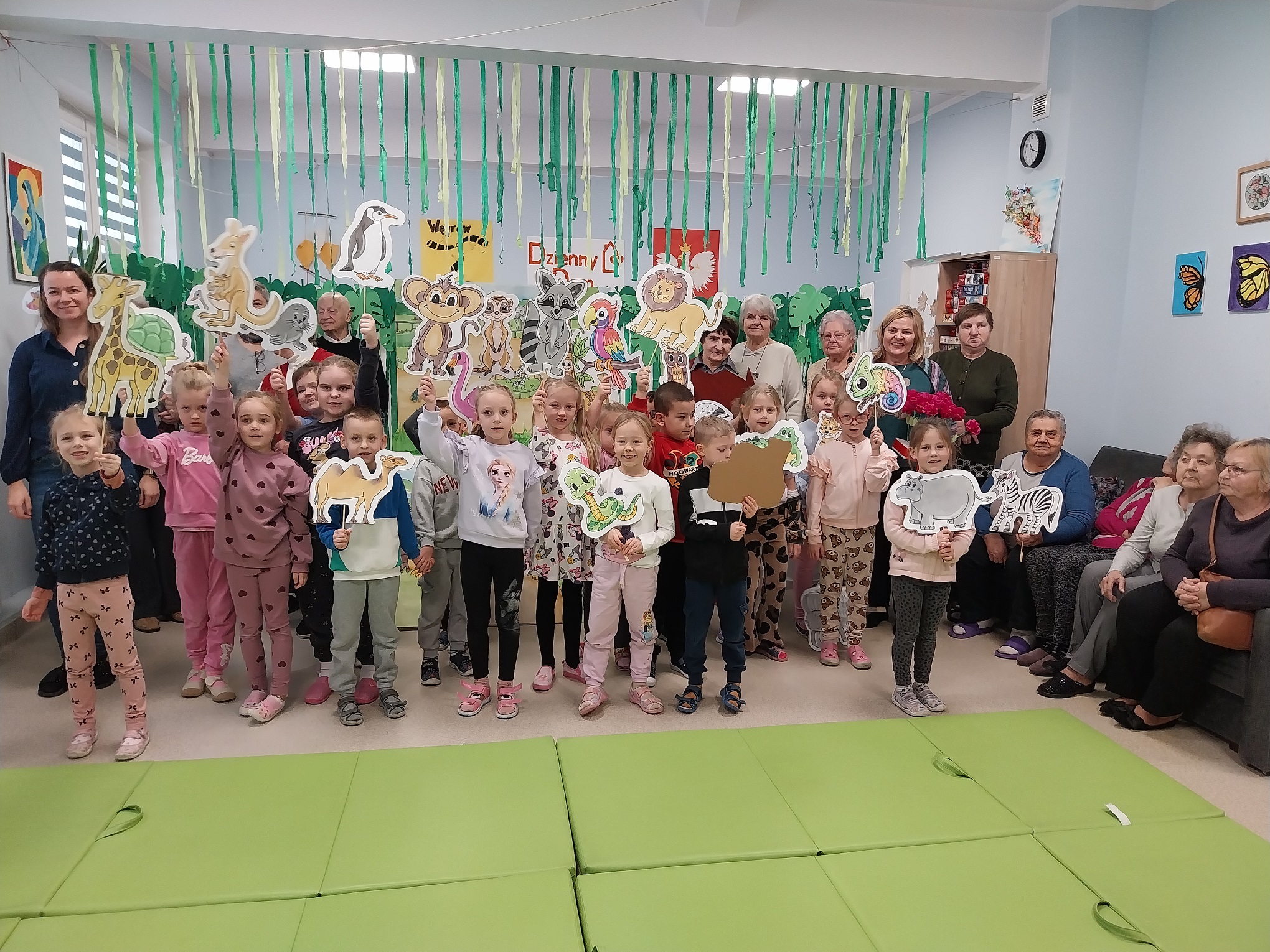 Dnia 24.11.2025 r. spacerkiem udaliśmy się do Dziennego Domu Senior + . Była to kolejna nasza wizyta . Wcześniej to my zrobiliśmy niespodziankę, prezentując koncert jesienny z okazji Dnia Osób Starszych od nas. Tym razem dostaliśmy zaproszenie na przedstawienie teatralne pt.: "Wycieczka do ZOO" . Artyści spisali się na medal! Dzieci z uwagą obejrzały spektakl i obdarowały występujących gromkimi brawami. Z wielkim zaangażowaniem uczestniczyły w zabawie "Zgaduj- zgadula" oraz w przygotowanych atrakcjach . Było to bardzo miłe spotkanie. Wspólnie spędzony czas, integracja oraz wzmocnienie więzi międzypokoleniowych. Bardzo dziękujemy!