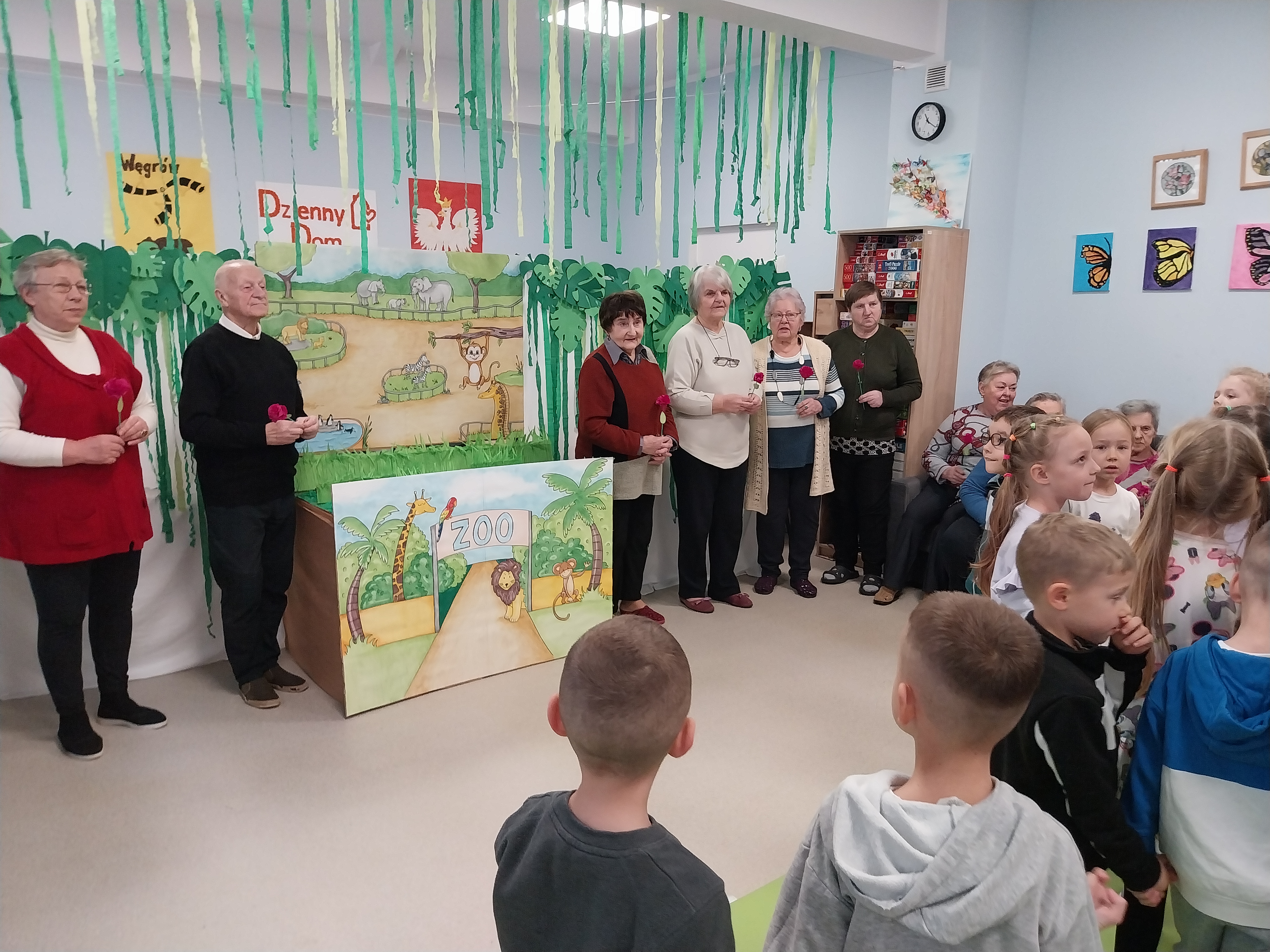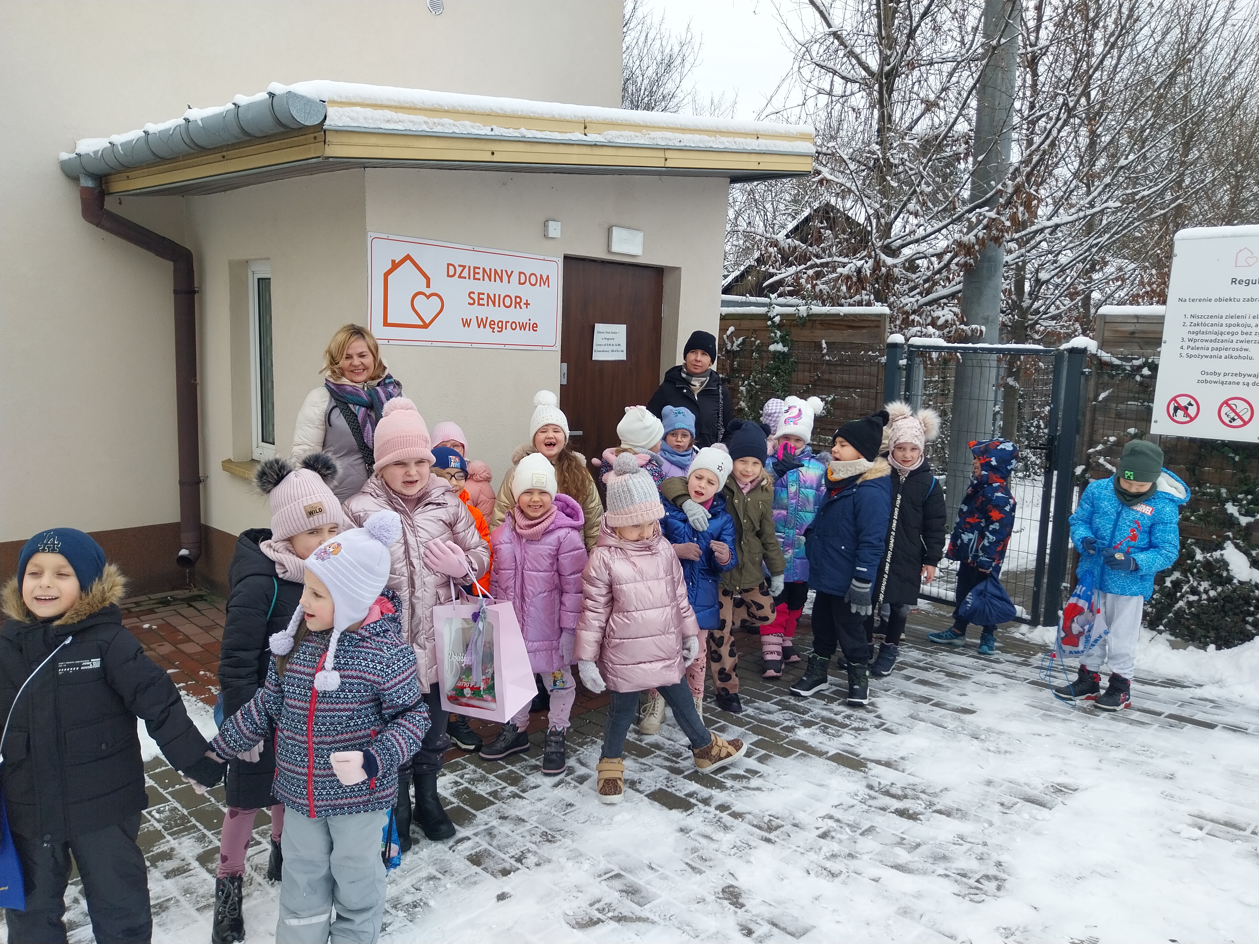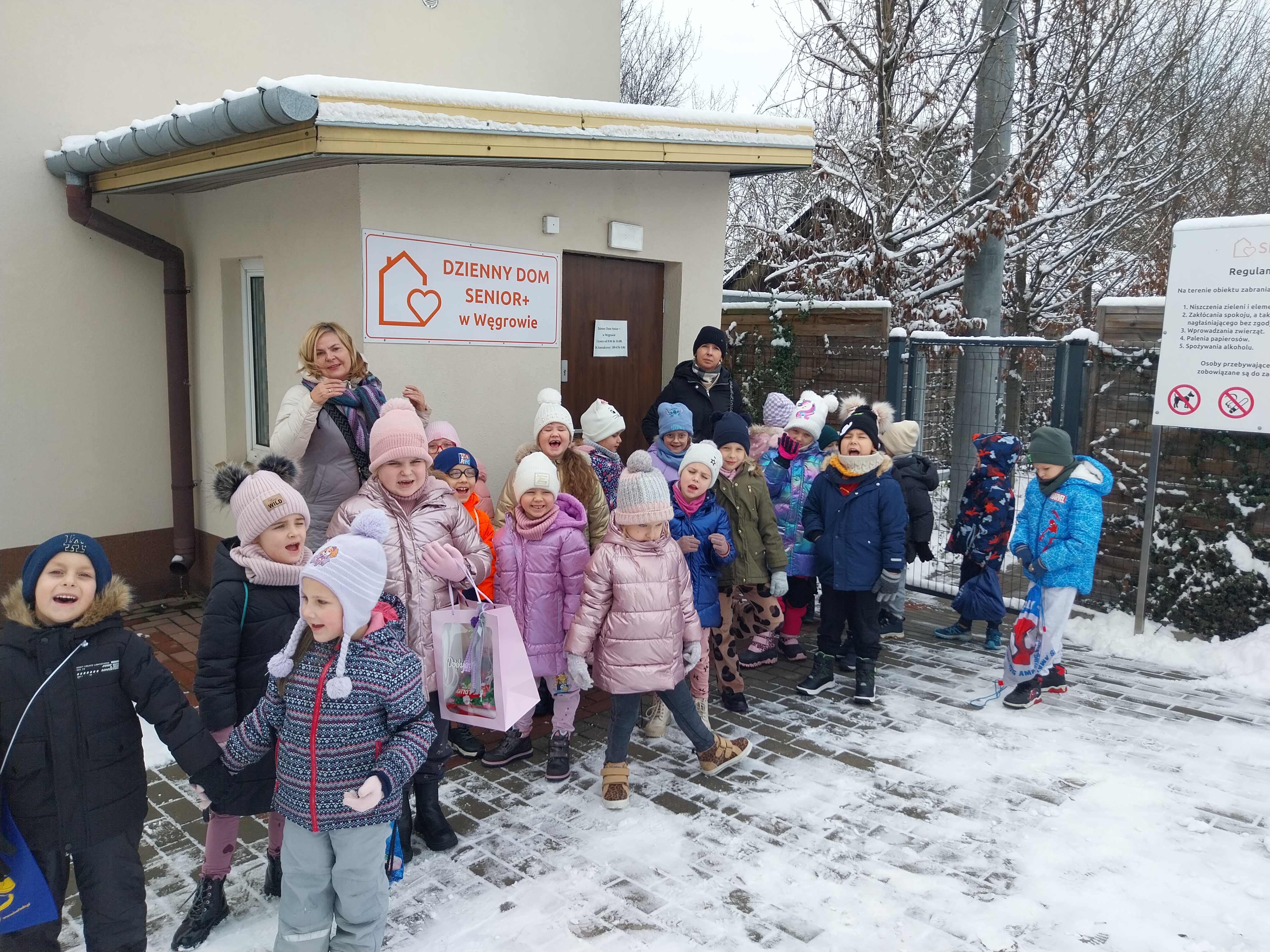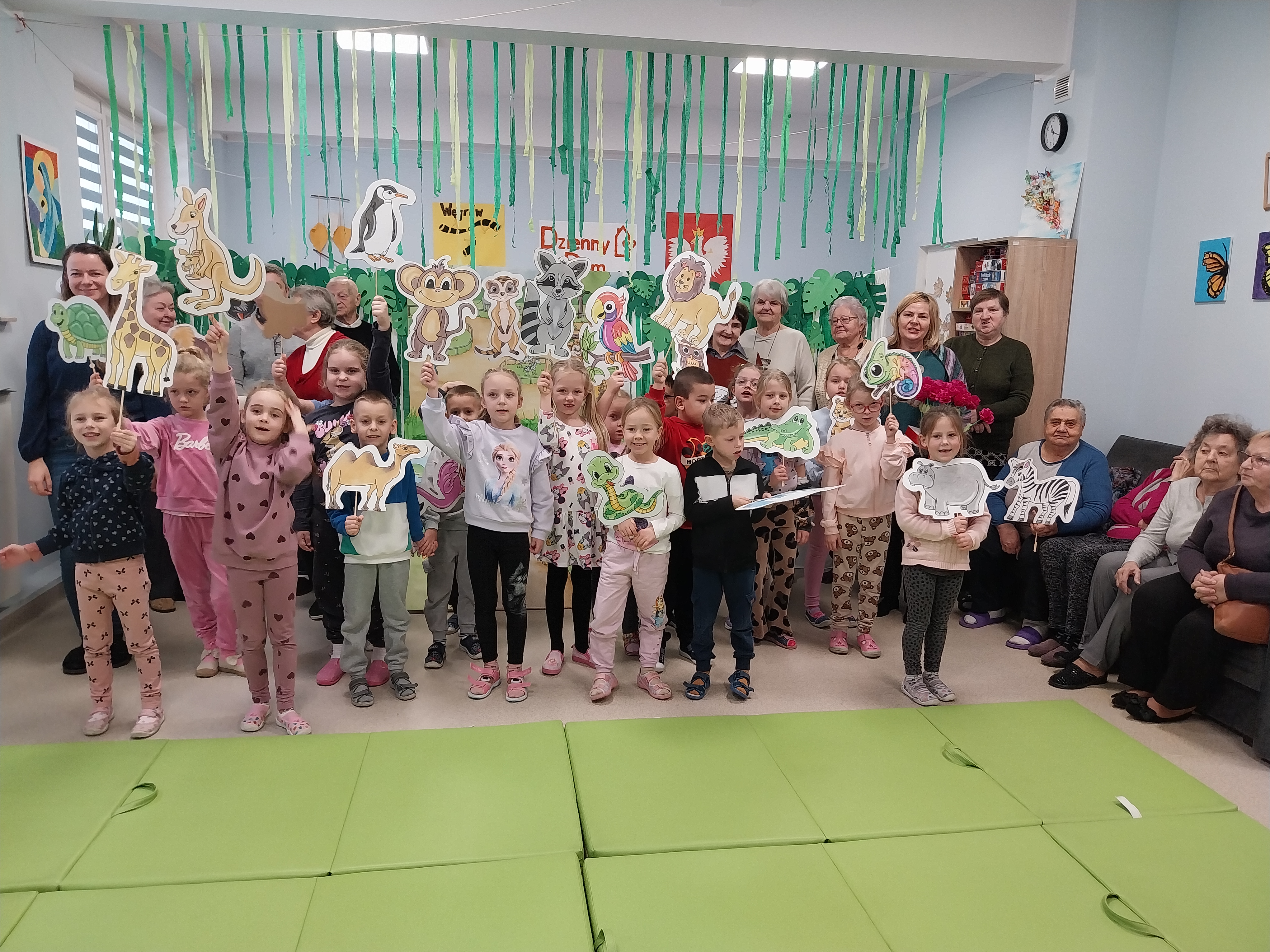 Dnia 24.11.2025 r. spacerkiem udaliśmy się do Dziennego Domu Senior + . Była to kolejna nasza wizyta . Wcześniej to my zrobiliśmy niespodziankę, prezentując koncert jesienny z okazji Dnia Osób Starszych od nas. Tym razem dostaliśmy zaproszenie na przedstawienie teatralne pt.: "Wycieczka do ZOO" . Artyści spisali się na medal! Dzieci z uwagą obejrzały spektakl i obdarowały występujących gromkimi brawami. Z wielkim zaangażowaniem uczestniczyły w zabawie "Zgaduj- zgadula" oraz w przygotowanych atrakcjach . Było to bardzo miłe spotkanie. Wspólnie spędzony czas, integracja oraz wzmocnienie więzi międzypokoleniowych. Bardzo dziękujemy!