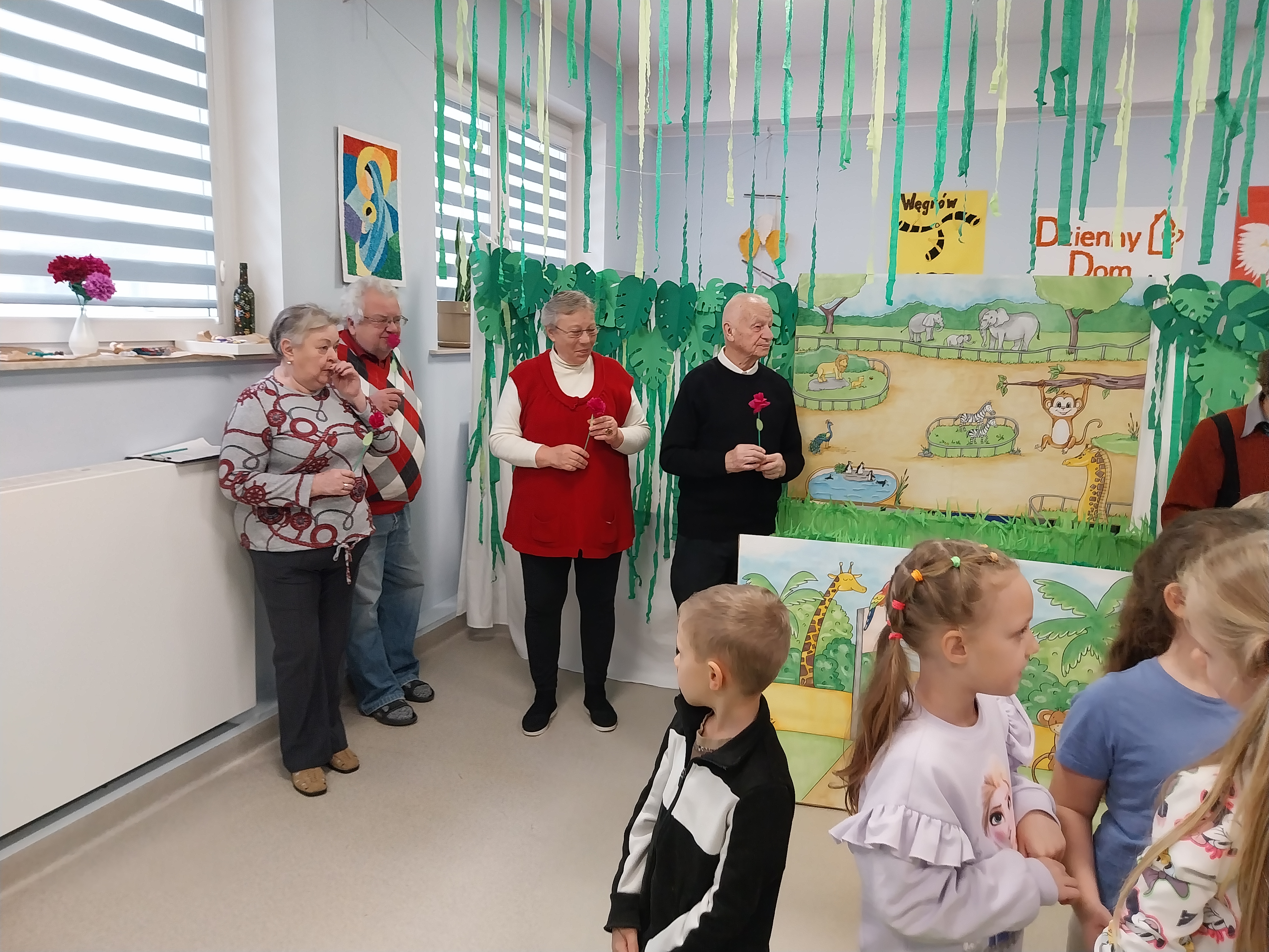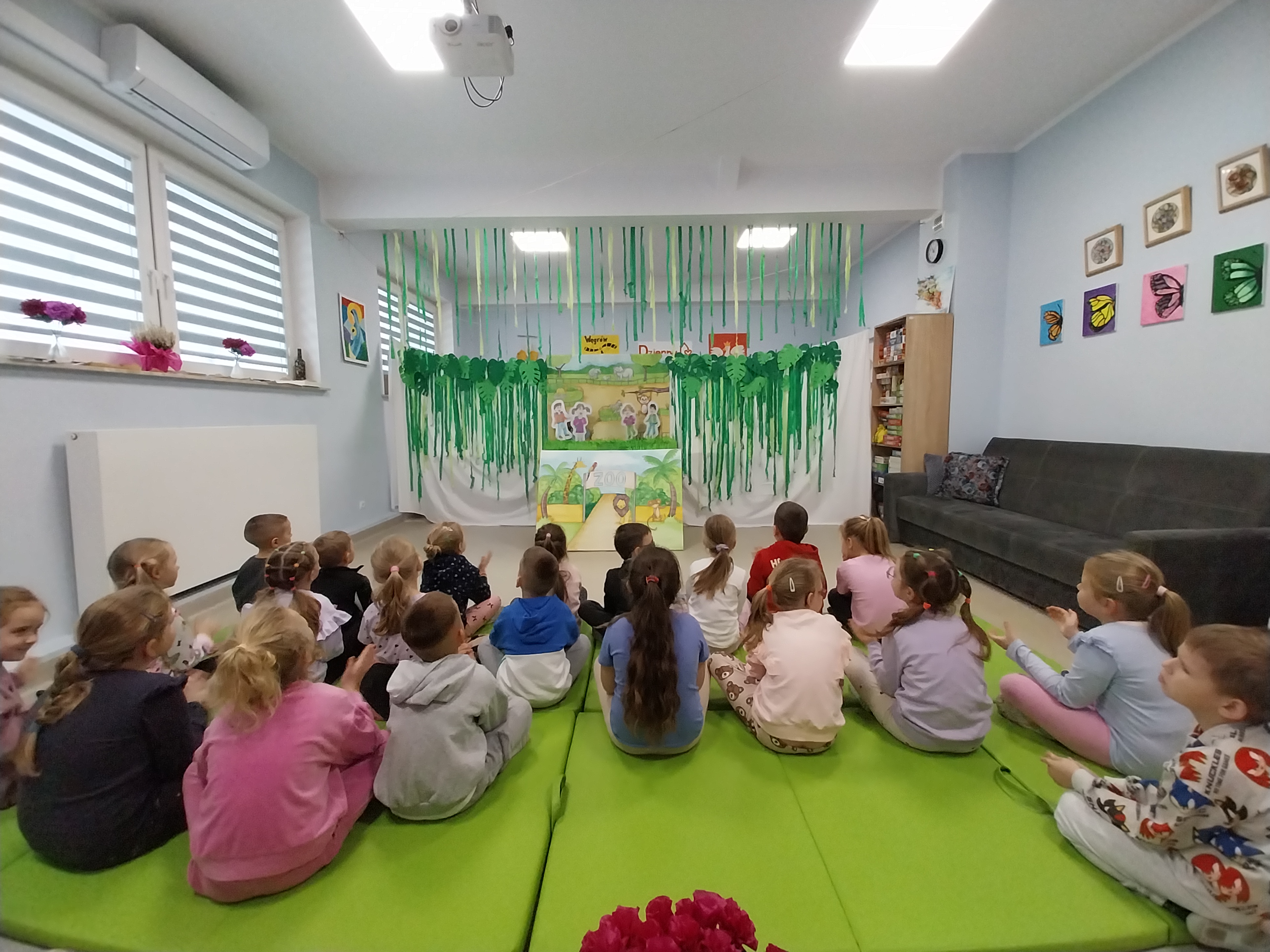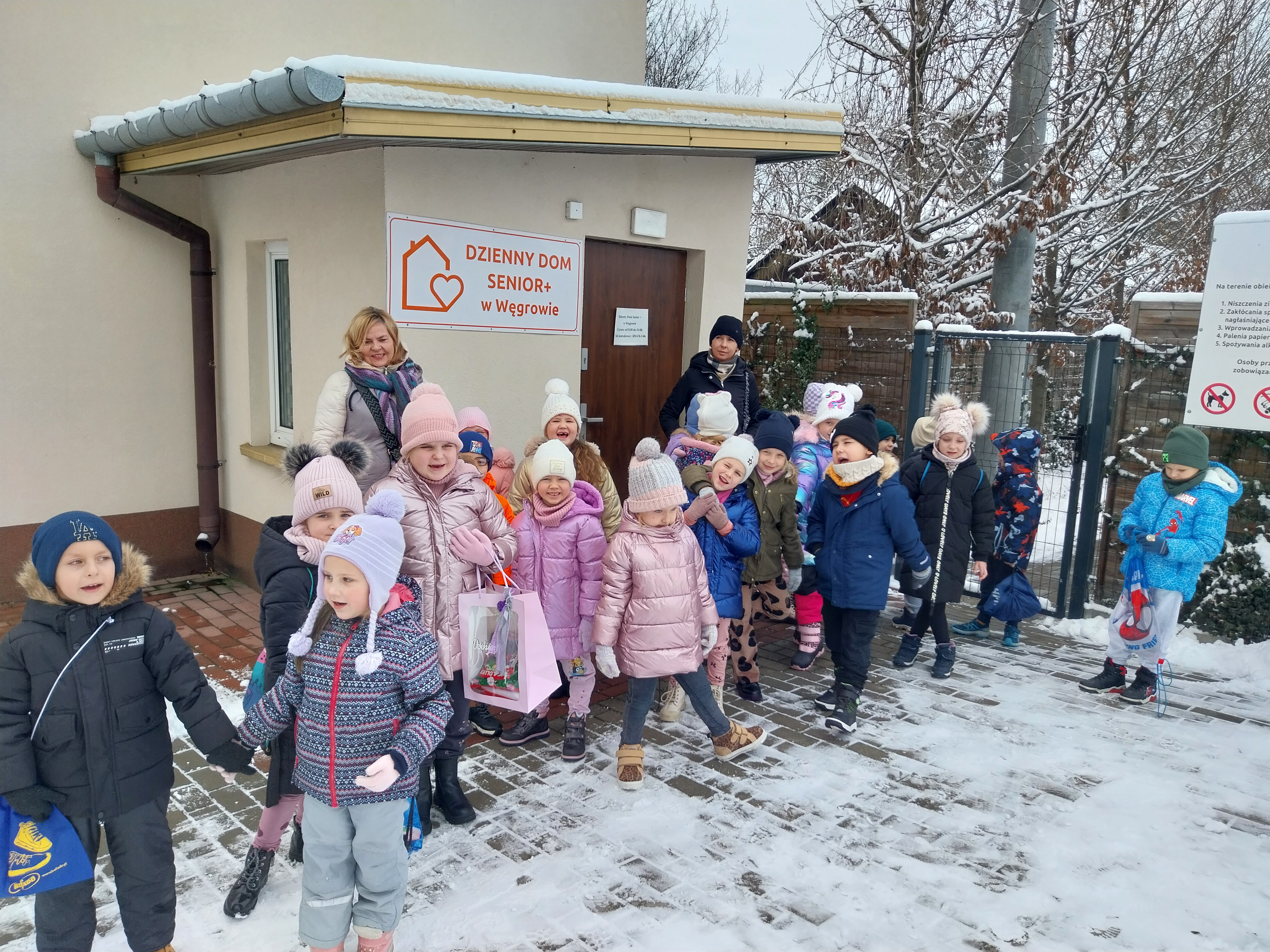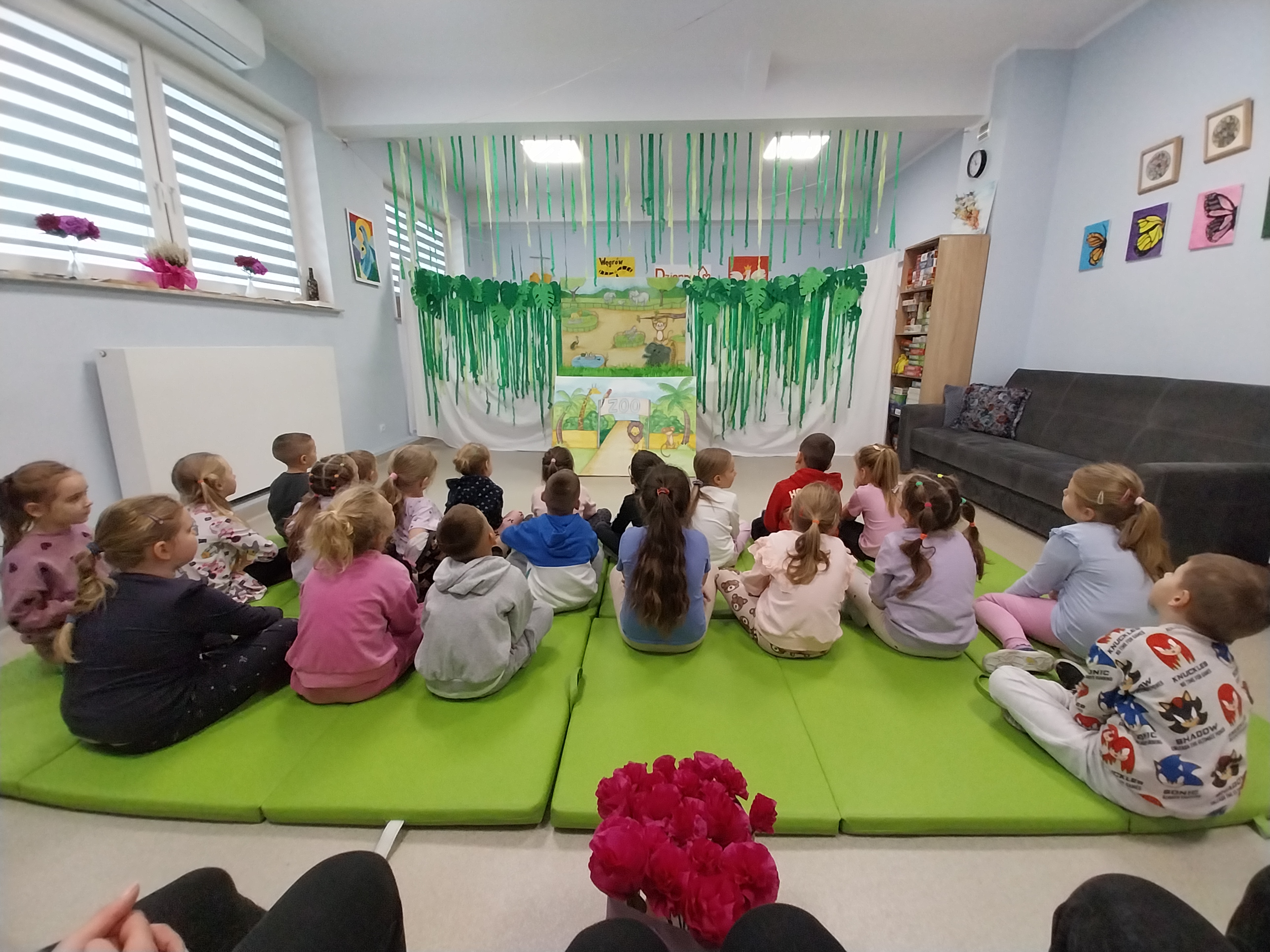Dnia 24.11.2025 r. spacerkiem udaliśmy się do Dziennego Domu Senior + . Była to kolejna nasza wizyta . Wcześniej to my zrobiliśmy niespodziankę, prezentując koncert jesienny z okazji Dnia Osób Starszych od nas. Tym razem dostaliśmy zaproszenie na przedstawienie teatralne pt.: "Wycieczka do ZOO" . Artyści spisali się na medal! Dzieci z uwagą obejrzały spektakl i obdarowały występujących gromkimi brawami. Z wielkim zaangażowaniem uczestniczyły w zabawie "Zgaduj- zgadula" oraz w przygotowanych atrakcjach . Było to bardzo miłe spotkanie. Wspólnie spędzony czas, integracja oraz wzmocnienie więzi międzypokoleniowych. Bardzo dziękujemy!