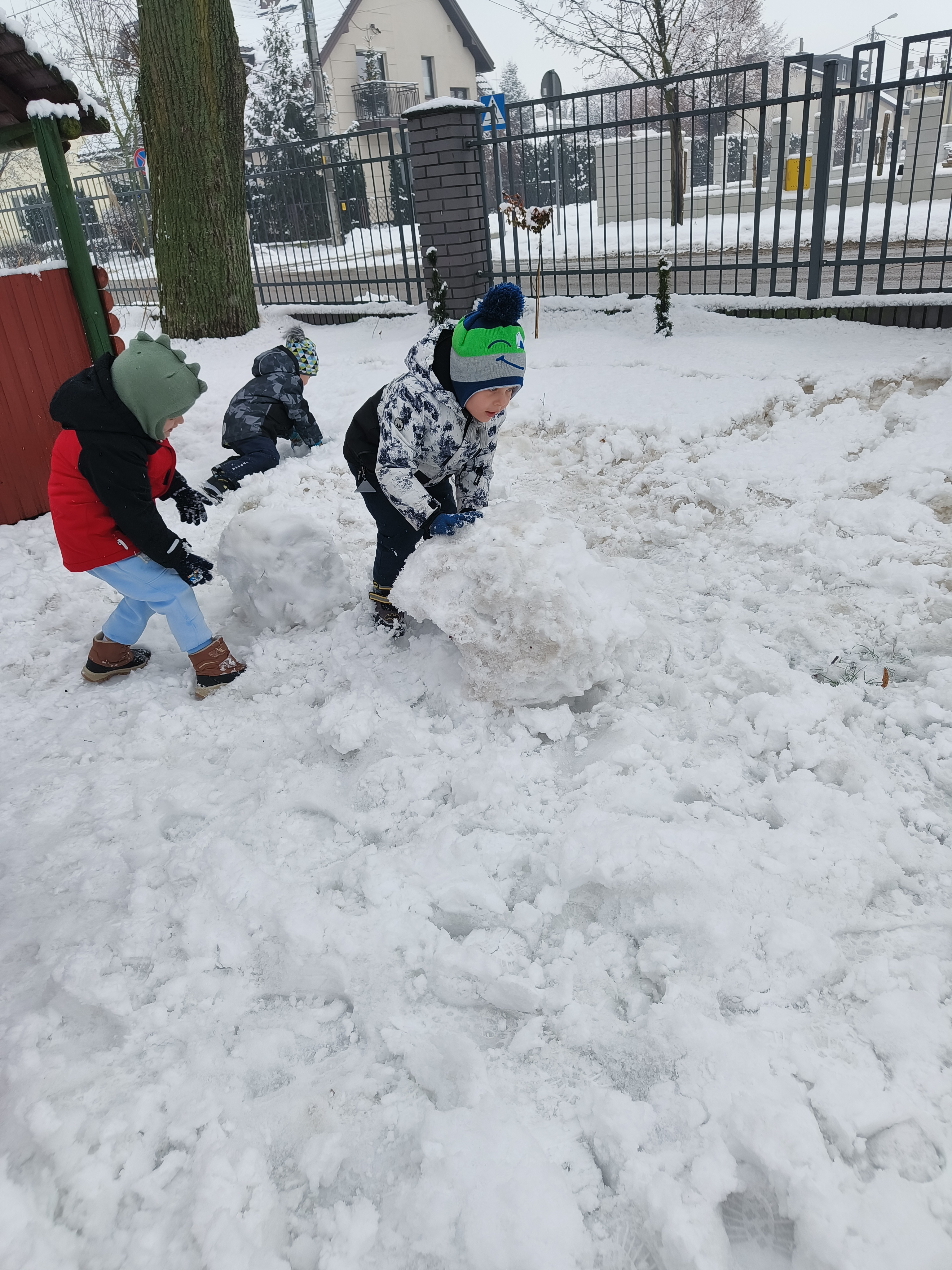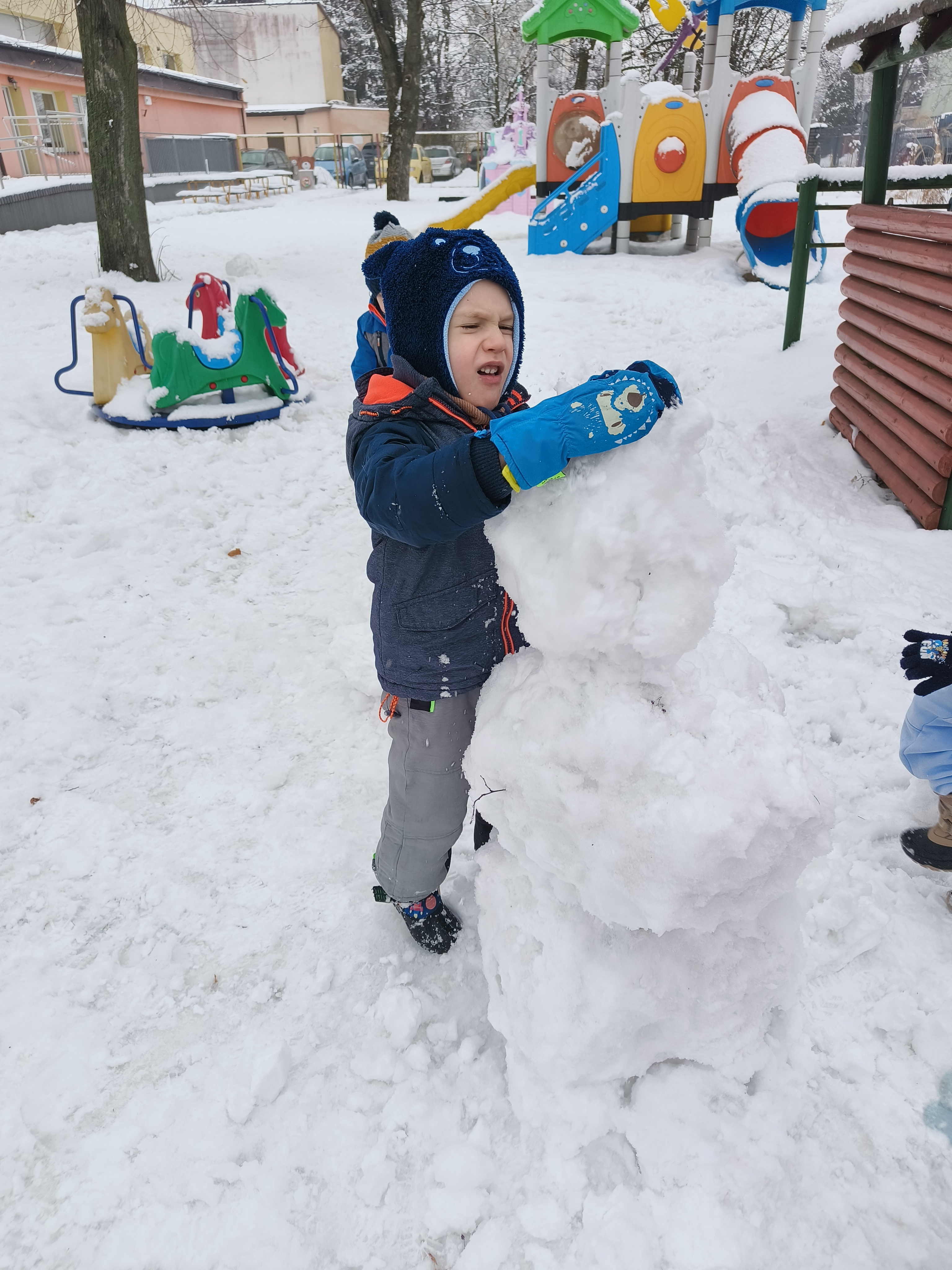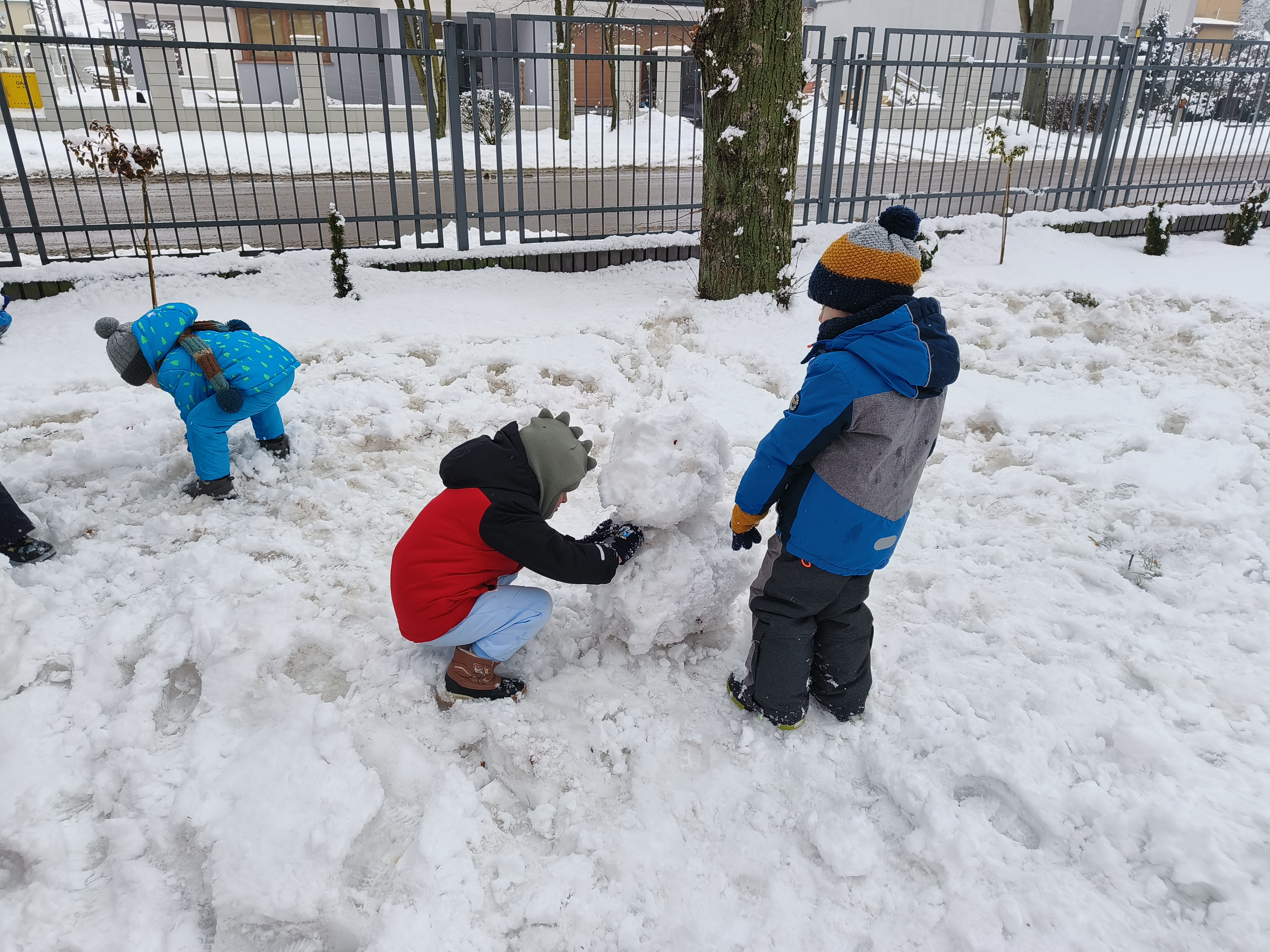 Zima to doskonały czas na aktywność na świeżym powietrzu i radosne zabawy na śniegu. Elfy korzystają z zimowej aury i wesoło spędzają czas na wspólnych zabawach – lepią bałwanki, rzucają śnieżkami oraz zjeżdżają na sankach. Nie brakuje również spacerów po zaśnieżonym terenie oraz rozmów o bezpieczeństwie. Zimowy czas sprzyja zarówno rozwijaniu sprawności fizycznej jak i integracji grupowej a radość płynąca z zabaw i uśmiechy na twarzach dzieci świadczą o tym jak wspaniale spędzają ten czas.