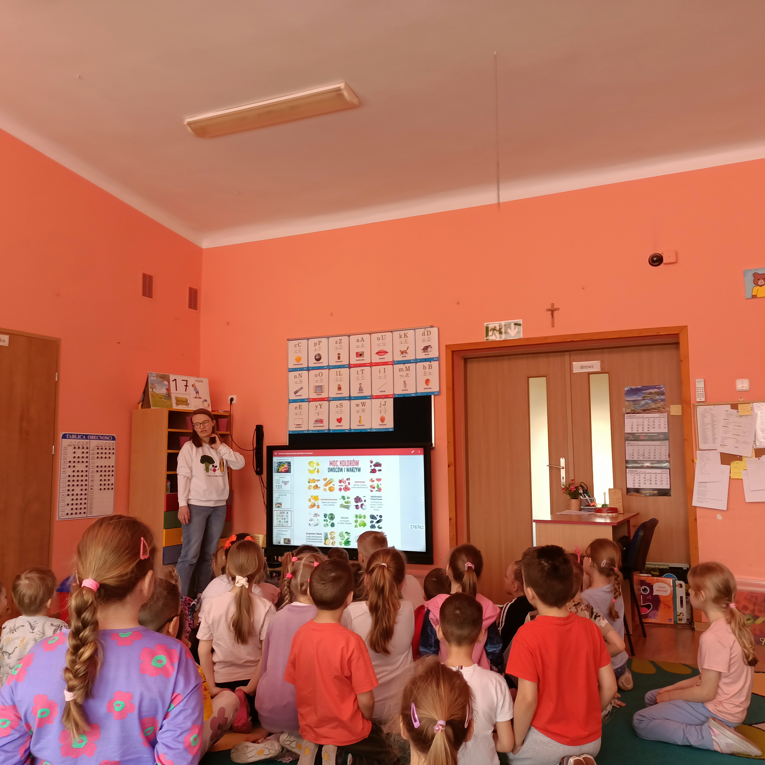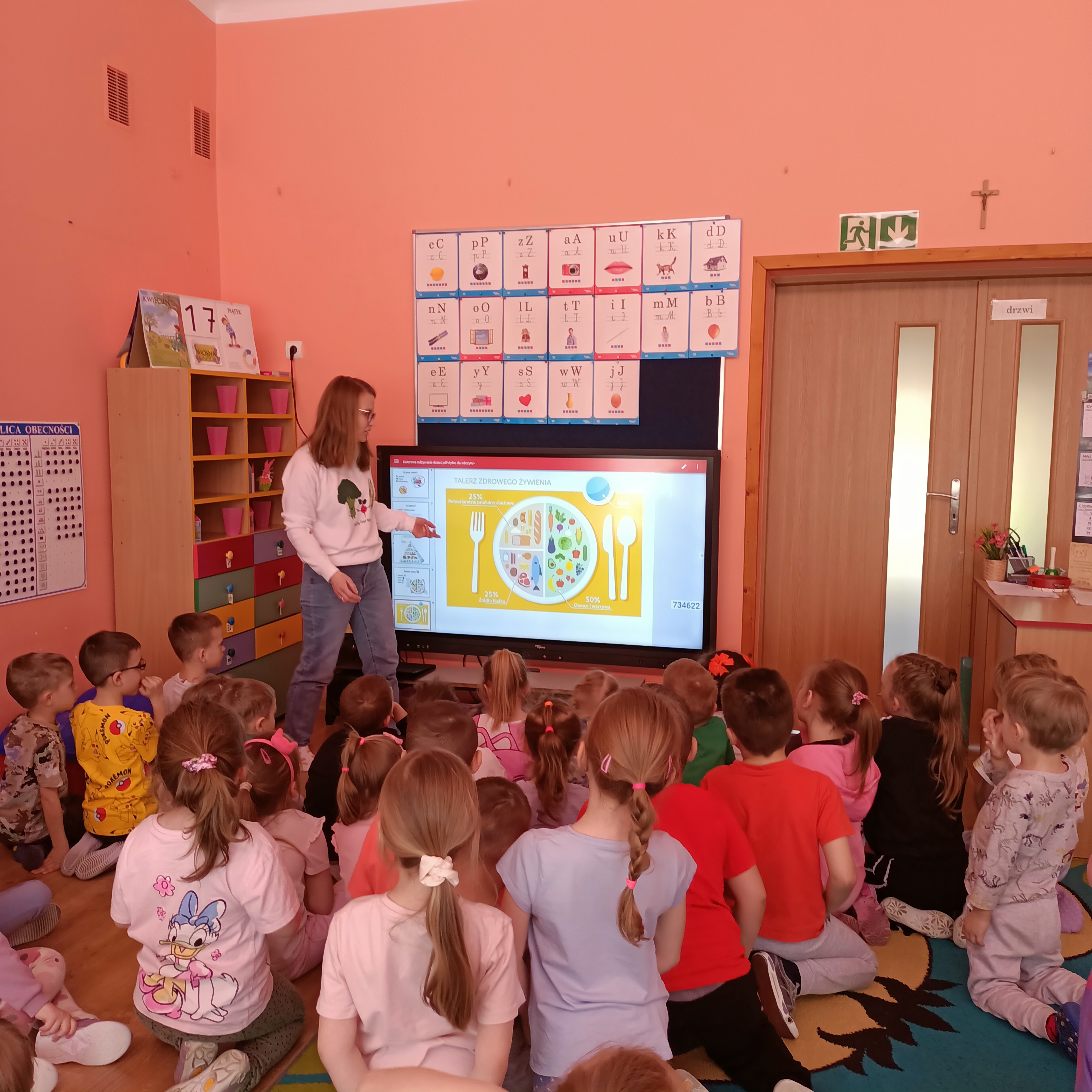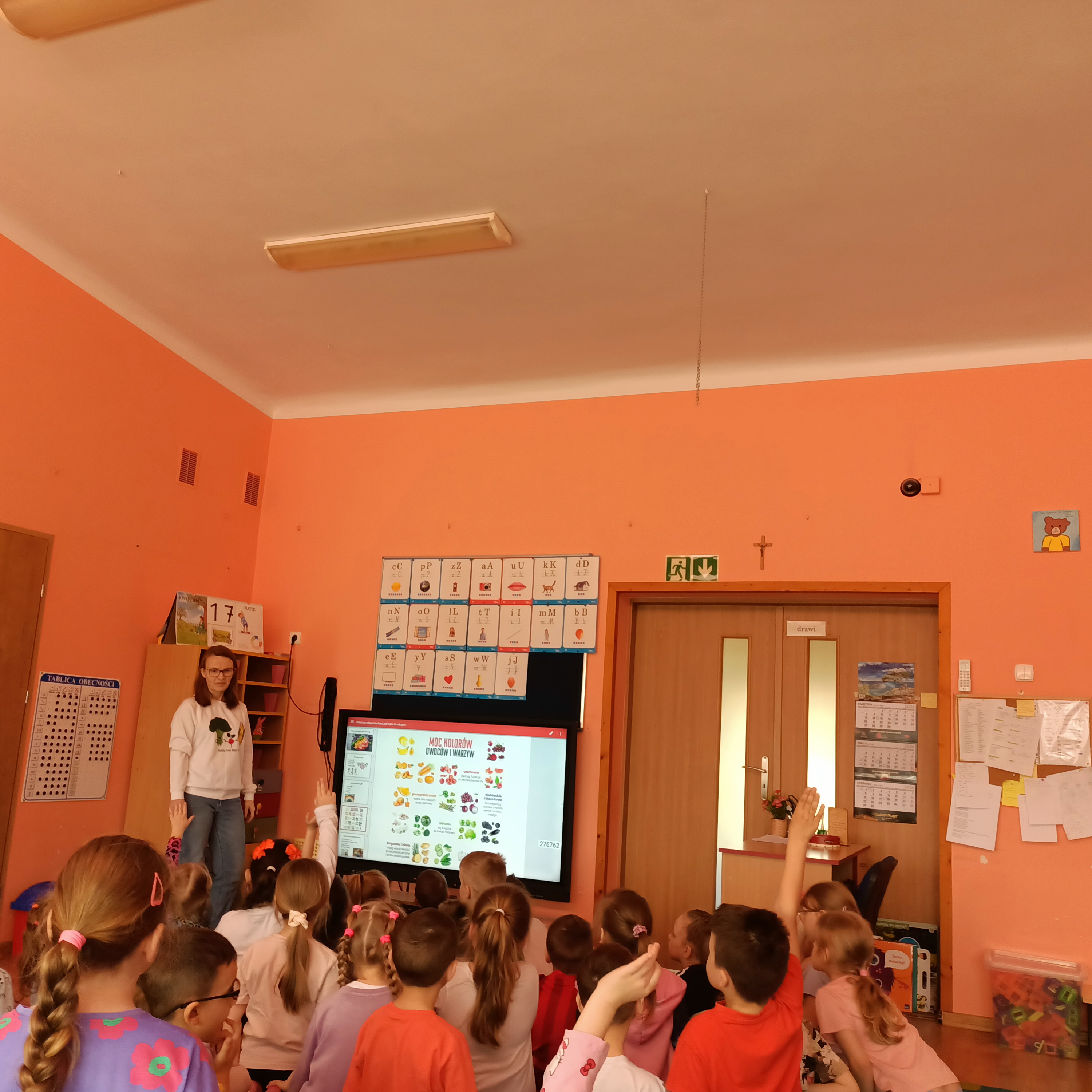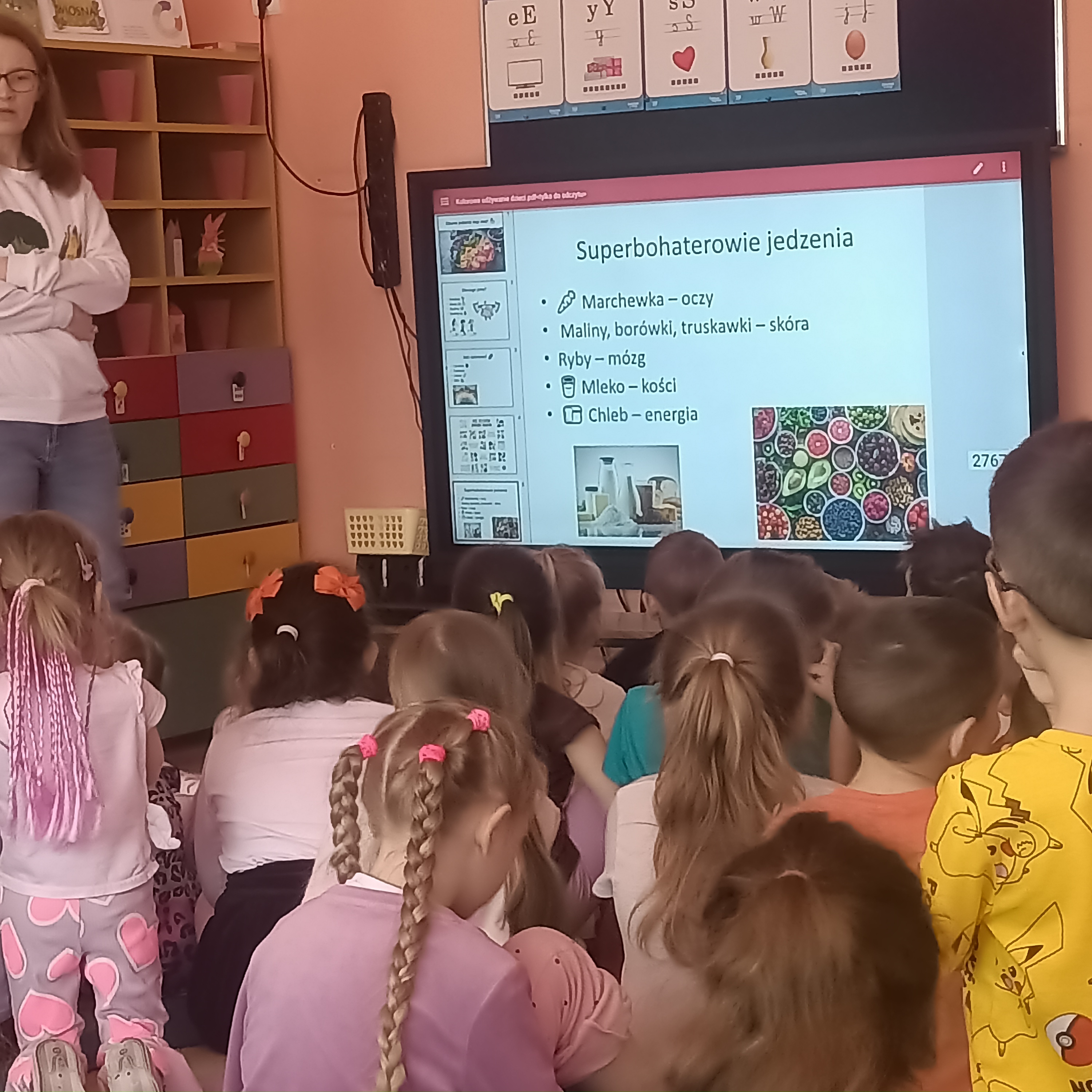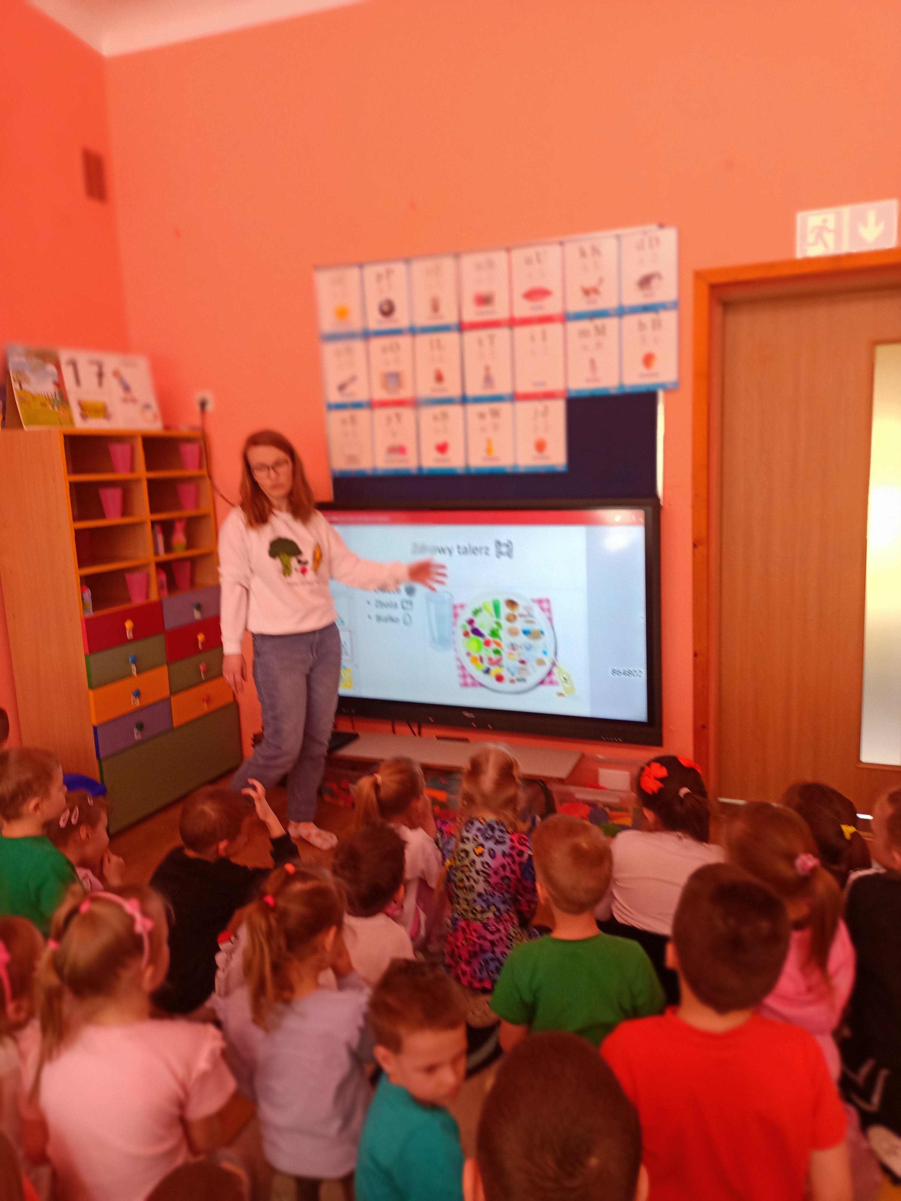 Podczas spotkania dzieci dowiedziały się, na czym polega praca dietetyka, poznały zasady zdrowego odżywiania oraz to, w jaki sposób żywność wpływa na nasze zdrowie i codzienne funkcjonowanie. Pani Paulina omówiła produkty żywnościowe – od najzdrowszych i najbardziej wartościowych po te, które powinny być spożywane w niewielkich ilościach.