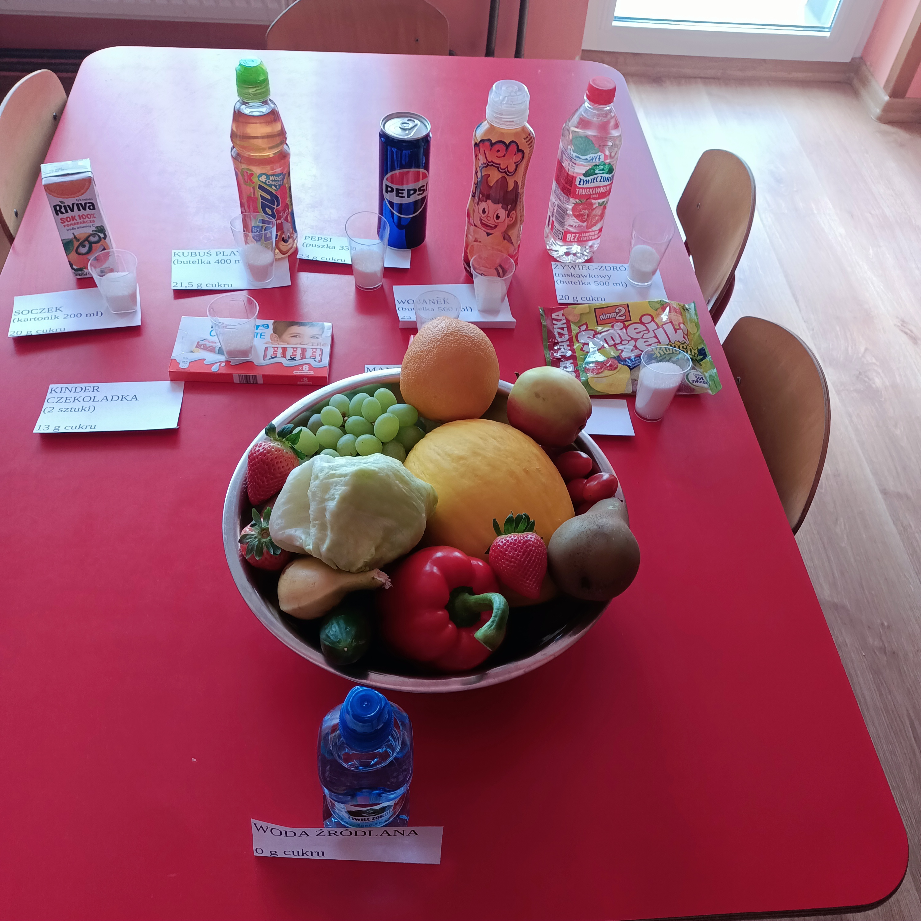 Pani dietetyk wyjaśniła dzieciom, dlaczego należy ograniczać słodycze i słodkie napoje w codziennej diecie, obrazując ilość cukru w najczęściej wybieranych produktach. Podkreśliła również, jak ważną rolę dla naszego zdrowia odgrywają owoce i warzywa.