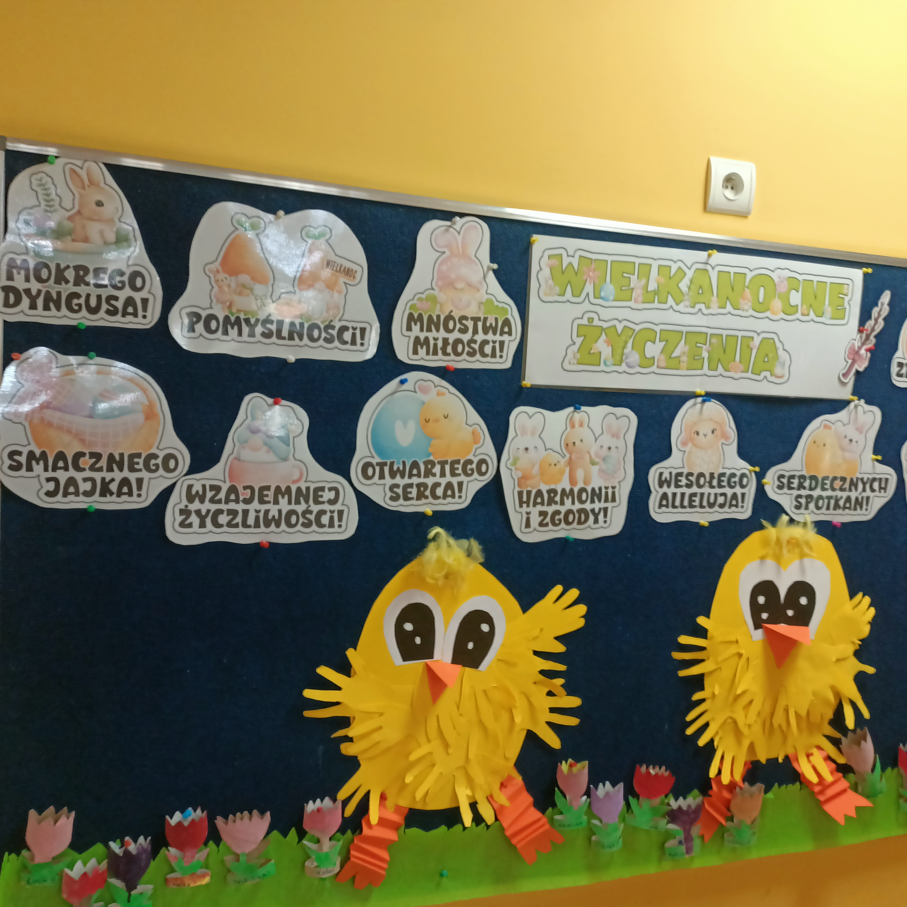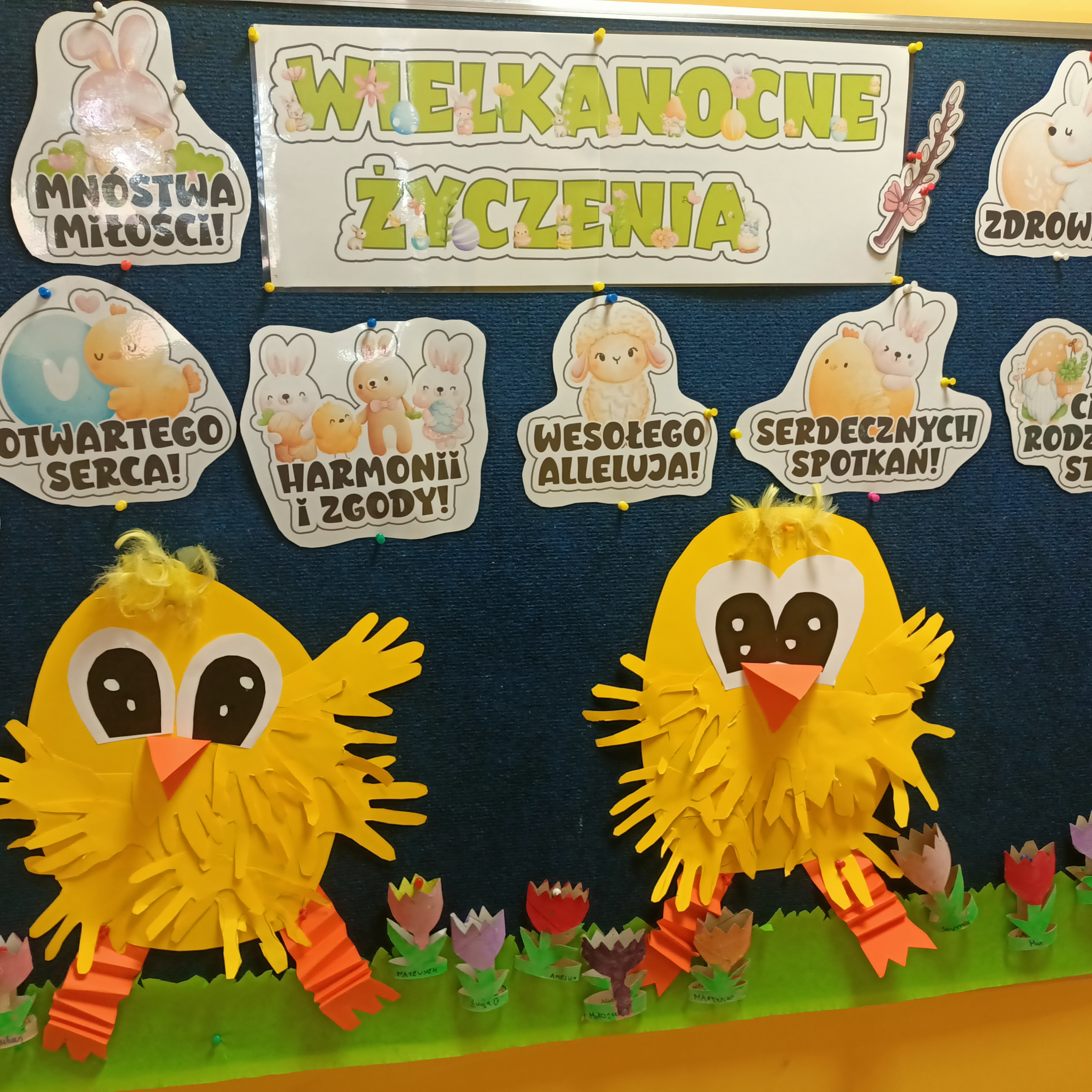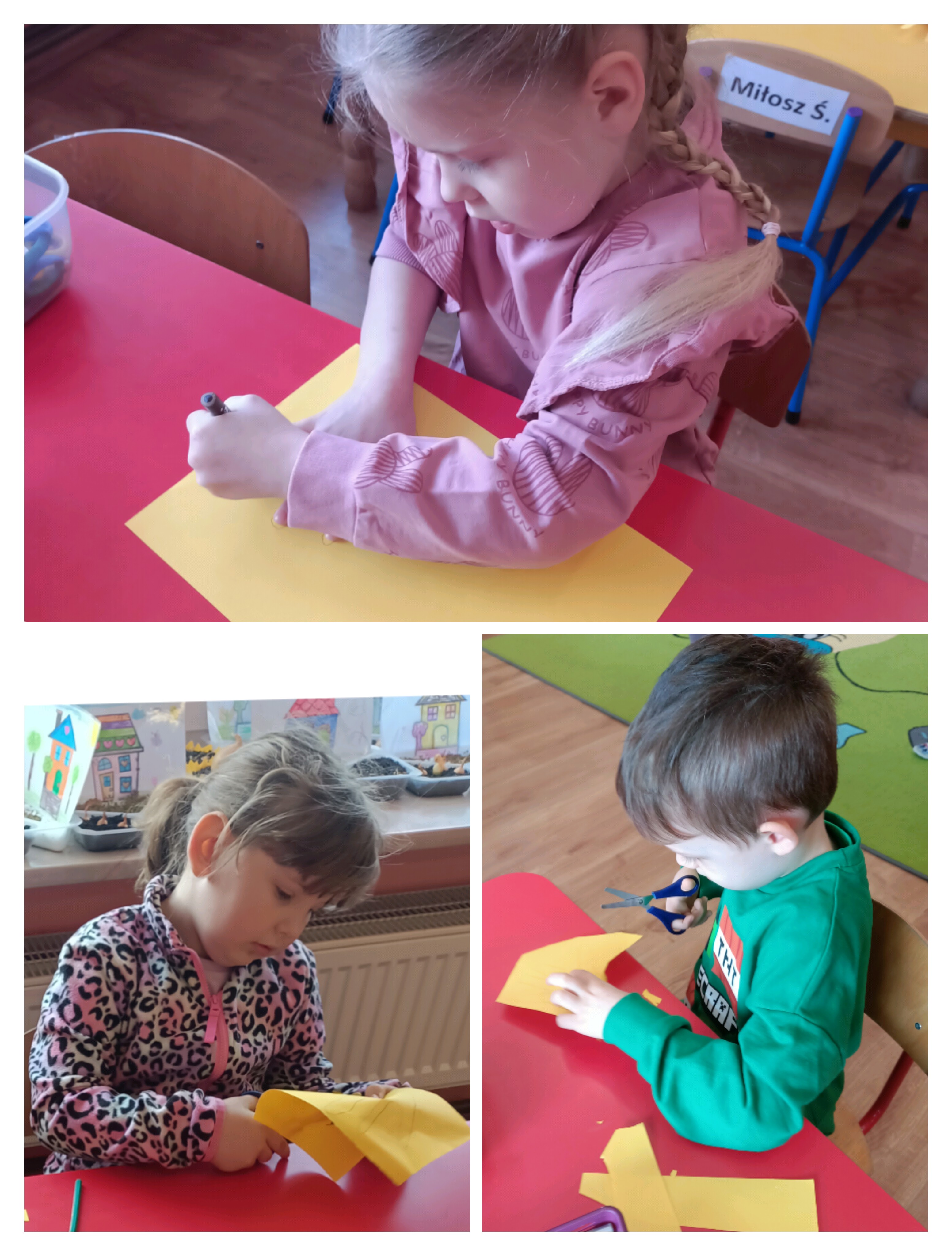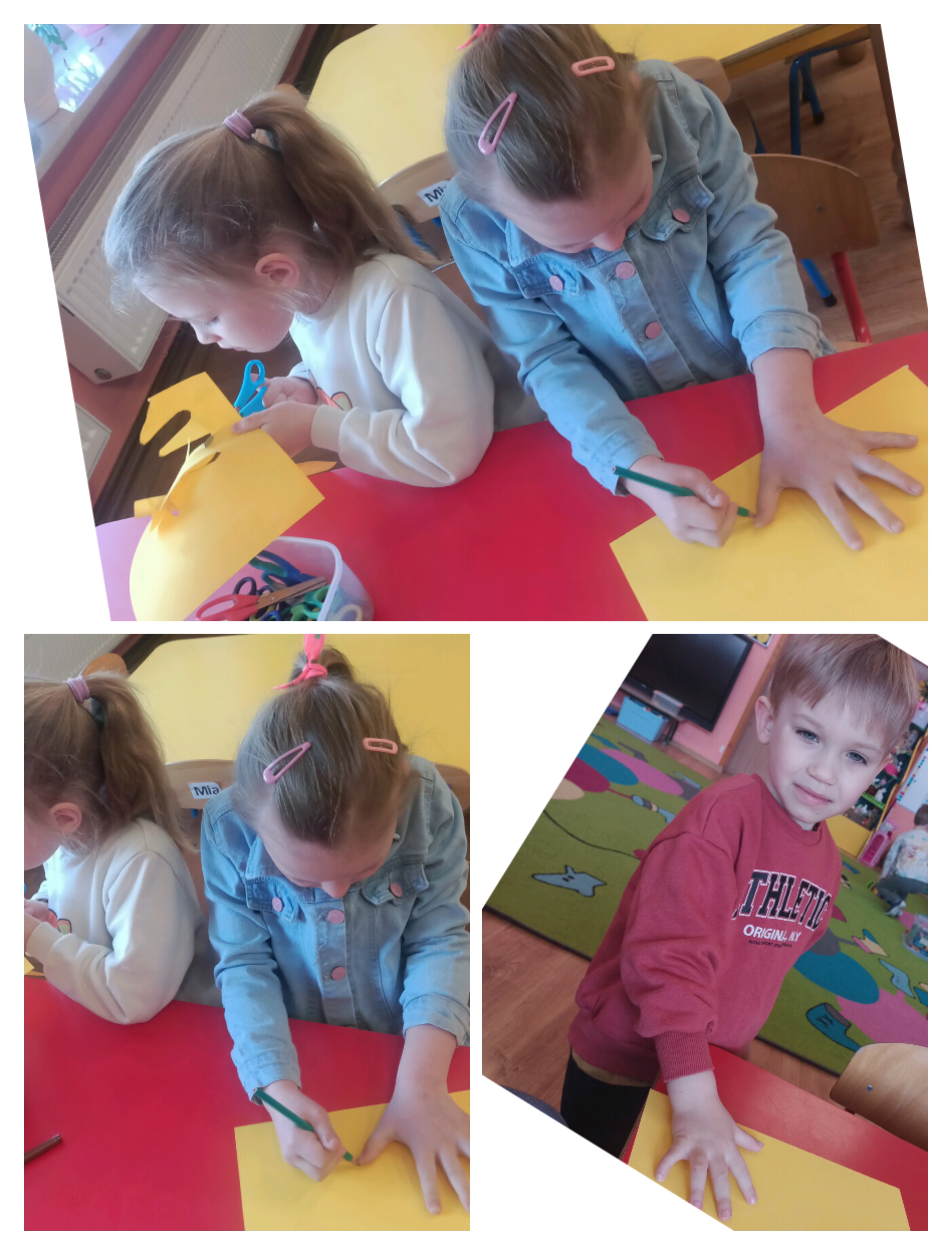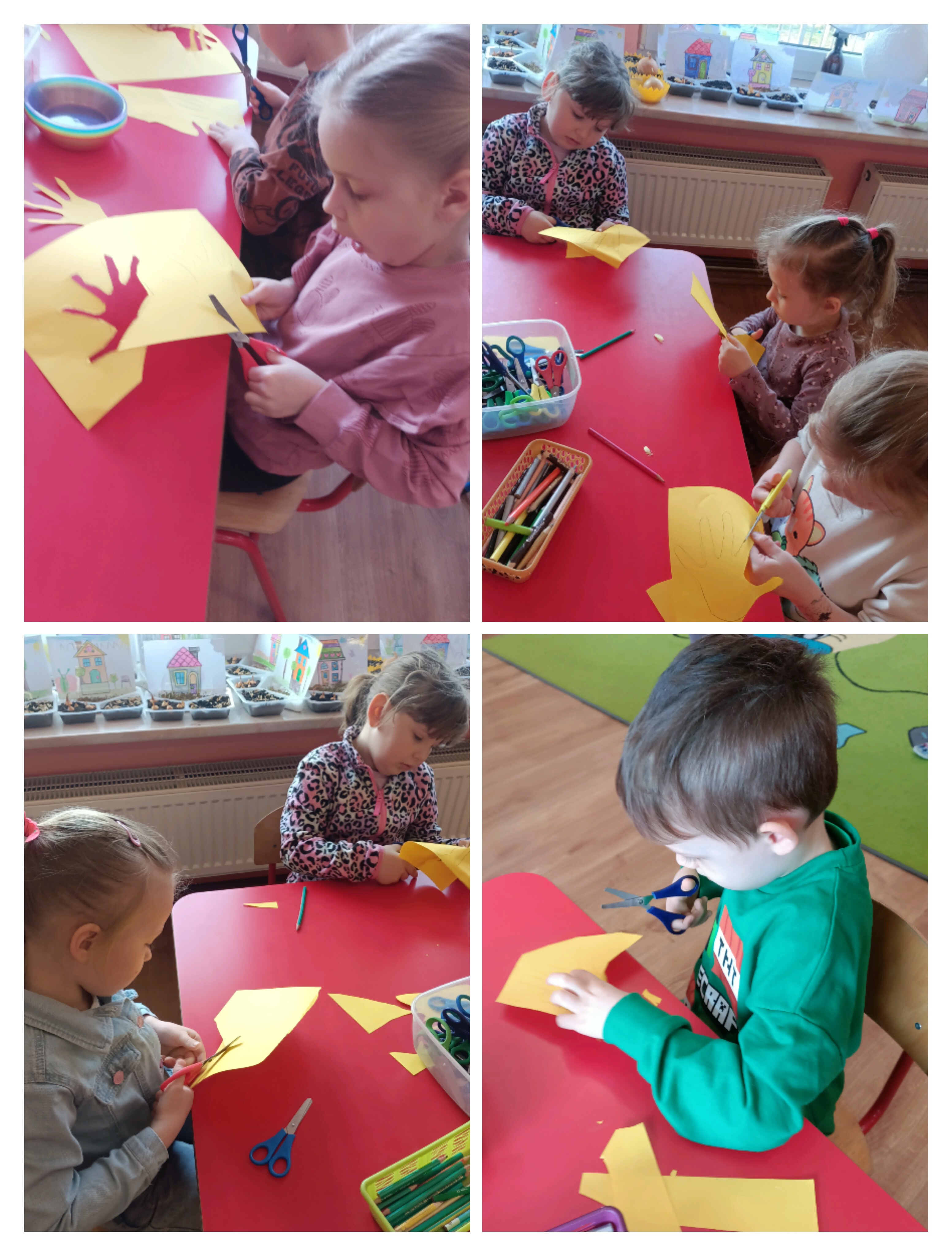Na zdjęciach przedstawiona jest grupowa praca plastyczna. Dzieci najpierw odrysowywały swoje rączki, a następnie je wycinały. Z przygotowanych elementów powstały kurczaczki.